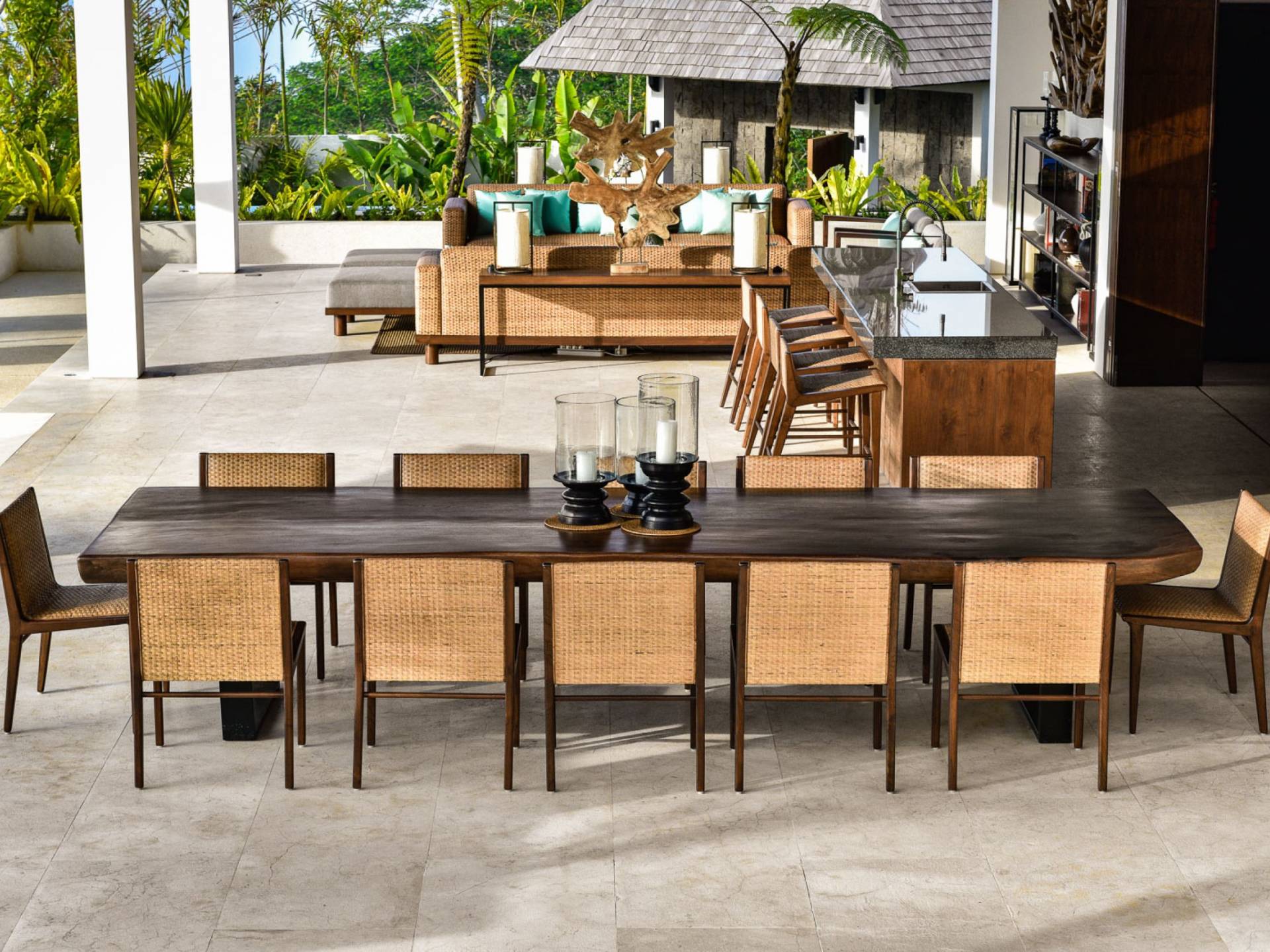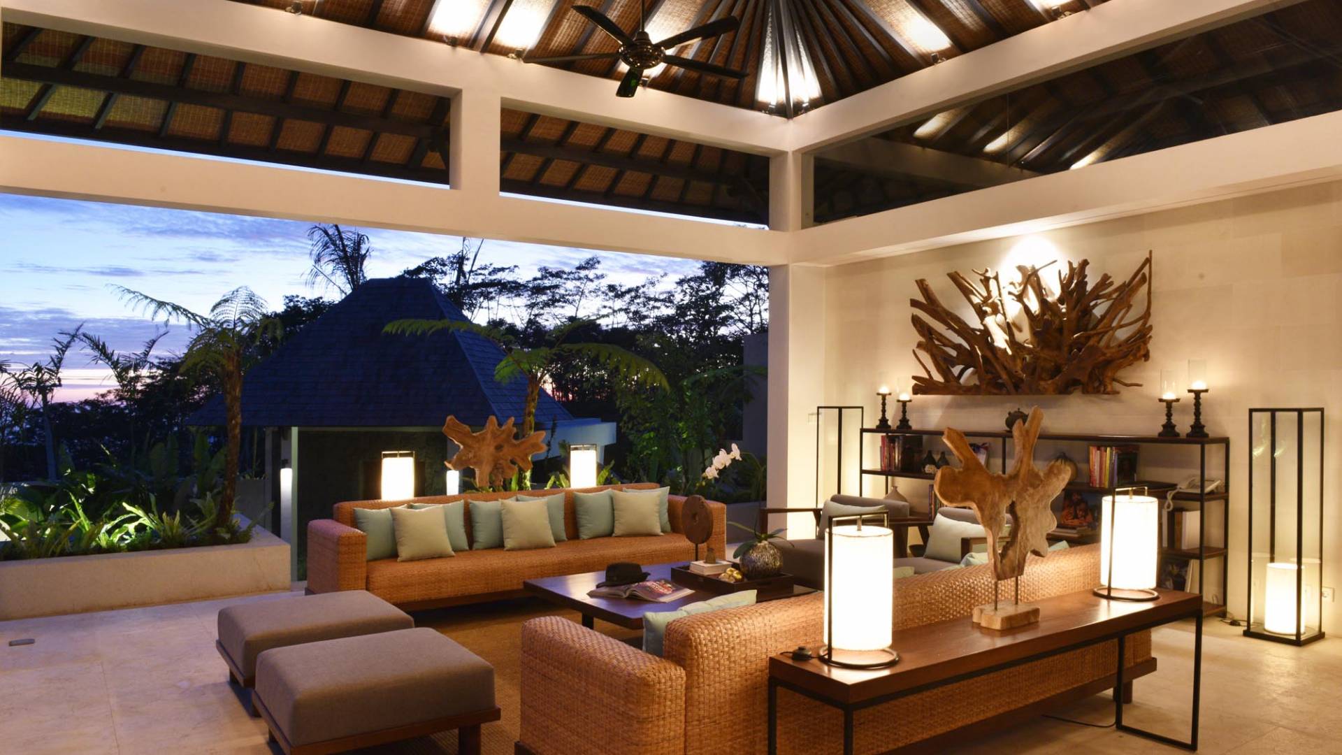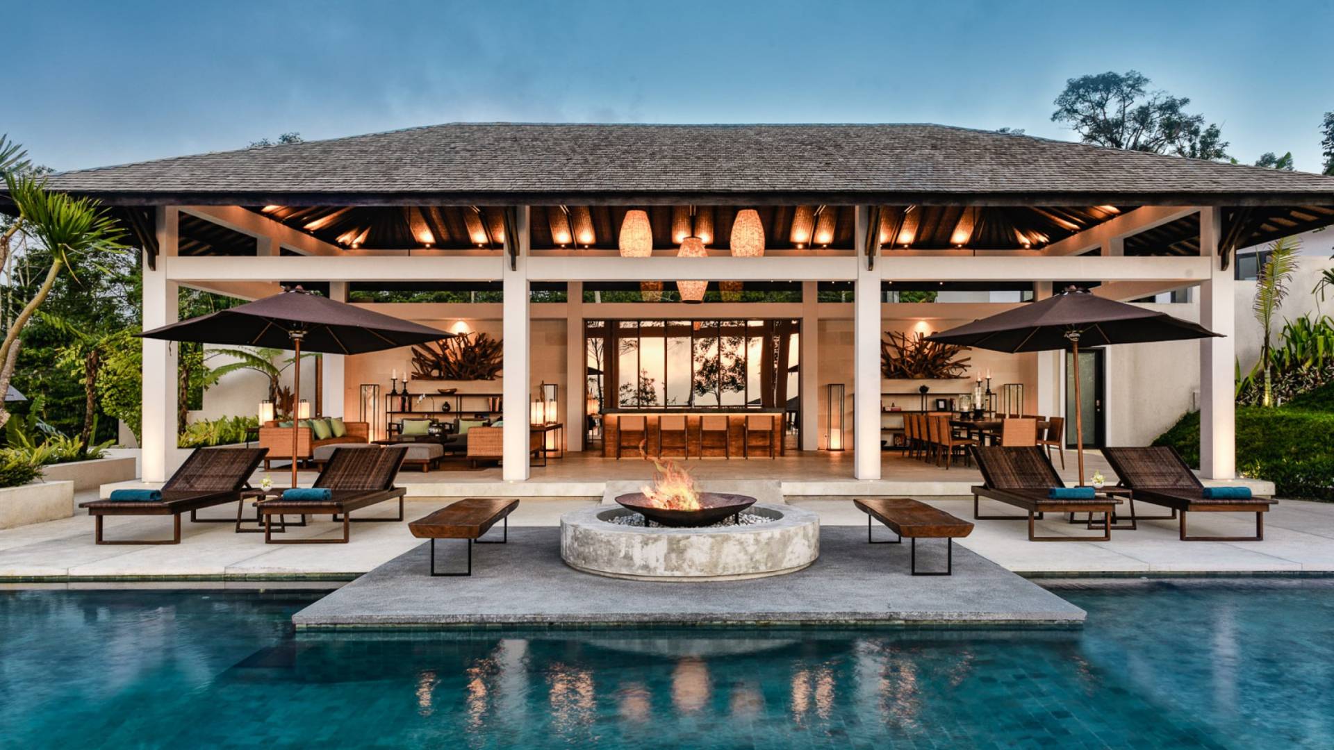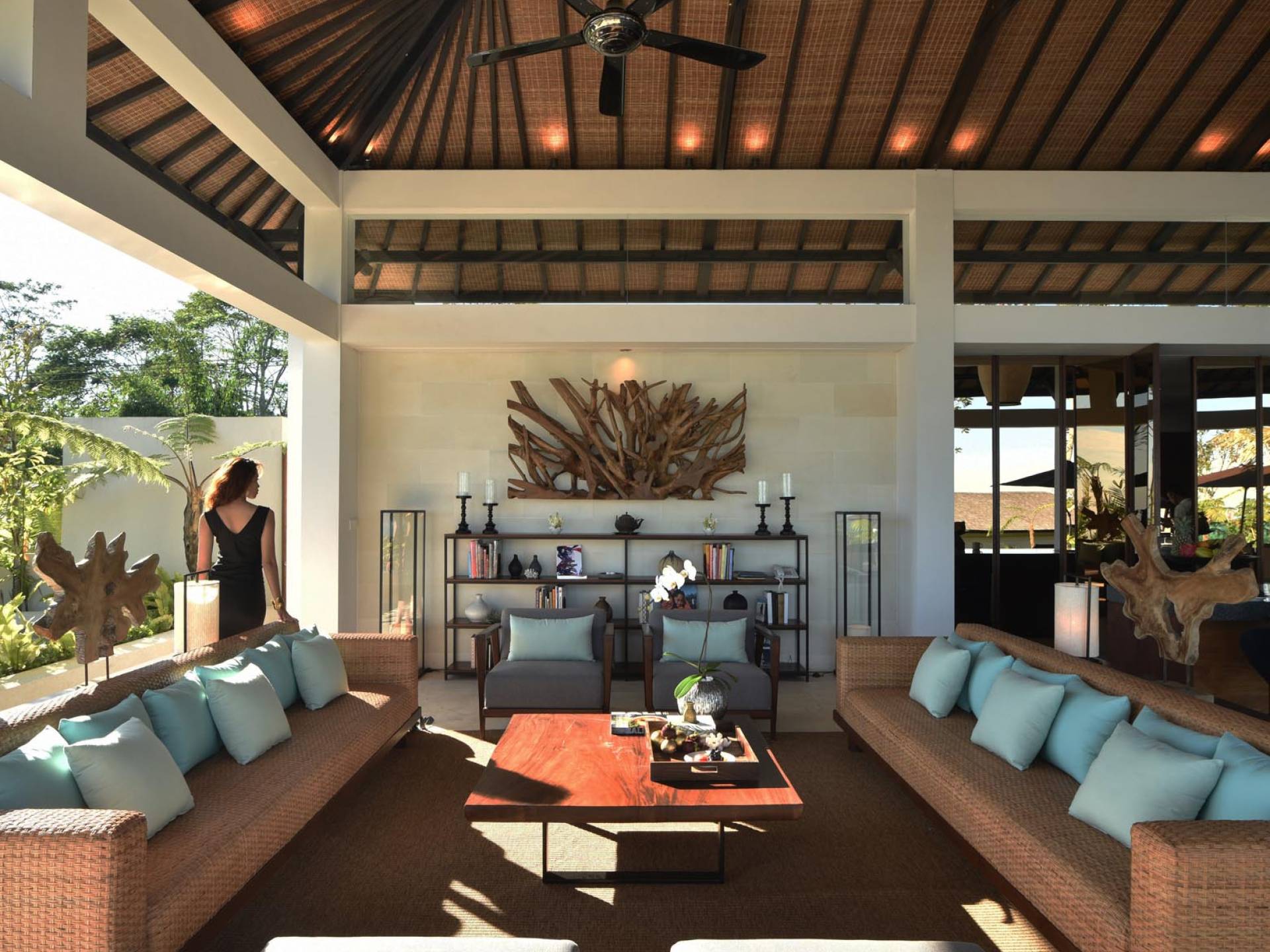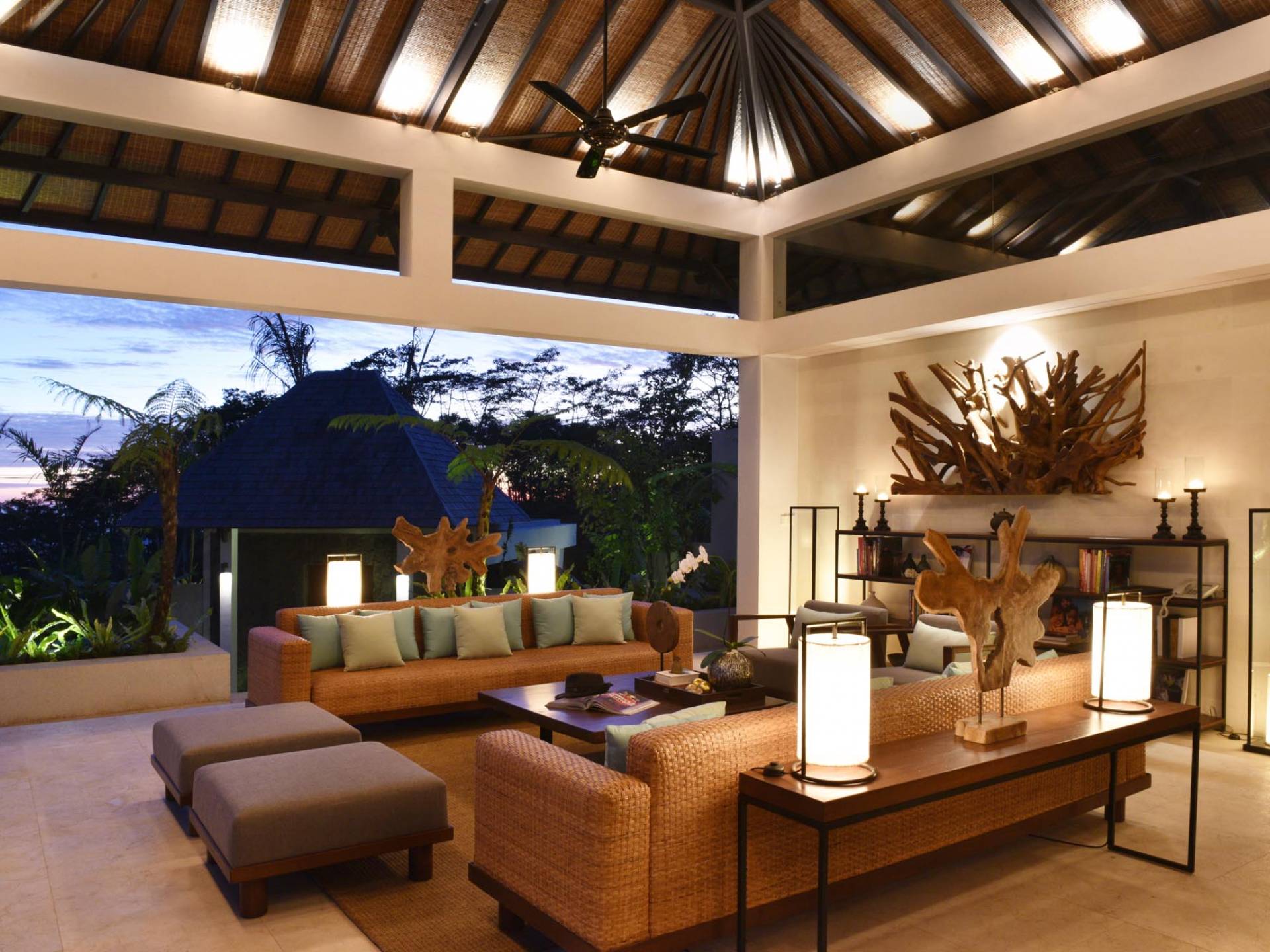 Der offene Wohnpavillon von 100 Quadratmetern ist von drei Seiten für kühle Brisen geöffnet und besteht aus einer luxuriösen Lounge, einem eleganten Esszimmer mit einem Esstisch aus Naturholzblock und einer langen Bar, hinter der sich eine voll ausgestattete Küche befindet. Der Wohnbereich bietet ein luxuriöses Ambiente mit Marmorböden, Palimanan-Wänden und allen maßgeschneiderten Designermöbeln und Lampen. Die überdimensionale zentrale Bartheke ist ein natürlicher, informeller Treffpunkt und eine Kneipe für die Gäste. Die achtflügelige Falttür, die den Wohnraum und die Küche im geschlossenen Zustand trennt, präsentiert eine Reihe von raumhohen Bronzespiegeln, in denen Bergblick und herrliche Sonnenuntergänge über das Pooldeck zurück in den Wohnraum reflektiert werden.