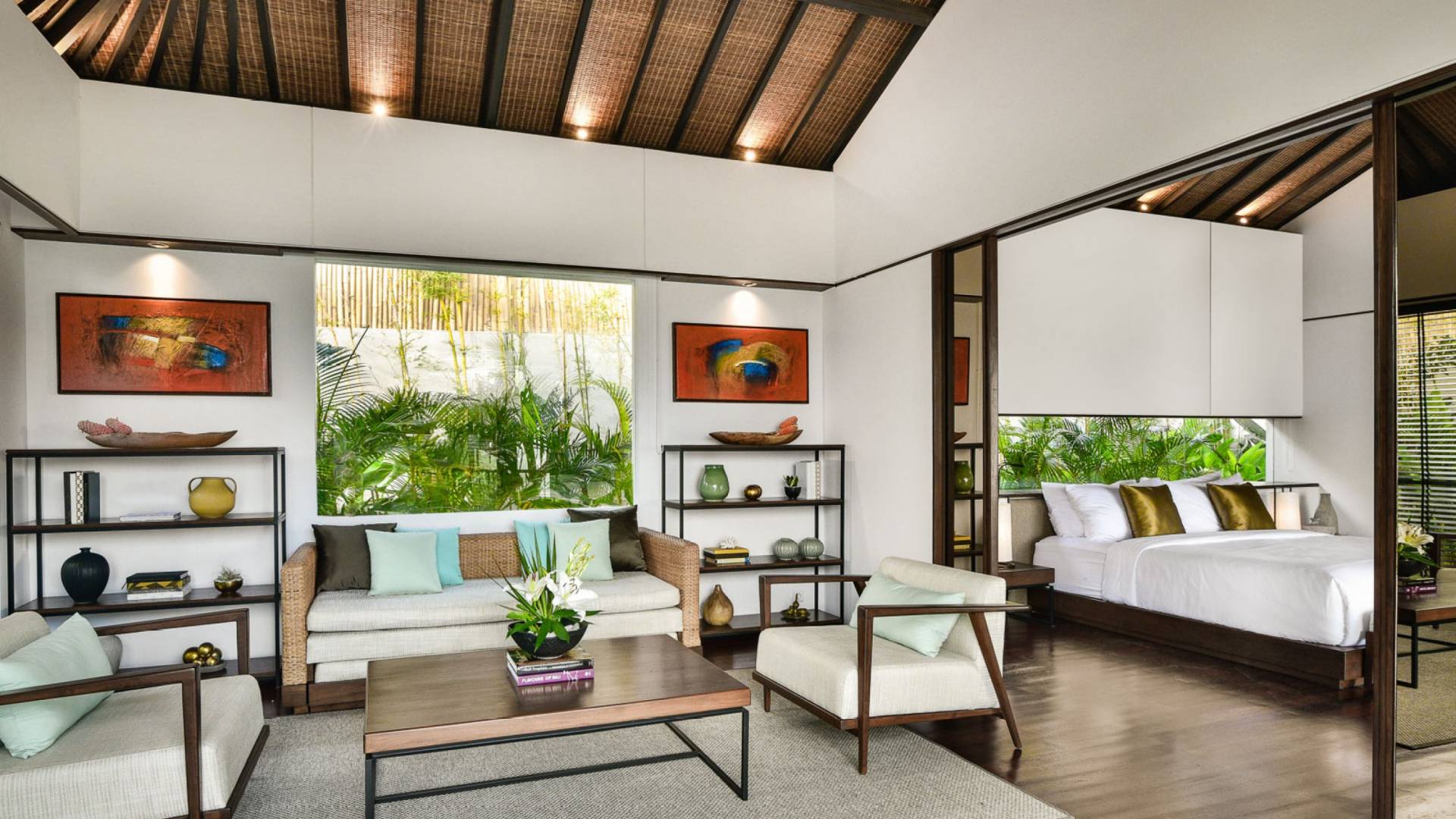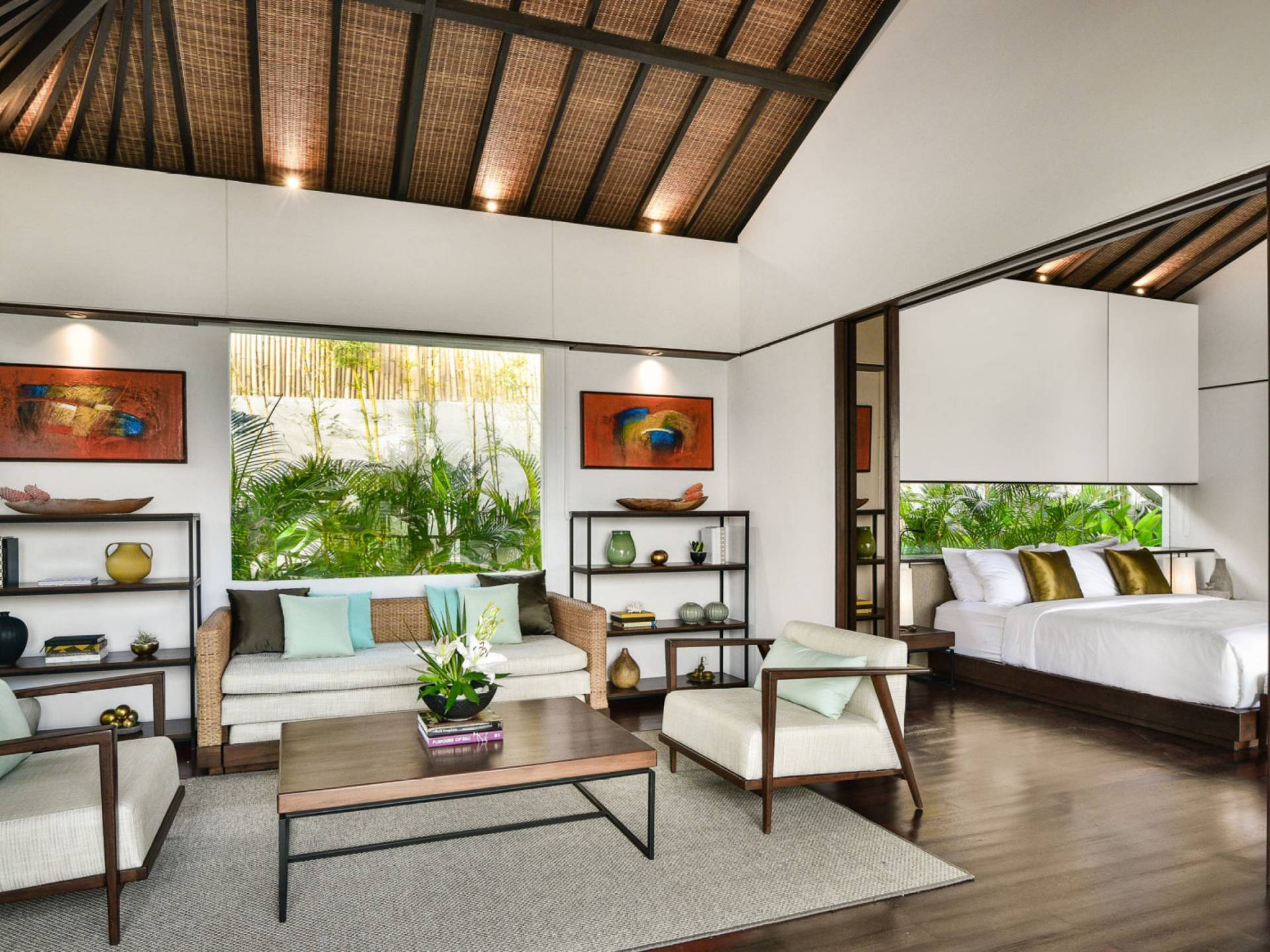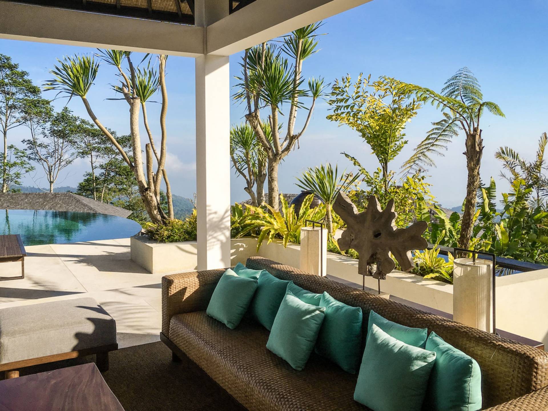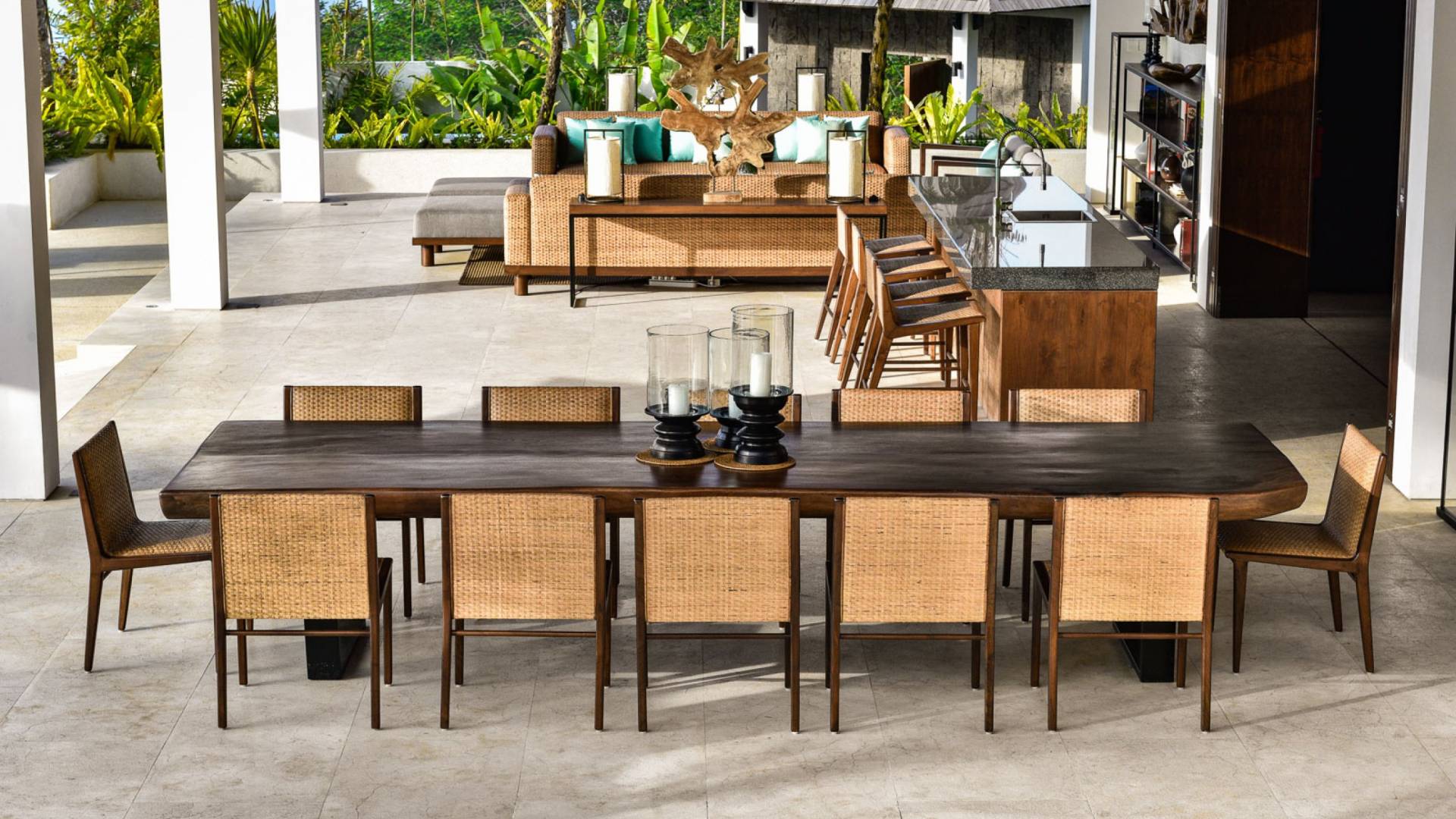 Der offene Wohnpavillon von 100 Quadratmetern ist von drei Seiten für kühle Brisen geöffnet und besteht aus einer luxuriösen Lounge, einem eleganten Esszimmer mit einem Esstisch aus Naturholzblock und einer langen Bar, hinter der sich eine voll ausgestattete Küche befindet. Der Wohnbereich bietet ein luxuriöses Ambiente mit Marmorböden, Palimanan-Wänden und allen maßgeschneiderten Designermöbeln und Lampen. Die überdimensionale zentrale Bartheke ist ein natürlicher, informeller Treffpunkt und eine Kneipe für die Gäste. Die achtflügelige Falttür, die den Wohnraum und die Küche im geschlossenen Zustand trennt, präsentiert eine Reihe von raumhohen Bronzespiegeln, in denen Bergblick und herrliche Sonnenuntergänge über das Pooldeck zurück in den Wohnraum reflektiert werden.