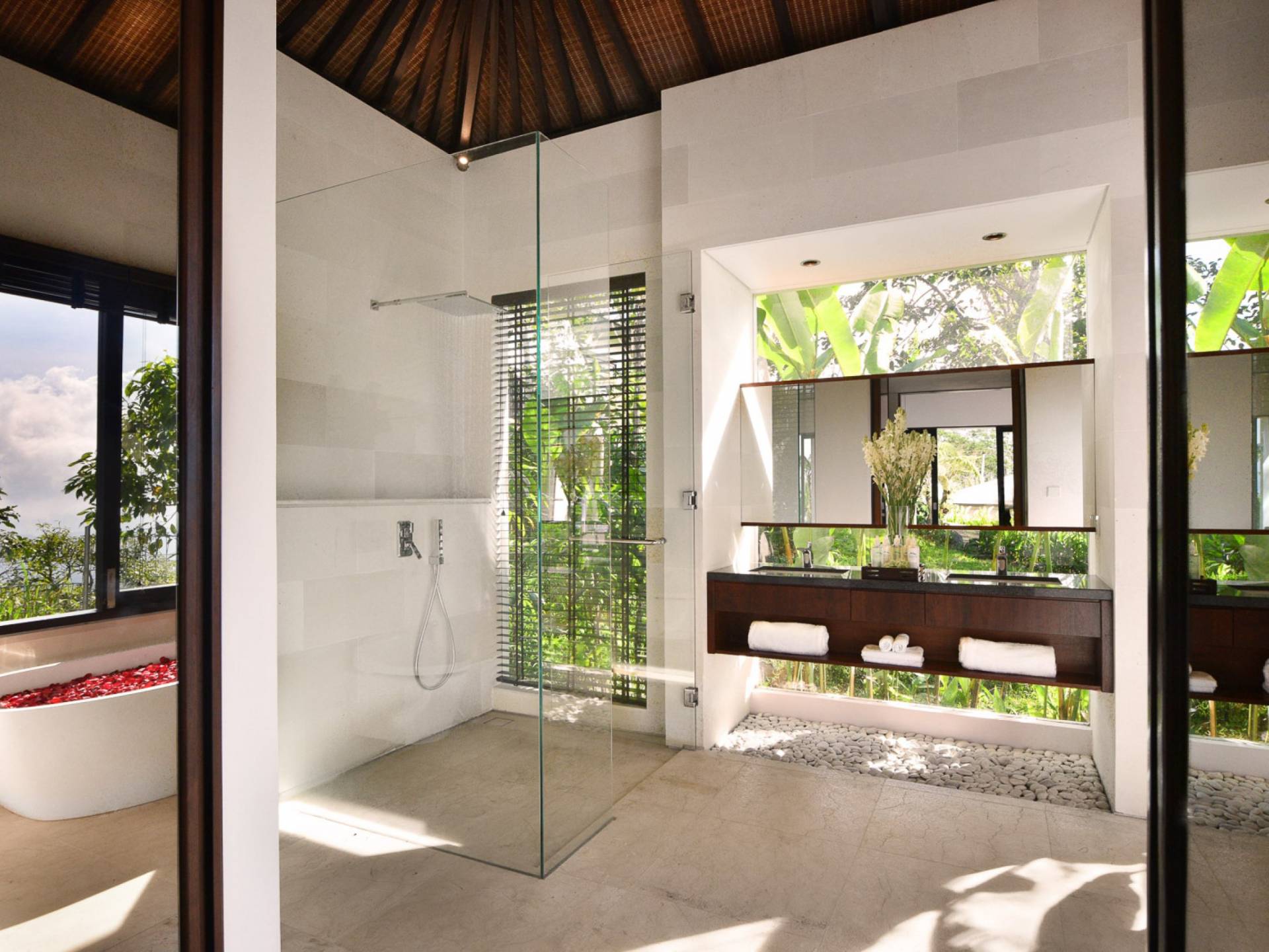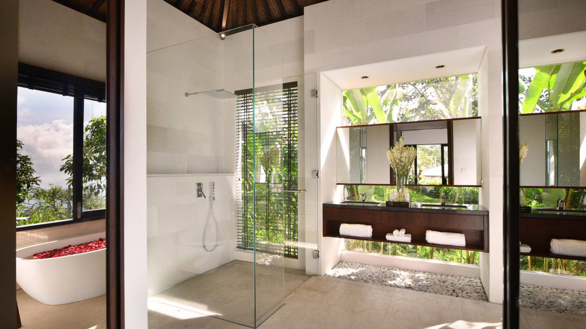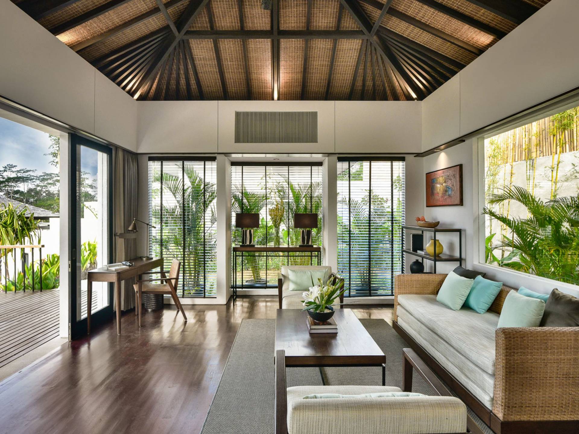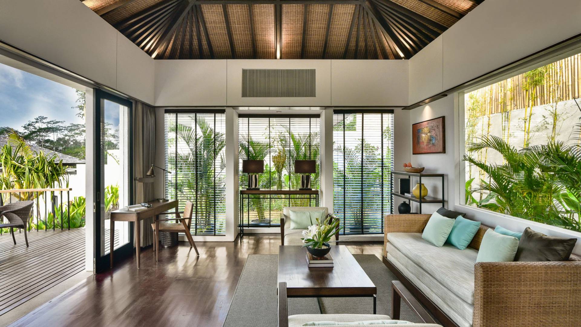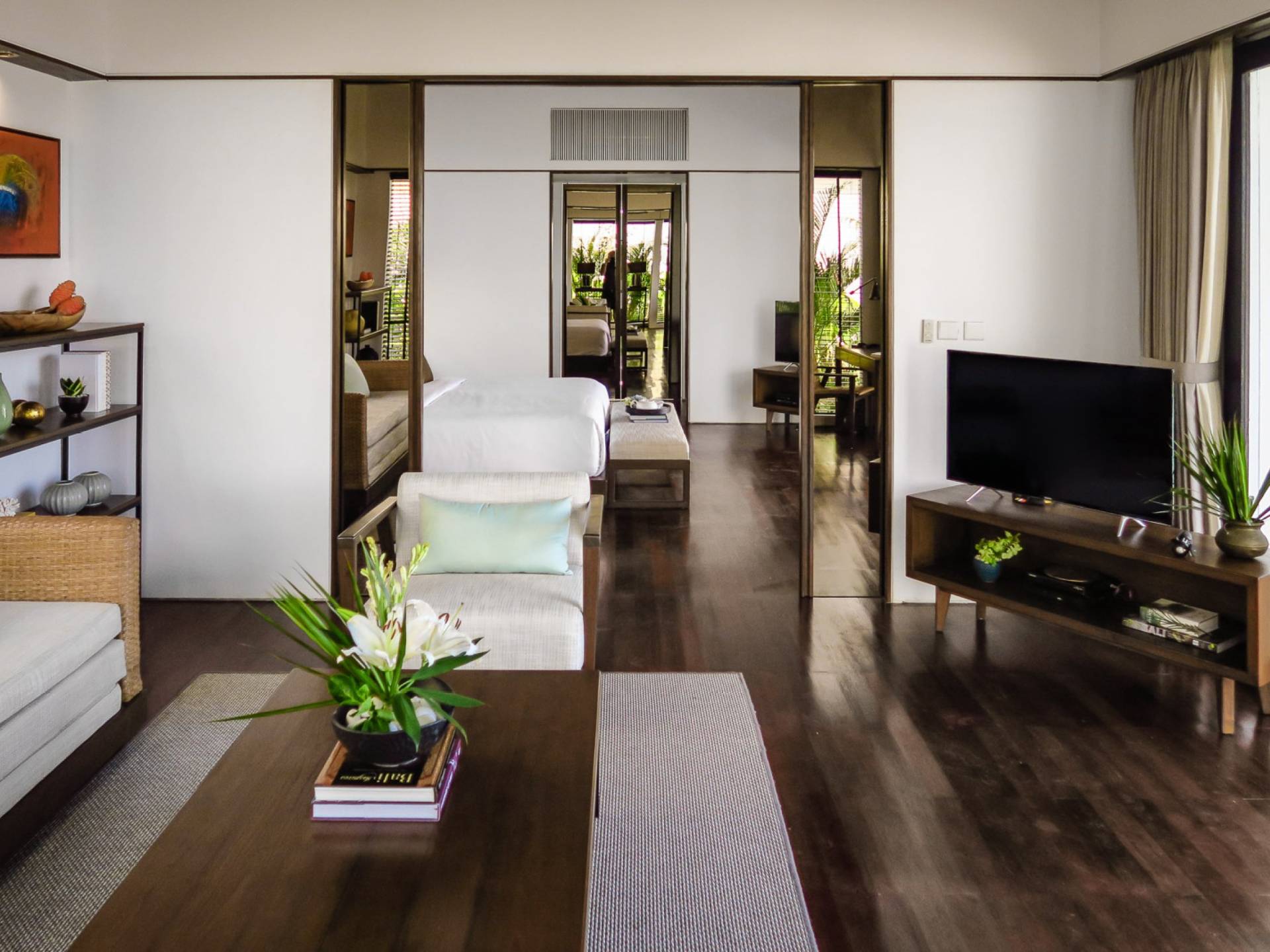 Der offene Wohnpavillon von 100 Quadratmetern ist von drei Seiten für kühle Brisen geöffnet und besteht aus einer luxuriösen Lounge, einem eleganten Esszimmer mit einem Esstisch aus Naturholzblock und einer langen Bar, hinter der sich eine voll ausgestattete Küche befindet. Der Wohnbereich bietet ein luxuriöses Ambiente mit Marmorböden, Palimanan-Wänden und allen maßgeschneiderten Designermöbeln und Lampen. Die überdimensionale zentrale Bartheke ist ein natürlicher, informeller Treffpunkt und eine Kneipe für die Gäste. Die achtflügelige Falttür, die den Wohnraum und die Küche im geschlossenen Zustand trennt, präsentiert eine Reihe von raumhohen Bronzespiegeln, in denen Bergblick und herrliche Sonnenuntergänge über das Pooldeck zurück in den Wohnraum reflektiert werden.