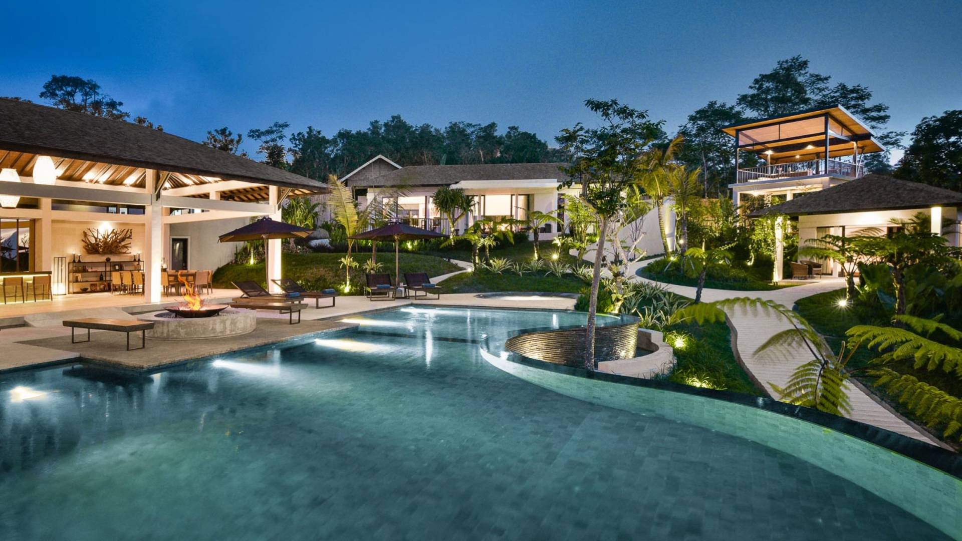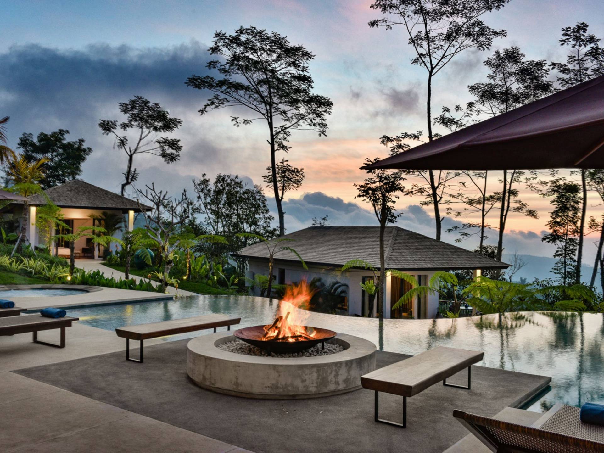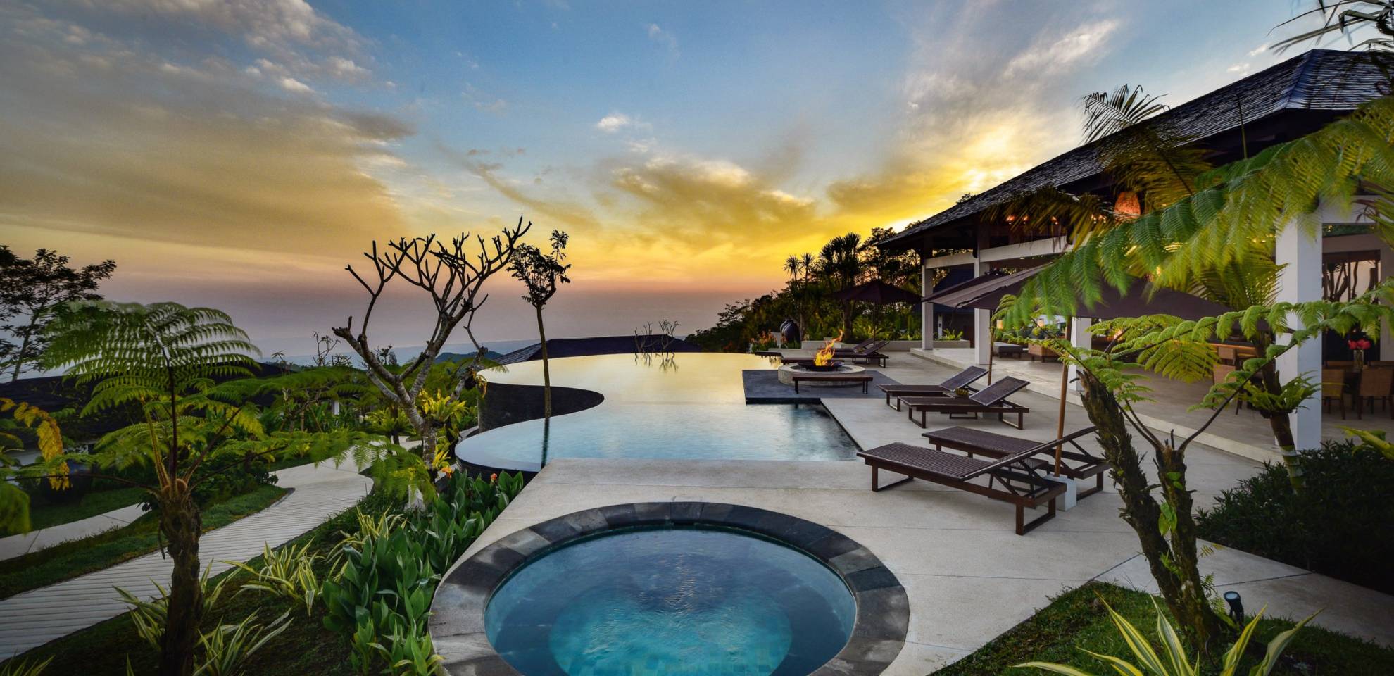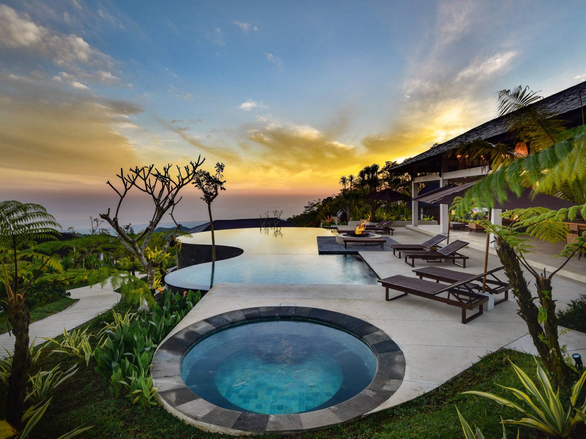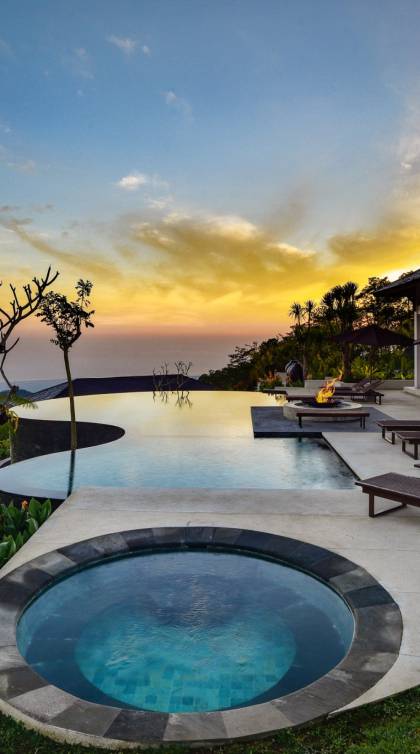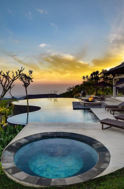 Alta Vista Mountain Villa Bali besteht aus einer Reihe von eleganten und sorgfältig angeordneten Schlafzimmervillen, die um einen Hauptwohn- und Essbereich verteilt sind, der sich auf das Deck eines großen, frei geformten Infinity-Pools, eines Whirlpools und eines Außenkamins am Pool öffnet . Alle Teile des Anwesens, einschließlich jeder Schlafzimmervilla, sind mit freiem Blick über die Hügel bis zur Nordküste gesegnet. Das gesamte Anwesen ist wunderschön angelegt und mit botanischen Sorten bepflanzt, die im kühlen und feuchten Bergklima gedeihen. Das Anwesen ist als eine Reihe von Villen konzipiert, die inmitten üppiger und wunderschöner Gärten versteckt sind. Auf dem höchsten Punkt des Anwesens befindet sich ein „Baumhaus“, bestehend aus einem Spielbereich für Kinder im Erdgeschoss und einer gemütlichen Lounge im Obergeschoss, die einen atemberaubenden Blick auf das gesamte Anwesen und die umliegenden Berge im Norden bietet Küste. Dies ist der beste Ort, um spektakuläre Sonnenuntergänge zu erleben und in Sitzsäcken mit einem Drink in der Hand zu faulenzen.