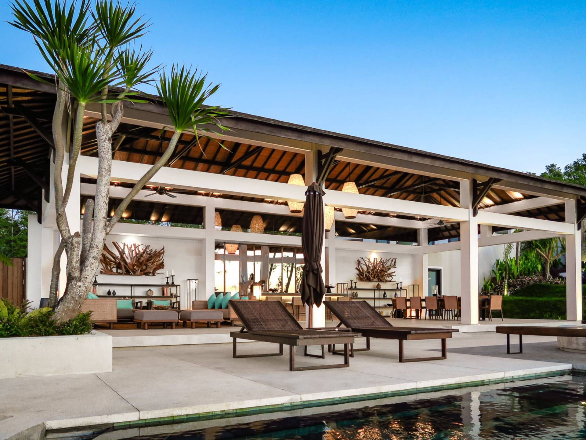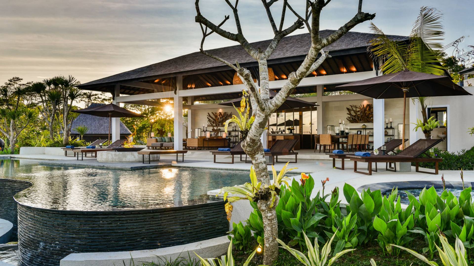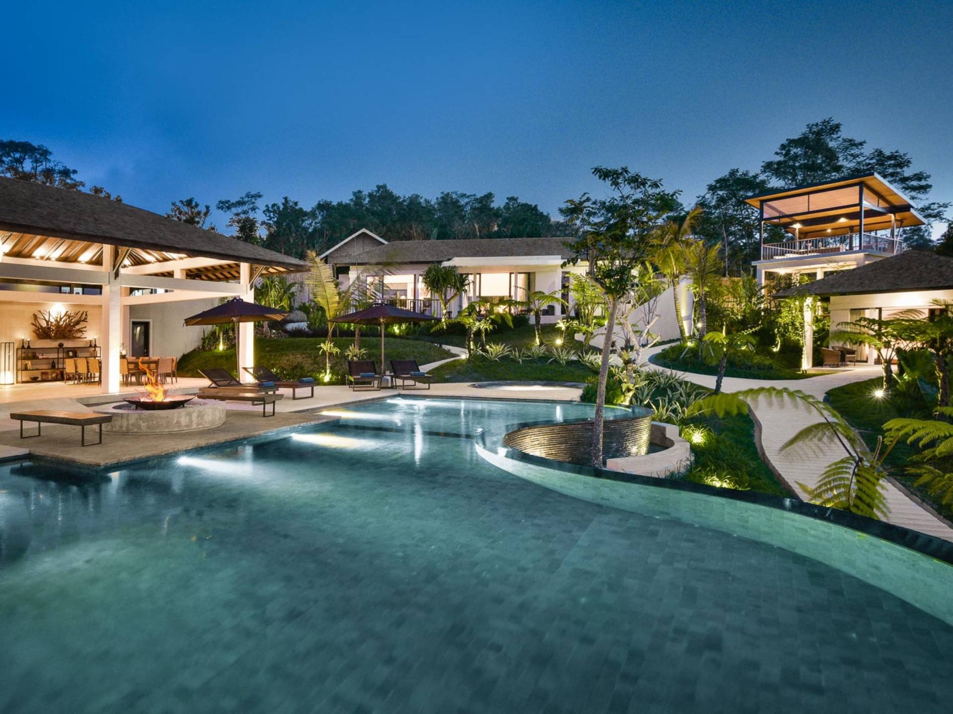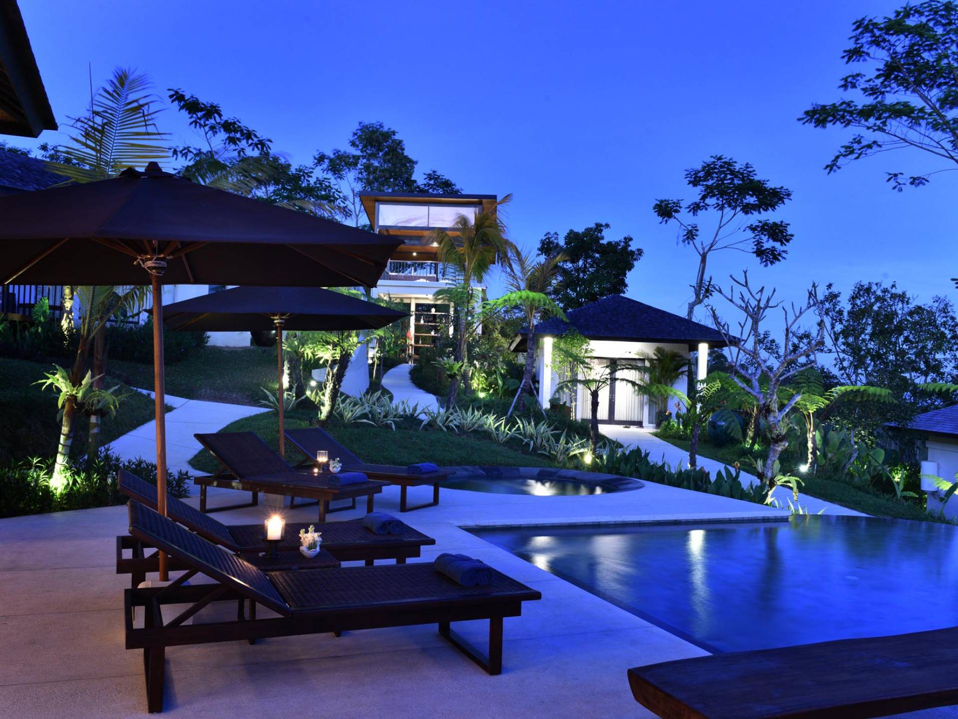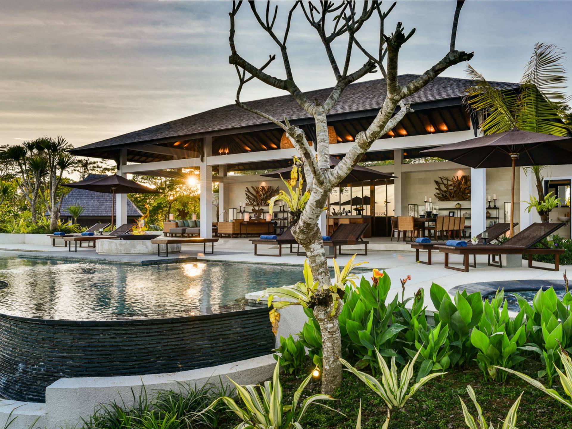 Der Infinity-Pool ist in freier Form mit einer maximalen Länge von 15 Metern und mit elegantem balinesisch-grünem Stein ausgelegt, der durch natürliche Candi-Steinkanten akzentuiert wird. Es gibt einen flachen Bereich für Kinder mit einer maximalen Tiefe von 40 cm, der im Hauptbecken bis zu einer Tiefe von 120 cm abfällt. Der Pool wird mit einer umweltfreundlichen Wärmepumpe auf angenehme 27 Grad Celsius erwärmt, die auch heißes Wasser für den 6-Sitzer-Whirlpool an einer Seite des Pools bereitstellt. Am unteren Ende des Gartens befindet sich ein offener Gartenpavillon, der als ruhiger Ort zum Lesen oder Entspannen oder als Gymnastikball genutzt werden kann.