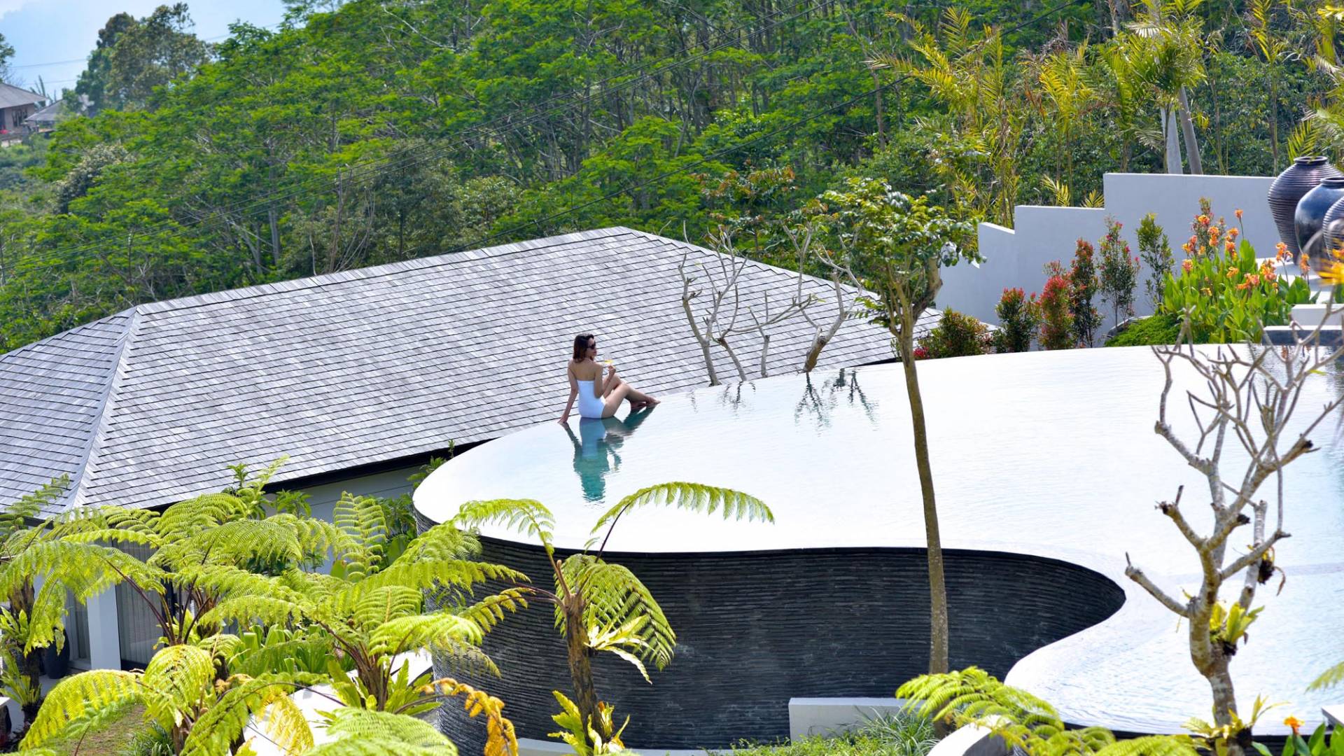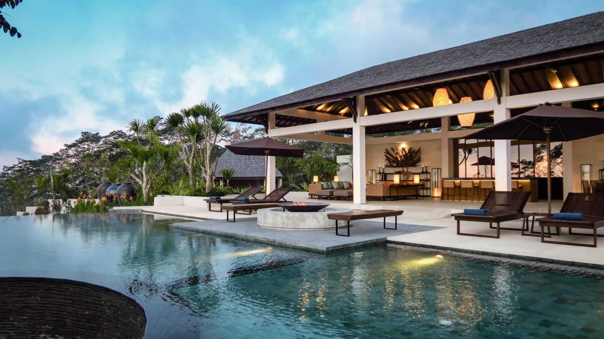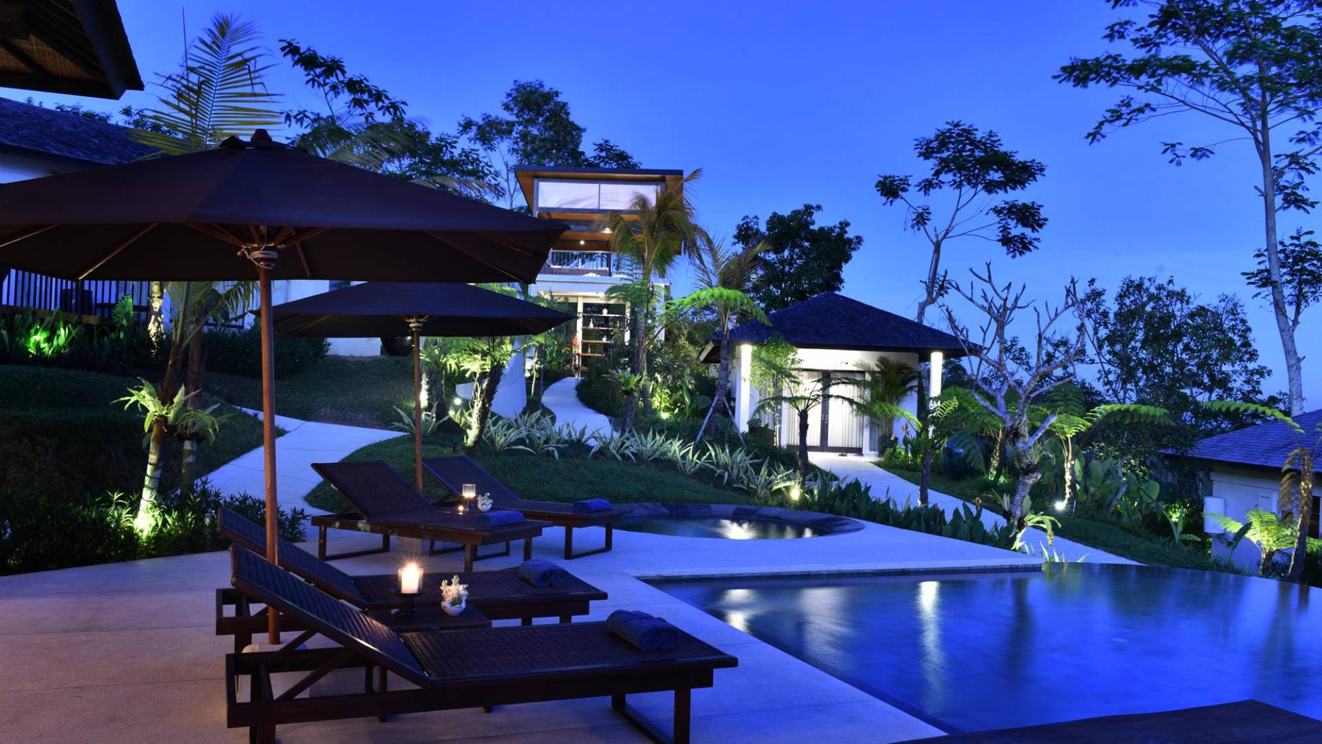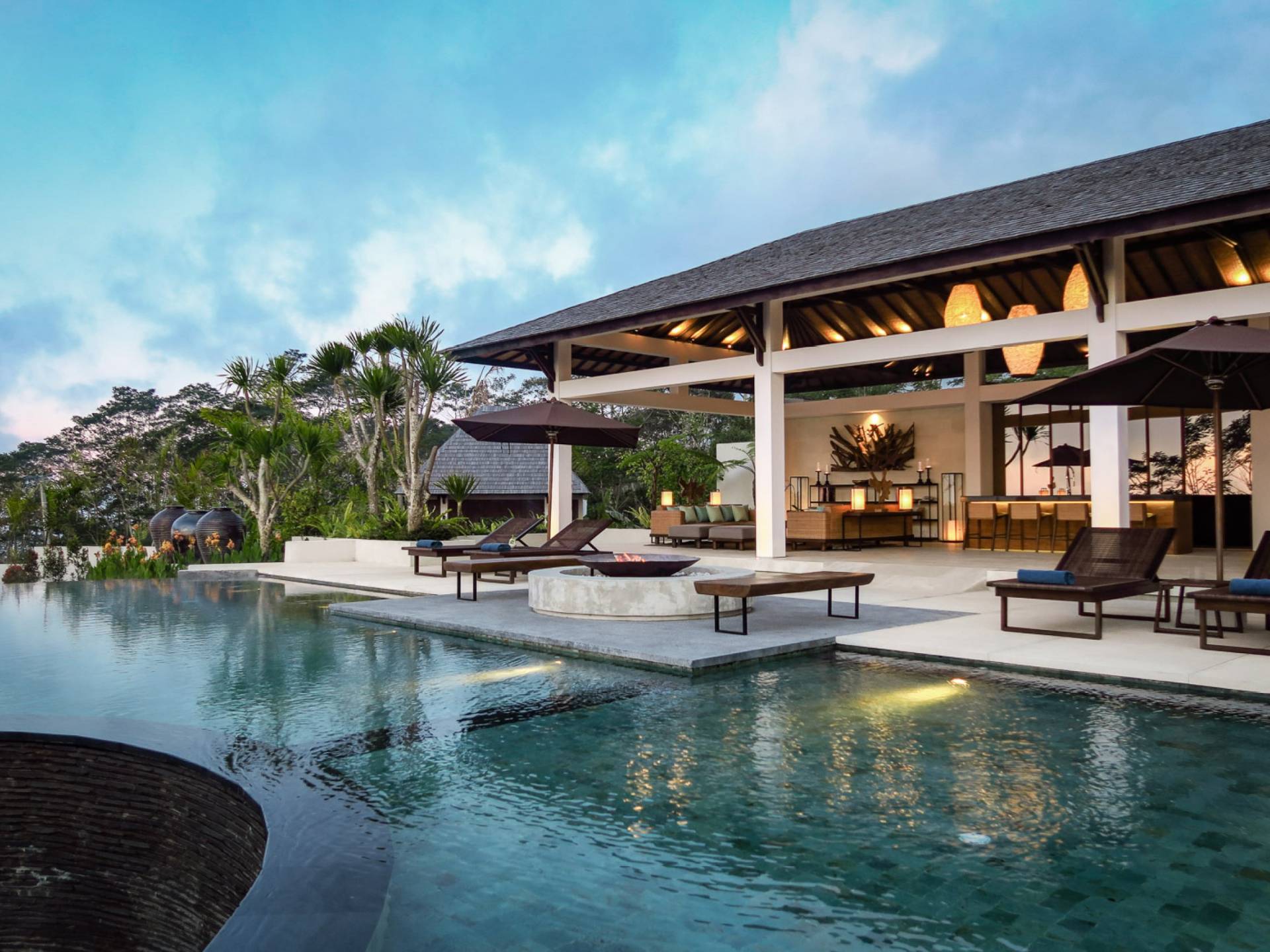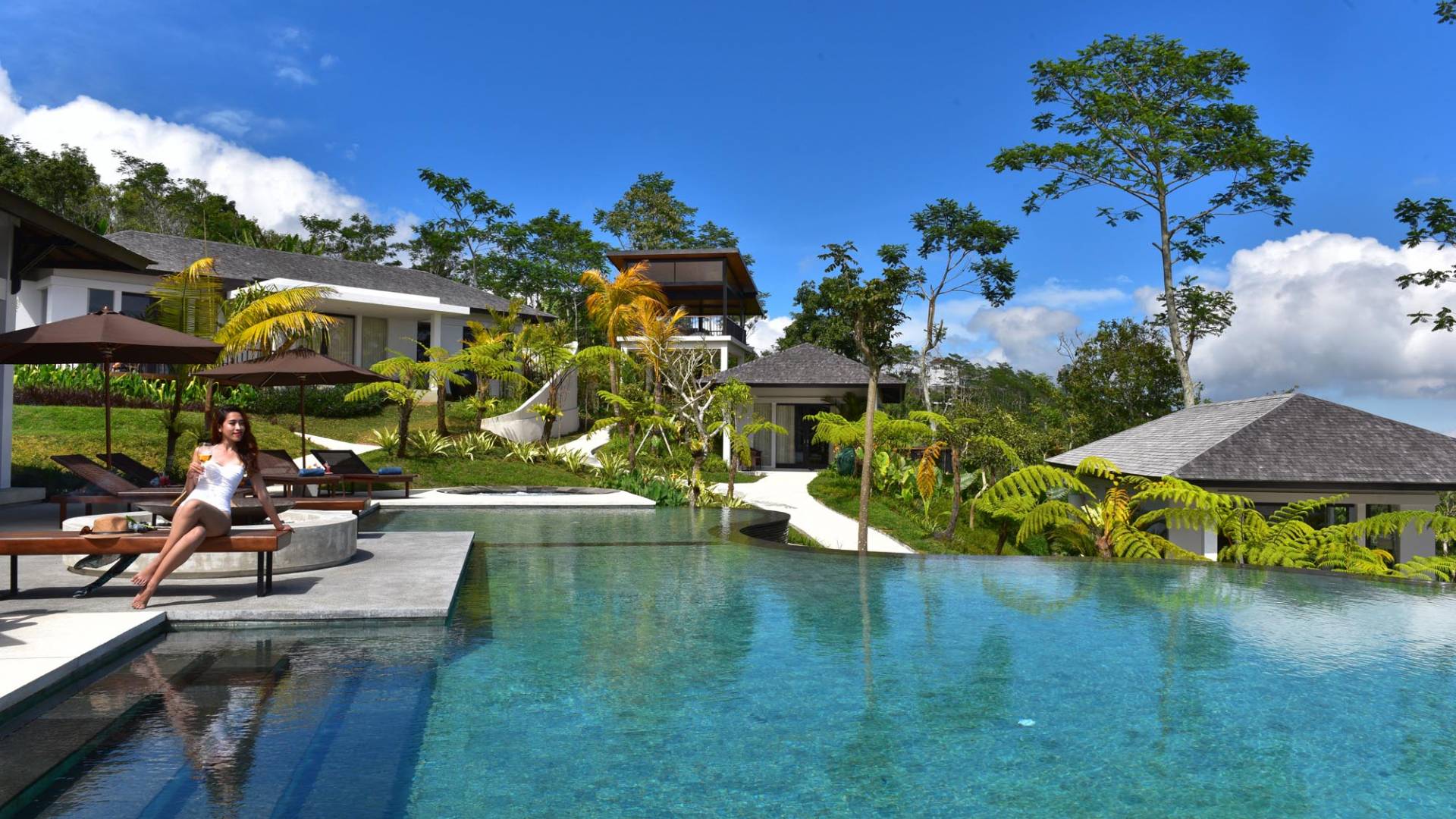 Der Infinity-Pool ist in freier Form mit einer maximalen Länge von 15 Metern und mit elegantem balinesisch-grünem Stein ausgelegt, der durch natürliche Candi-Steinkanten akzentuiert wird. Es gibt einen flachen Bereich für Kinder mit einer maximalen Tiefe von 40 cm, der im Hauptbecken bis zu einer Tiefe von 120 cm abfällt. Der Pool wird mit einer umweltfreundlichen Wärmepumpe auf angenehme 27 Grad Celsius erwärmt, die auch heißes Wasser für den 6-Sitzer-Whirlpool an einer Seite des Pools bereitstellt. Am unteren Ende des Gartens befindet sich ein offener Gartenpavillon, der als ruhiger Ort zum Lesen oder Entspannen oder als Gymnastikball genutzt werden kann.