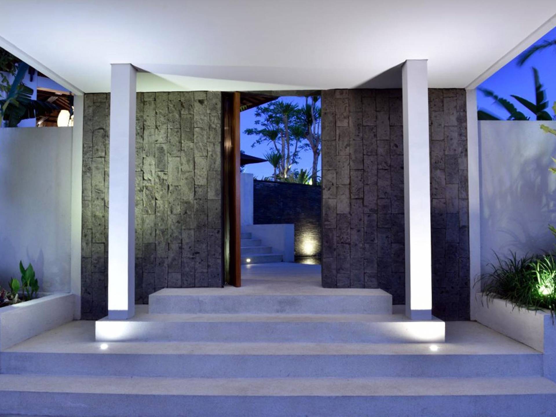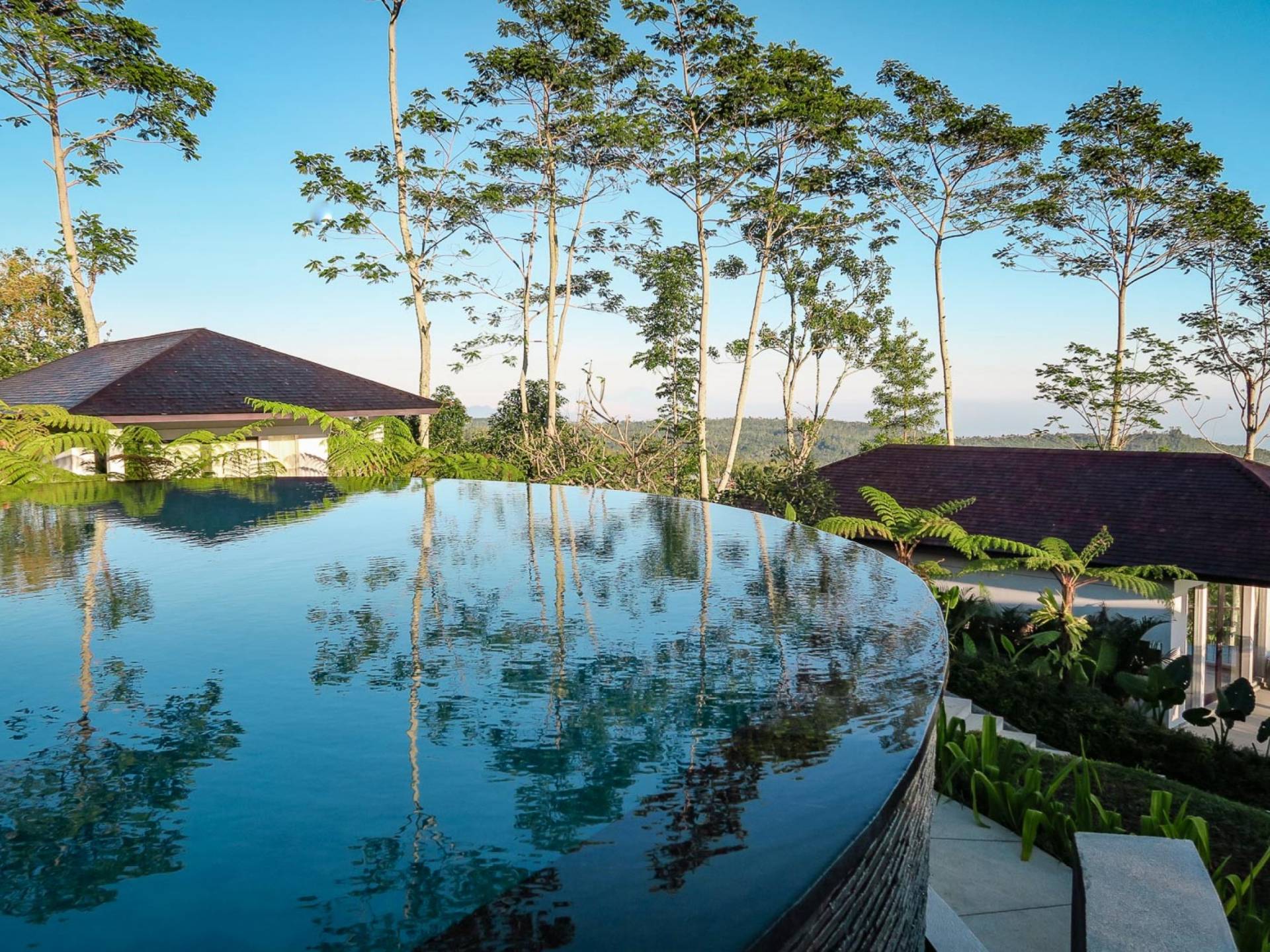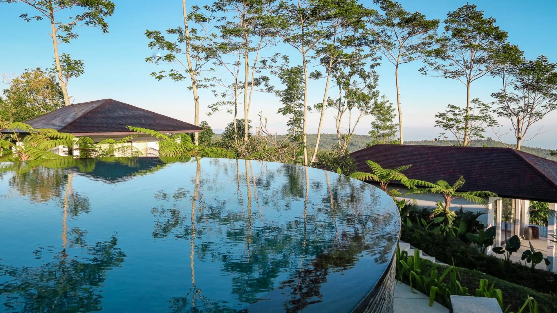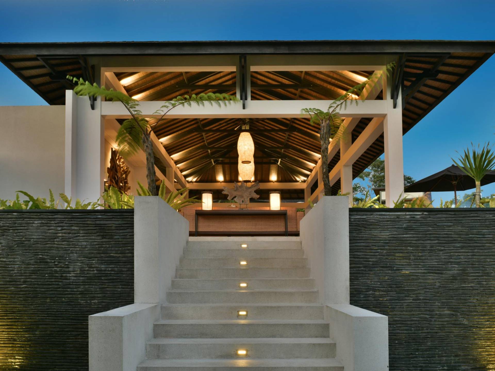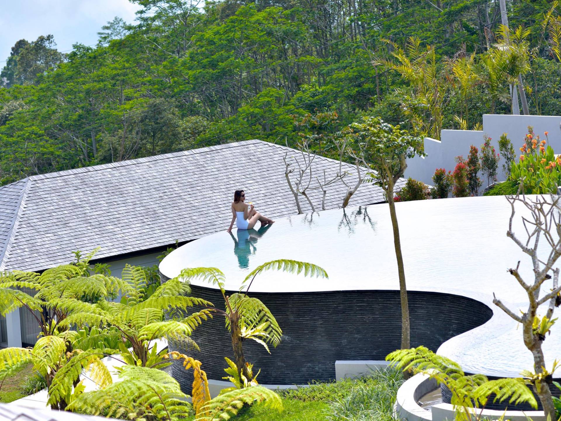 Der Infinity-Pool ist in freier Form mit einer maximalen Länge von 15 Metern und mit elegantem balinesisch-grünem Stein ausgelegt, der durch natürliche Candi-Steinkanten akzentuiert wird. Es gibt einen flachen Bereich für Kinder mit einer maximalen Tiefe von 40 cm, der im Hauptbecken bis zu einer Tiefe von 120 cm abfällt. Der Pool wird mit einer umweltfreundlichen Wärmepumpe auf angenehme 27 Grad Celsius erwärmt, die auch heißes Wasser für den 6-Sitzer-Whirlpool an einer Seite des Pools bereitstellt. Am unteren Ende des Gartens befindet sich ein offener Gartenpavillon, der als ruhiger Ort zum Lesen oder Entspannen oder als Gymnastikball genutzt werden kann.