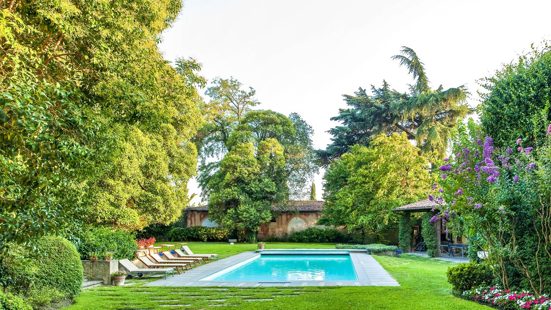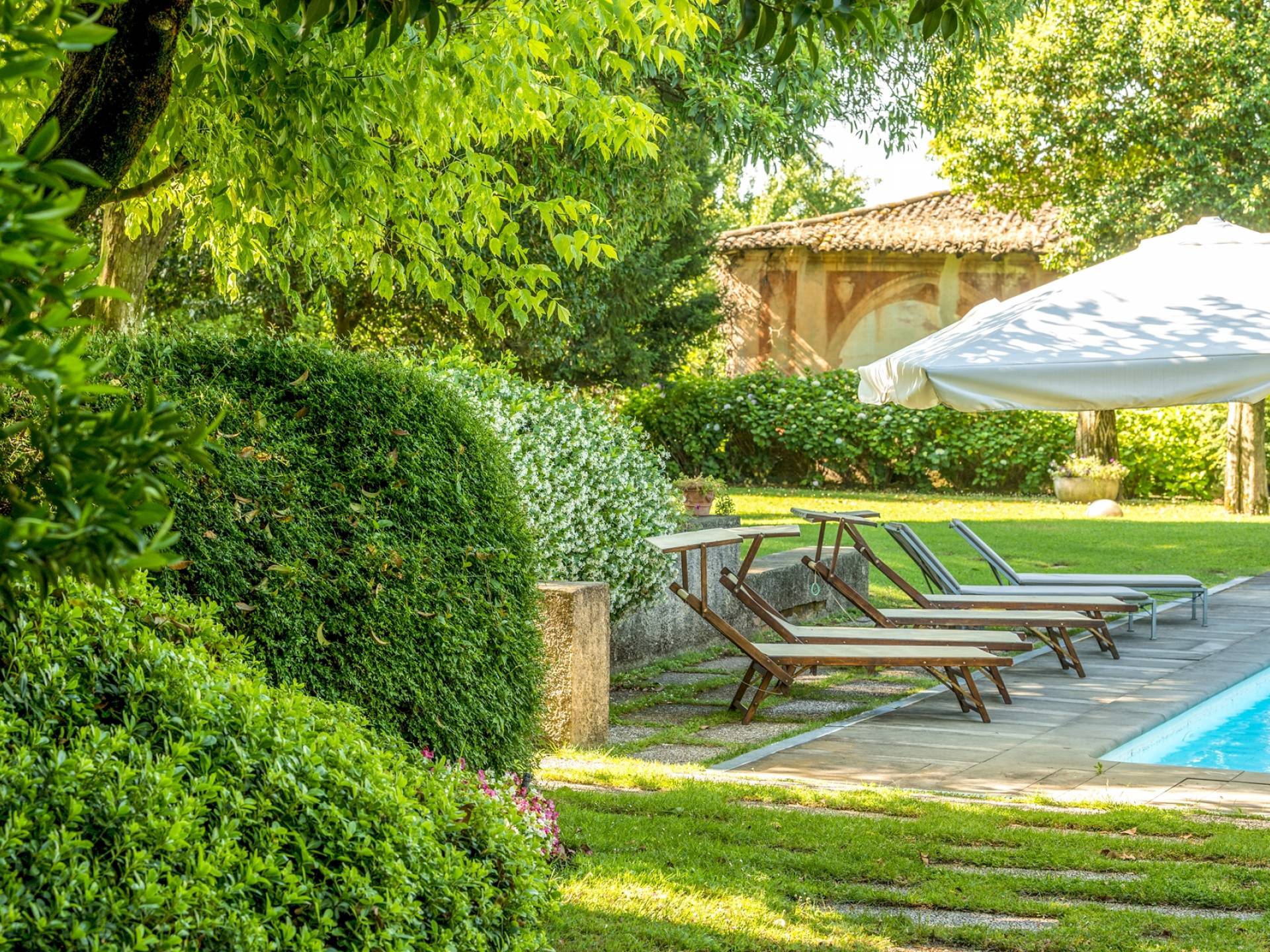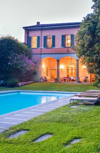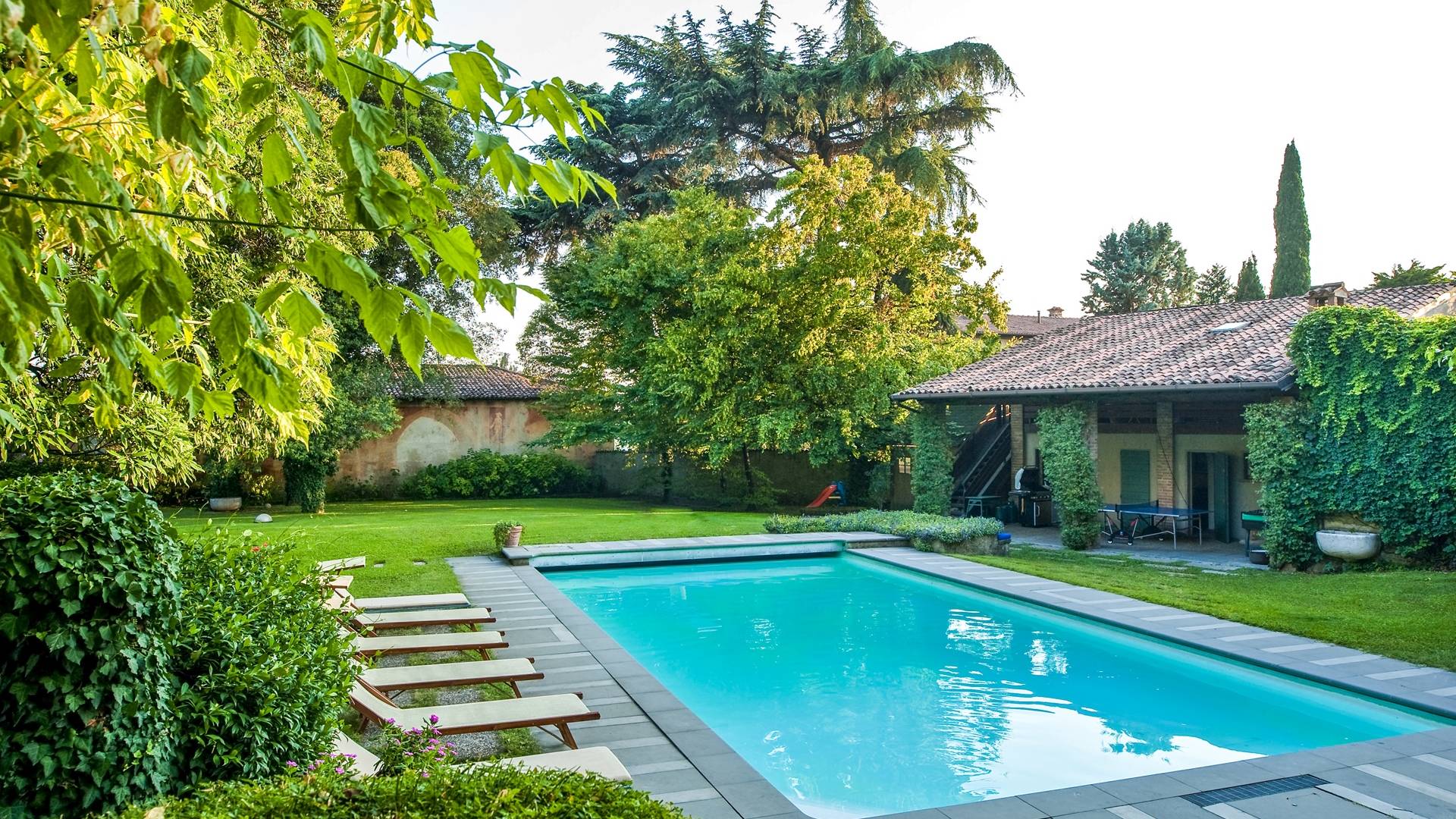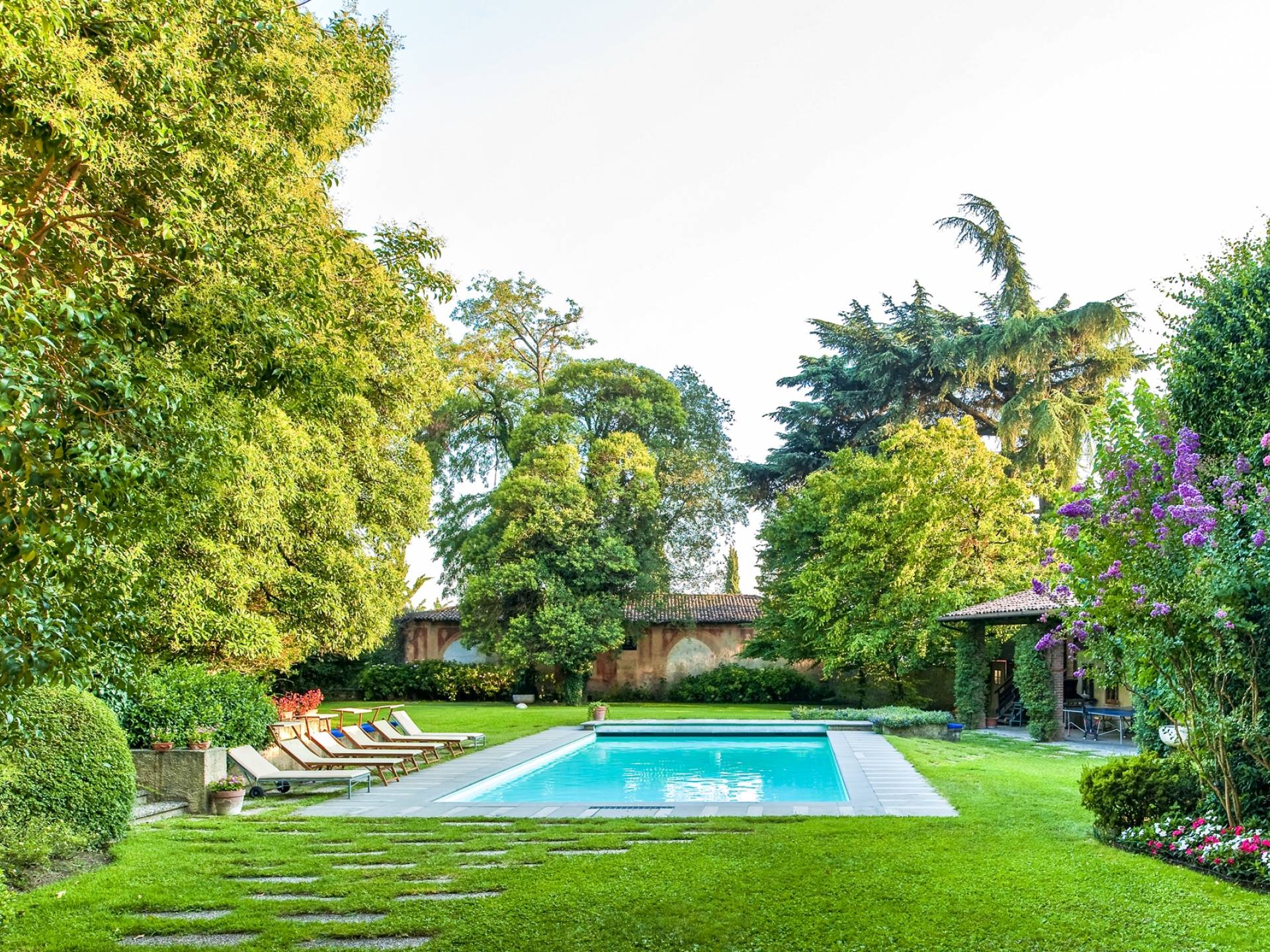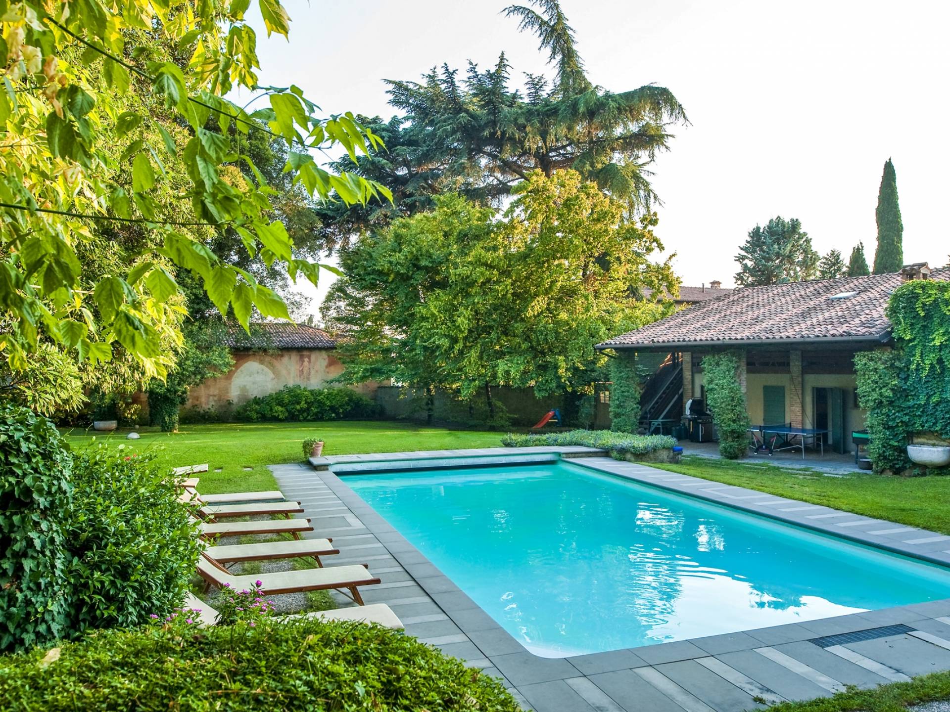 Das Anwesen bietet mehr als 20 Betten in 9 Zimmern, teilweise mit Kamin. Es ist die ideale Lösung für Familien oder Gruppen, die ein paar Tage in einem Haus verbringen möchten, das aufgrund seiner Größe den Vorteil hat, absolute Privatsphäre zu garantieren, ohne auf alle Annehmlichkeiten zu verzichten. Im Inneren werden Sie von fünf großen Zimmern mit Blick auf die gut ausgestattete Küche, die zwei vor dem Garten angeordneten Veranden und den beeindruckenden Pool mit elektrischem Rollladen begrüßt, der für kleine Kinder sicher ist. Angrenzend an den Pool befindet sich der Anbau mit Umkleideraum und Bad. Auf den Freiflächen gibt es mehrere Jahrhunderte alte Bäume, im Schatten finden Sie auch eine Spielecke für die Kleinen mit Tischtennis und Tischfußball sowie einen Grillplatz für ruhige Grillabende mit Freunden oder für den Firmenbrunch.