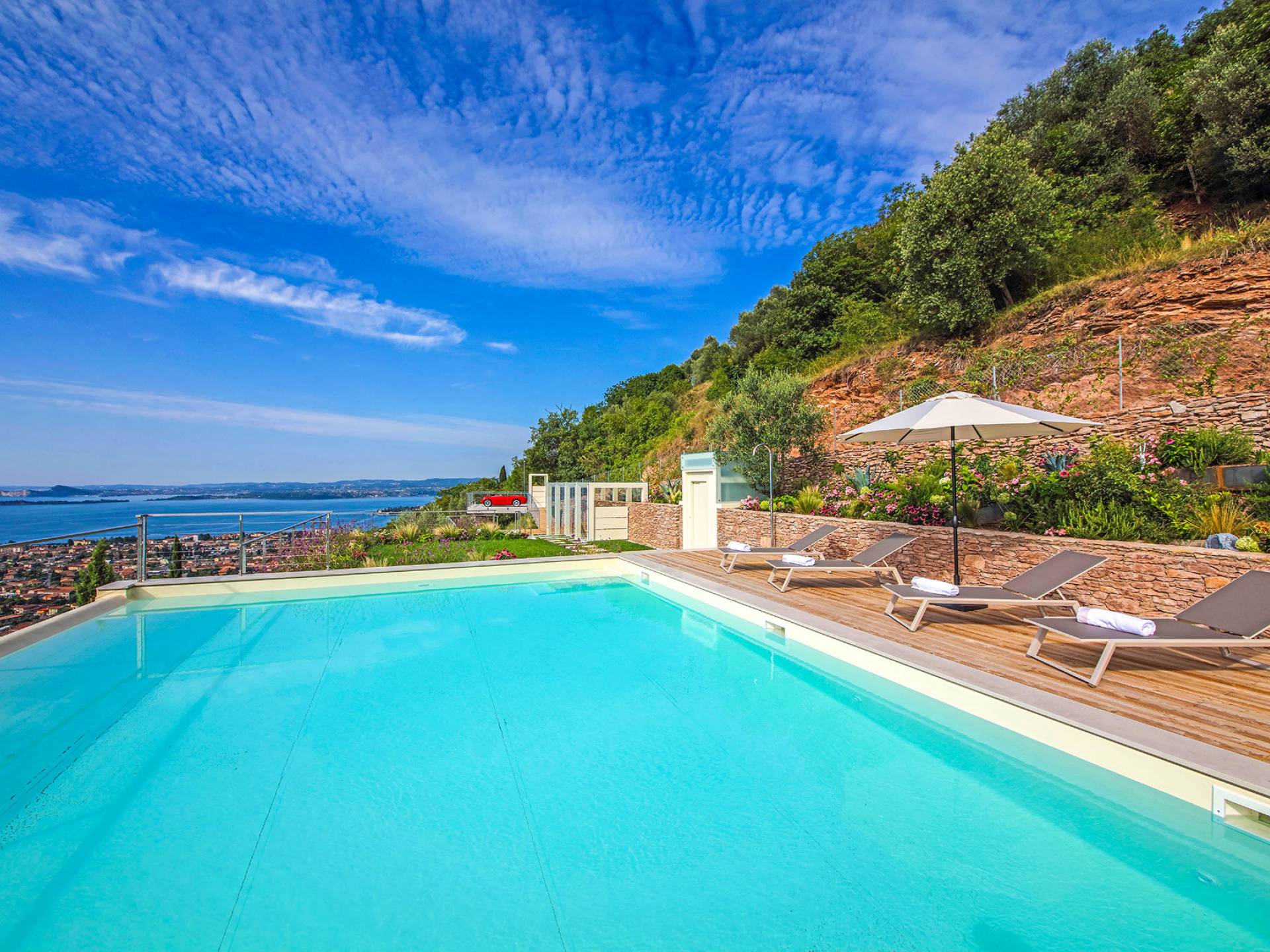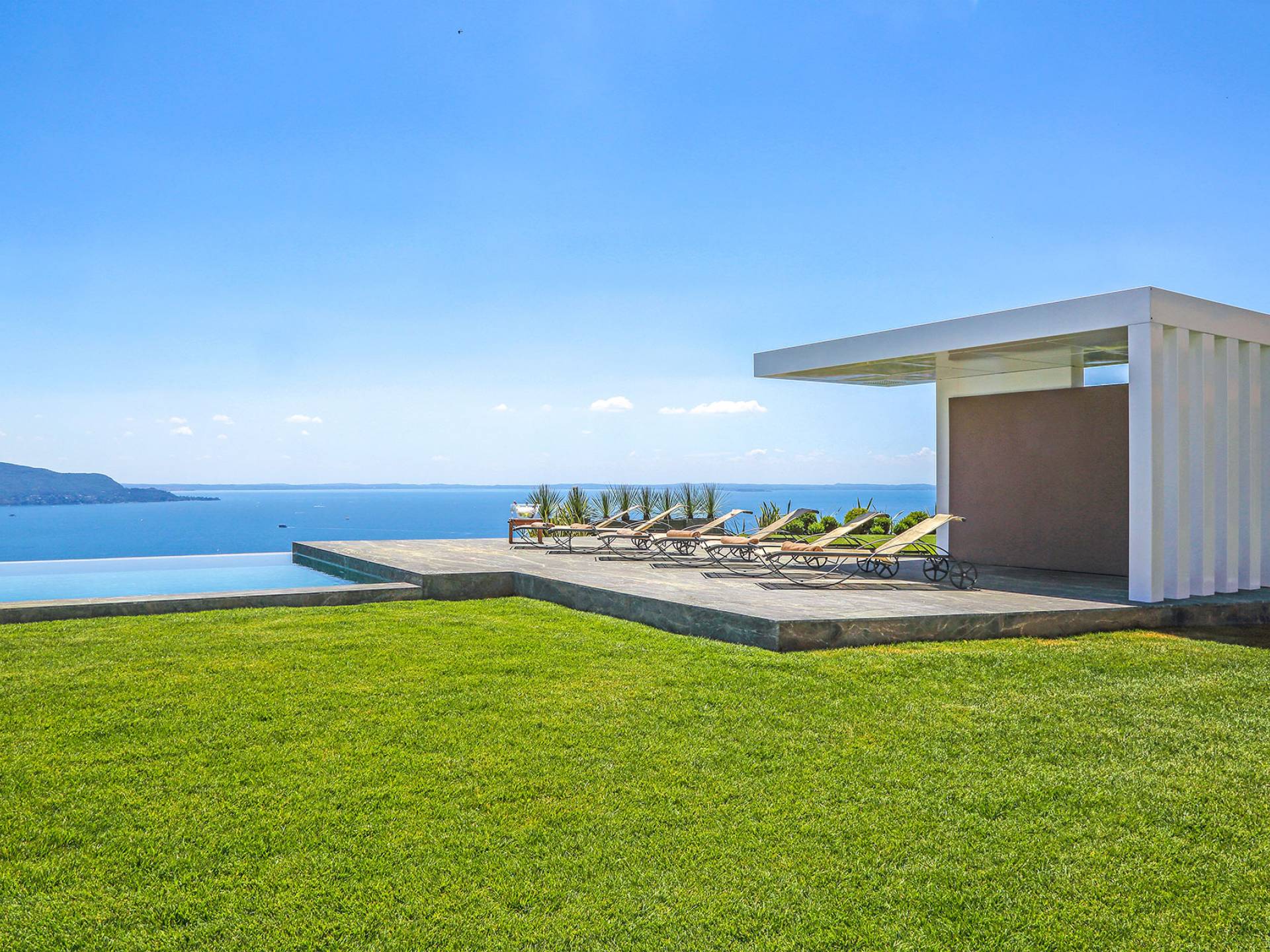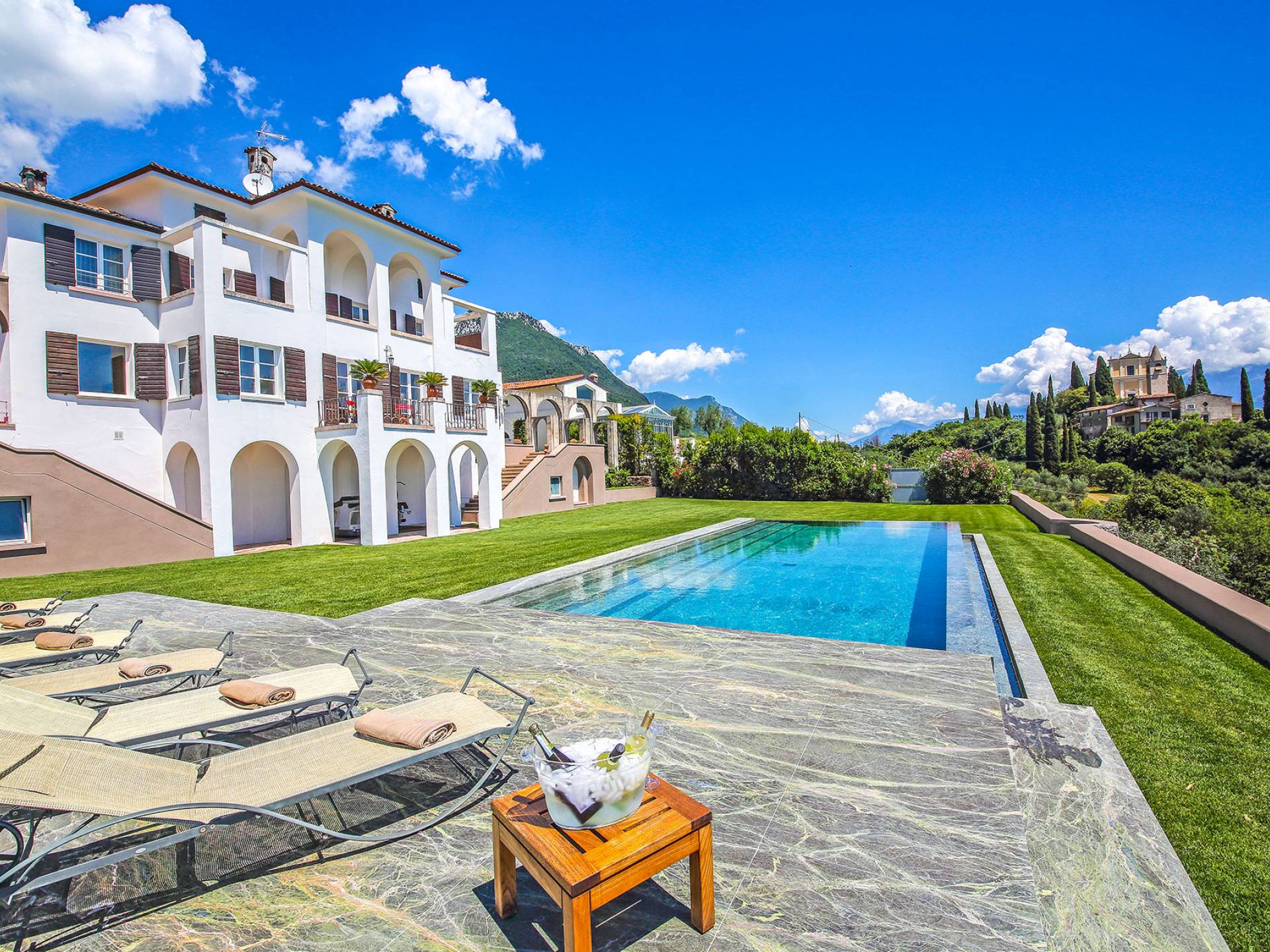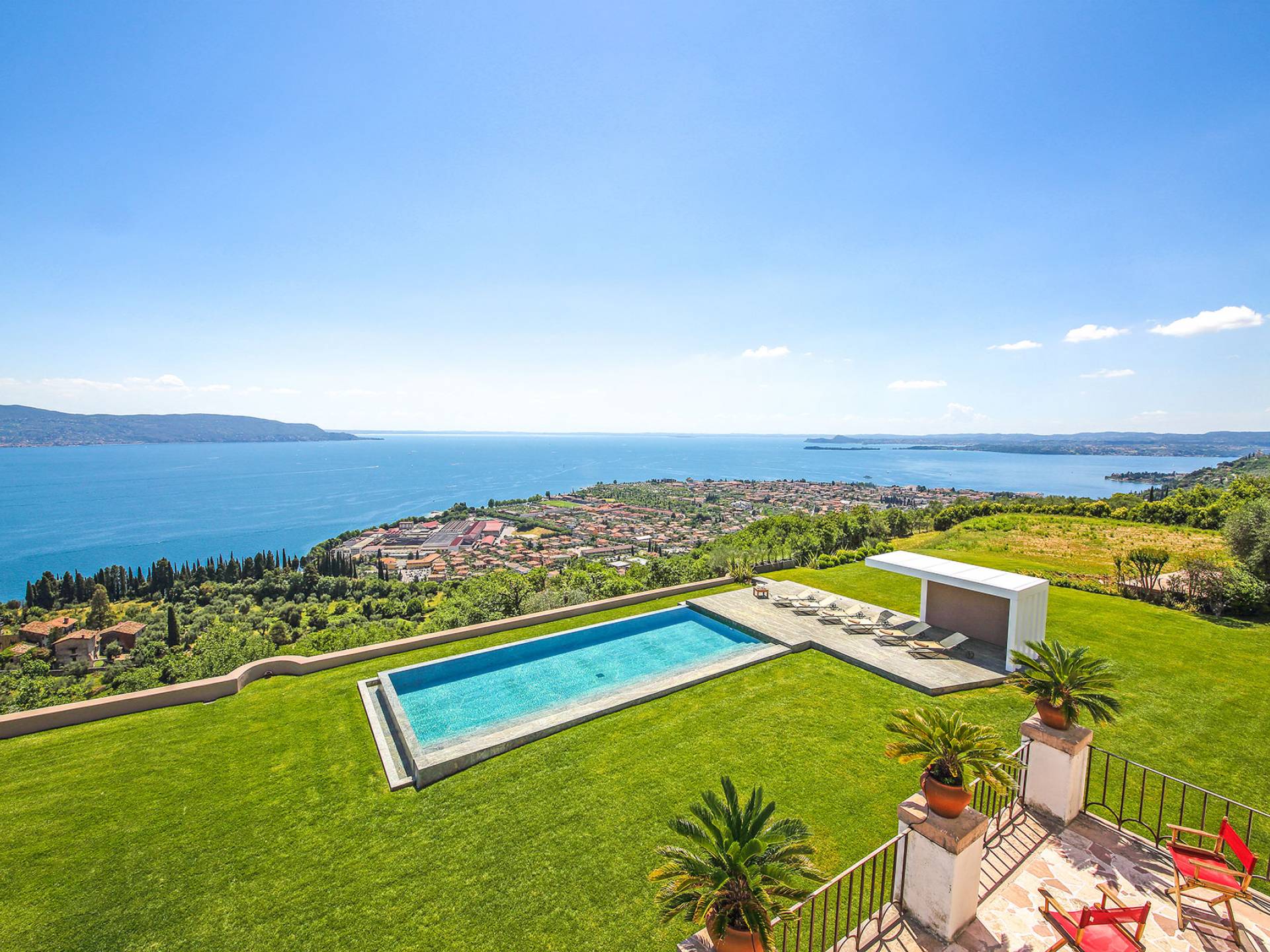 Garda Panoramic Manor Der Gardasee ist eine Luxusvilla mit 11 Schlafzimmern und 3 privaten Pools. Das von den Hügeln des Gardasees umrahmte Garda Panoramic Manor ist eine echte Luxusperle mit einer spektakulären Aussicht.