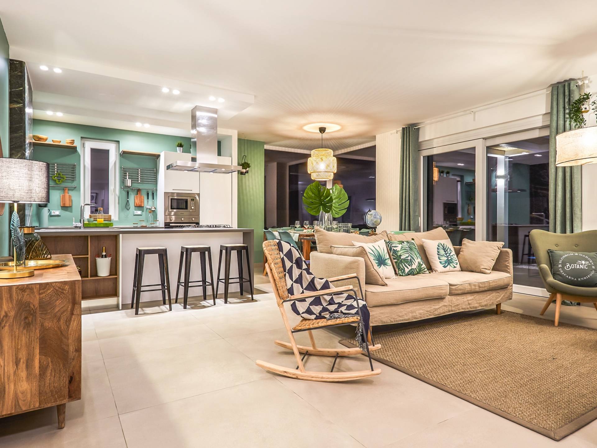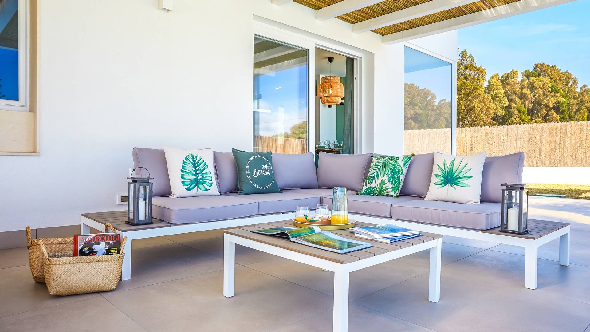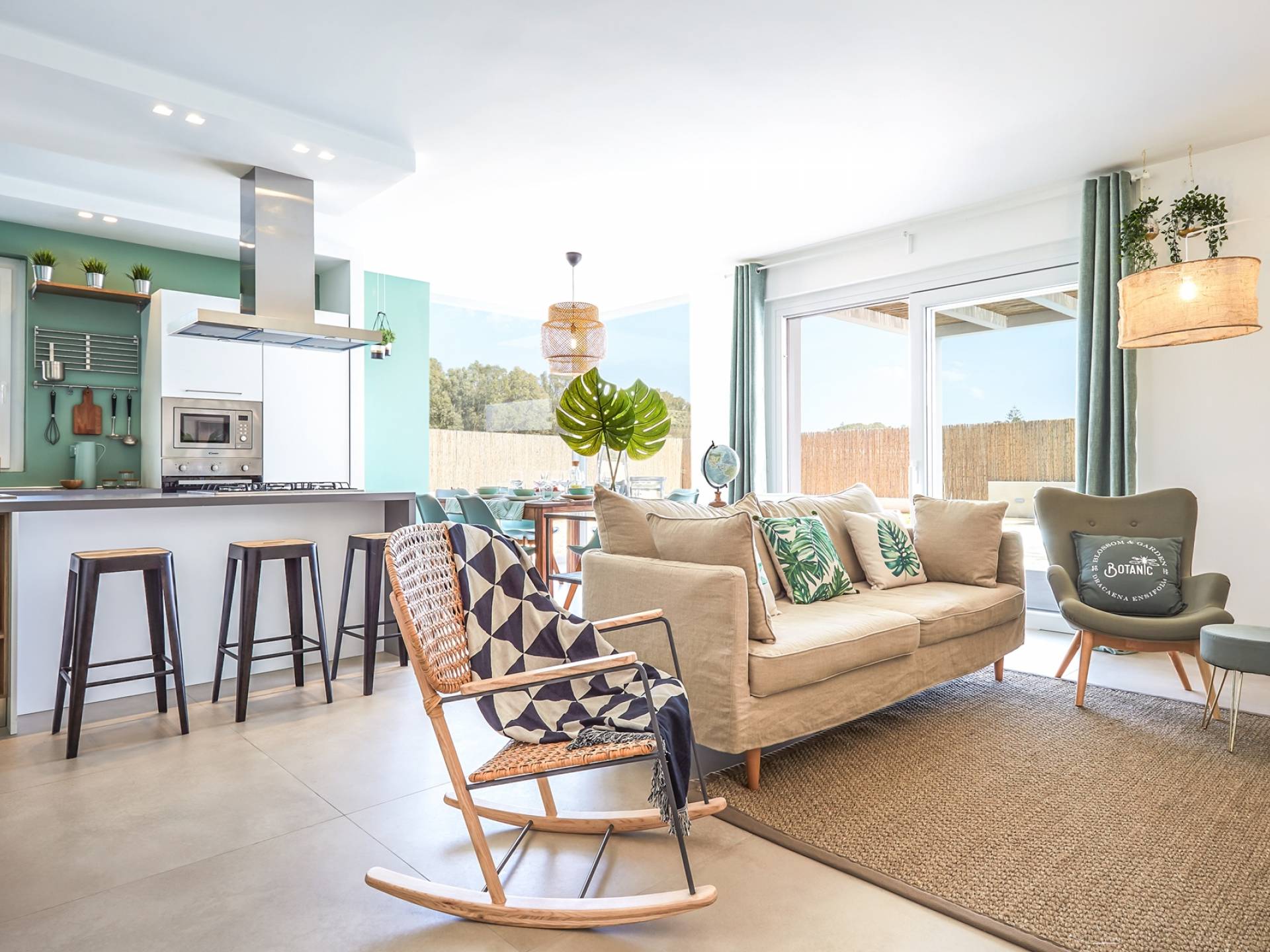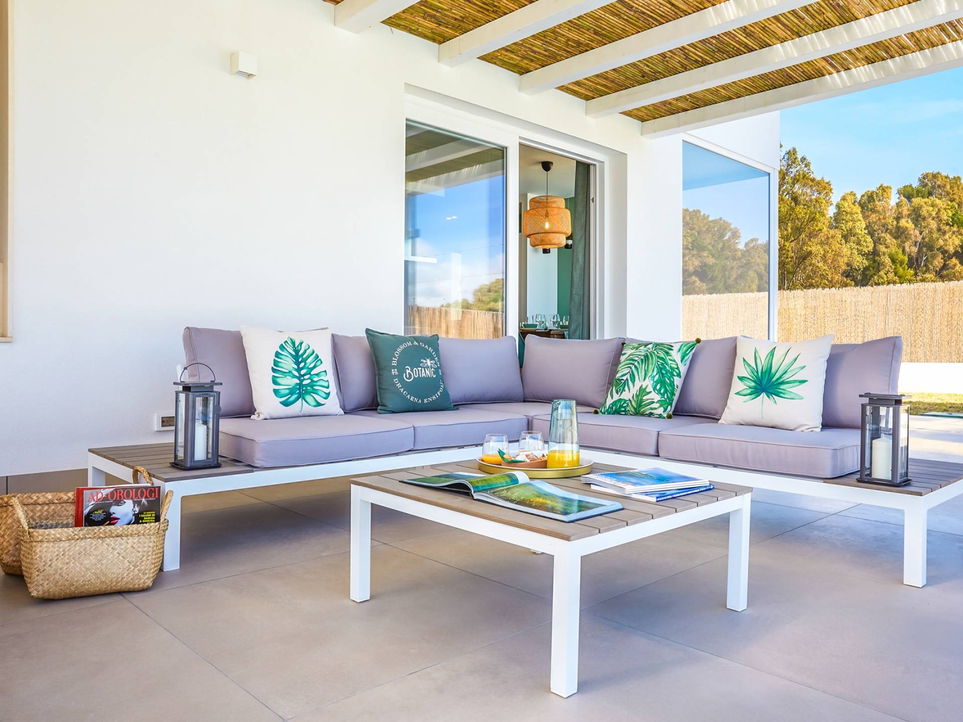 Die großen Fenster, die viel Licht in den Raum geben, blicken auf den Außenpool, die Veranda und den Garten. Im gleichen offenen Raum befindet sich auch ein gemütliches Wohnzimmer mit Sofa, Sessel und Schaukelstuhl zum bequemen Fernsehen und Genießen. Das Wohnzimmer führt direkt auf die Außenveranda, wo Sie dank des großen Tisches mit 12 Sitzplätzen auf einem bequemen Sofa sitzen oder im Freien zu Mittag und zu Abend essen können. Ein gefliester Außenbereich umgibt das ganze Haus und verbindet sich mit dem Garten und dem Swimmingpool, so dass Sie sich auf den Sonnenliegen ausruhen können. Eine echte Terrasse im Erdgeschoss, die Sie tagsüber und darüber hinaus genießen können.