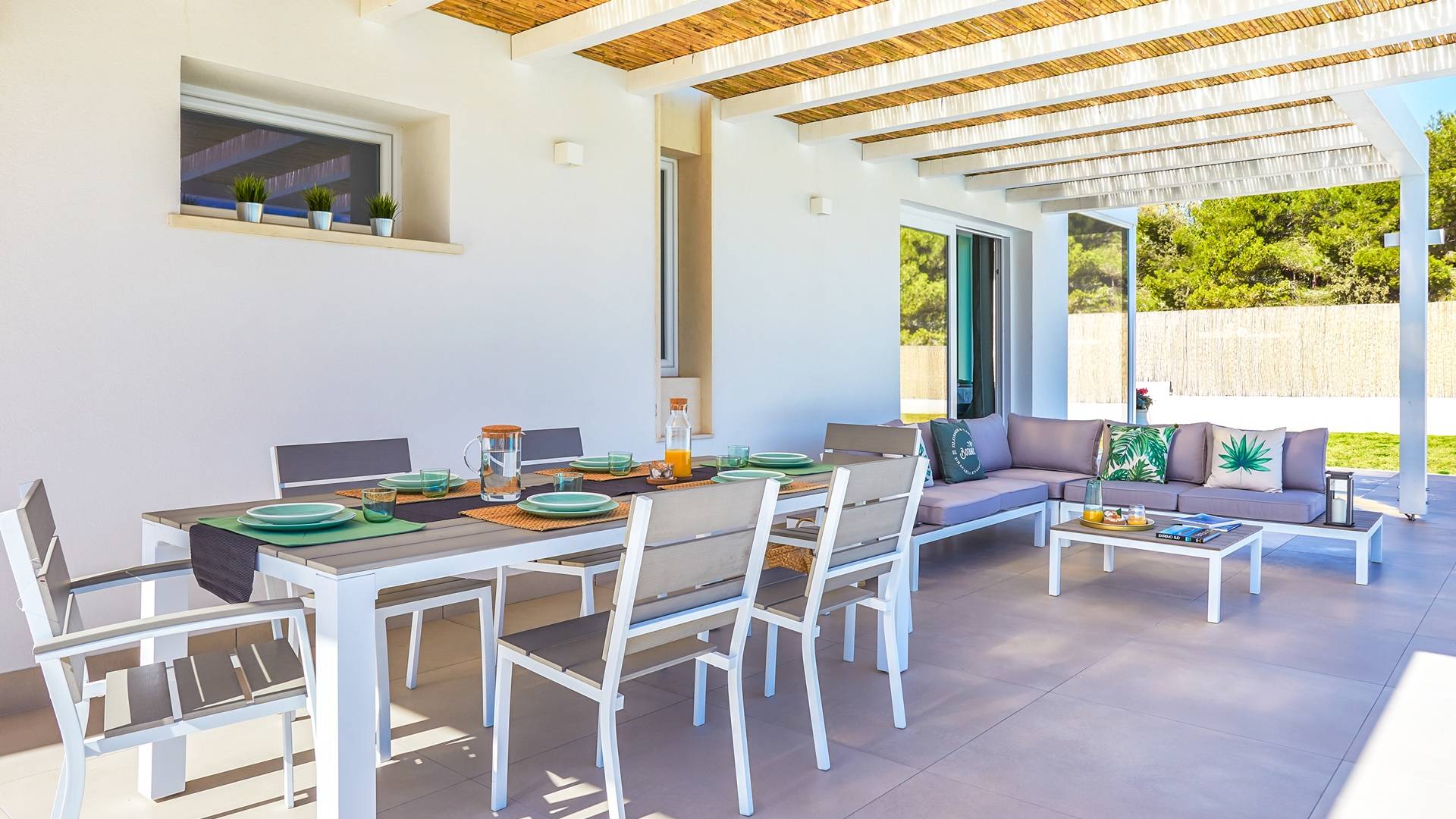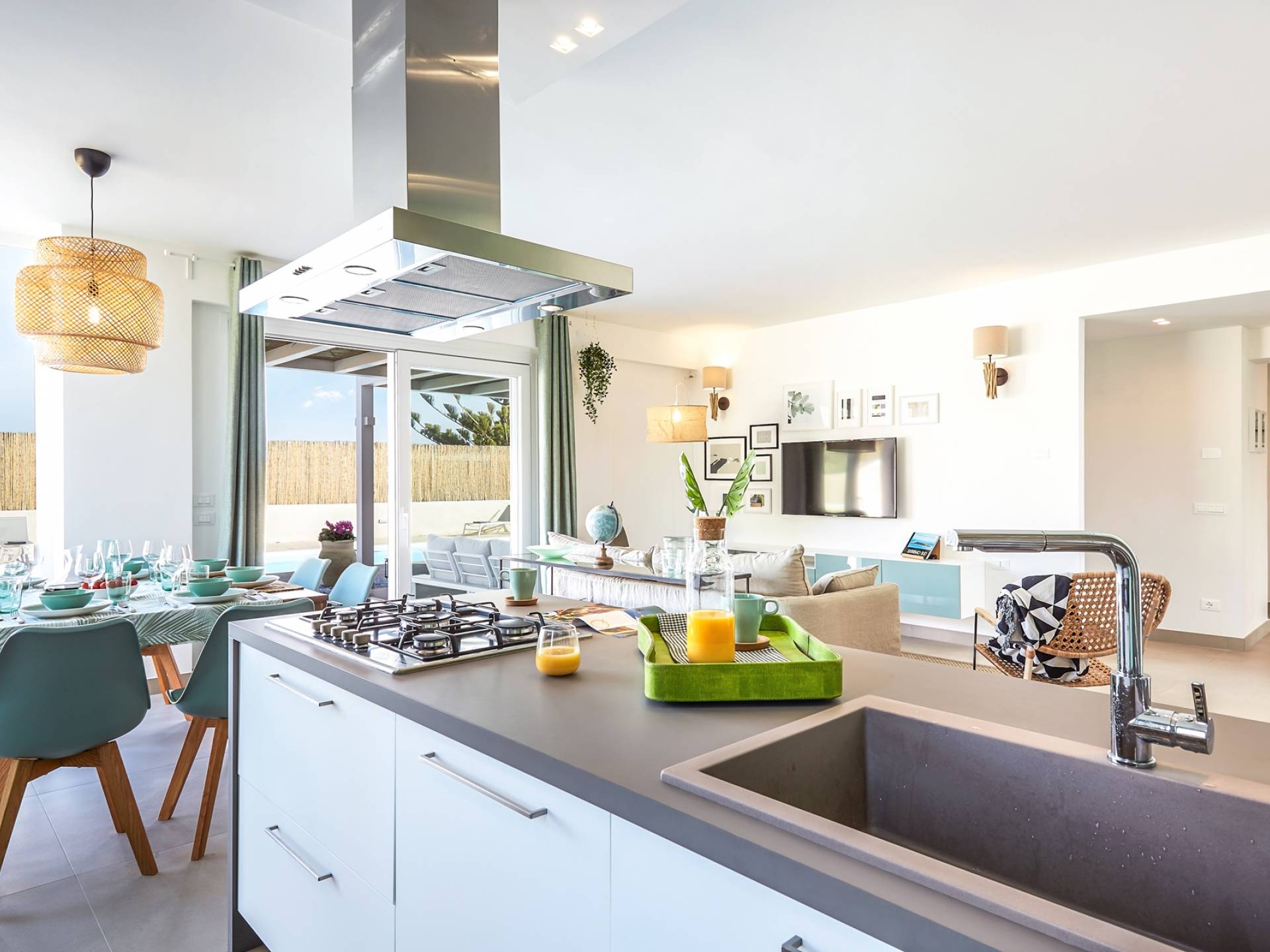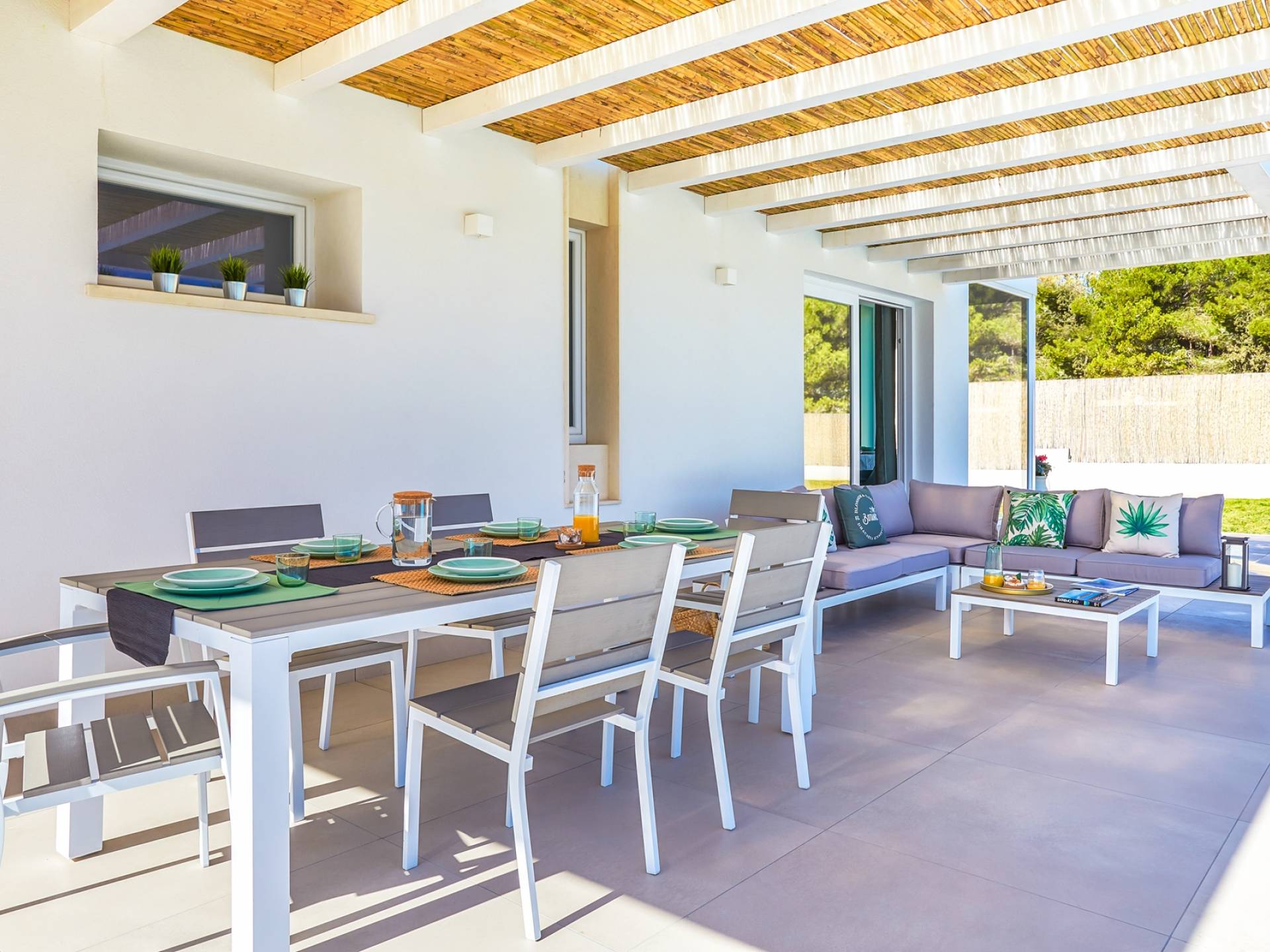Die großen Fenster, die viel Licht in den Raum geben, blicken auf den Außenpool, die Veranda und den Garten. Im gleichen offenen Raum befindet sich auch ein gemütliches Wohnzimmer mit Sofa, Sessel und Schaukelstuhl zum bequemen Fernsehen und Genießen. Das Wohnzimmer führt direkt auf die Außenveranda, wo Sie dank des großen Tisches mit 12 Sitzplätzen auf einem bequemen Sofa sitzen oder im Freien zu Mittag und zu Abend essen können. Ein gefliester Außenbereich umgibt das ganze Haus und verbindet sich mit dem Garten und dem Swimmingpool, so dass Sie sich auf den Sonnenliegen ausruhen können. Eine echte Terrasse im Erdgeschoss, die Sie tagsüber und darüber hinaus genießen können.
