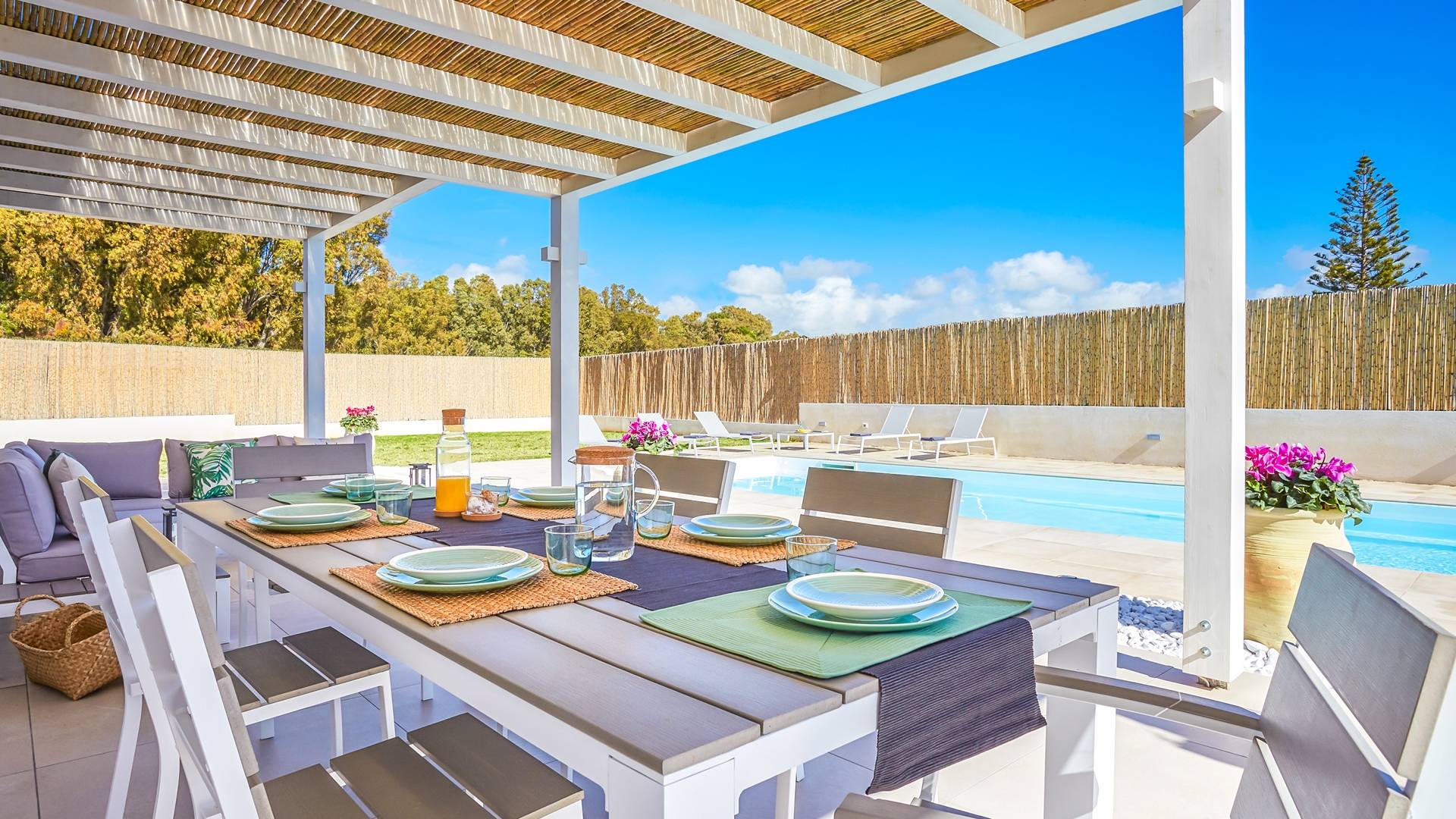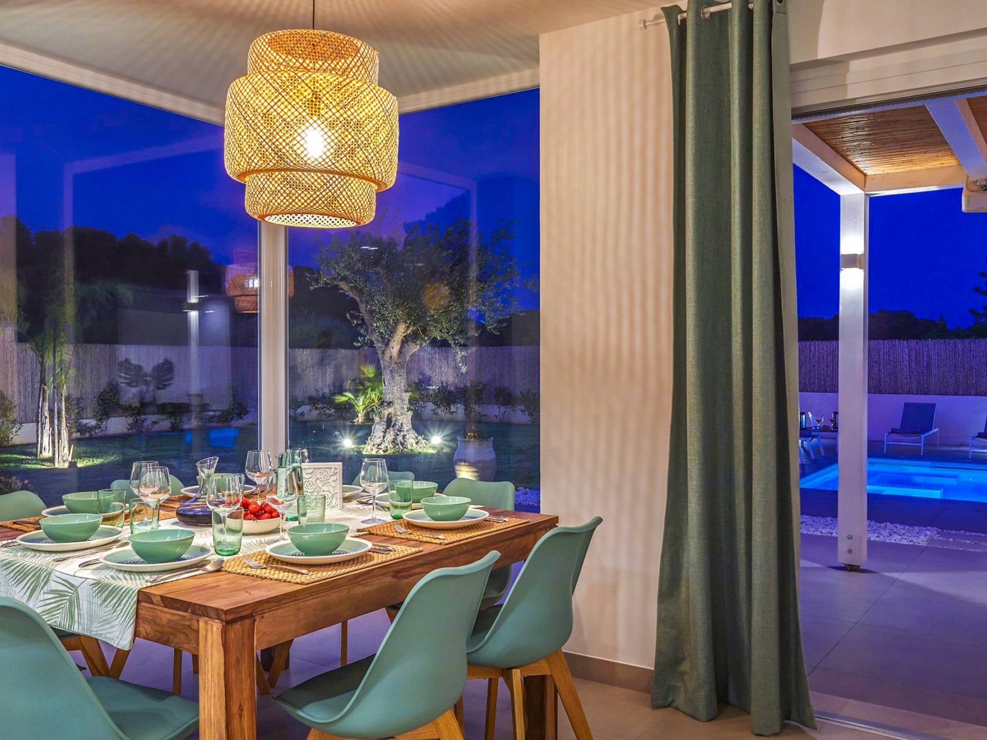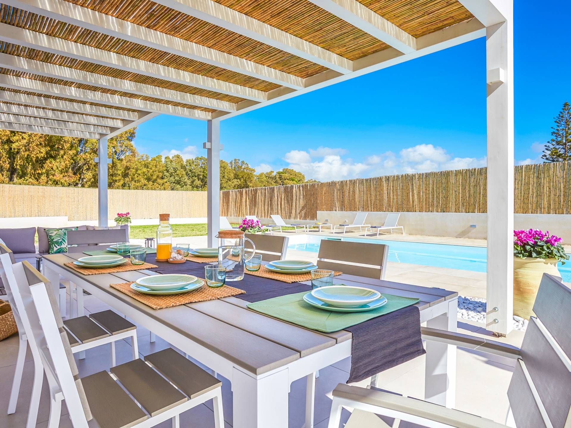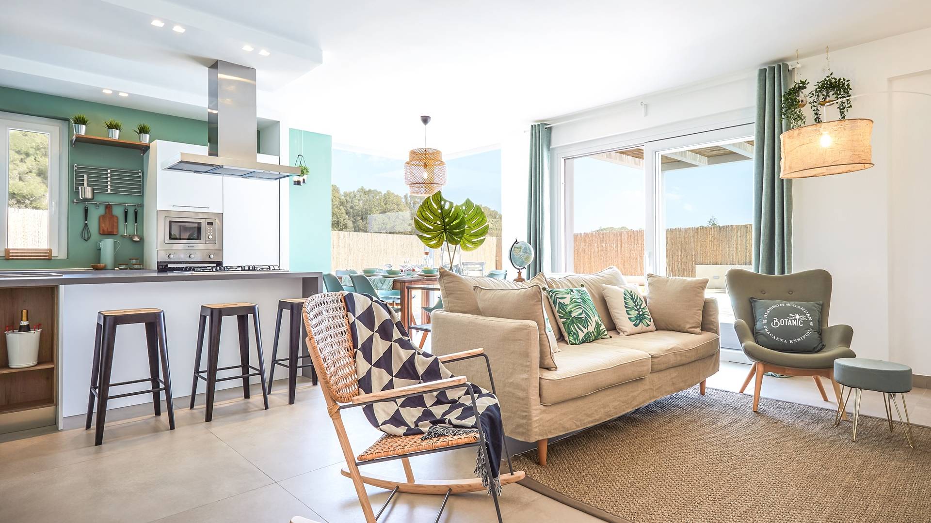 Die großen Fenster, die viel Licht in den Raum geben, blicken auf den Außenpool, die Veranda und den Garten. Im gleichen offenen Raum befindet sich auch ein gemütliches Wohnzimmer mit Sofa, Sessel und Schaukelstuhl zum bequemen Fernsehen und Genießen. Das Wohnzimmer führt direkt auf die Außenveranda, wo Sie dank des großen Tisches mit 12 Sitzplätzen auf einem bequemen Sofa sitzen oder im Freien zu Mittag und zu Abend essen können. Ein gefliester Außenbereich umgibt das ganze Haus und verbindet sich mit dem Garten und dem Swimmingpool, so dass Sie sich auf den Sonnenliegen ausruhen können. Eine echte Terrasse im Erdgeschoss, die Sie tagsüber und darüber hinaus genießen können.