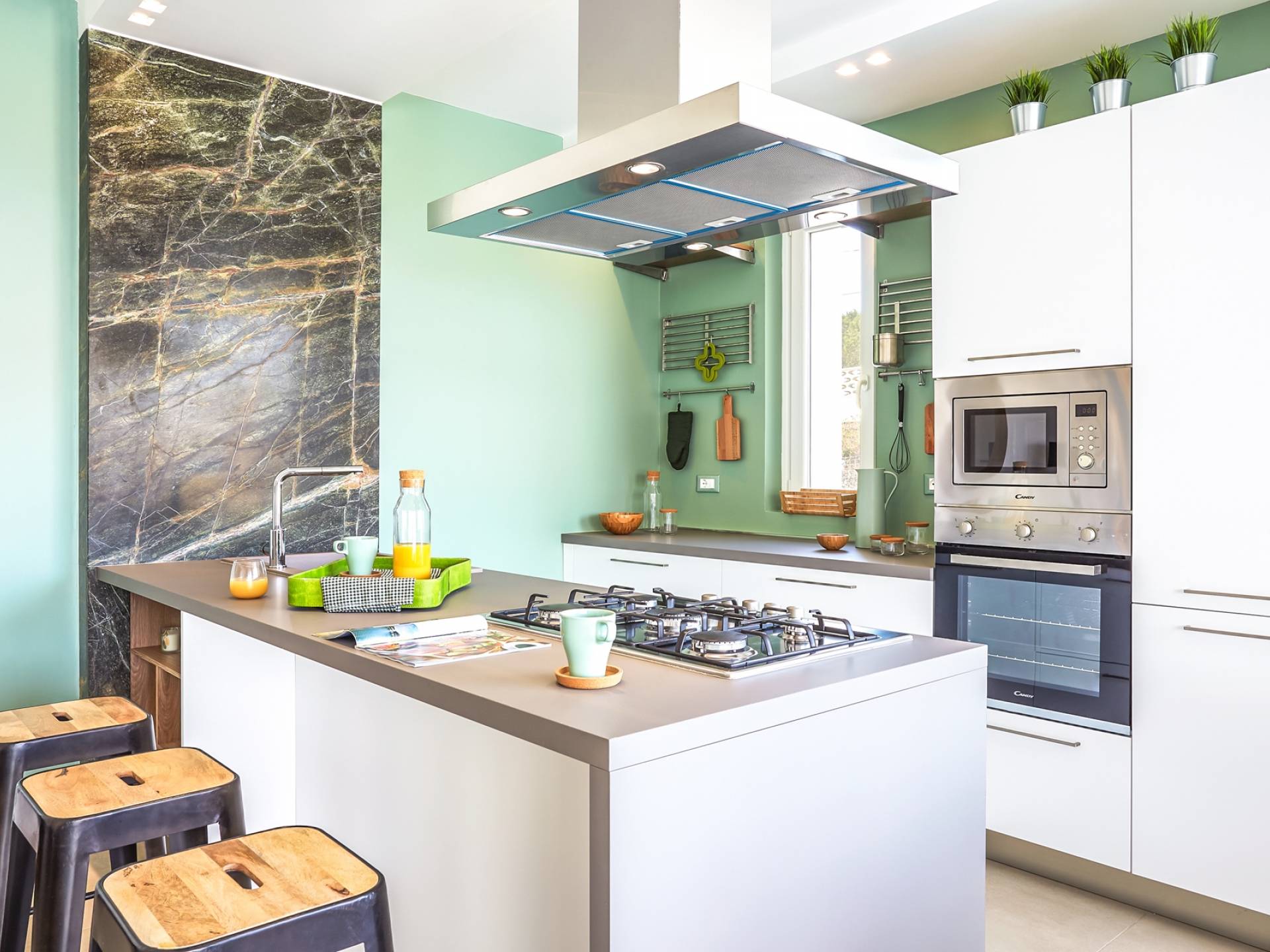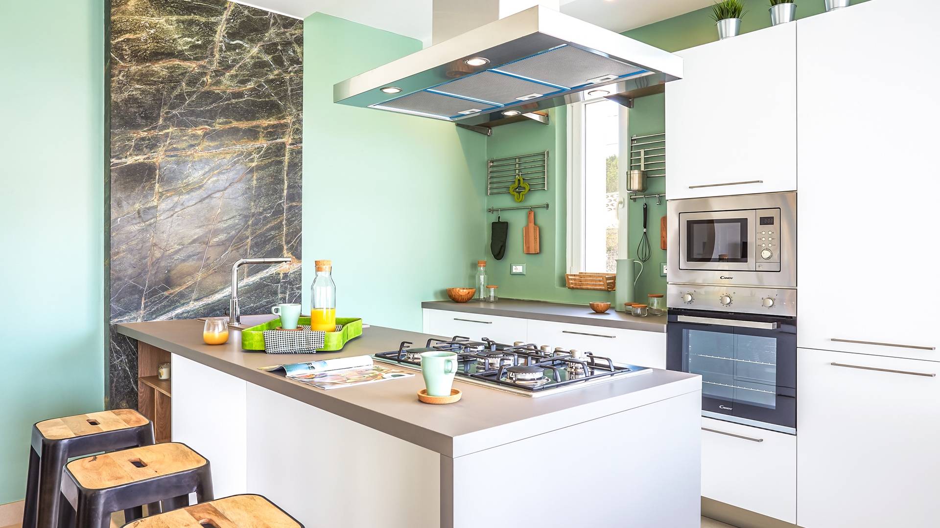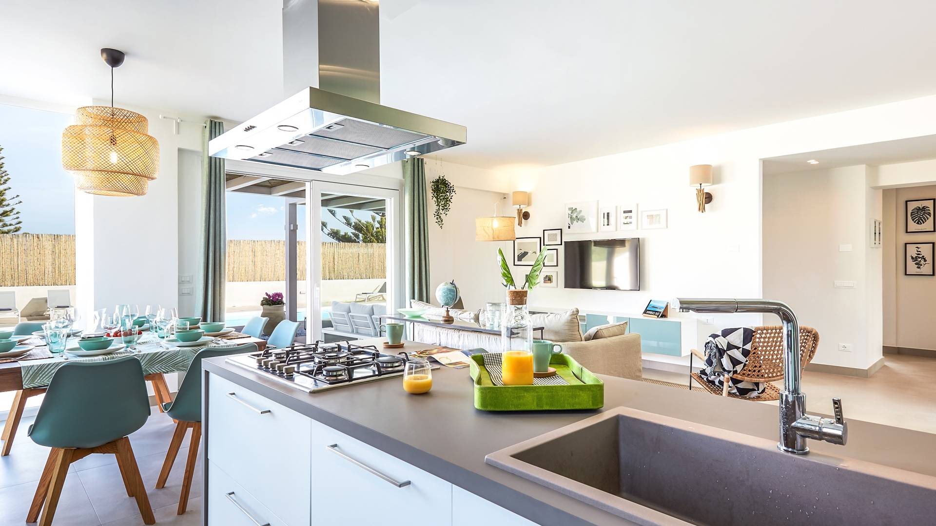 Die Zimmer sind mit Doppelbetten und Einzelbetten ausgestattet, die alle mit Memoryschaum-Matratzen ausgestattet sind. In den Bädern hingegen gibt es extra große Duschen mit 130 Zentimeter Breite. Im Erdgeschoss haben Sie eine amerikanische Küche ganz für sich allein mit allem, was Sie für Mittag- und Abendessen und gesellige Momente für bis zu 12 Personen benötigen. Neben traditionellen Geräten finden Sie hier auch eine Spülmaschine, eine Mikrowelle, einen Backofen, einen Wasserkocher, einen Mixer und einen Eiswürfelbereiter. Die Küche hat eine Halbinsel mit 3 Sitzplätzen auf einem Hocker und einem 8-Sitzer Tisch.