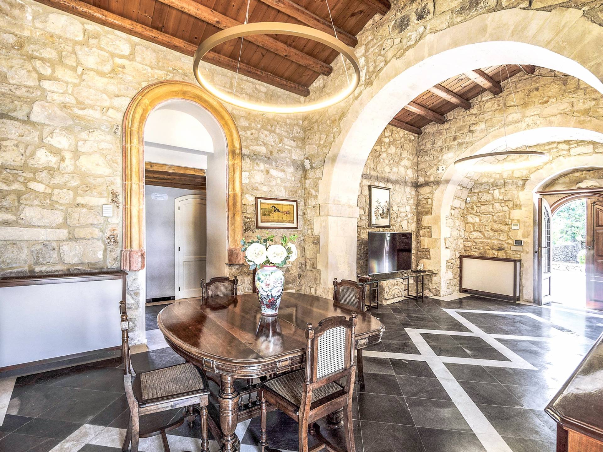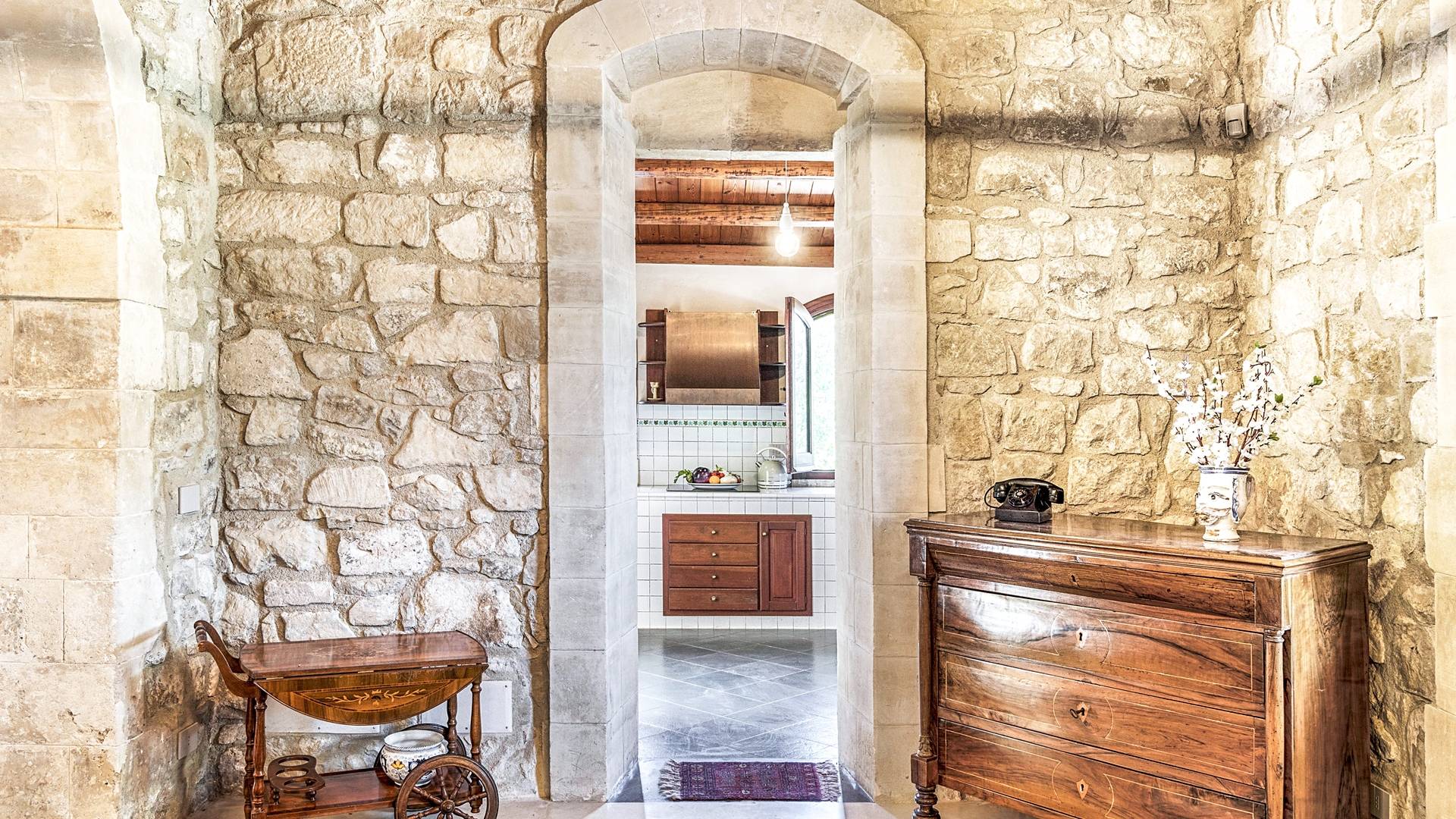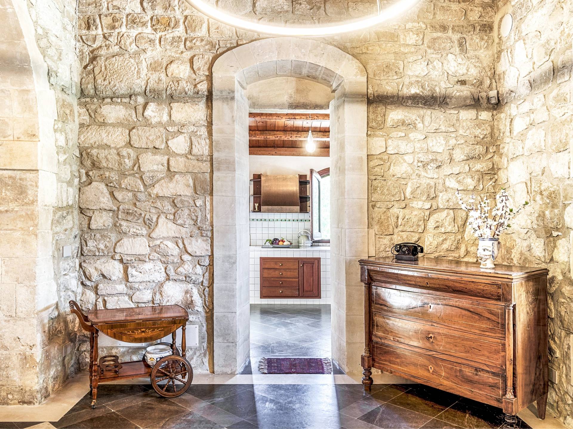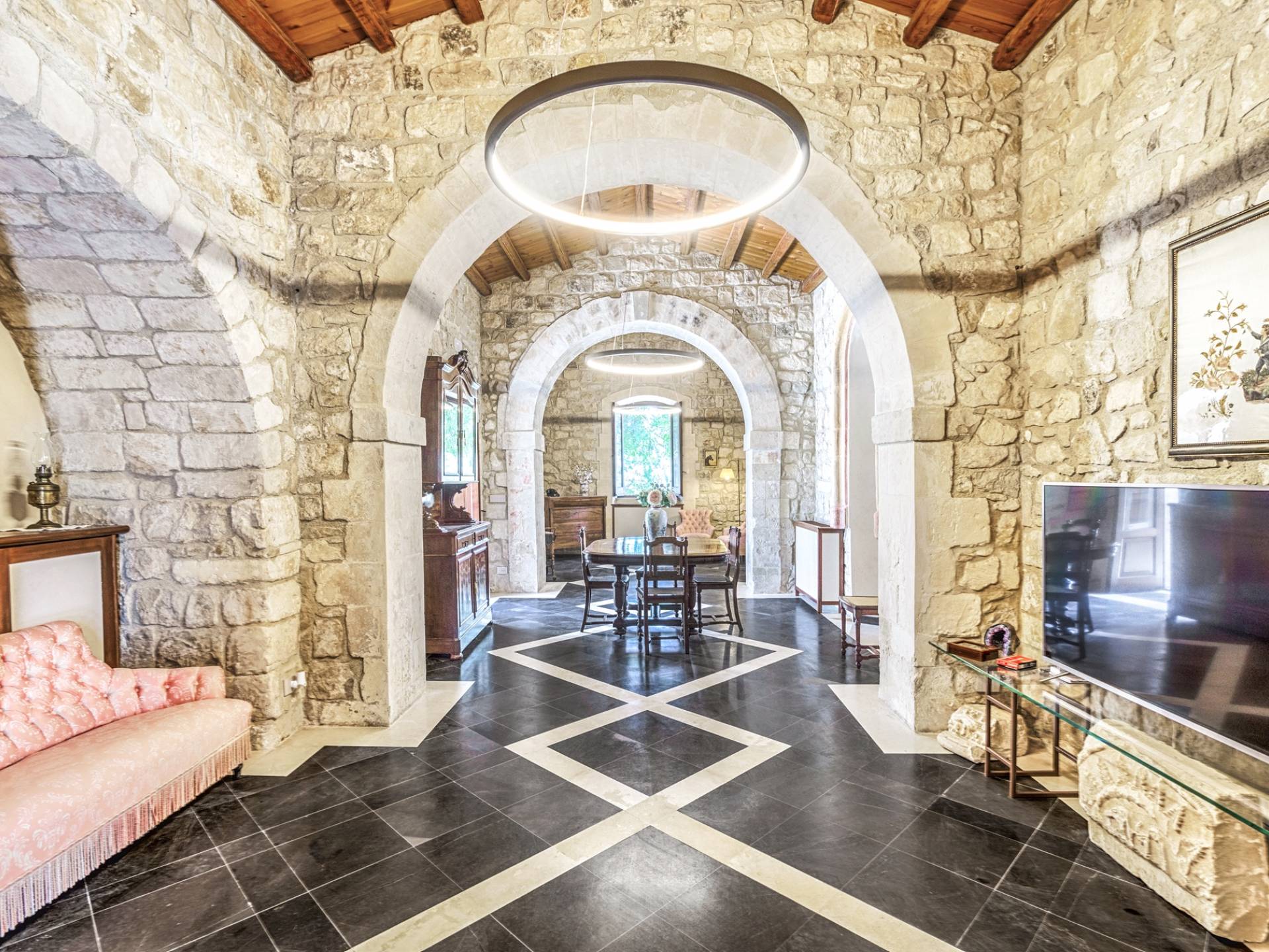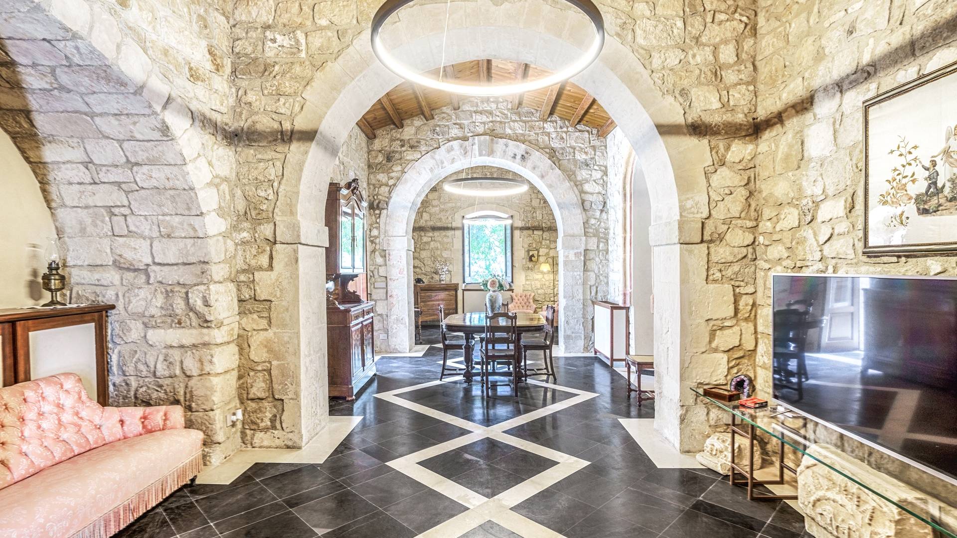 Eine von Olivenbäumen gesäumte Auffahrt führt Sie zum Hanggrundstück. Der Haupteingang ist durch die einstigen Kapellentüren mit dem schönen Glockenturm, der hoch über Ihnen steht.