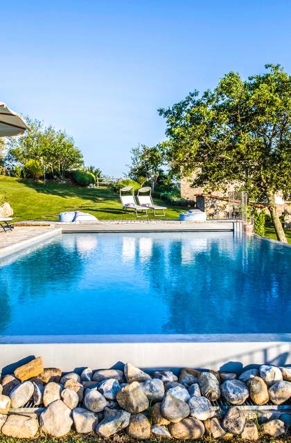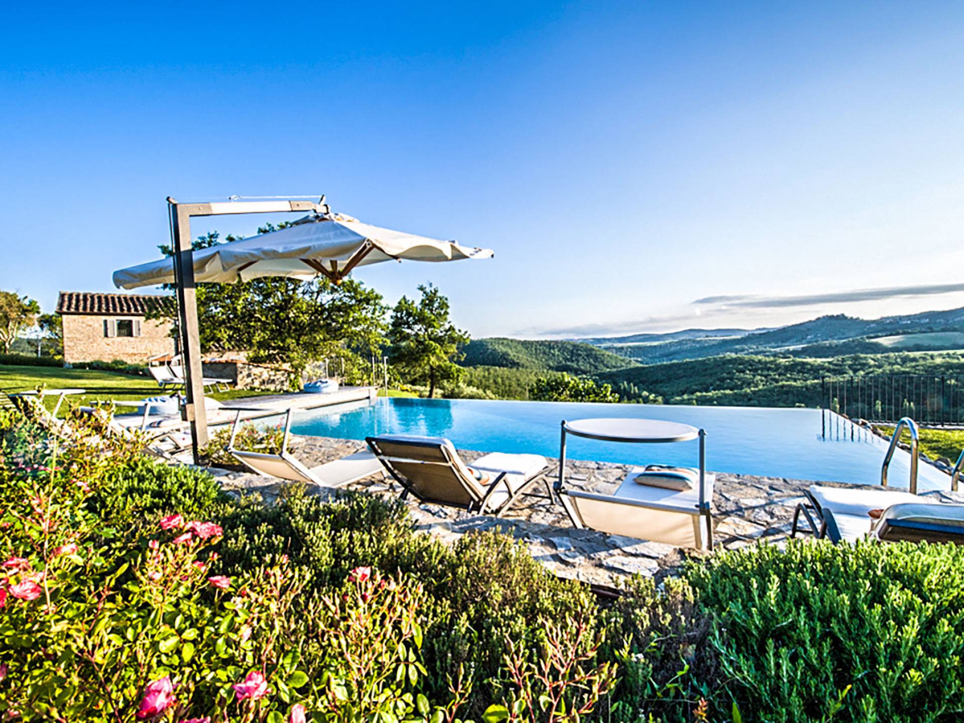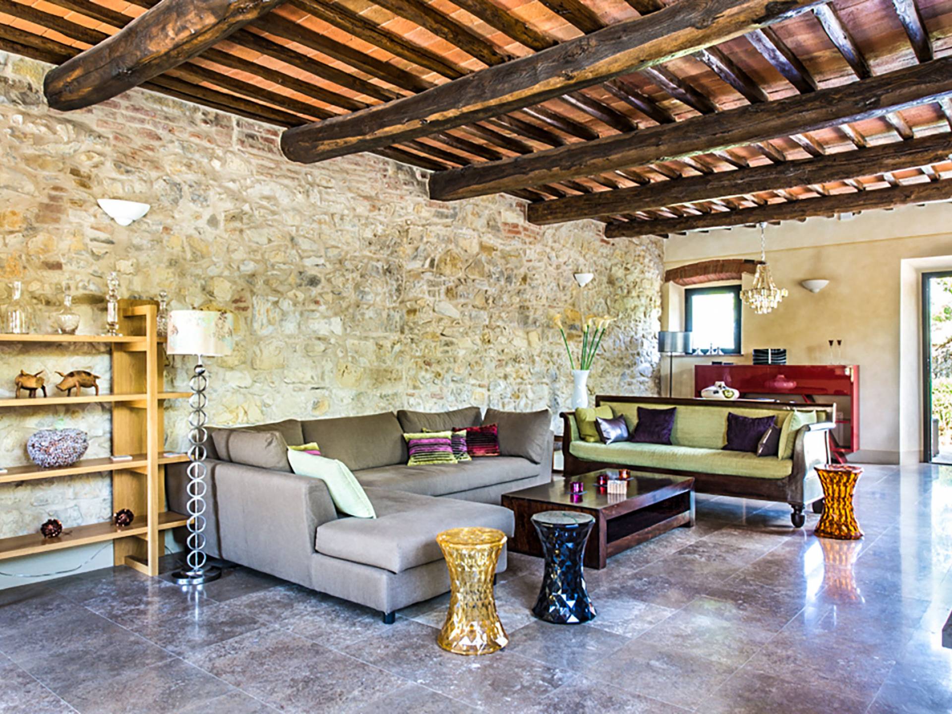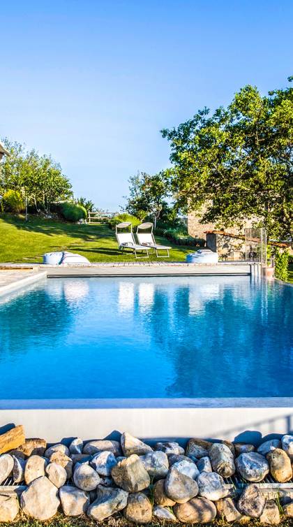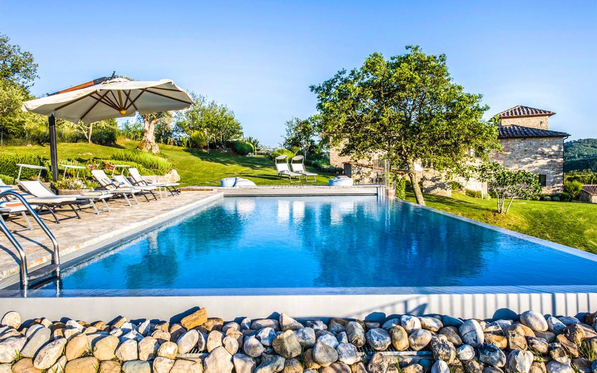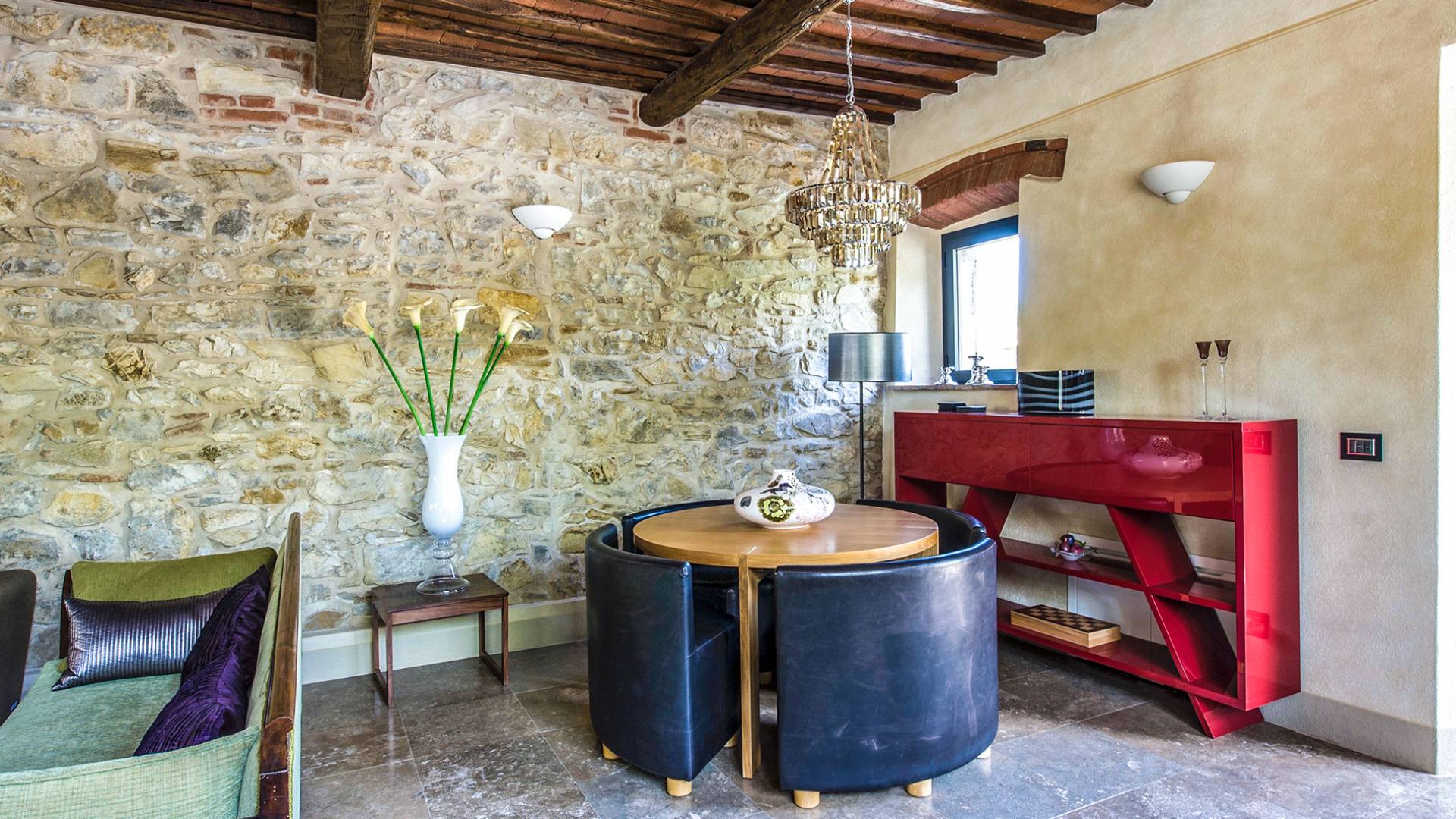Auf einem Hügel in Gaiole in Chianti in einer vom Forbes-Magazin als die idyllischste in Europa eingestuften Gegend liegt die Villa Anna Tuscany mit 360-Grad-Blick, zwei Hektar großen Gärten und einem Infinity-Pool. Villa Anna Toskana bietet eine neue Perspektive auf das toskanische Leben. Das vierhundert Jahre alte Bauernhaus, das nach höchsten Designstandards und umweltfreundlichen Prinzipien restauriert wurde, ist heute ein weitläufiges und luxuriöses Einfamilienhaus, das den besten italienischen Stil und die beste Handwerkskunst mit zeitgenössischem Dekor vereint: ein offener Raum mit viel Licht, exponiert Stein, original Holzbalken, Travertinböden, zeitgenössische Möbel und moderne Kunst.