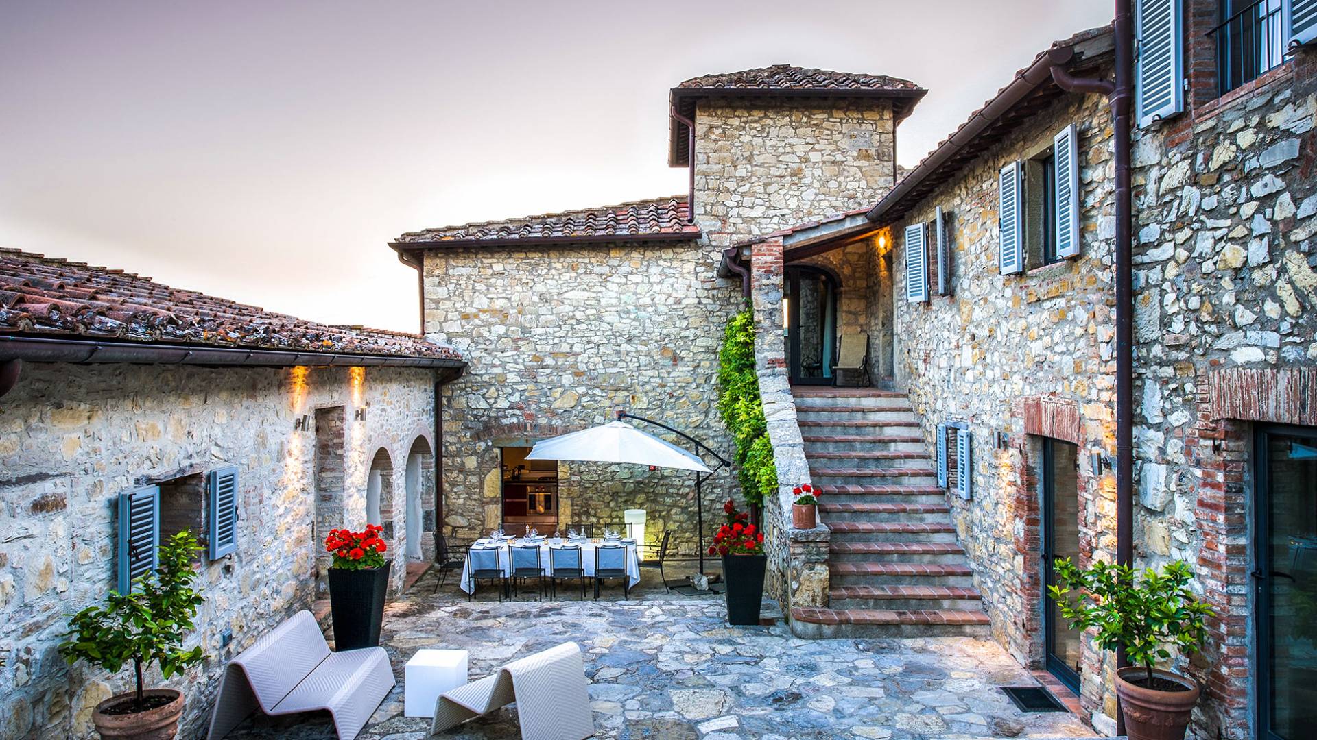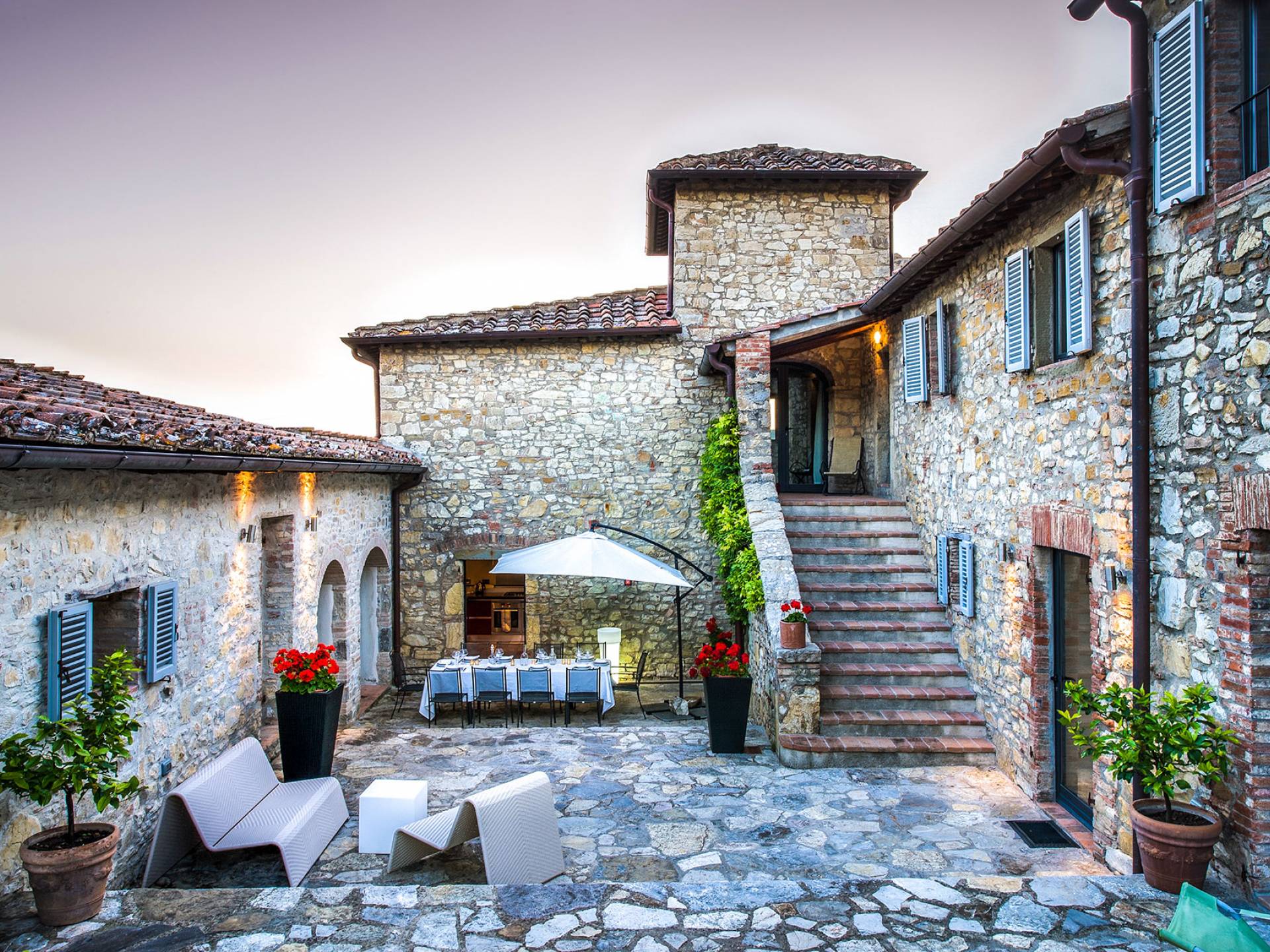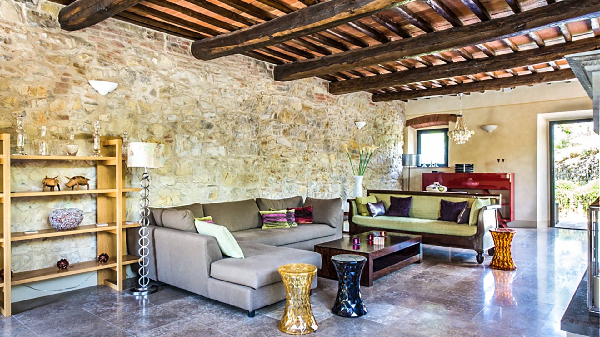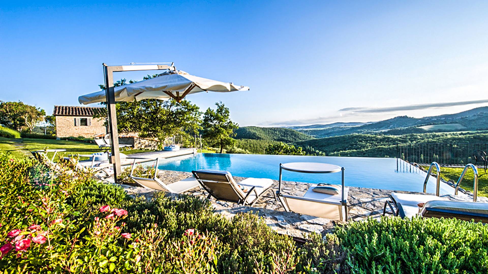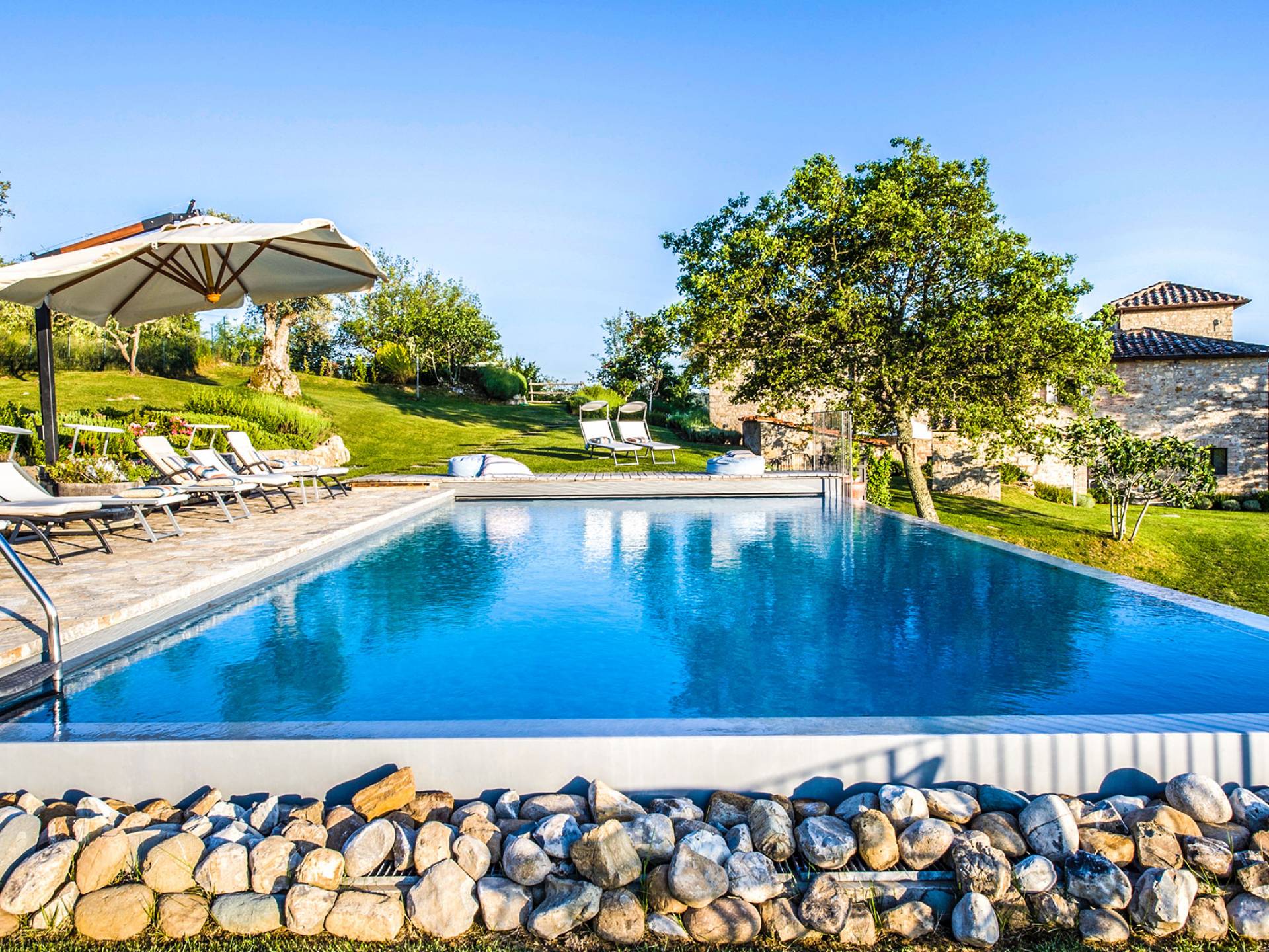 Auf einem Hügel in Gaiole in Chianti in einer vom Forbes-Magazin als die idyllischste in Europa eingestuften Gegend liegt die Villa Anna Tuscany mit 360-Grad-Blick, zwei Hektar großen Gärten und einem Infinity-Pool. Villa Anna Toskana bietet eine neue Perspektive auf das toskanische Leben. Das vierhundert Jahre alte Bauernhaus, das nach höchsten Designstandards und umweltfreundlichen Prinzipien restauriert wurde, ist heute ein weitläufiges und luxuriöses Einfamilienhaus, das den besten italienischen Stil und die beste Handwerkskunst mit zeitgenössischem Dekor vereint: ein offener Raum mit viel Licht, exponiert Stein, original Holzbalken, Travertinböden, zeitgenössische Möbel und moderne Kunst.