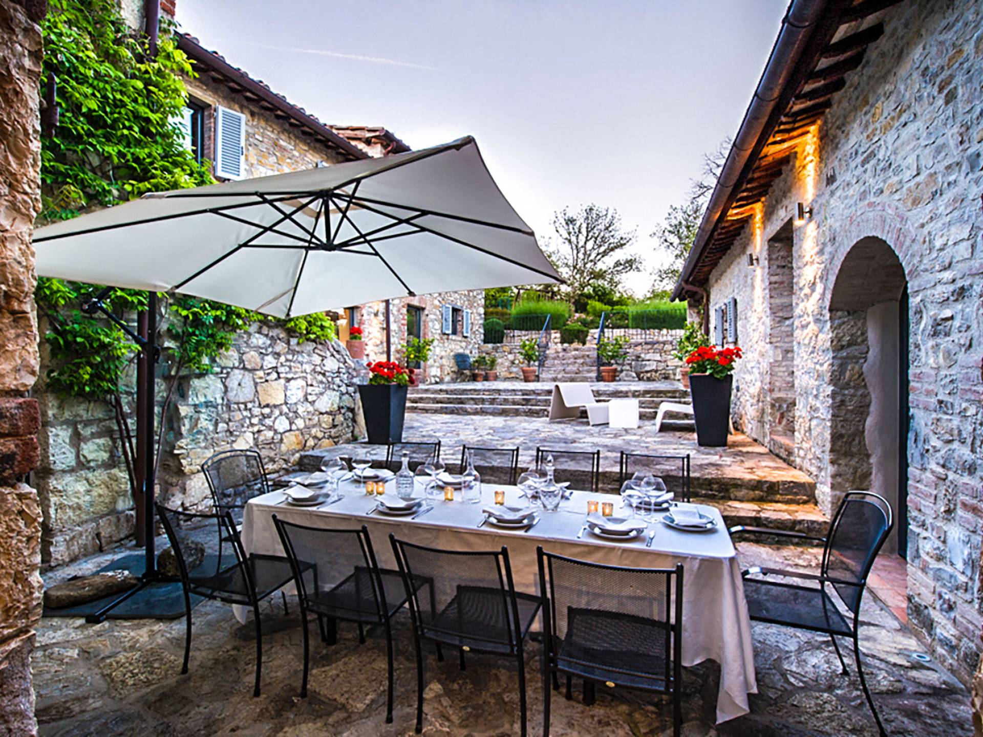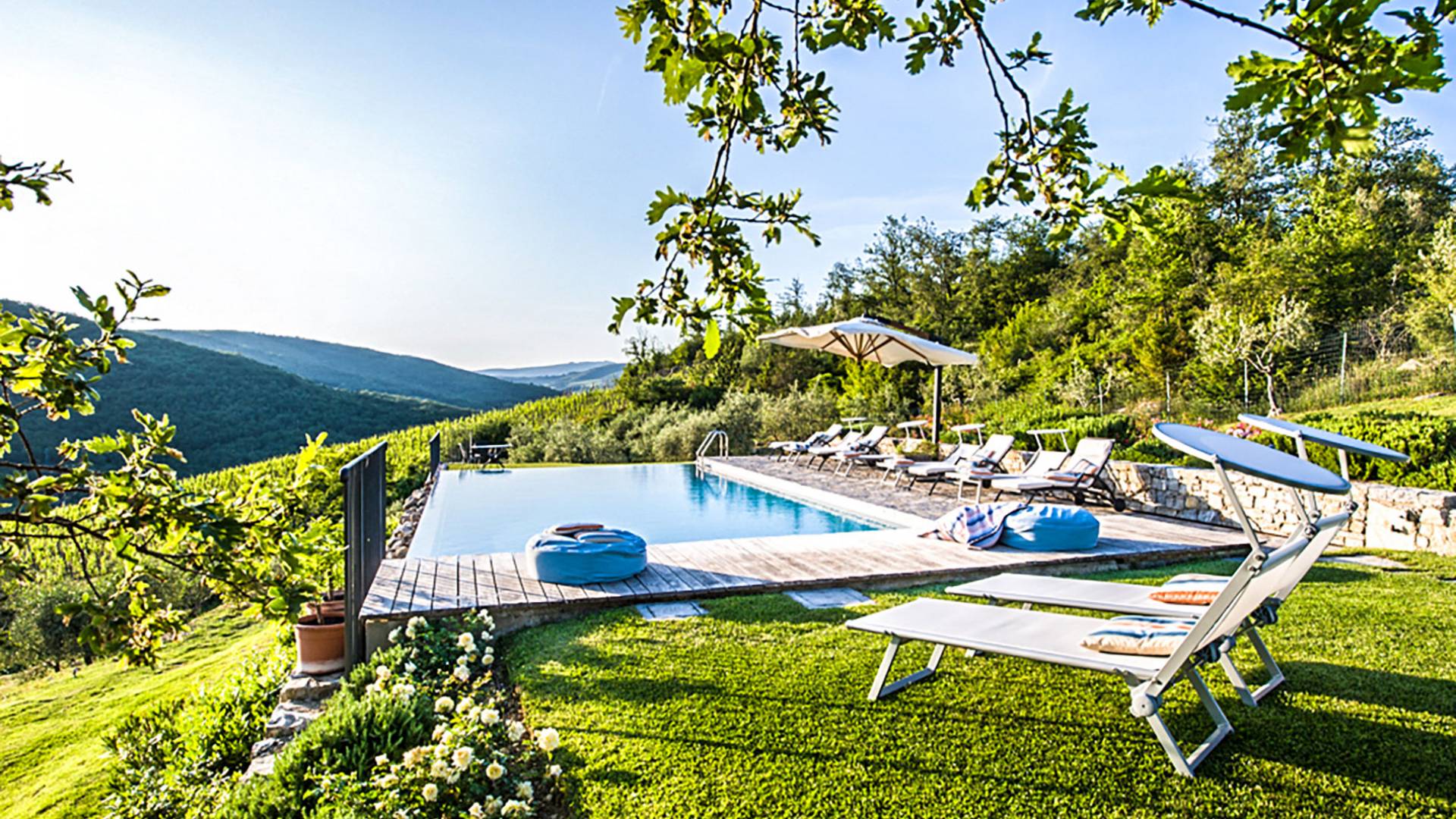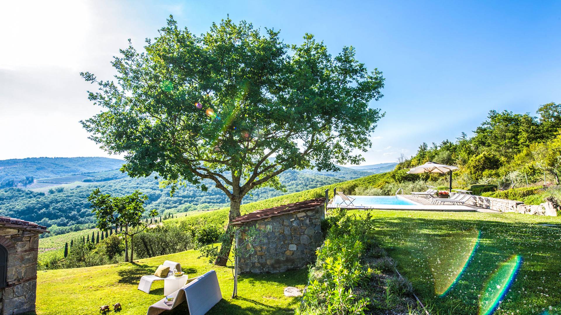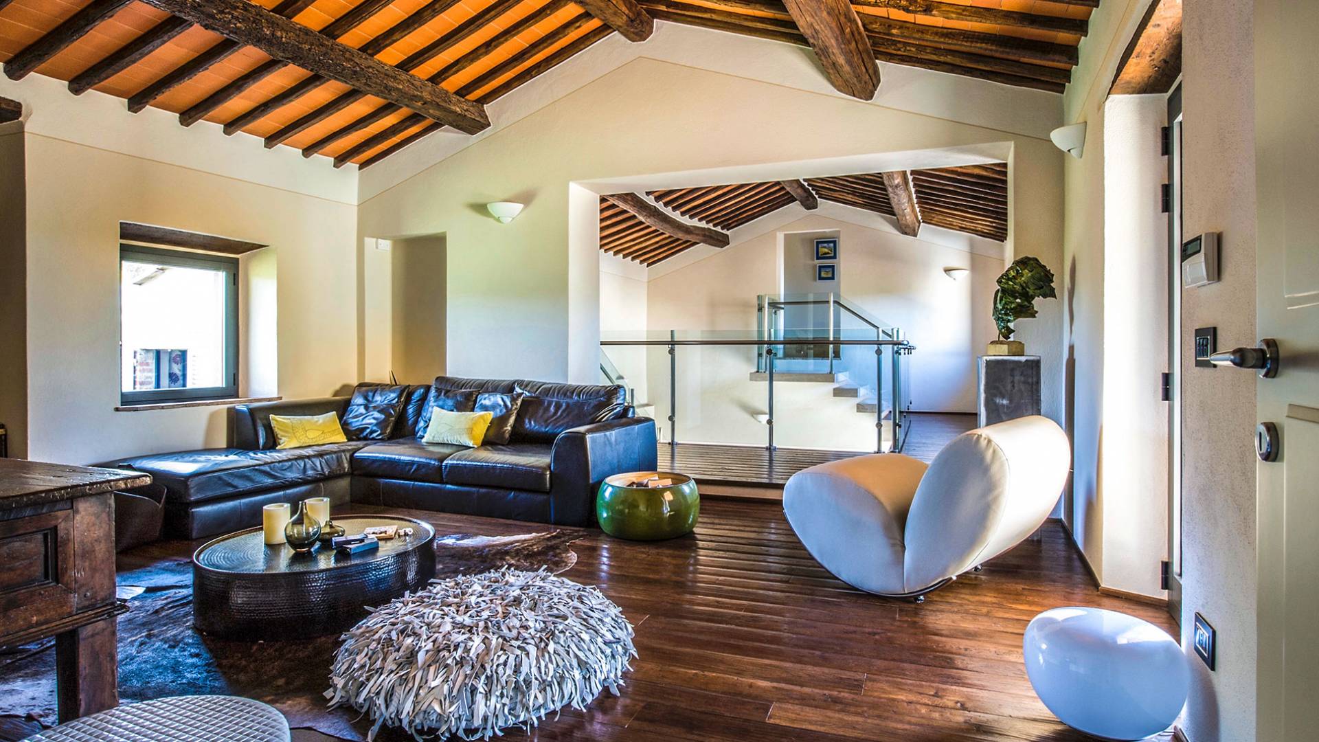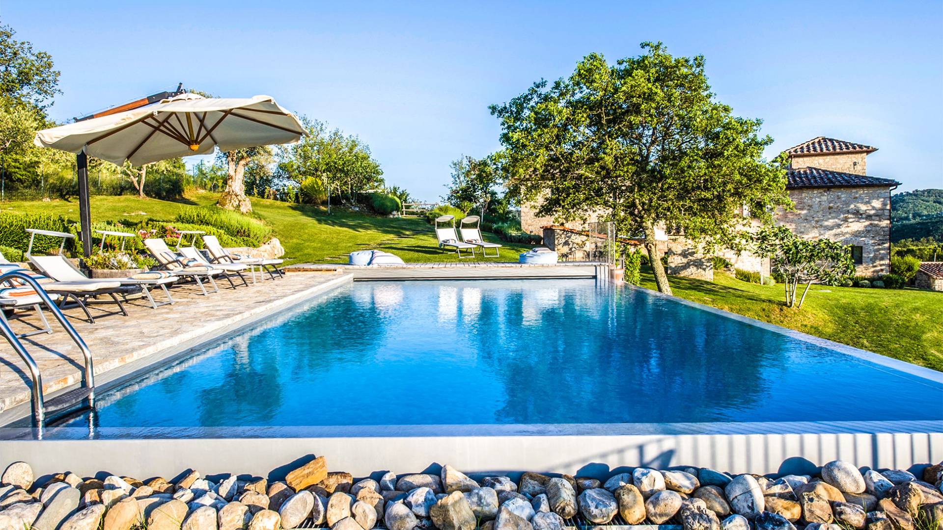Auf einem Hügel in Gaiole in Chianti in einer vom Forbes-Magazin als die idyllischste in Europa eingestuften Gegend liegt die Villa Anna Tuscany mit 360-Grad-Blick, zwei Hektar großen Gärten und einem Infinity-Pool. Villa Anna Toskana bietet eine neue Perspektive auf das toskanische Leben. Das vierhundert Jahre alte Bauernhaus, das nach höchsten Designstandards und umweltfreundlichen Prinzipien restauriert wurde, ist heute ein weitläufiges und luxuriöses Einfamilienhaus, das den besten italienischen Stil und die beste Handwerkskunst mit zeitgenössischem Dekor vereint: ein offener Raum mit viel Licht, exponiert Stein, original Holzbalken, Travertinböden, zeitgenössische Möbel und moderne Kunst.