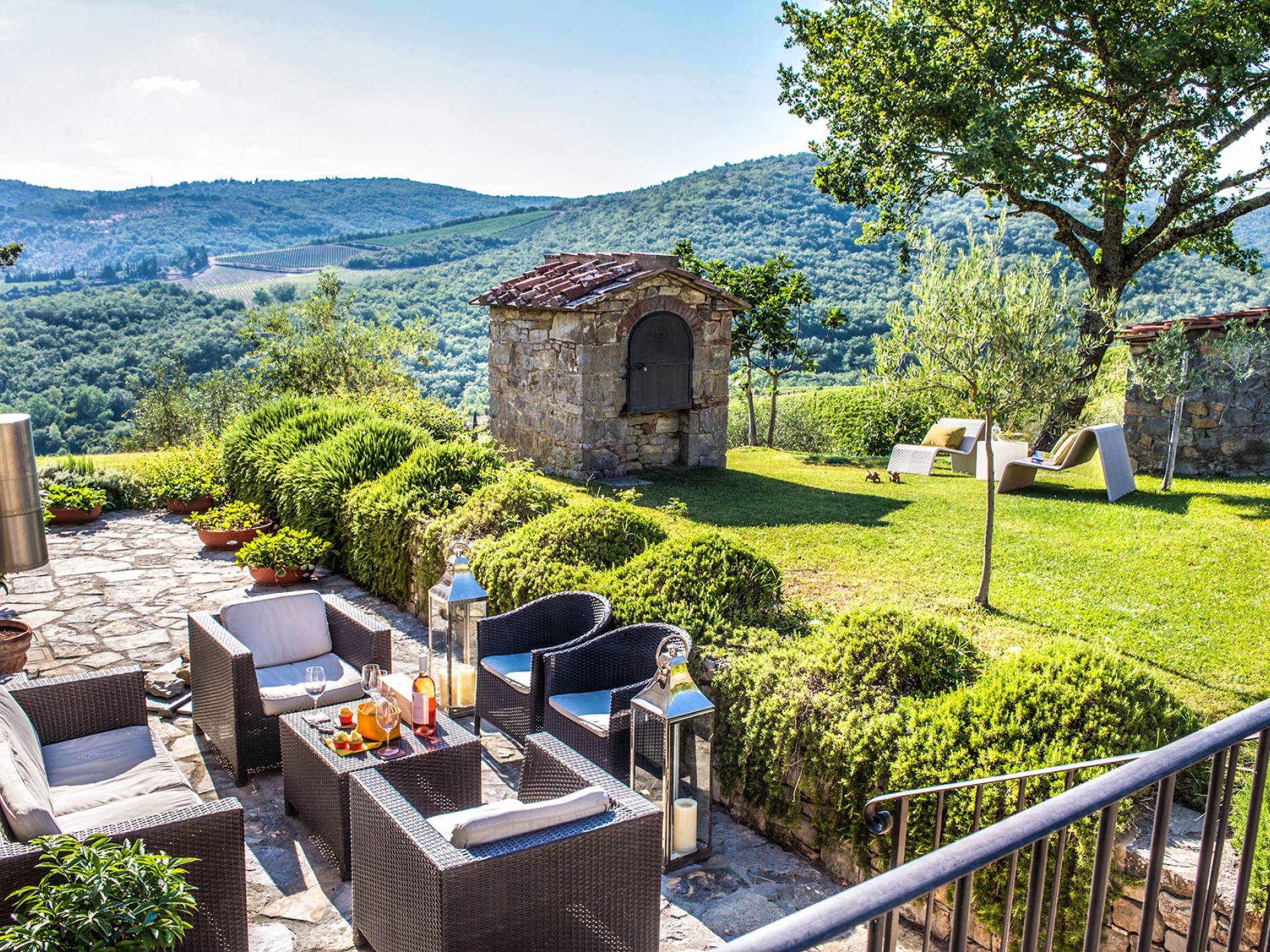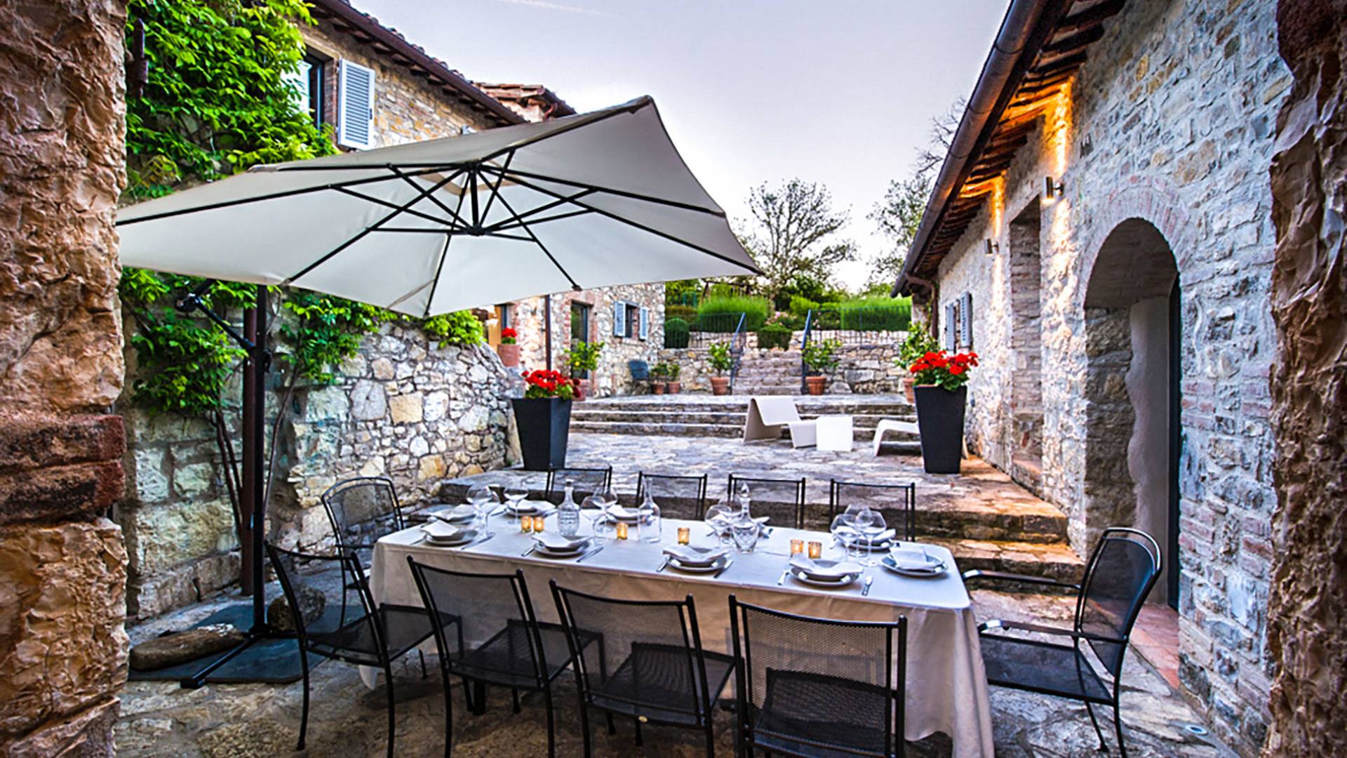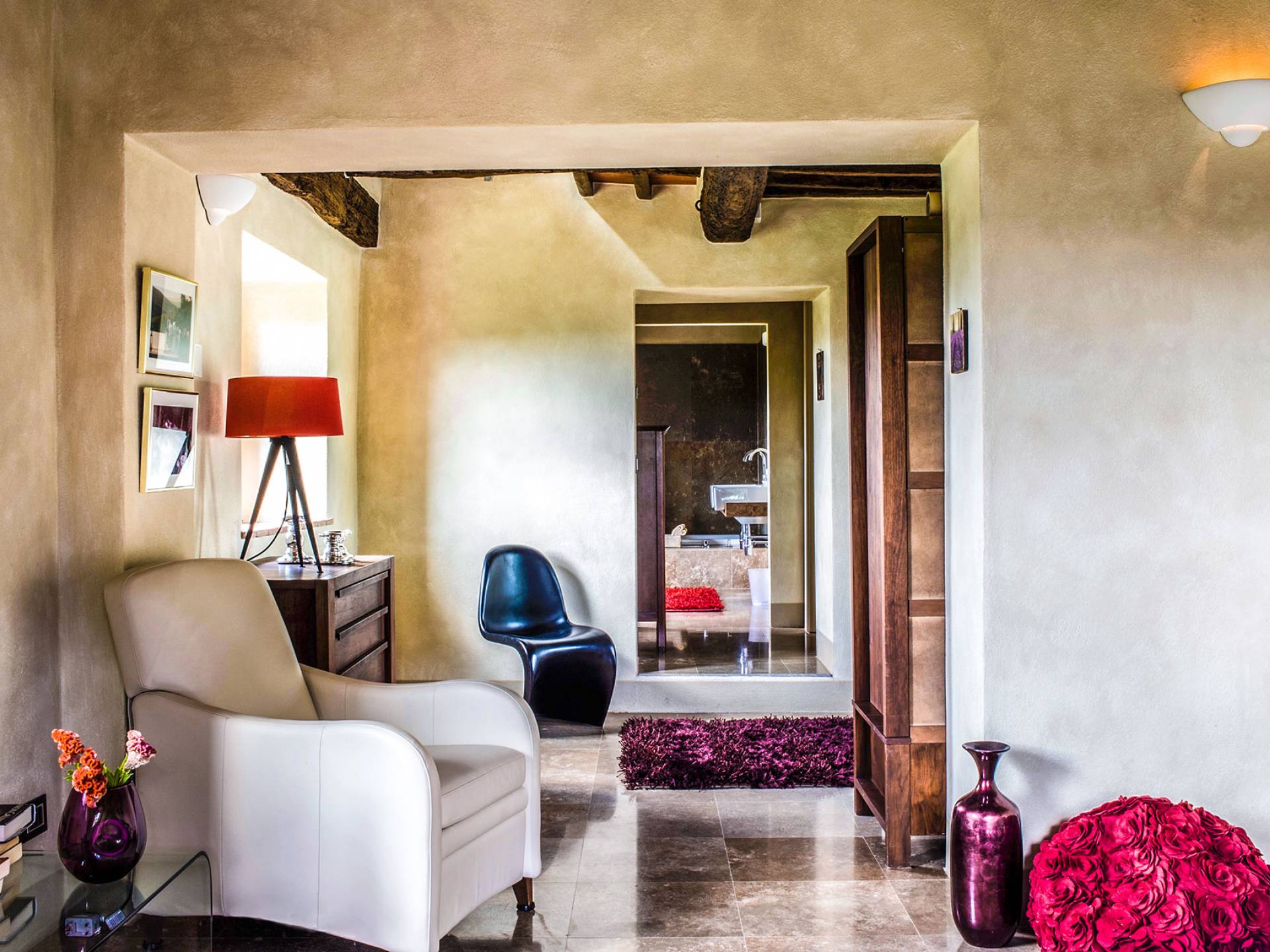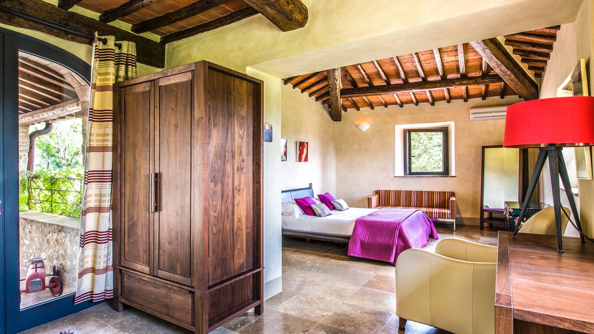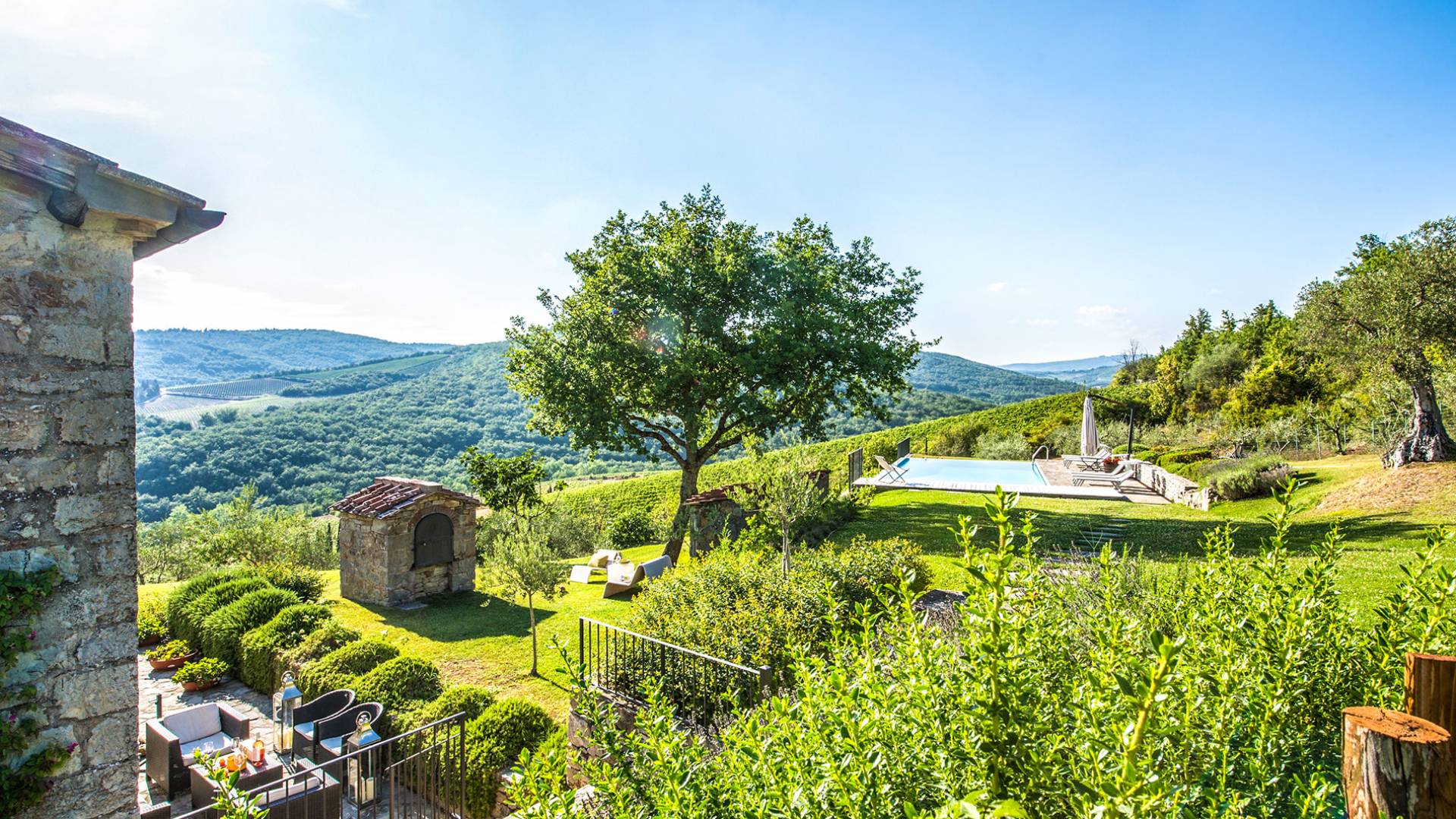 Auf einem Hügel in Gaiole in Chianti in einer vom Forbes-Magazin als die idyllischste in Europa eingestuften Gegend liegt die Villa Anna Tuscany mit 360-Grad-Blick, zwei Hektar großen Gärten und einem Infinity-Pool. Villa Anna Toskana bietet eine neue Perspektive auf das toskanische Leben. Das vierhundert Jahre alte Bauernhaus, das nach höchsten Designstandards und umweltfreundlichen Prinzipien restauriert wurde, ist heute ein weitläufiges und luxuriöses Einfamilienhaus, das den besten italienischen Stil und die beste Handwerkskunst mit zeitgenössischem Dekor vereint: ein offener Raum mit viel Licht, exponiert Stein, original Holzbalken, Travertinböden, zeitgenössische Möbel und moderne Kunst.