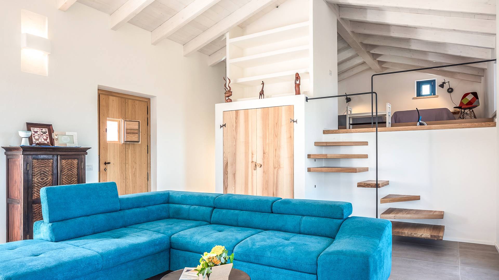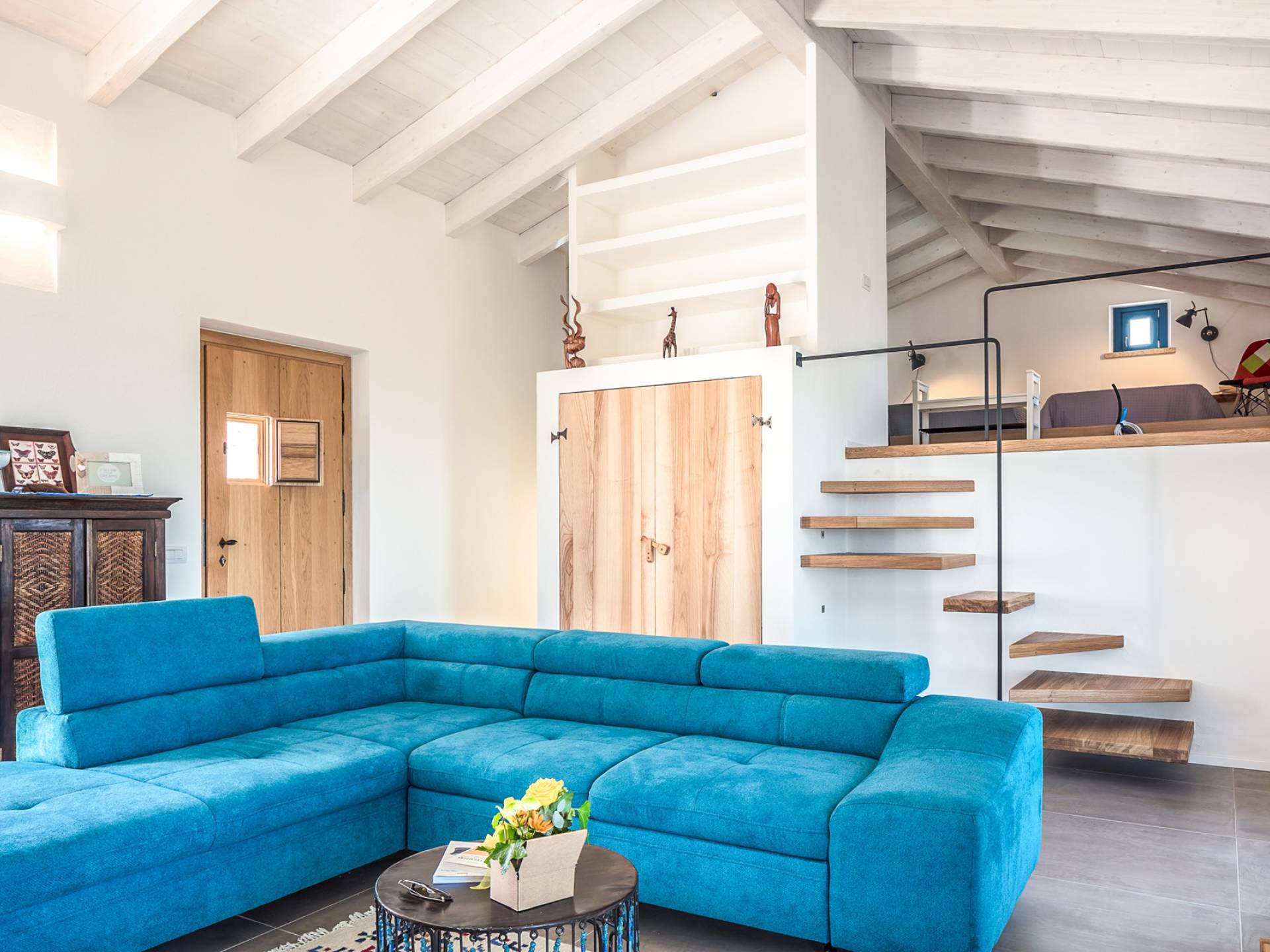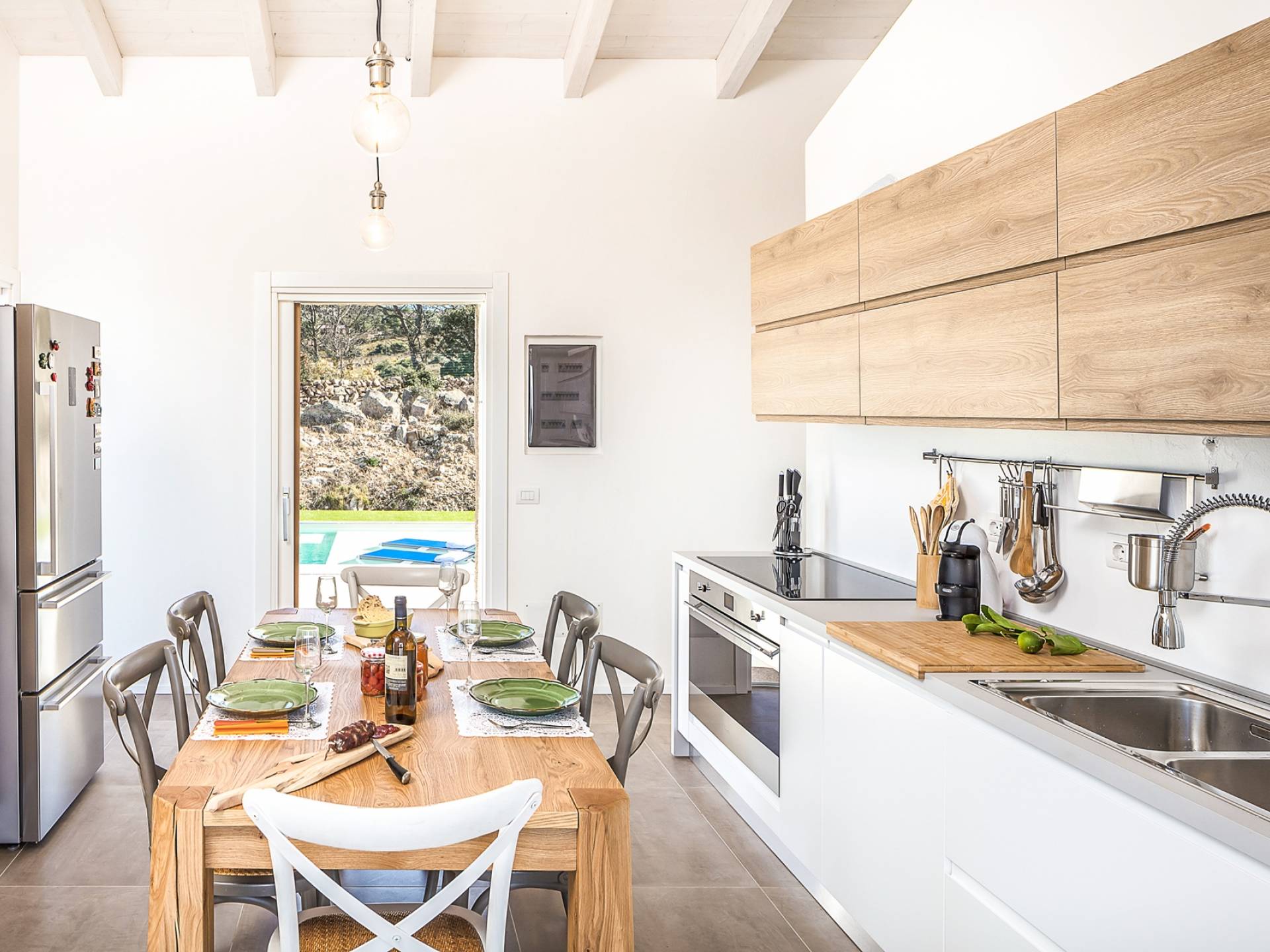 Im ersten Stock steht Ihnen eine Küche mit Esstisch für 8 Personen zur Verfügung, die mit allem ausgestattet ist, und die Möglichkeit, draußen auf einer Terrasse zu essen, die durch eine französische Tür verbunden ist. Dann ein Wohnzimmer mit einem zweiten Esstisch für bis zu 8 Personen, einem Kamin und einem Ruhebereich mit Sesseln sowie ein Badezimmer und ein Schlafzimmer mit Doppelbett.