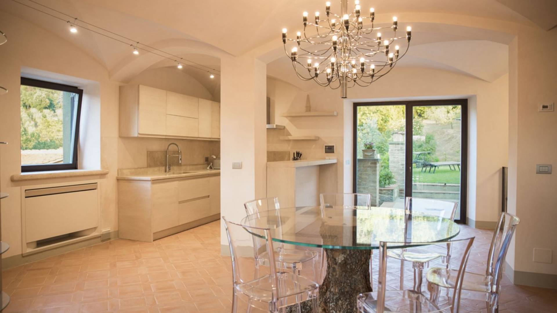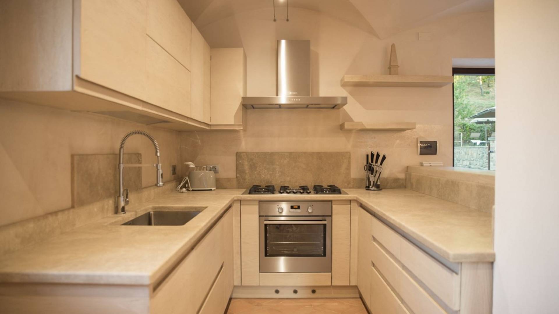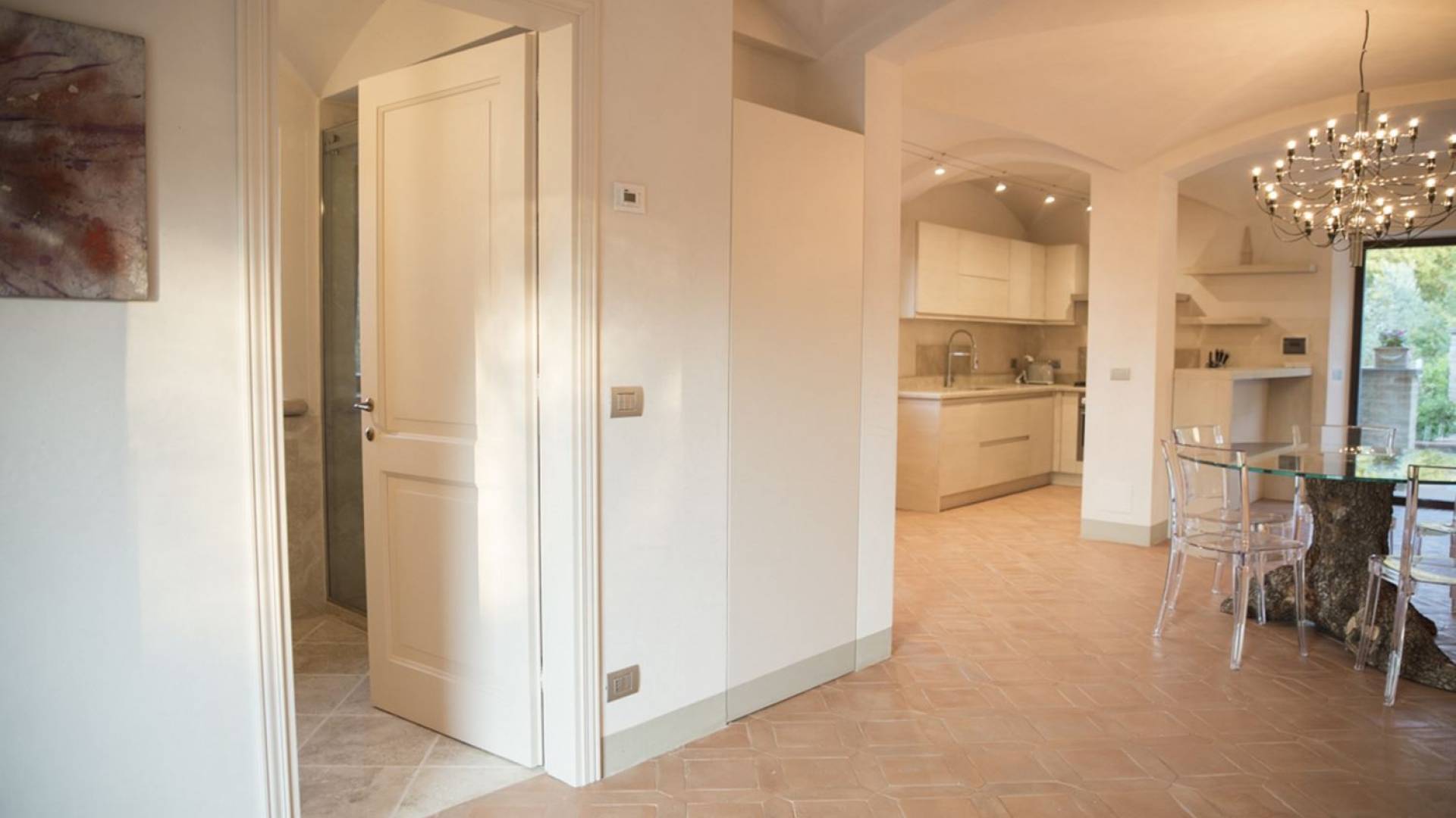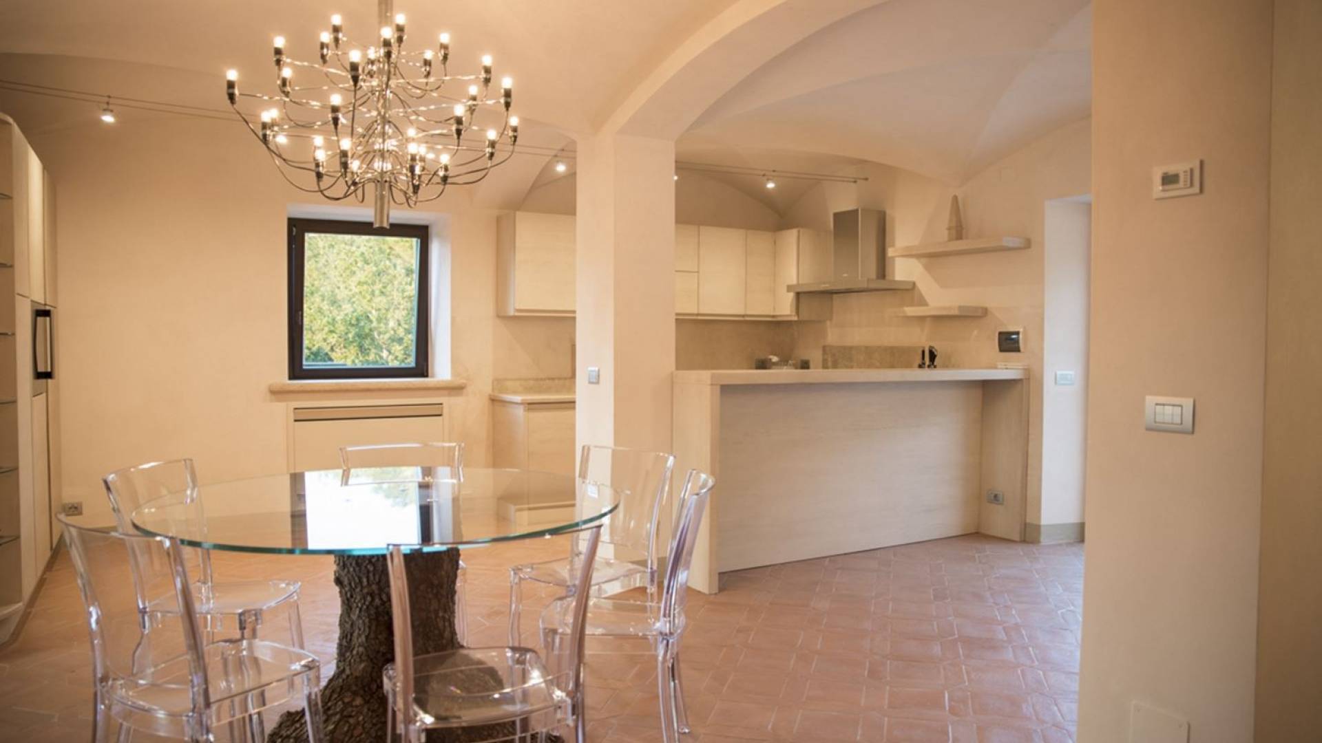 Ausgestattet mit drei Doppelzimmern im Erdgeschoss mit jeweils einem Badezimmer, im Wohnbereich im ersten Stock bietet es einen großen Entspannungsbereich mit bequemen Sofas und eine große, maßgefertigte Vollholzküche komplett ausgestattet mit Backofen, Geschirrspüler, Mikrowelle, Wasserkocher, Weinkeller. Die komfortable Halbinsel aus Travertin, immer in der Küche, bietet die Möglichkeit, die Zubereitung von Mittag- und Abendessen auch mit den anderen Gästen zu teilen. Die Innenräume werden auch durch das Vorhandensein eines Kristalltisches verschönert, ein einzigartiges Stück, das aus dem Stamm eines Baumes gewonnen wurde, der auf dem Grundstück geborgen wurde.