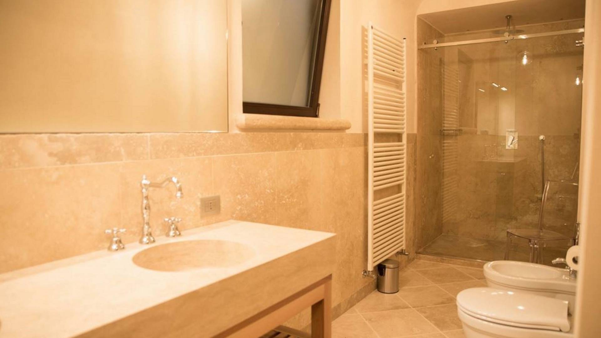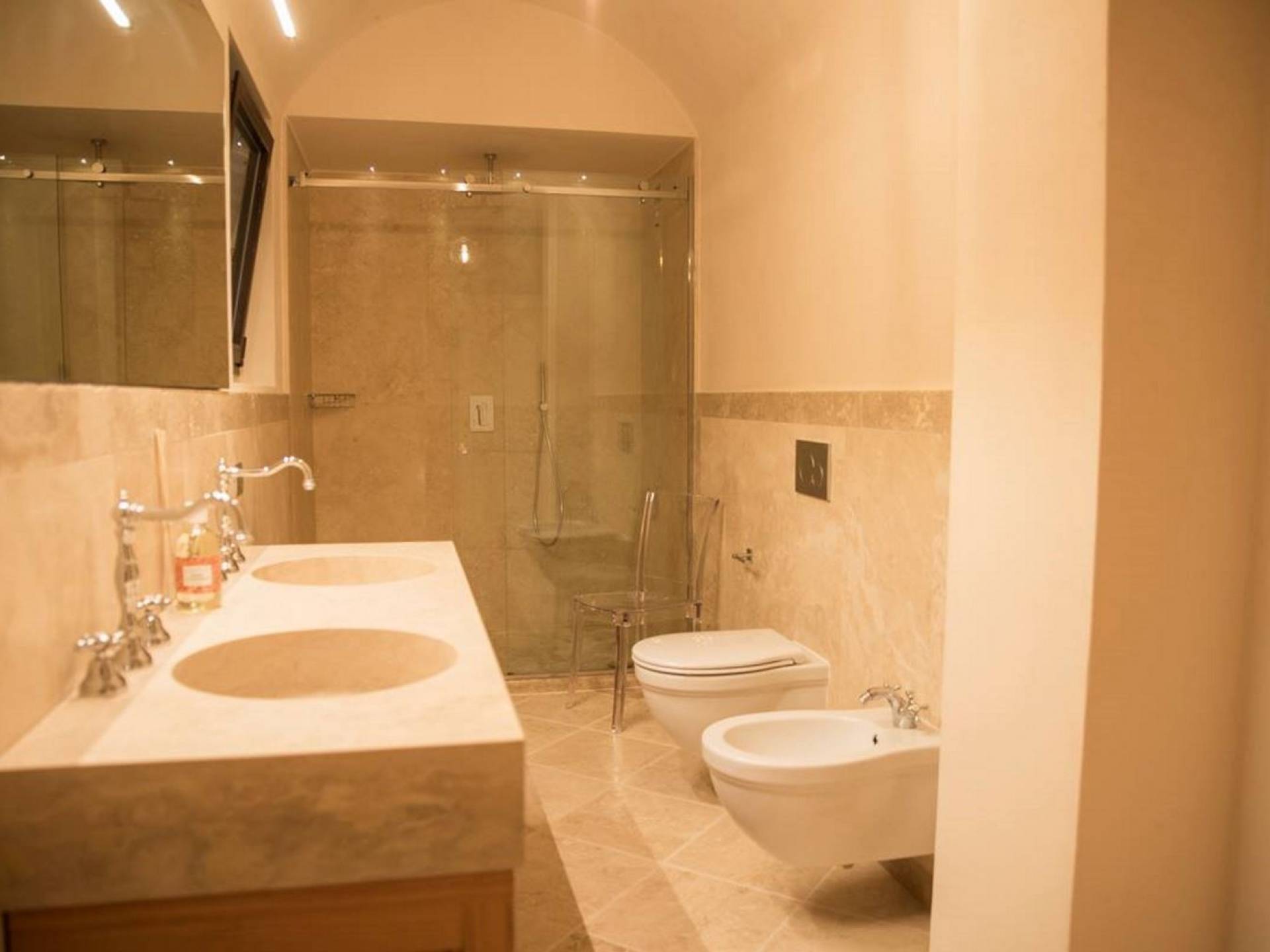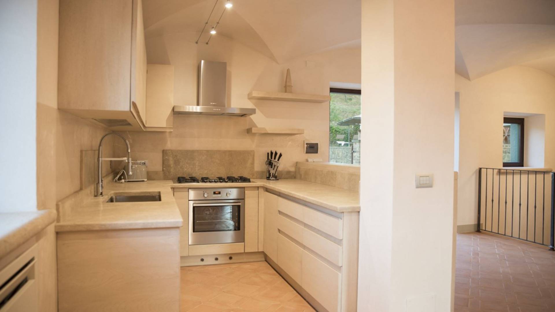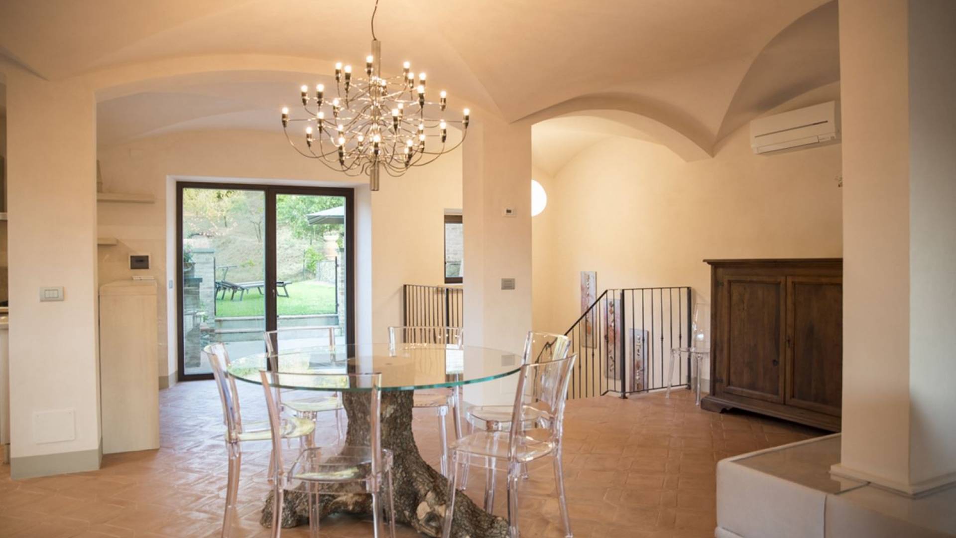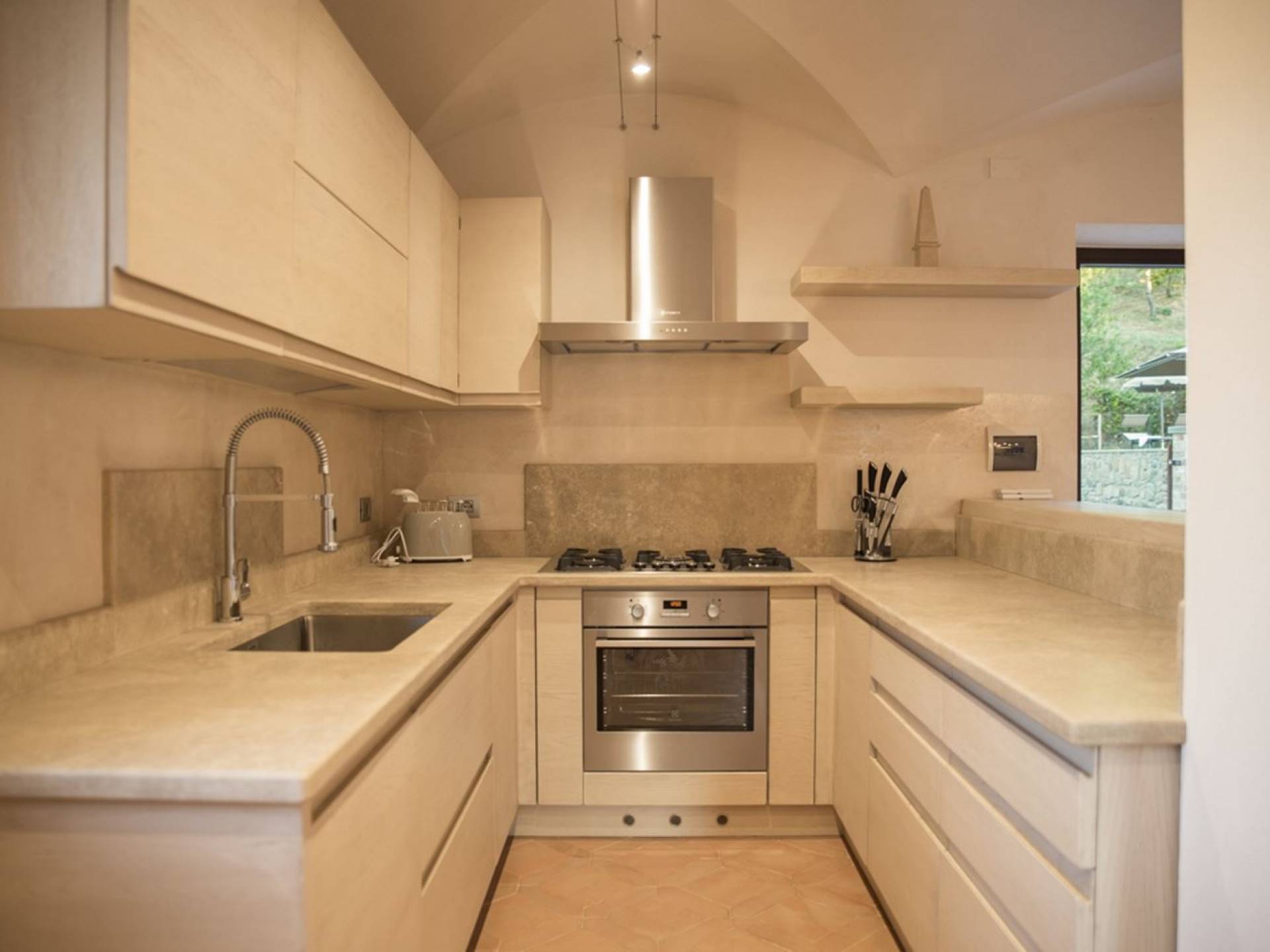 Ausgestattet mit drei Doppelzimmern im Erdgeschoss mit jeweils einem Badezimmer, im Wohnbereich im ersten Stock bietet es einen großen Entspannungsbereich mit bequemen Sofas und eine große, maßgefertigte Vollholzküche komplett ausgestattet mit Backofen, Geschirrspüler, Mikrowelle, Wasserkocher, Weinkeller. Die komfortable Halbinsel aus Travertin, immer in der Küche, bietet die Möglichkeit, die Zubereitung von Mittag- und Abendessen auch mit den anderen Gästen zu teilen. Die Innenräume werden auch durch das Vorhandensein eines Kristalltisches verschönert, ein einzigartiges Stück, das aus dem Stamm eines Baumes gewonnen wurde, der auf dem Grundstück geborgen wurde.