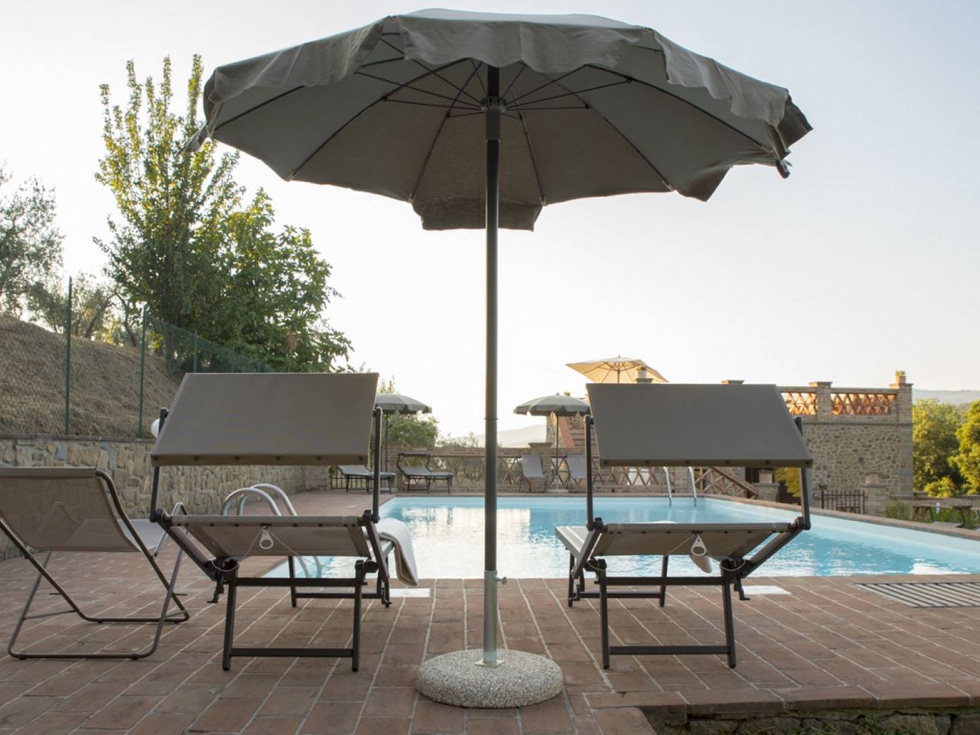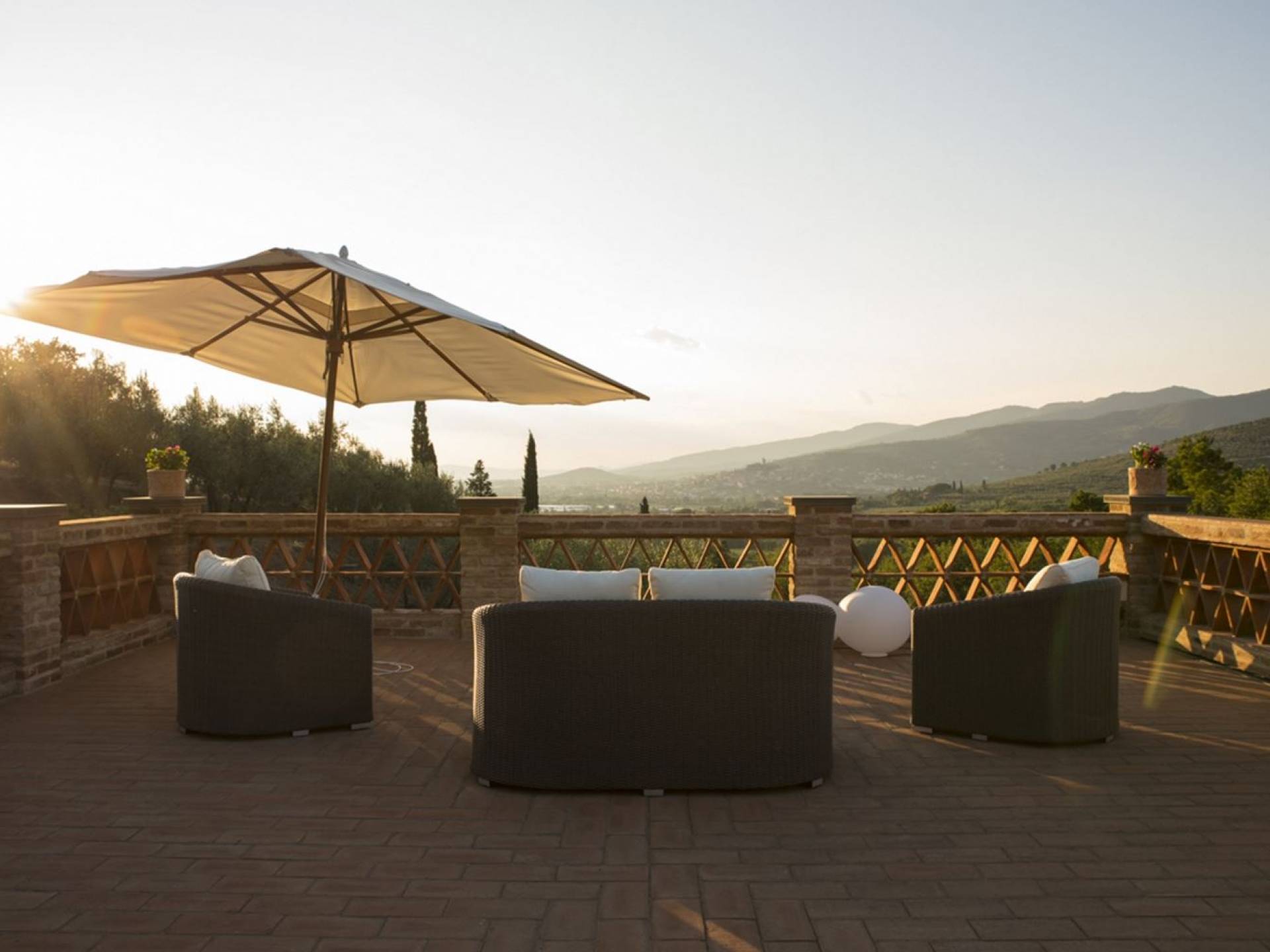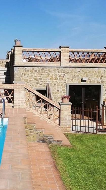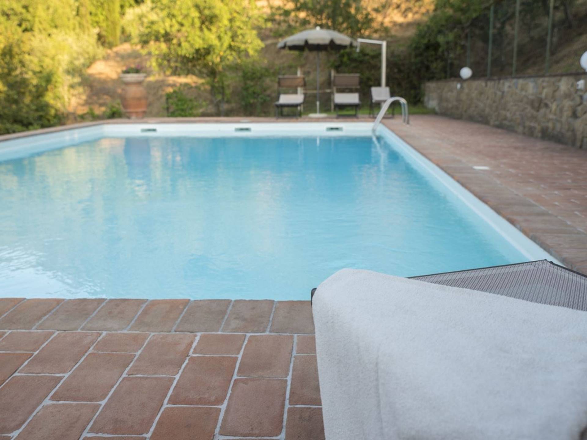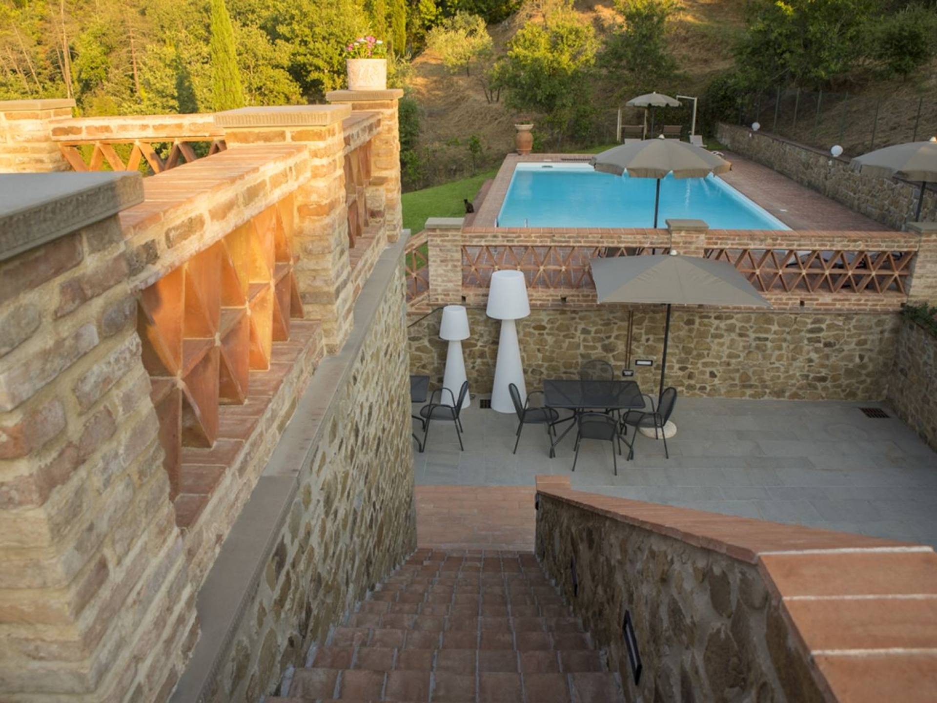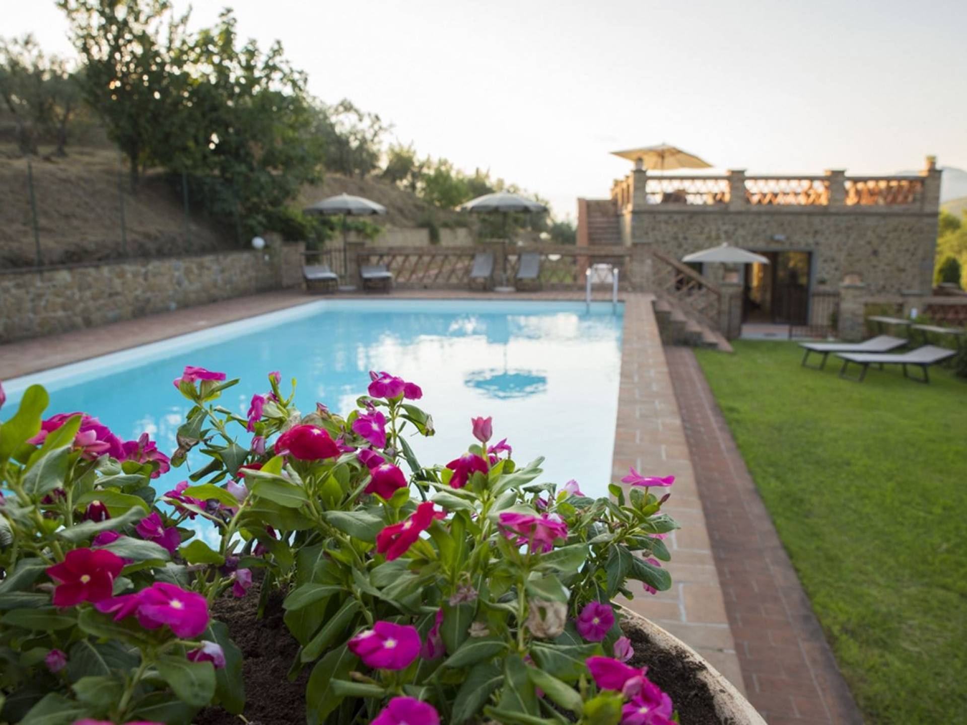 Draußen bietet das große Schwimmbad jedoch die Möglichkeit, alleine oder in der Gruppe Spaß zu haben und zu entspannen. Unmittelbar außerhalb des Wohnbereichs befindet sich auch ein Bereich, in dem Sie Ihre Mahlzeiten genießen können. Auf der Panoramaterrasse auf dem Dach der Villa befindet sich auch eine kleine beleuchtete Lounge, von der aus Sie den herrlichen Sonnenuntergang über Castiglion Fiorentino genießen können, einer Stadt etruskischen Ursprungs, die ihren Namen der florentinischen Herrschaft im Mittelalter verdankt und die, Noch heute sind fast die mittelalterlichen Mauern erhalten, die vom Bergfried dominiert werden. Eine zehnminütige Autofahrt entfernt finden Sie auch die Burg von Montecchio, eine alte Burg auf einem Hügel mit Blick auf das Val di Chiana.