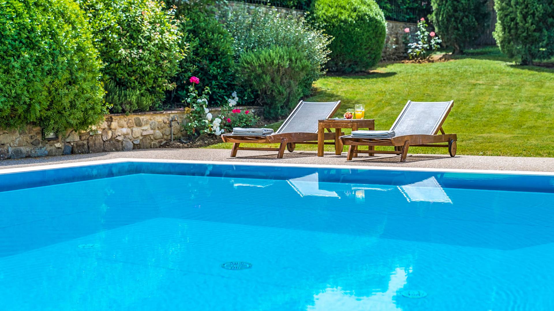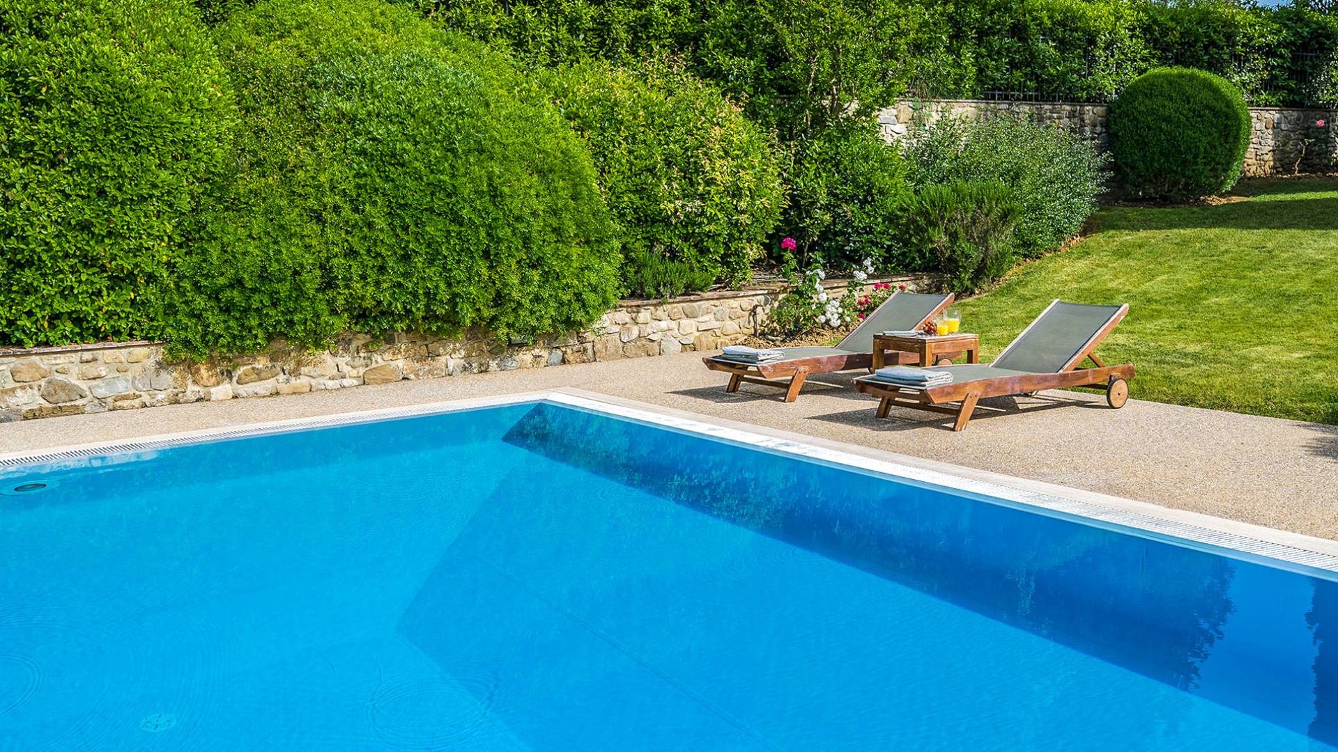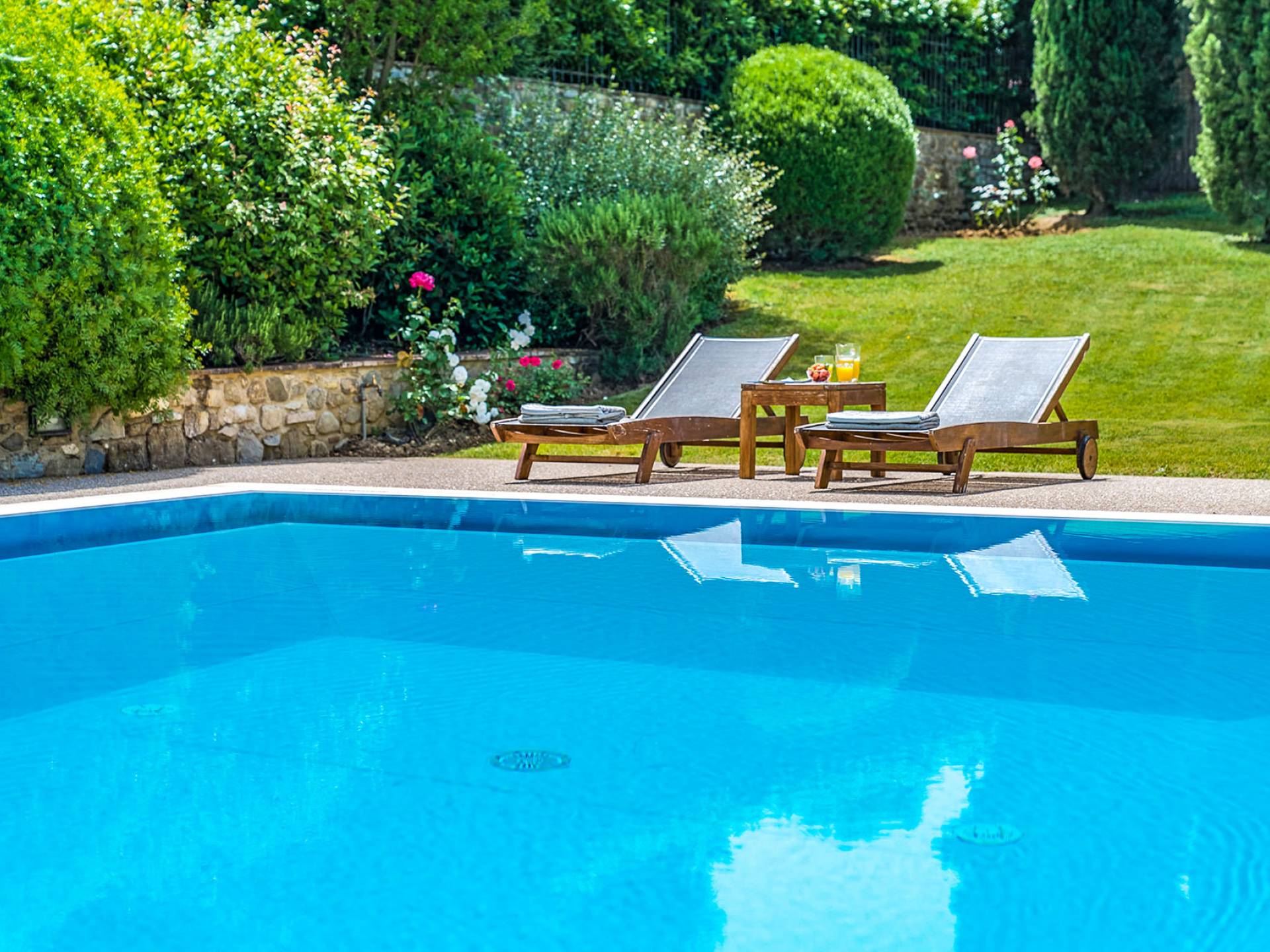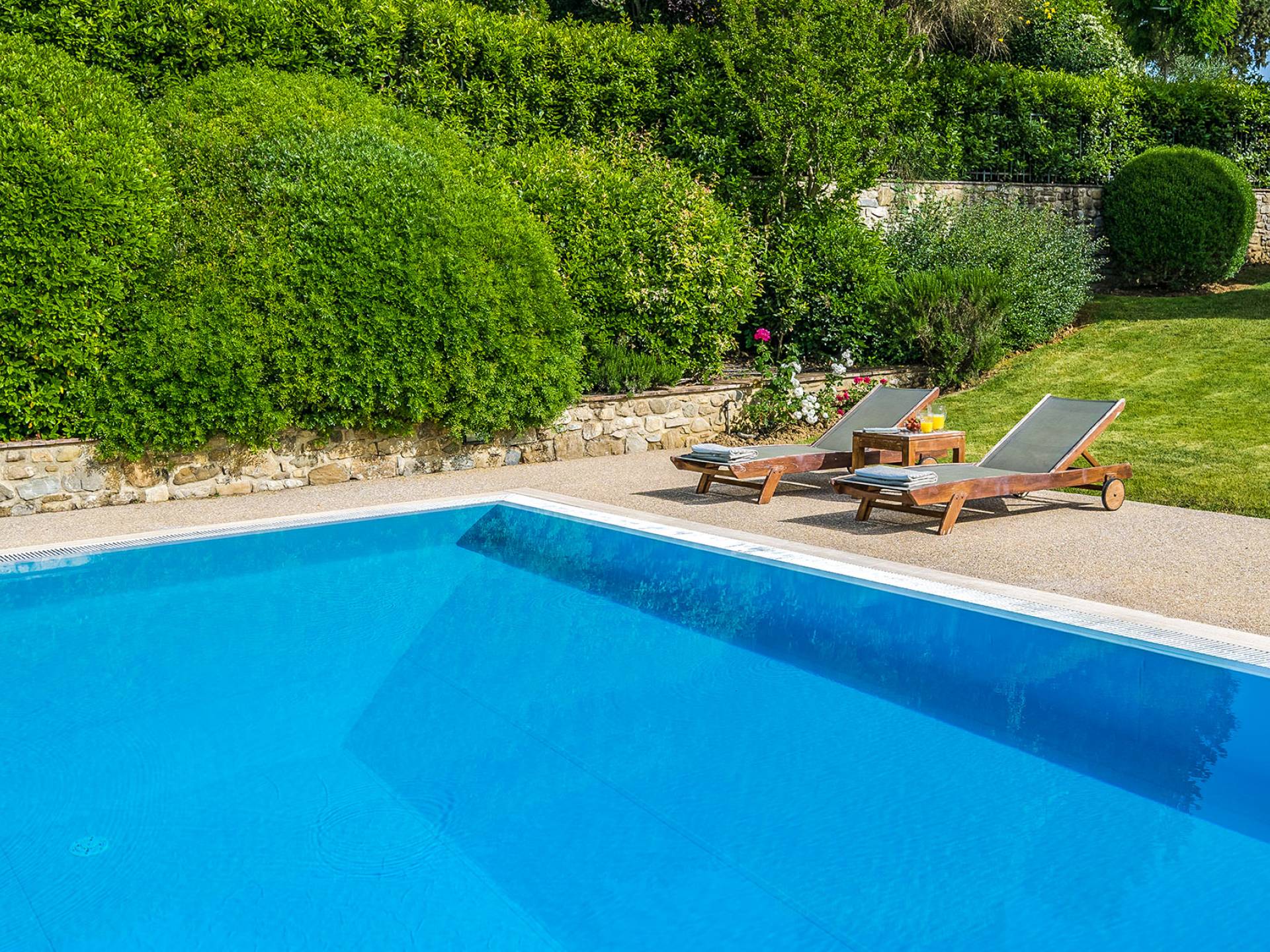 Der gepflegte Garten, der das Haus umgibt, gewährleistet absolute Privatsphäre und führt zu einem großen Pool, der so positioniert ist, dass Sie die beste Aussicht genießen können. Es ist klar, dass der Pool nicht immer da war, dass er „hinzugefügt“ wurde, aber das Blau, das von dem gepflegten Rasen umgeben ist, passt perfekt zum Rest des Hauses. Der Pool ist von dunklem Holz umgeben, ein herrliches Gefühl auf den Fußsohlen, und Sie können den Pool von dort oder vom Sprungbrett aus betreten. Das Wichtigste ist, die Frische in der Hitze der Sommersonne zu genießen.