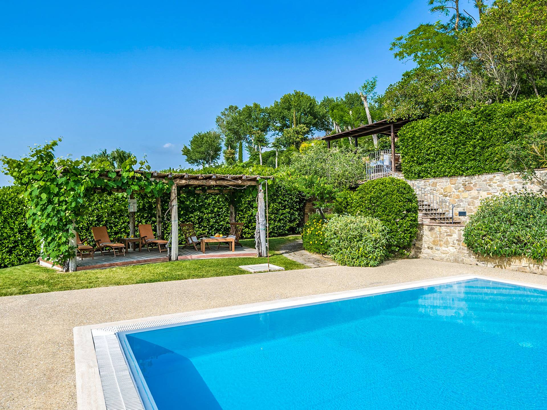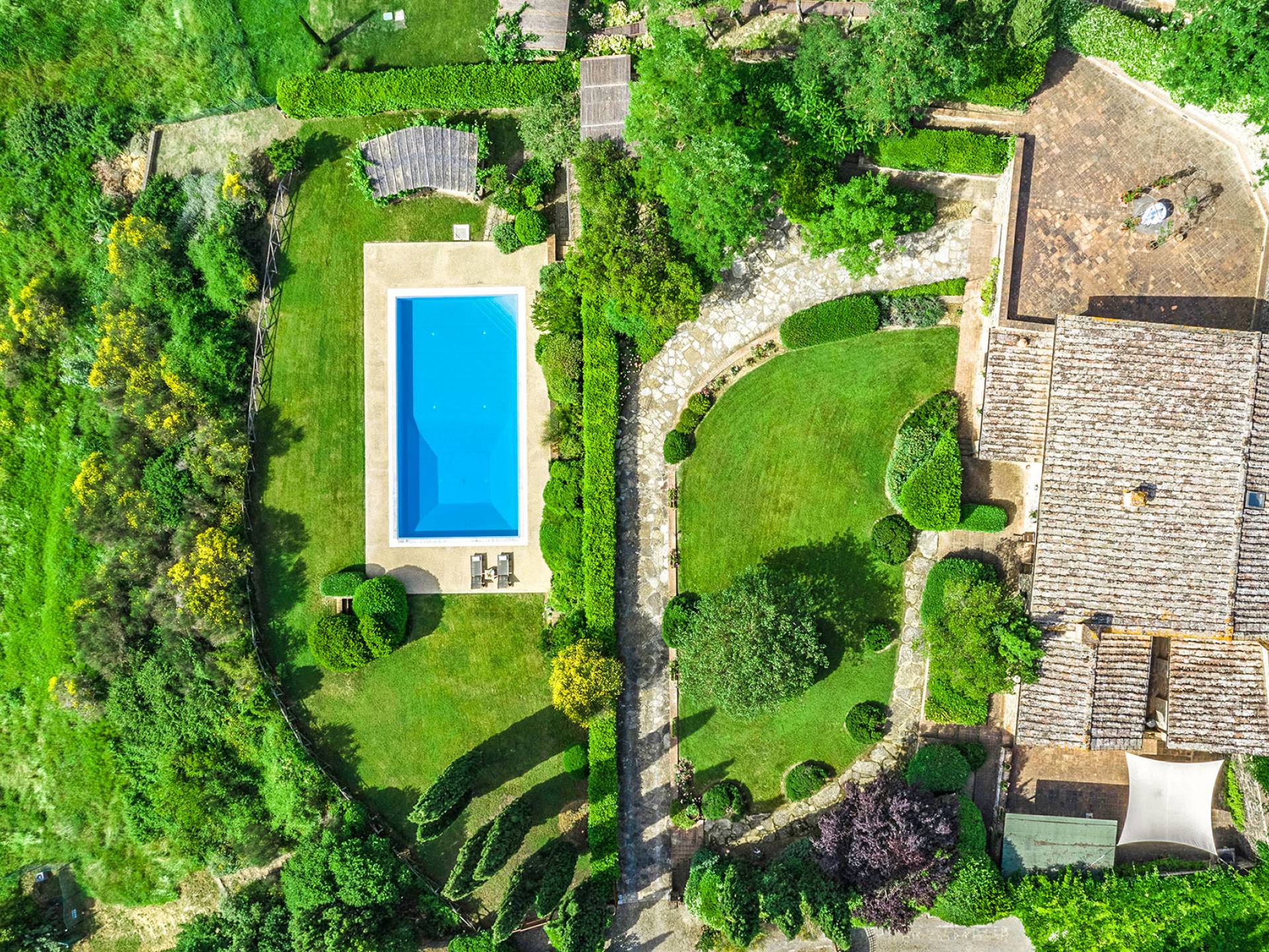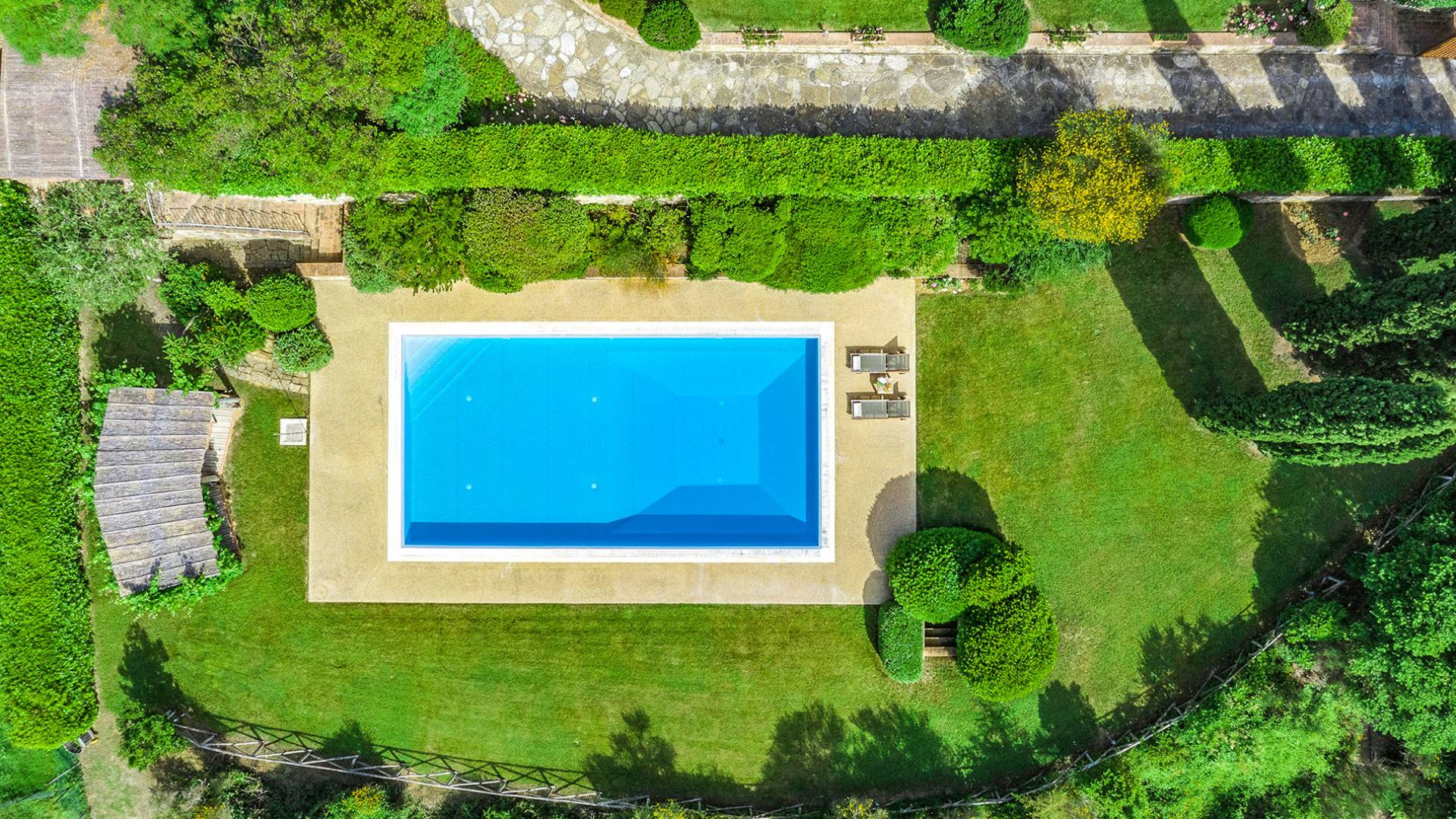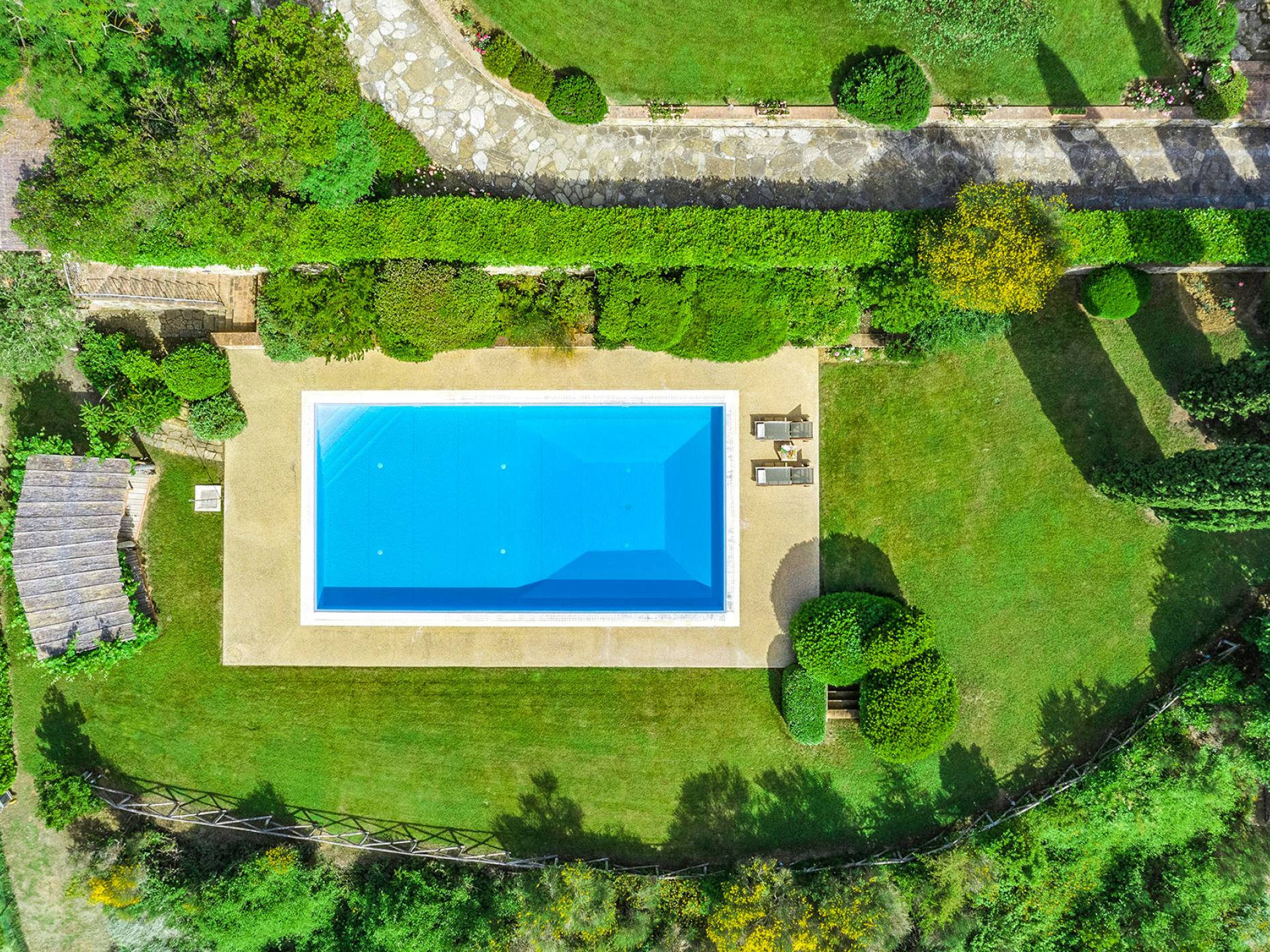 Der gepflegte Garten, der das Haus umgibt, gewährleistet absolute Privatsphäre und führt zu einem großen Pool, der so positioniert ist, dass Sie die beste Aussicht genießen können. Es ist klar, dass der Pool nicht immer da war, dass er „hinzugefügt“ wurde, aber das Blau, das von dem gepflegten Rasen umgeben ist, passt perfekt zum Rest des Hauses. Der Pool ist von dunklem Holz umgeben, ein herrliches Gefühl auf den Fußsohlen, und Sie können den Pool von dort oder vom Sprungbrett aus betreten. Das Wichtigste ist, die Frische in der Hitze der Sommersonne zu genießen.