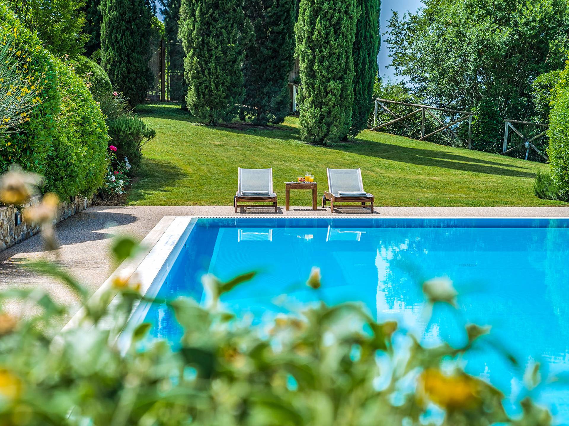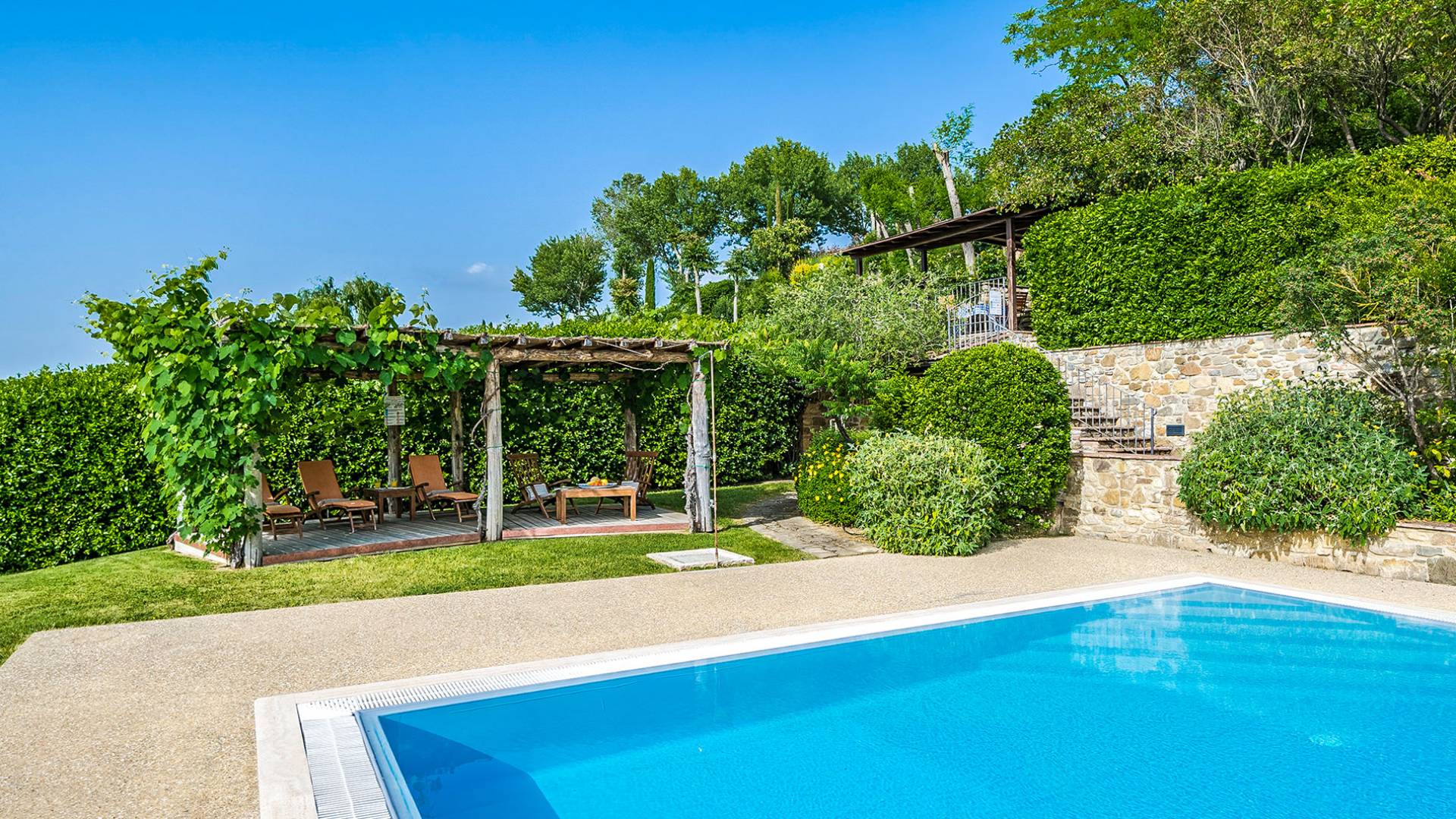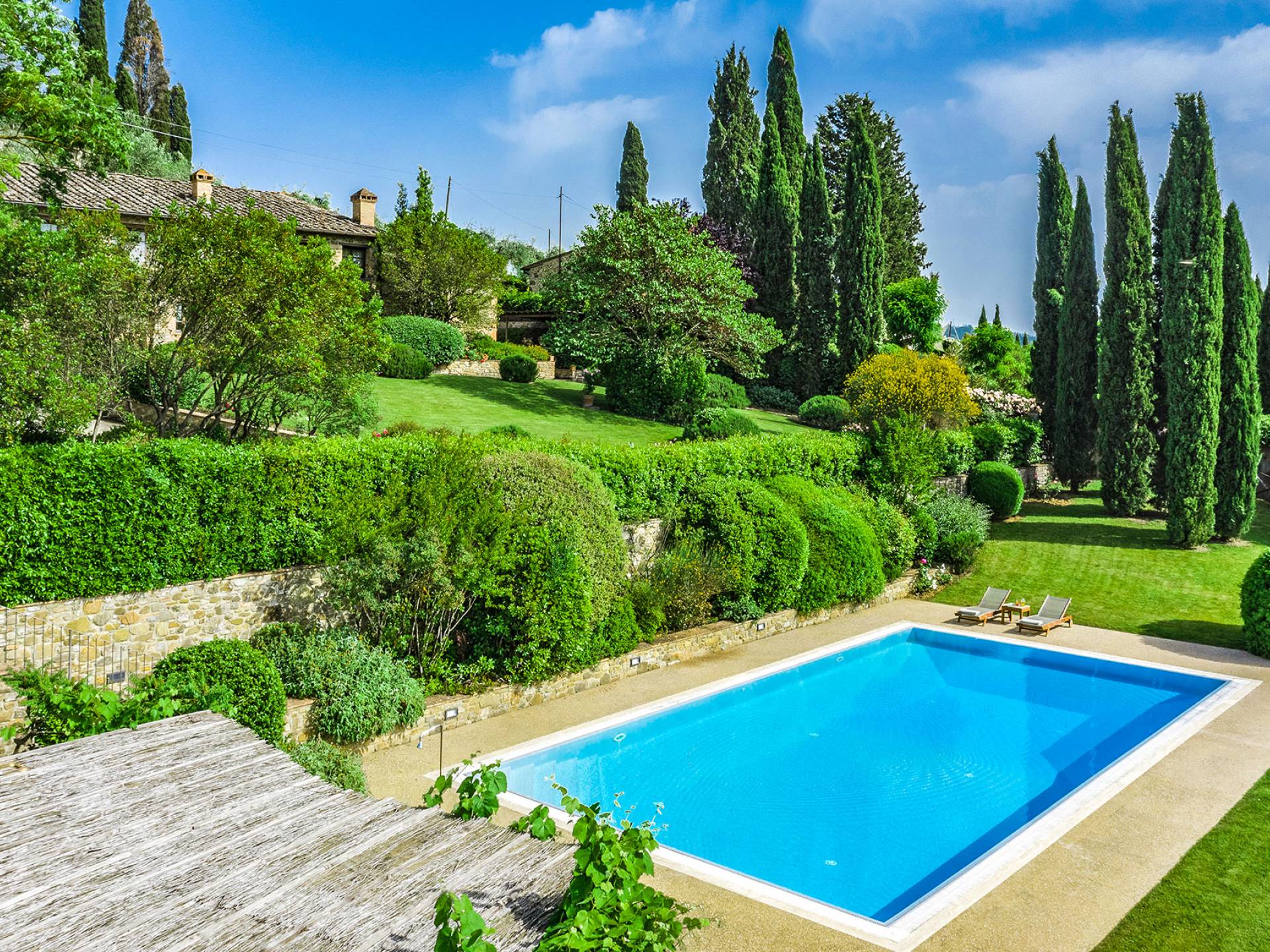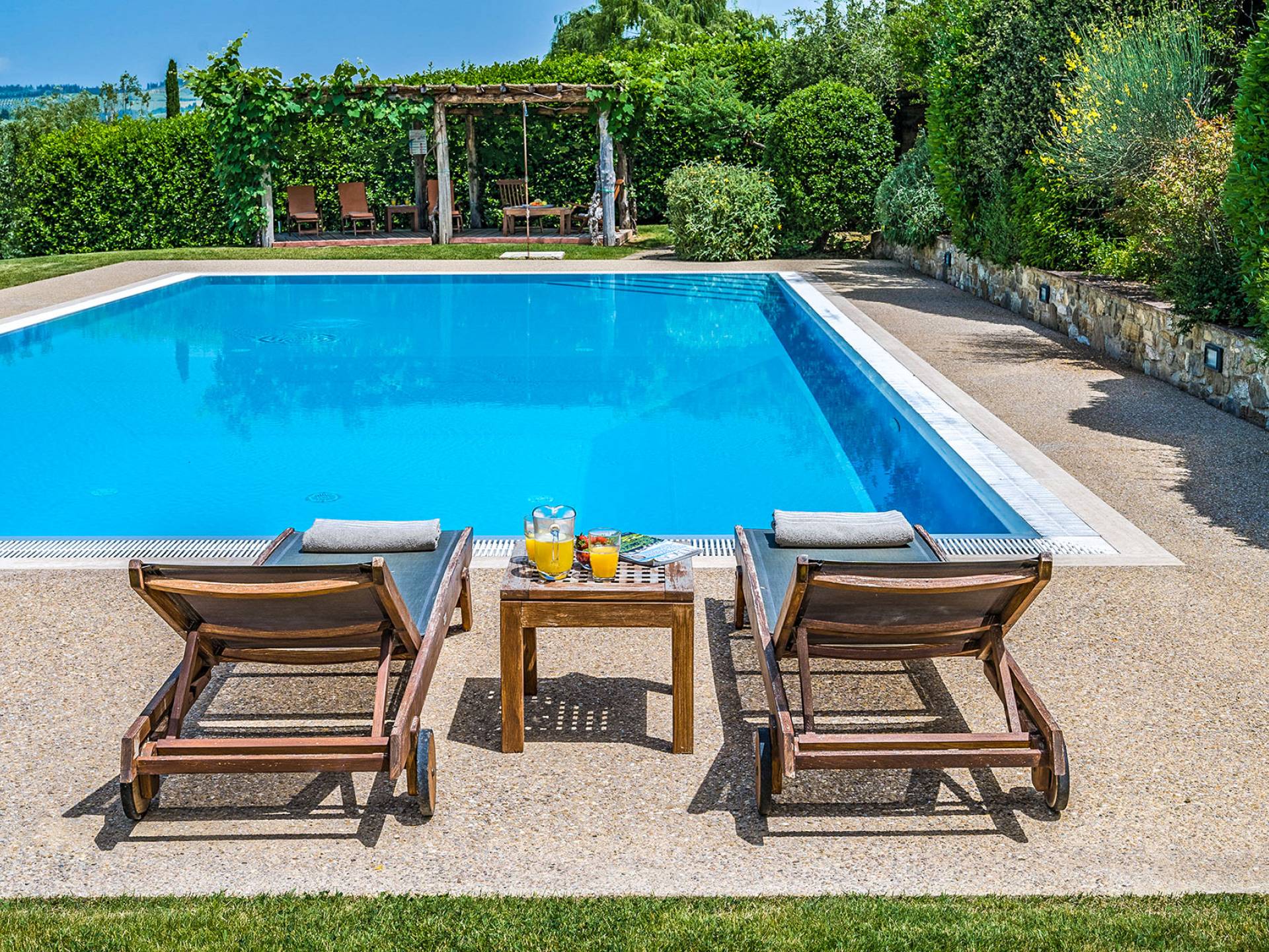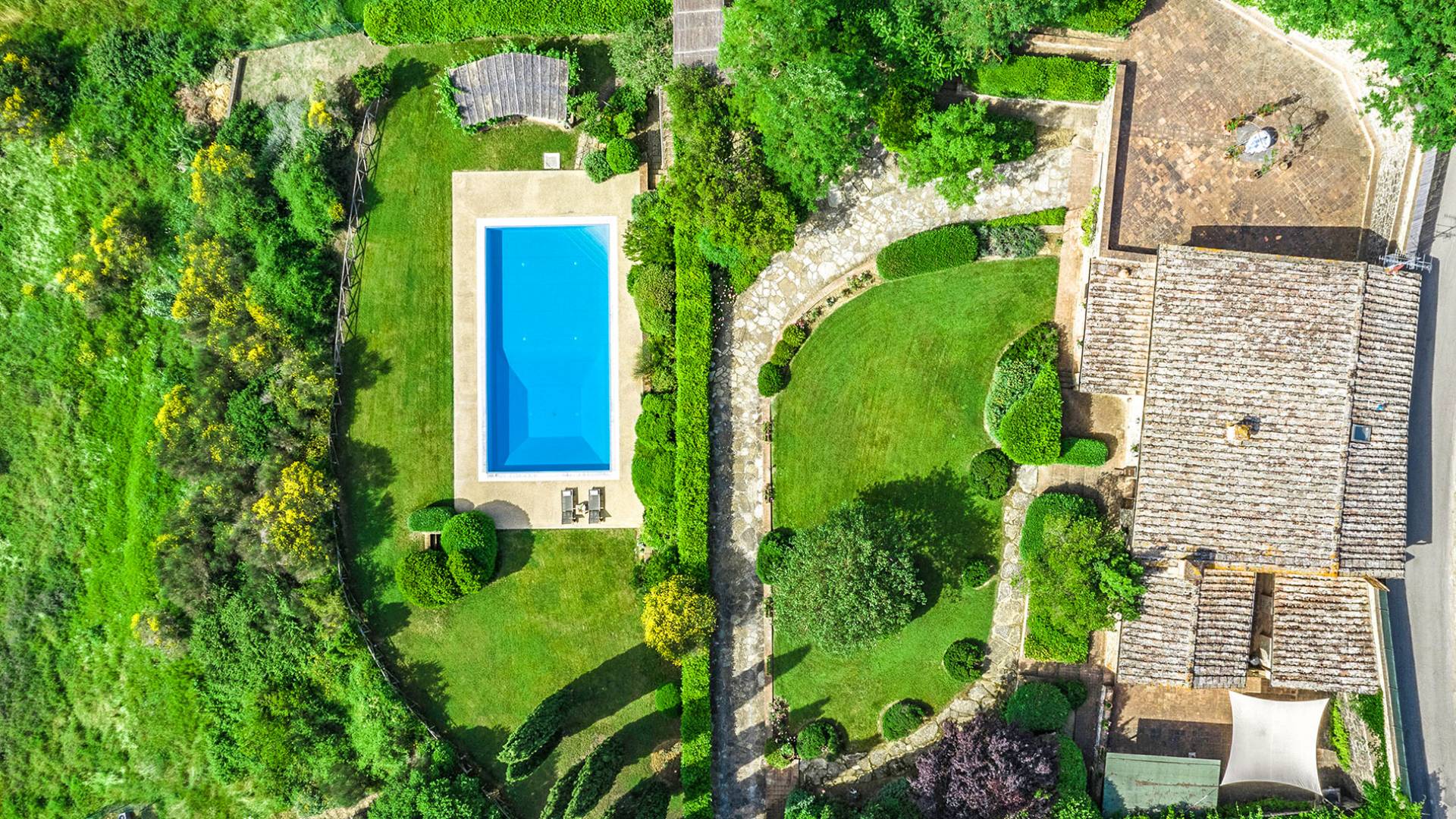 Der gepflegte Garten, der das Haus umgibt, gewährleistet absolute Privatsphäre und führt zu einem großen Pool, der so positioniert ist, dass Sie die beste Aussicht genießen können. Es ist klar, dass der Pool nicht immer da war, dass er „hinzugefügt“ wurde, aber das Blau, das von dem gepflegten Rasen umgeben ist, passt perfekt zum Rest des Hauses. Der Pool ist von dunklem Holz umgeben, ein herrliches Gefühl auf den Fußsohlen, und Sie können den Pool von dort oder vom Sprungbrett aus betreten. Das Wichtigste ist, die Frische in der Hitze der Sommersonne zu genießen.