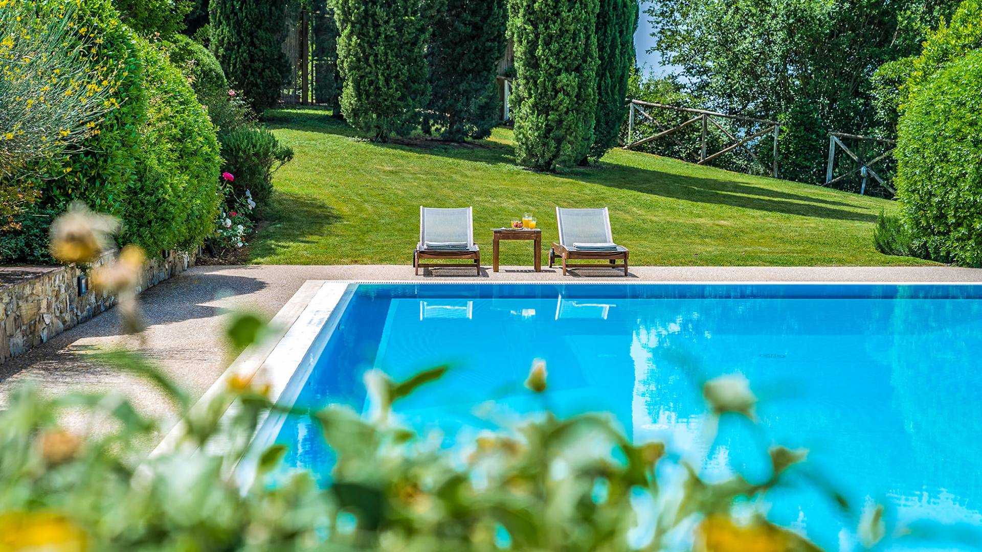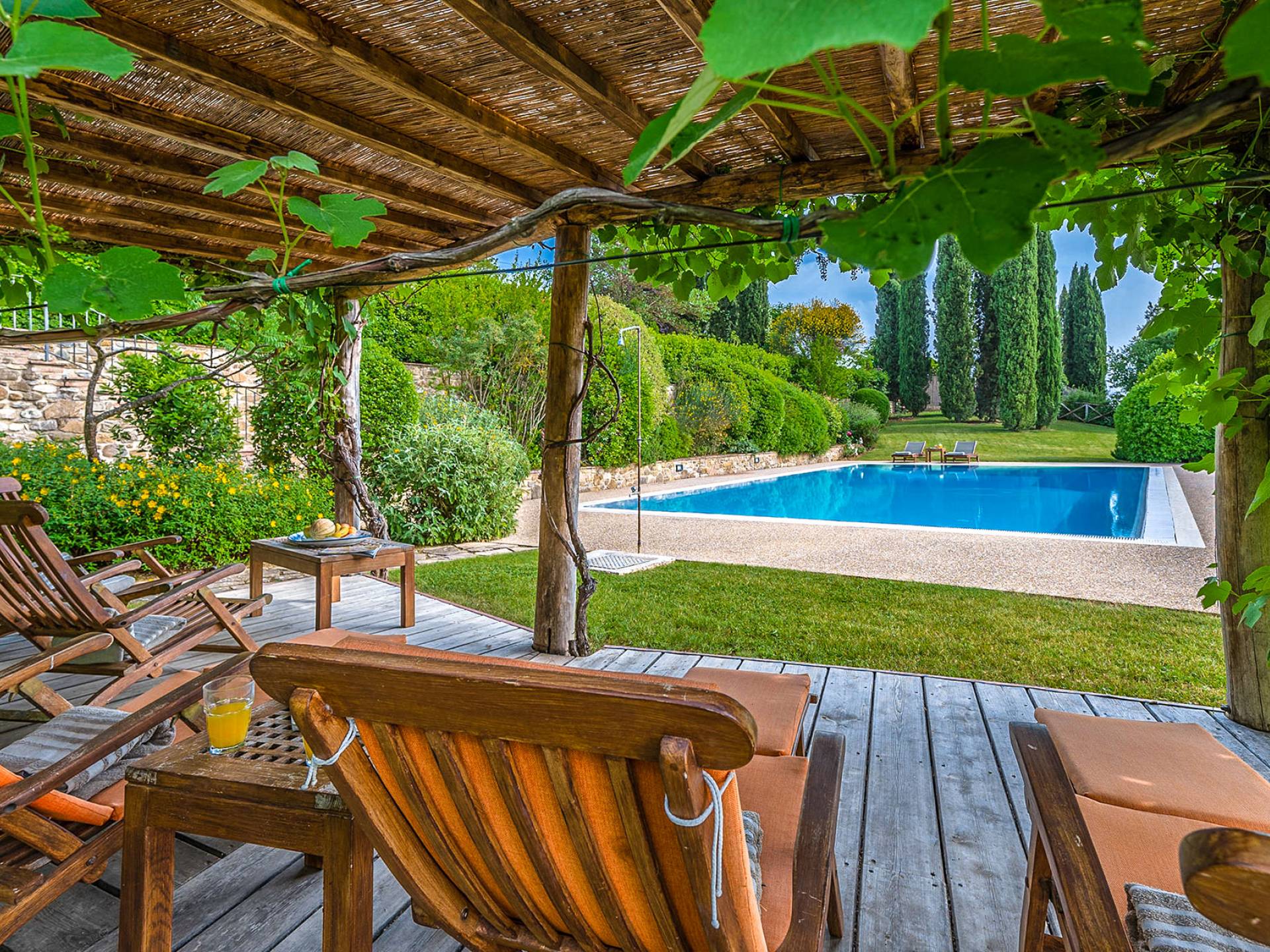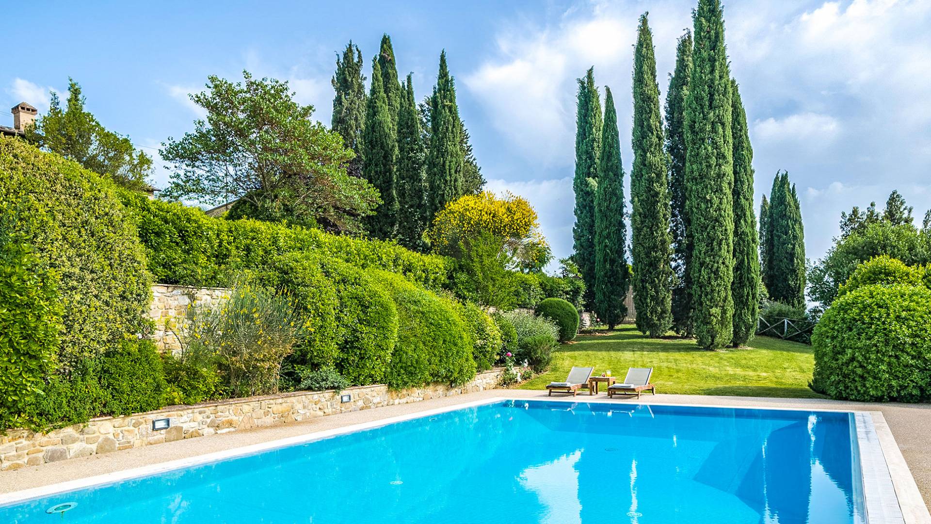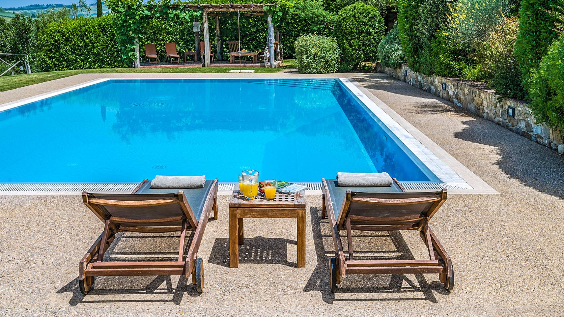 Der gepflegte Garten, der das Haus umgibt, gewährleistet absolute Privatsphäre und führt zu einem großen Pool, der so positioniert ist, dass Sie die beste Aussicht genießen können. Es ist klar, dass der Pool nicht immer da war, dass er „hinzugefügt“ wurde, aber das Blau, das von dem gepflegten Rasen umgeben ist, passt perfekt zum Rest des Hauses. Der Pool ist von dunklem Holz umgeben, ein herrliches Gefühl auf den Fußsohlen, und Sie können den Pool von dort oder vom Sprungbrett aus betreten. Das Wichtigste ist, die Frische in der Hitze der Sommersonne zu genießen.