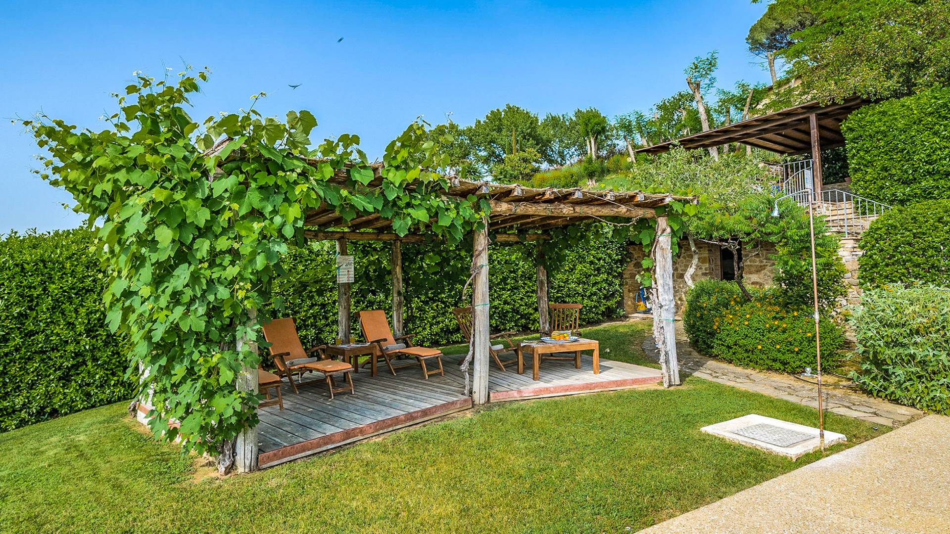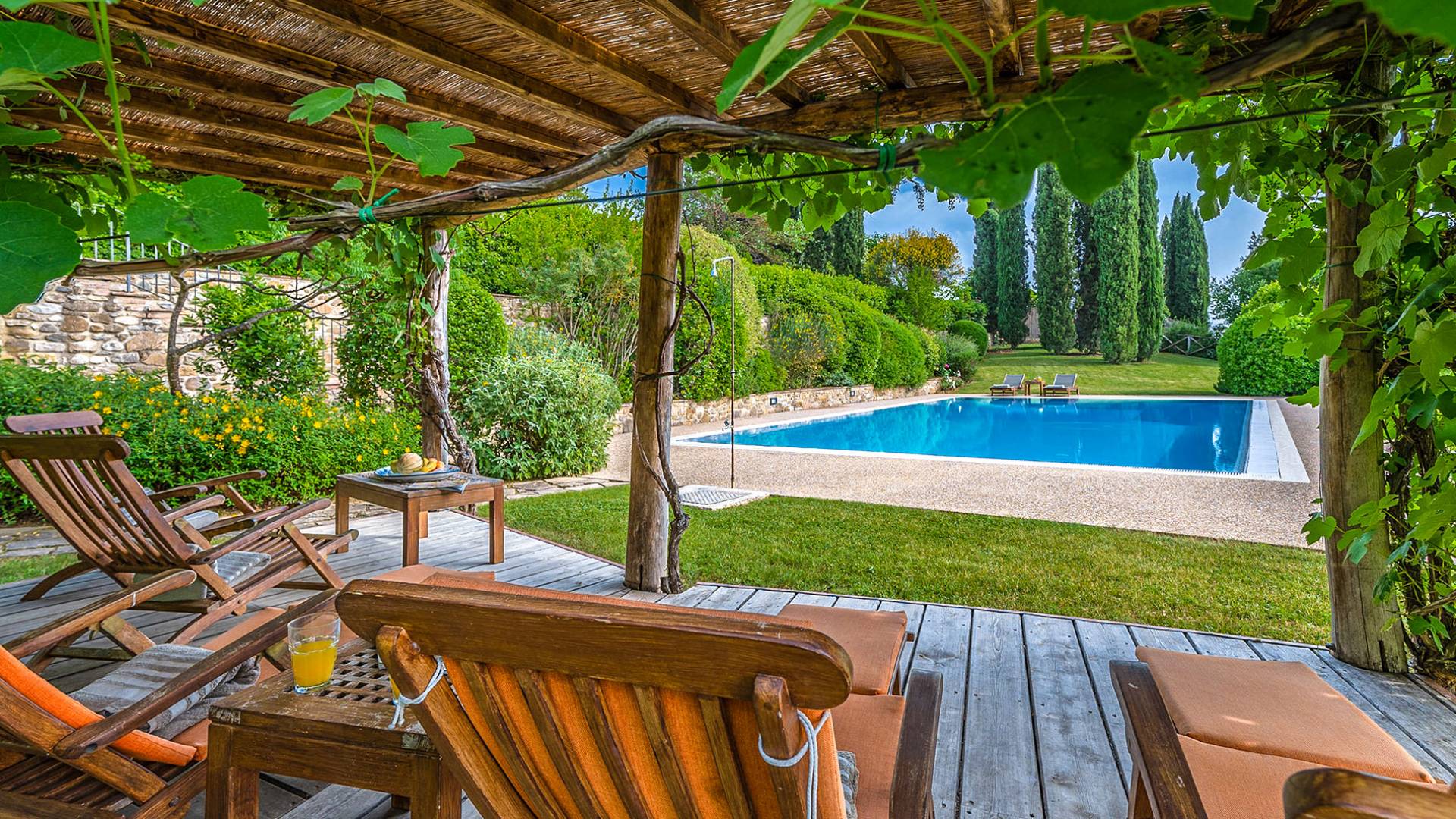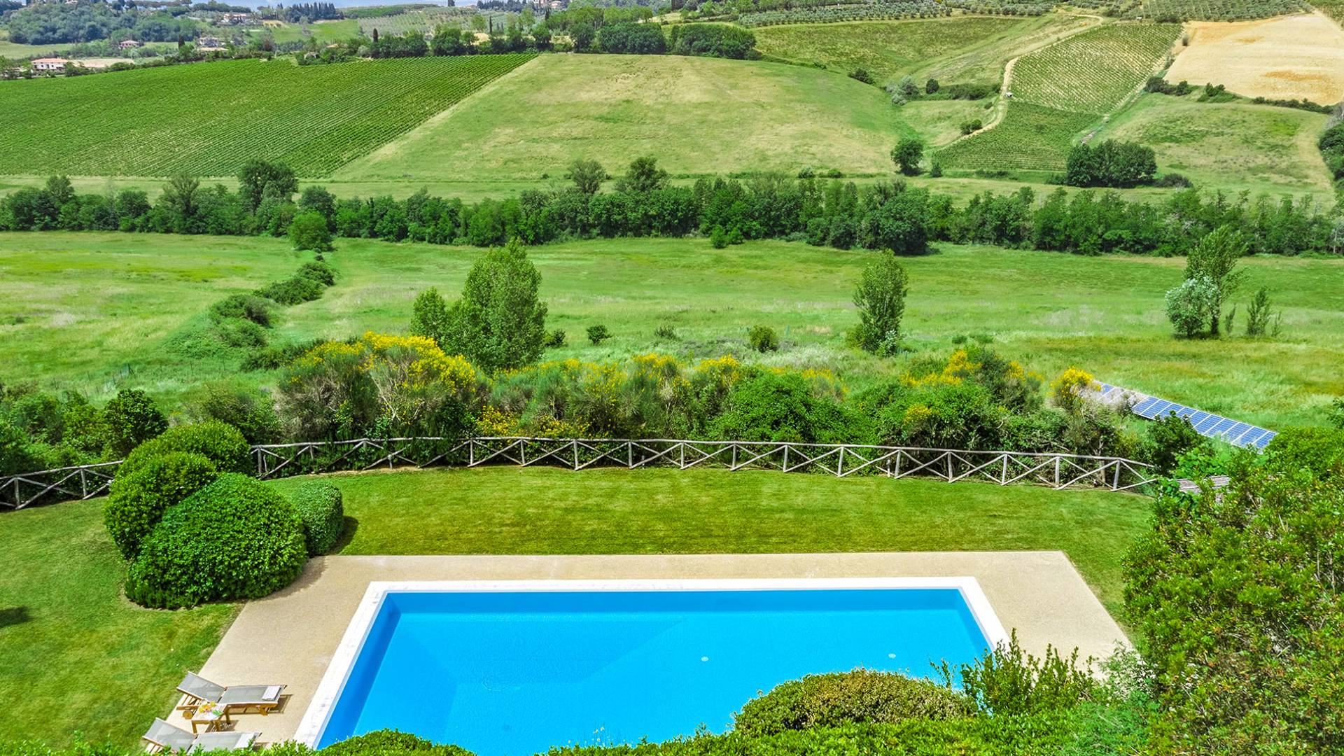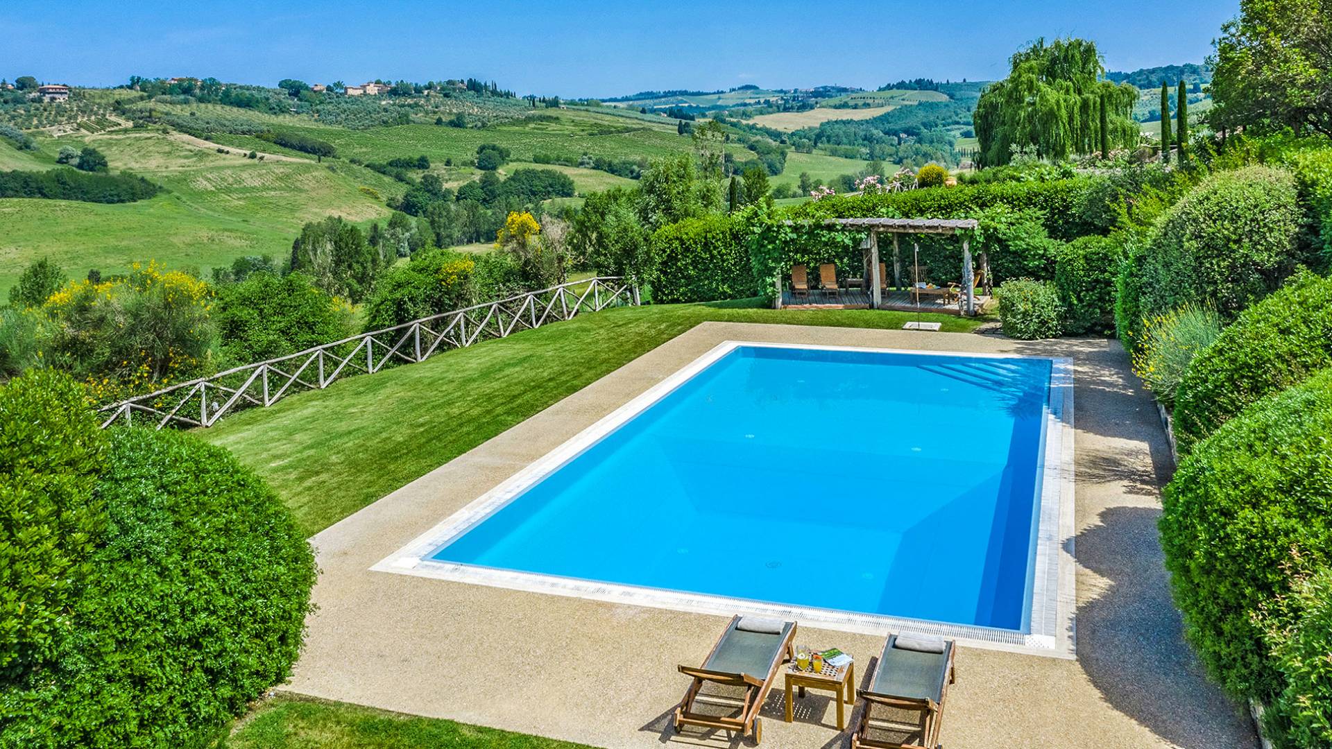 Der gepflegte Garten, der das Haus umgibt, gewährleistet absolute Privatsphäre und führt zu einem großen Pool, der so positioniert ist, dass Sie die beste Aussicht genießen können. Es ist klar, dass der Pool nicht immer da war, dass er „hinzugefügt“ wurde, aber das Blau, das von dem gepflegten Rasen umgeben ist, passt perfekt zum Rest des Hauses. Der Pool ist von dunklem Holz umgeben, ein herrliches Gefühl auf den Fußsohlen, und Sie können den Pool von dort oder vom Sprungbrett aus betreten. Das Wichtigste ist, die Frische in der Hitze der Sommersonne zu genießen.
