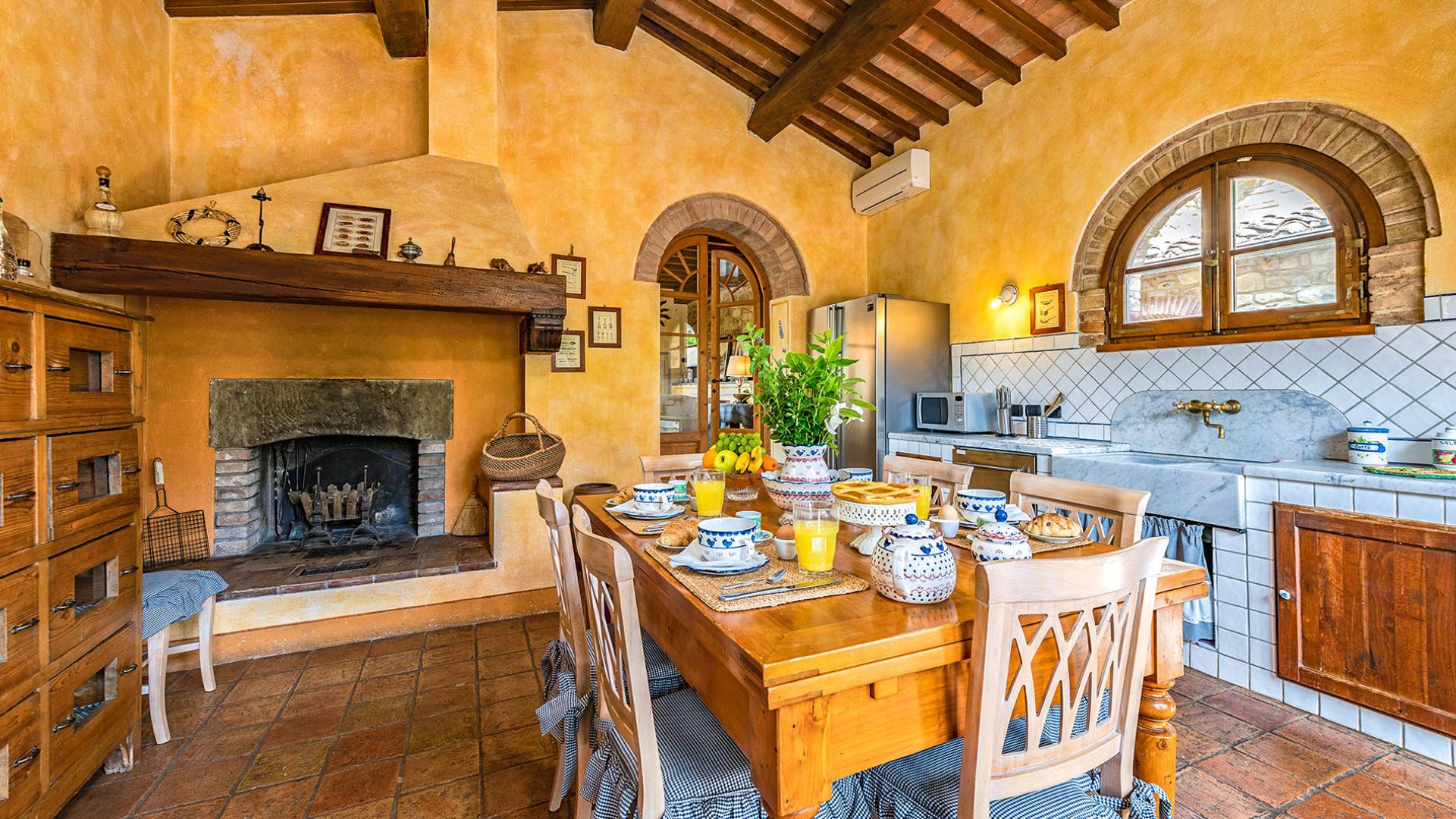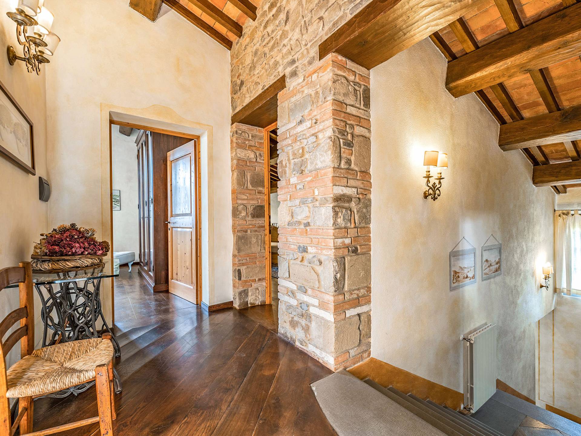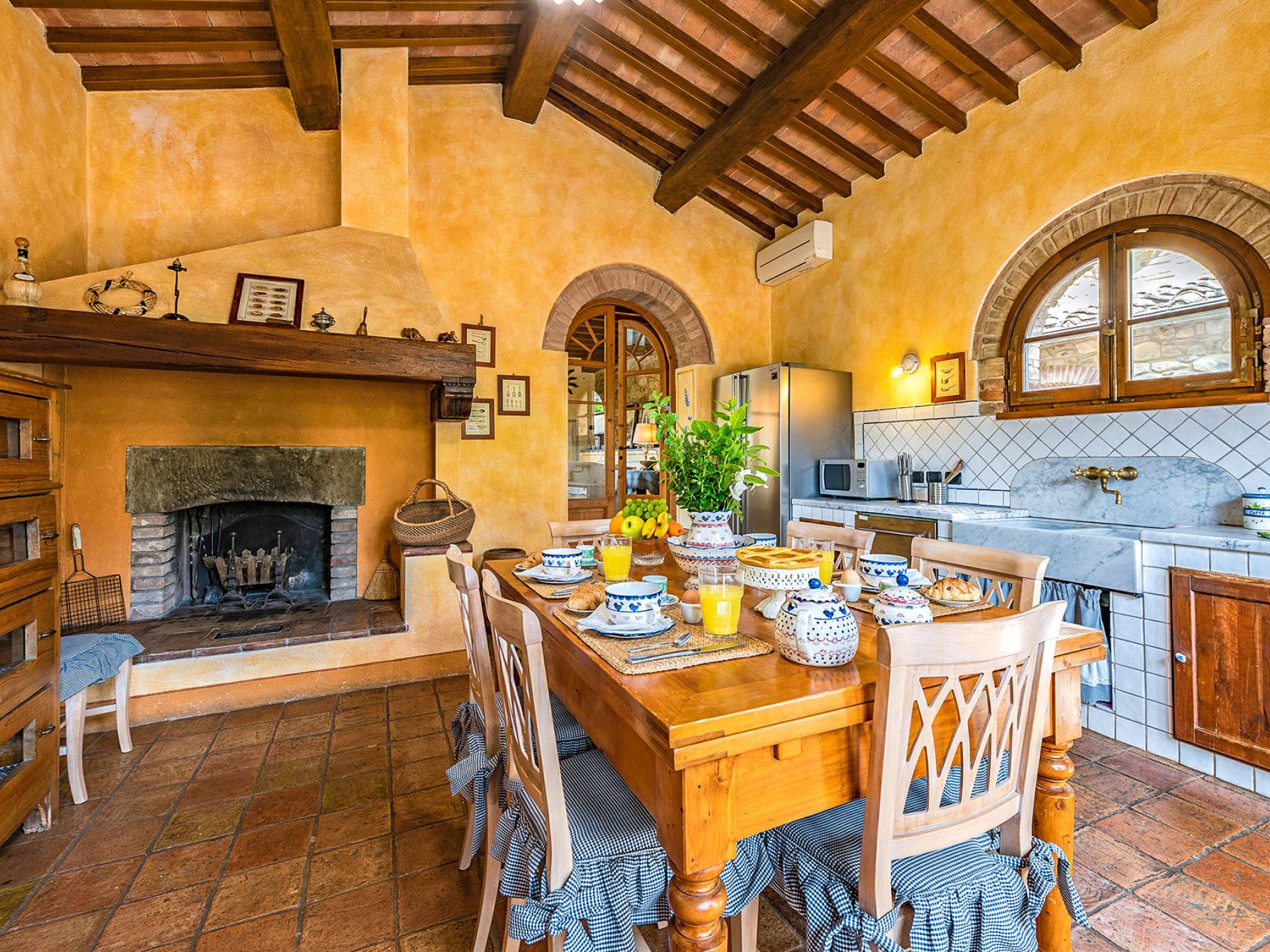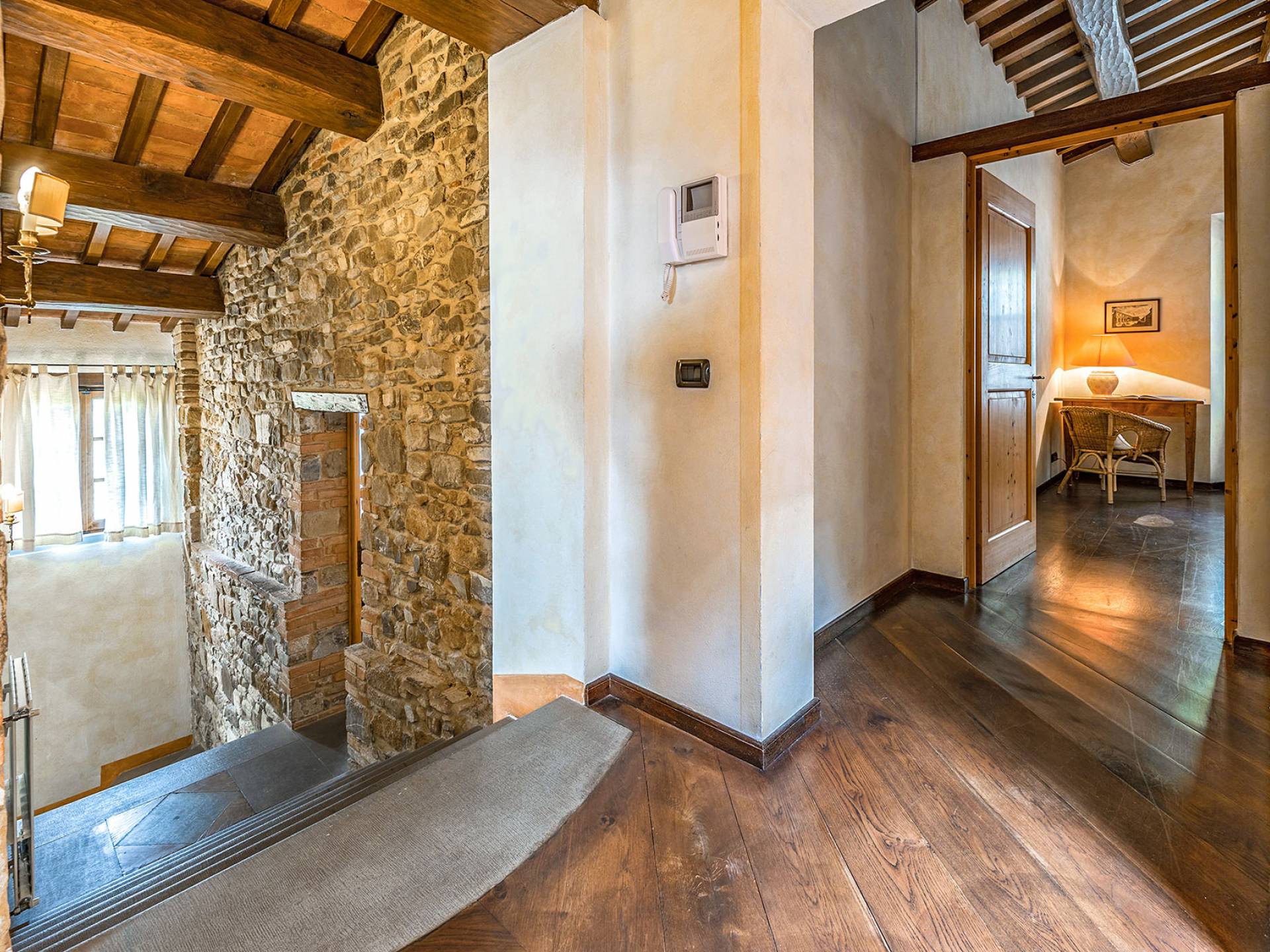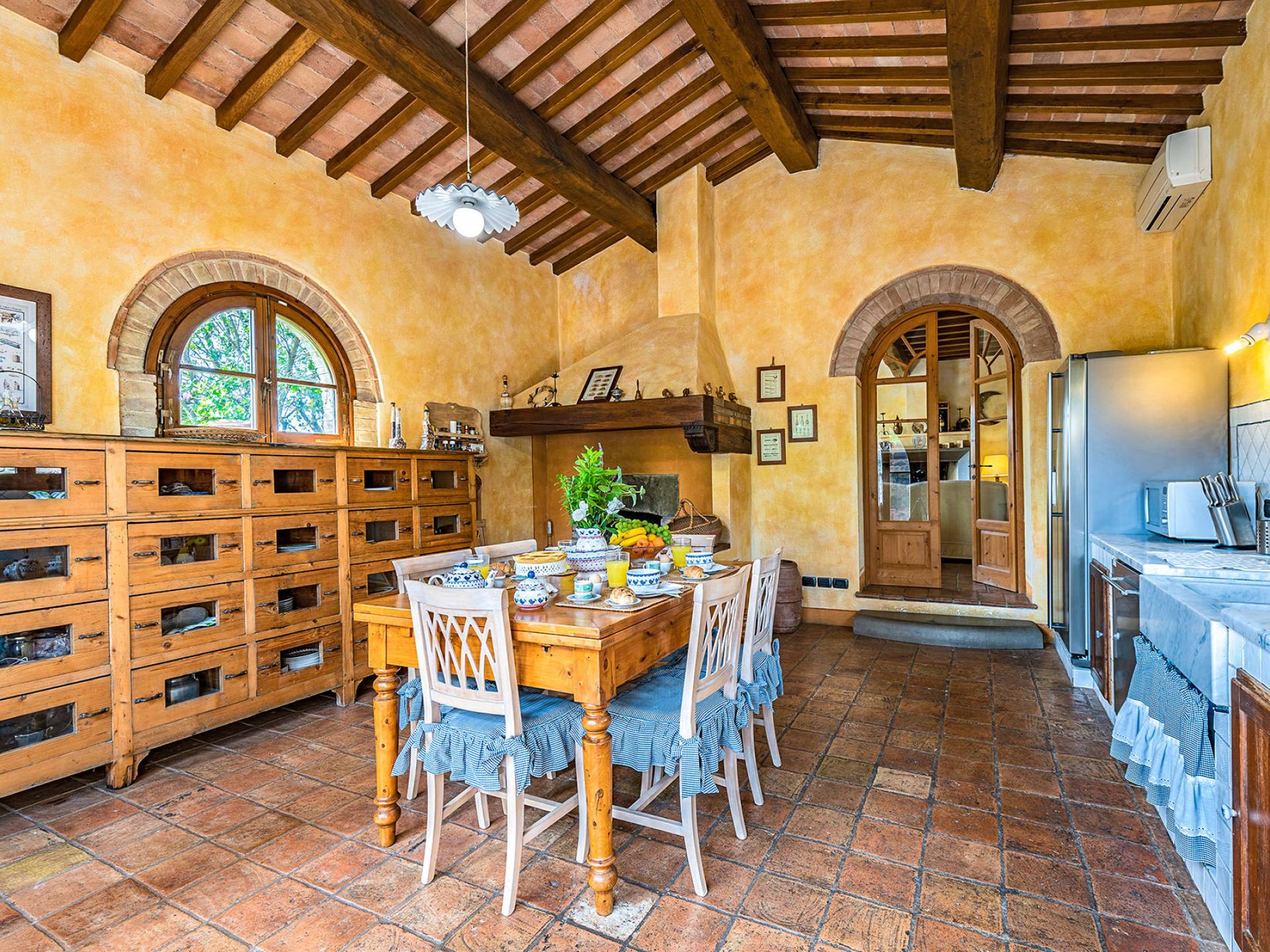 Alle Innenbereiche wurden mit modernen und klassischen, traditionellen toskanischen Stücken eingerichtet, die sich gut in die antiken „Cotto“ -Böden und die Deckenbalken einfügen. Die große Küche verfügt über einen Geschirrspüler, einen Herd und einen amerikanischen Doppelkühlschrank mit einem schönen Kamin.