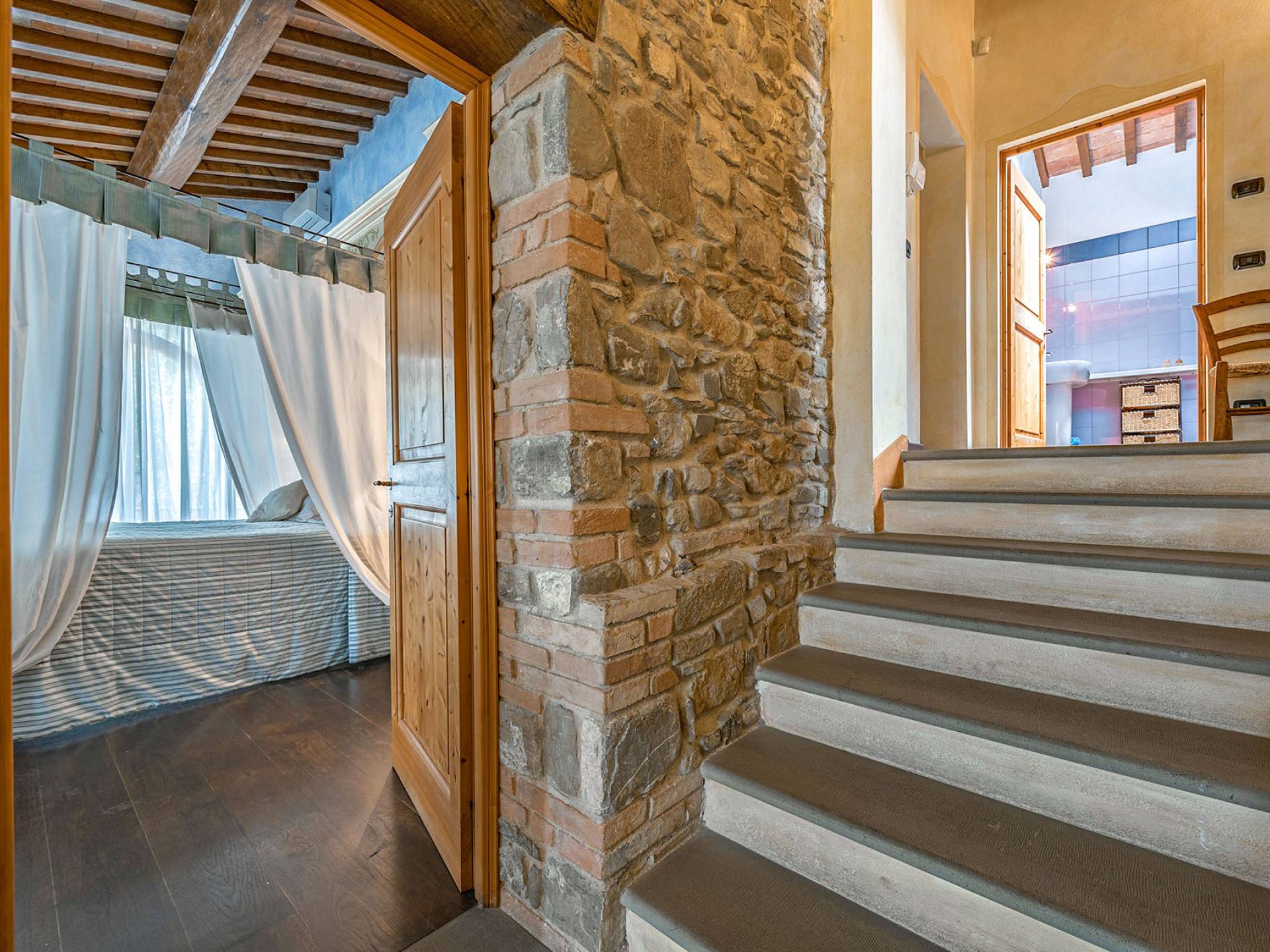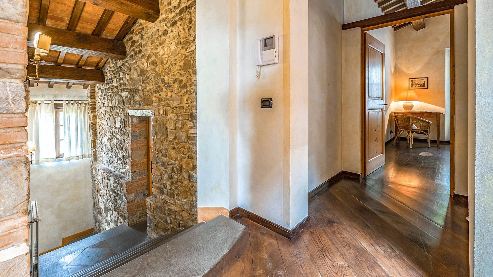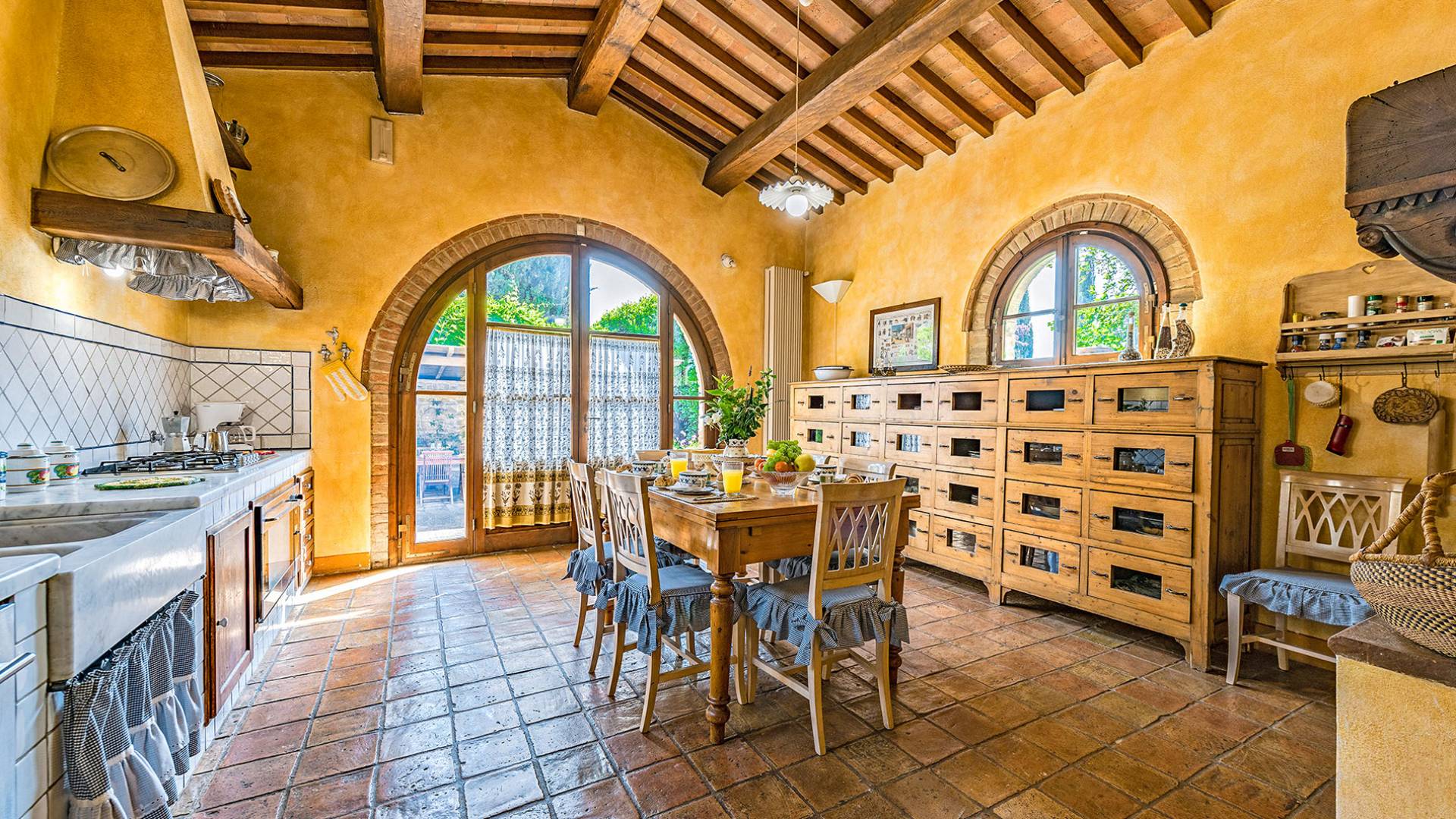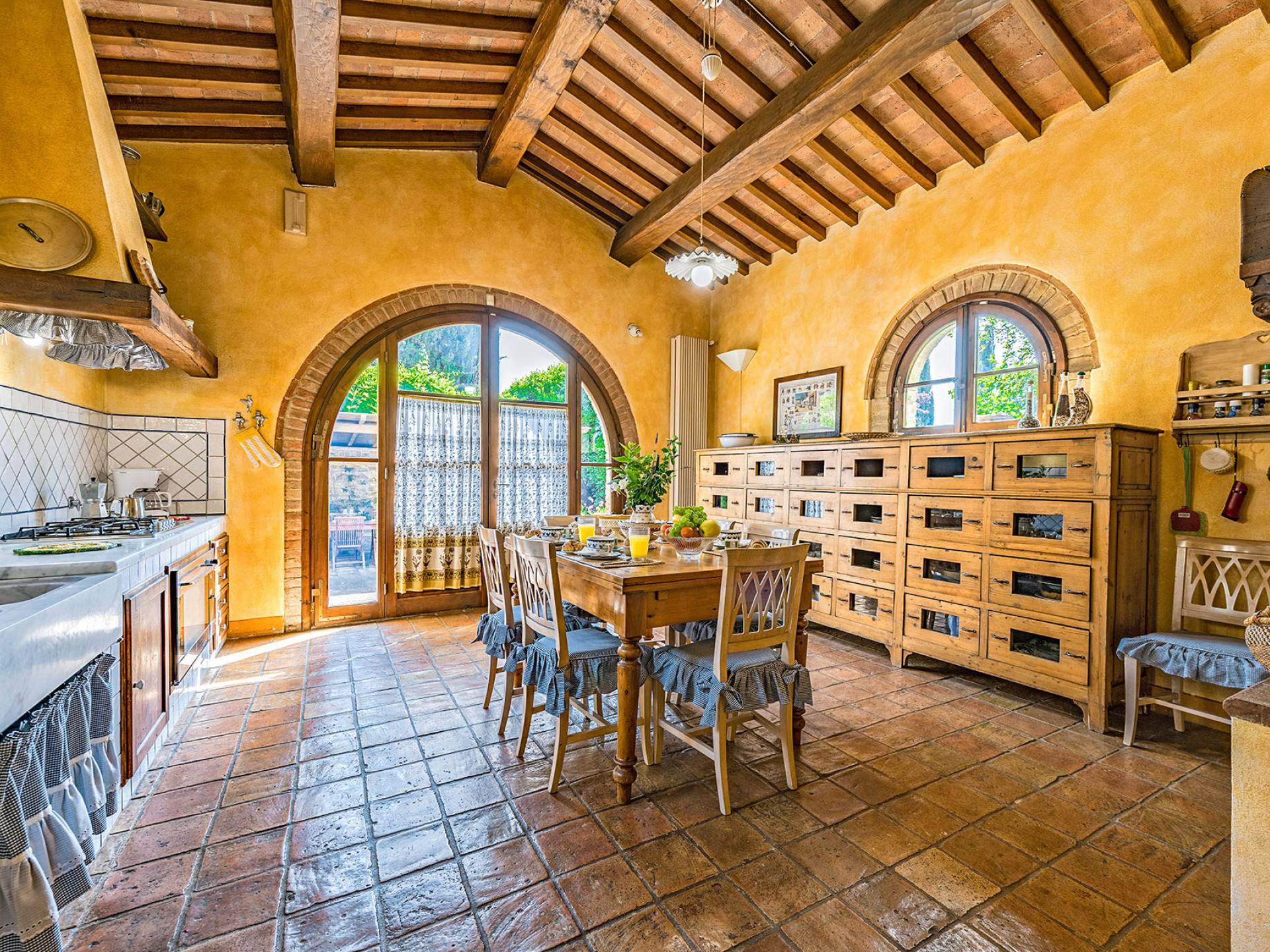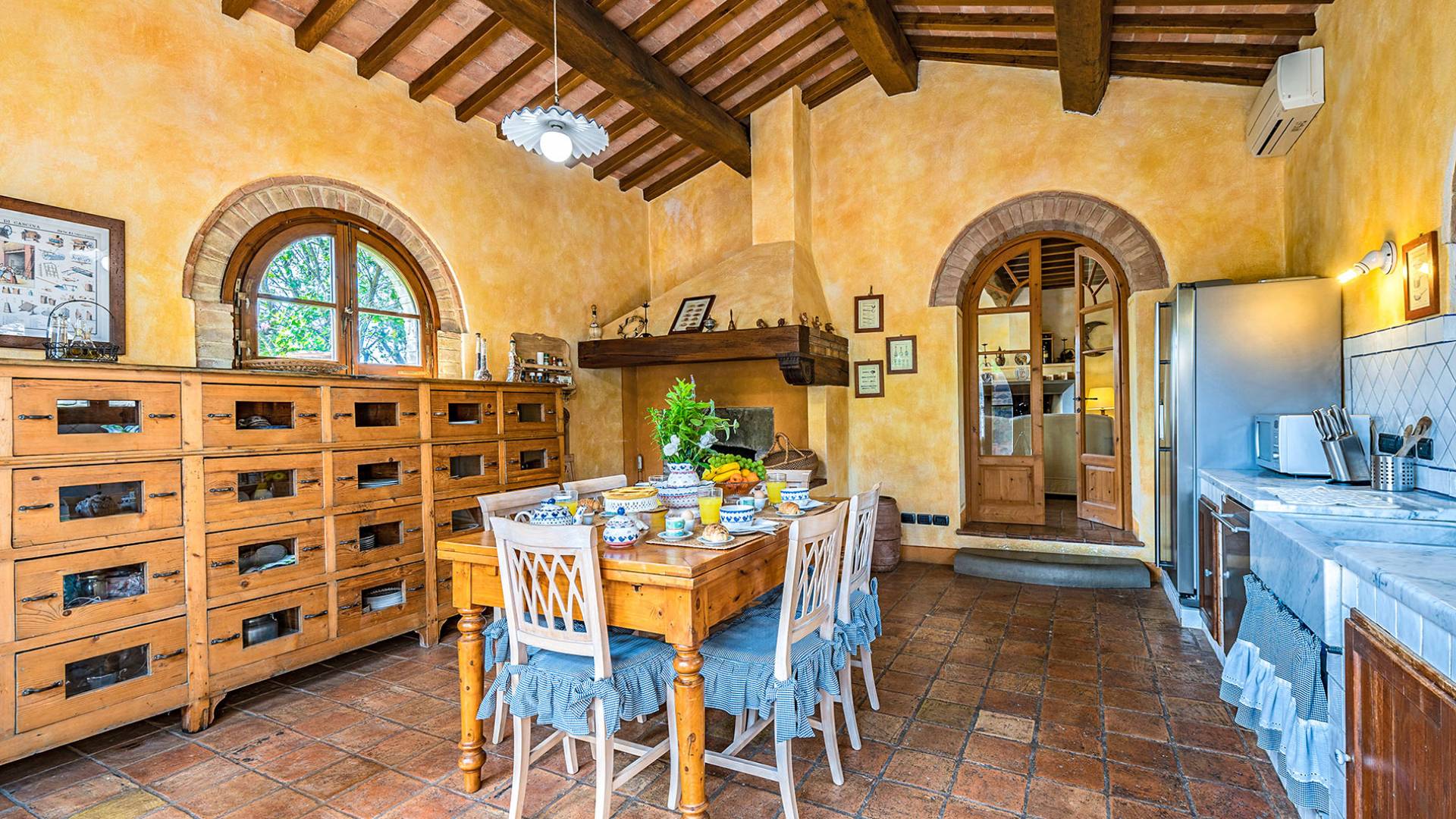 Alle Innenbereiche wurden mit modernen und klassischen, traditionellen toskanischen Stücken eingerichtet, die sich gut in die antiken „Cotto“ -Böden und die Deckenbalken einfügen. Die große Küche verfügt über einen Geschirrspüler, einen Herd und einen amerikanischen Doppelkühlschrank mit einem schönen Kamin.