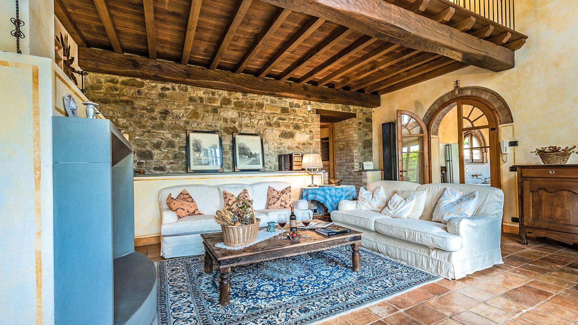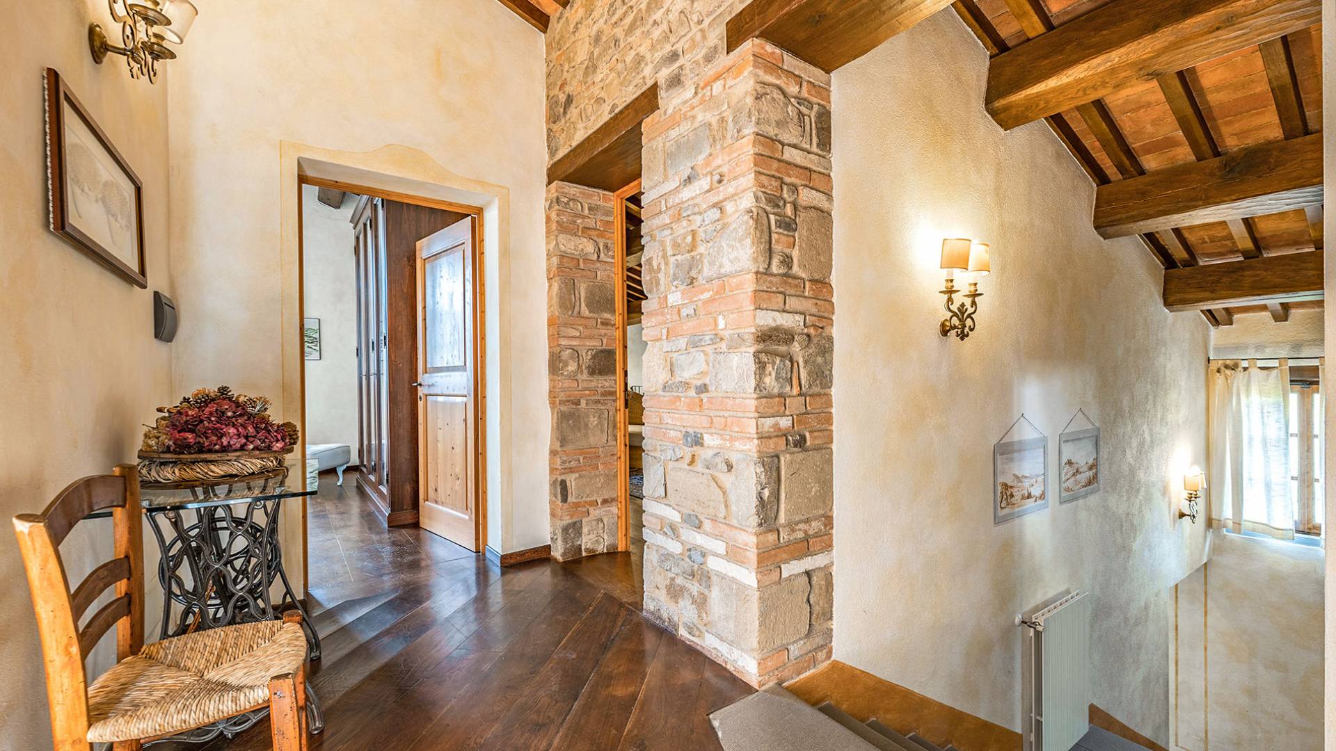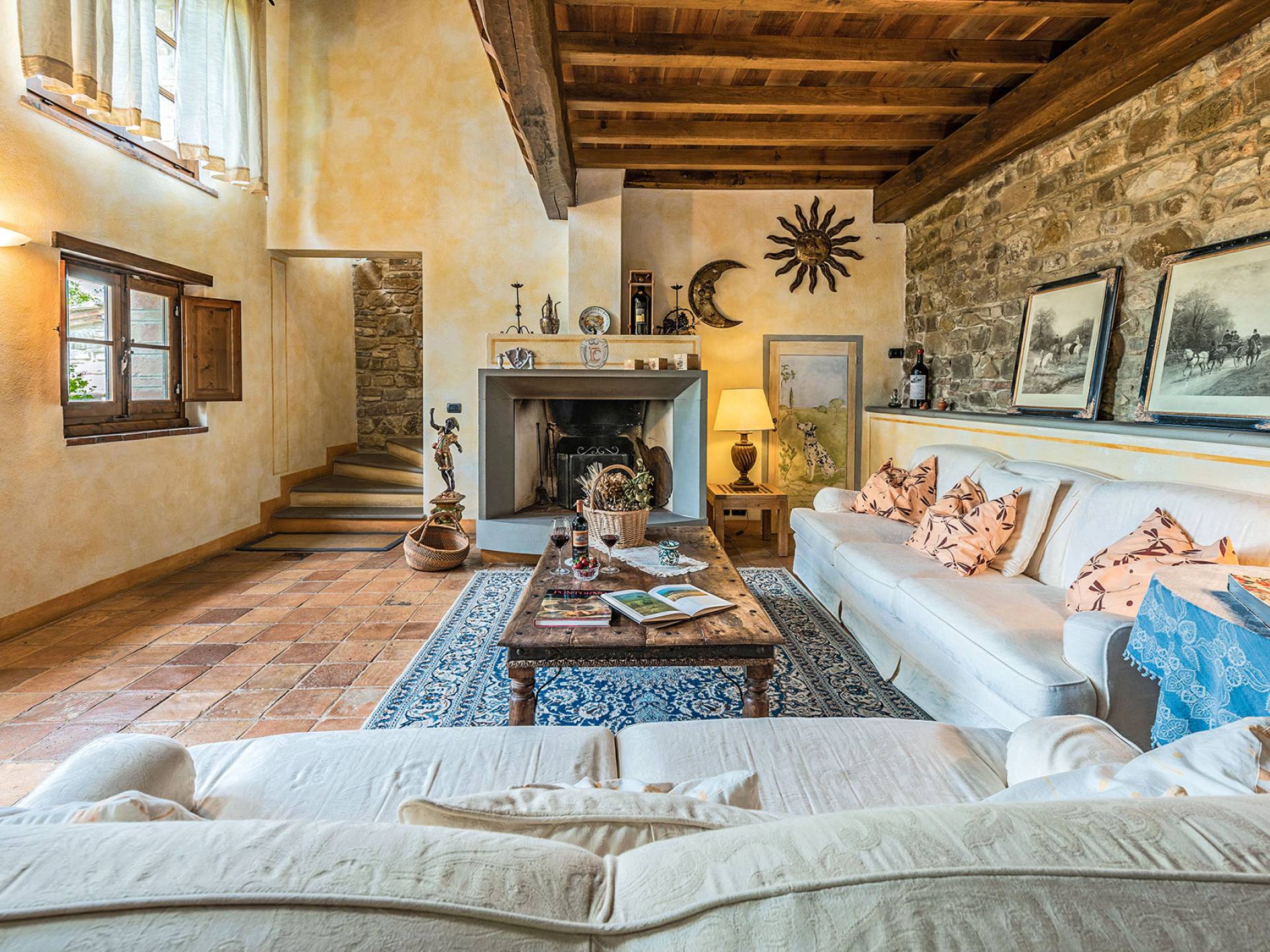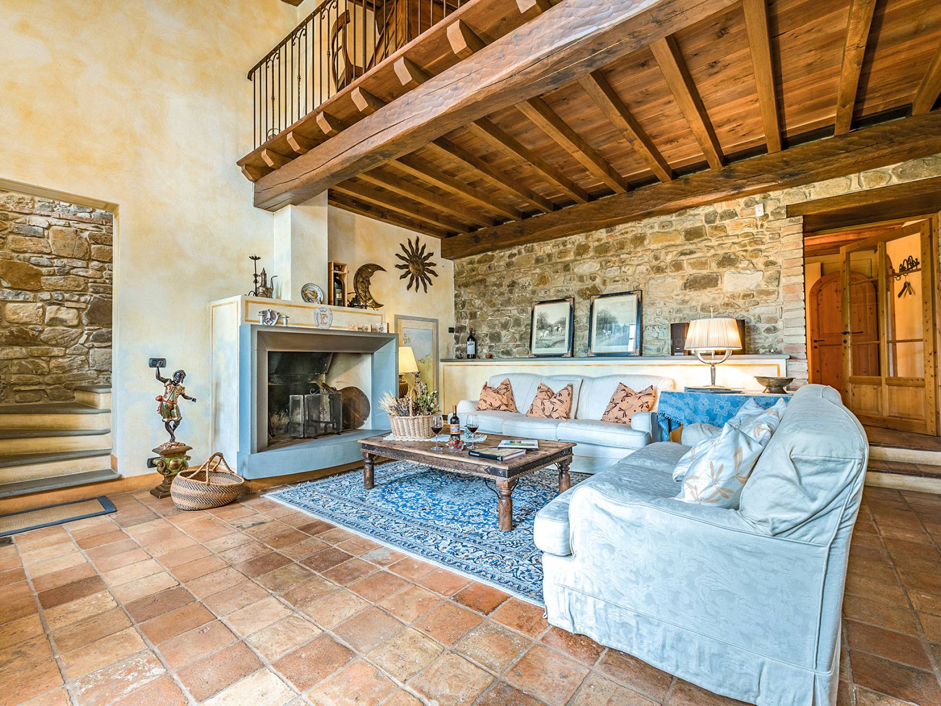 Alle Innenbereiche wurden mit modernen und klassischen, traditionellen toskanischen Stücken eingerichtet, die sich gut in die antiken „Cotto“ -Böden und die Deckenbalken einfügen. Die große Küche verfügt über einen Geschirrspüler, einen Herd und einen amerikanischen Doppelkühlschrank mit einem schönen Kamin.