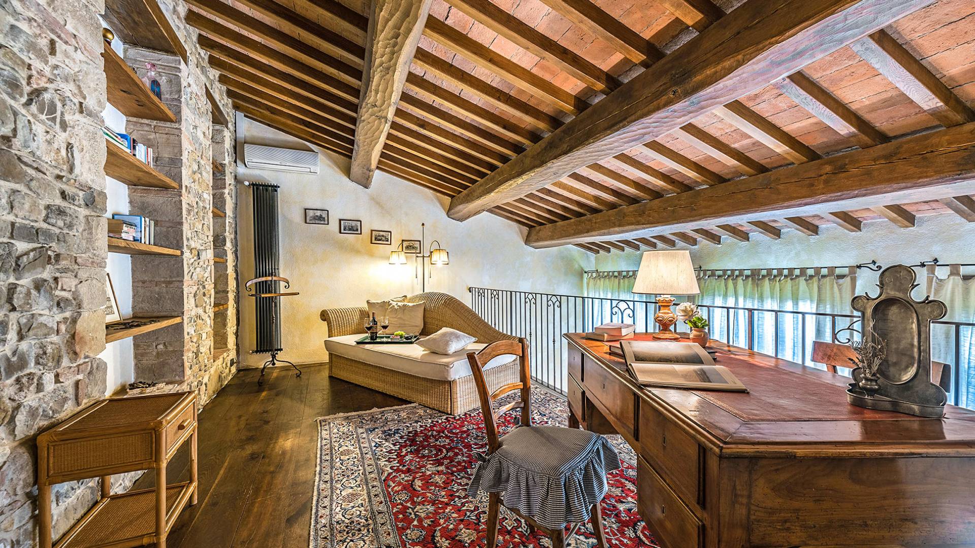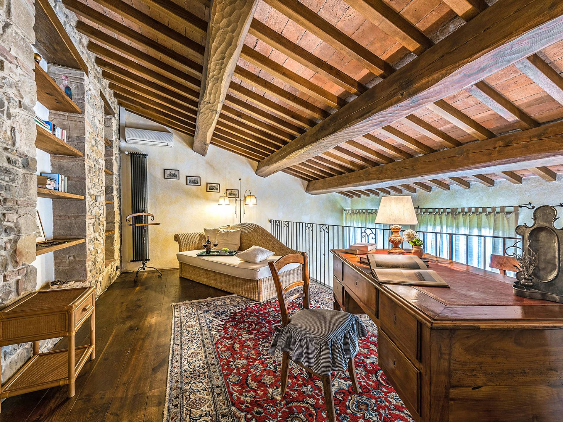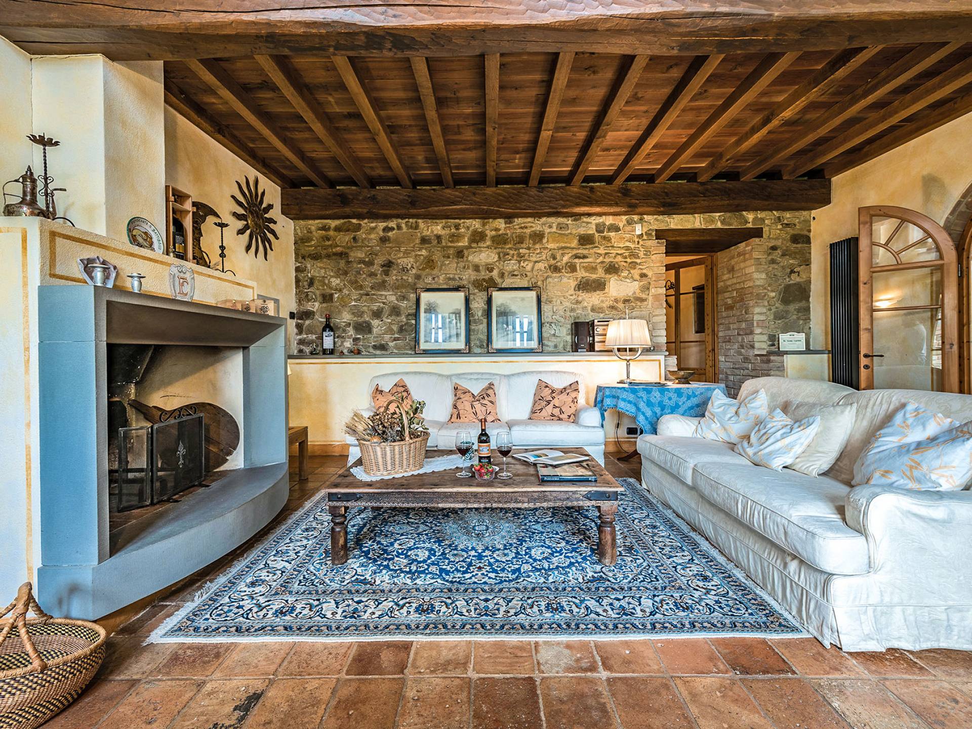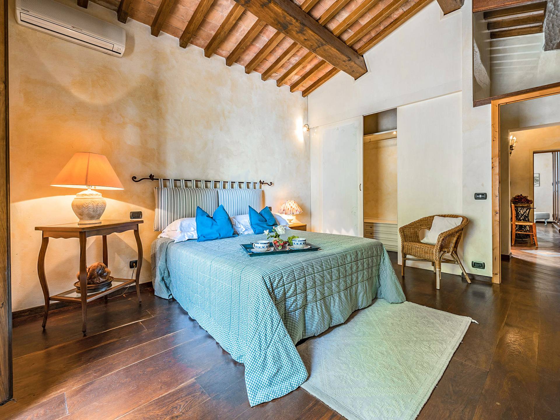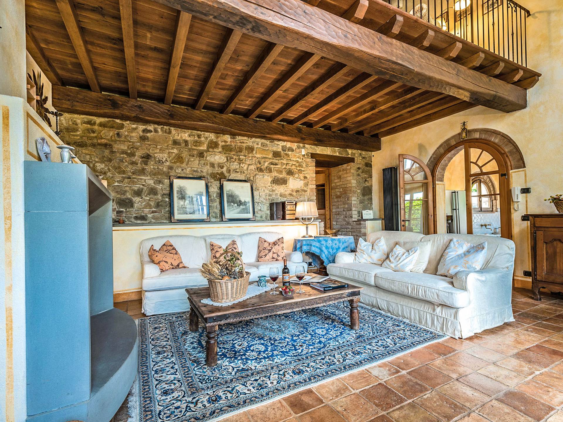 Alle Innenbereiche wurden mit modernen und klassischen, traditionellen toskanischen Stücken eingerichtet, die sich gut in die antiken „Cotto“ -Böden und die Deckenbalken einfügen. Die große Küche verfügt über einen Geschirrspüler, einen Herd und einen amerikanischen Doppelkühlschrank mit einem schönen Kamin.