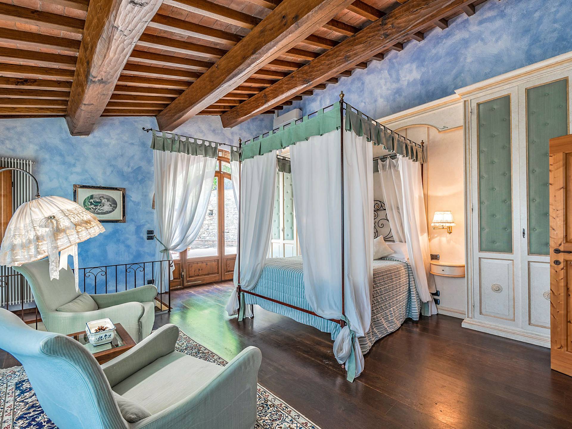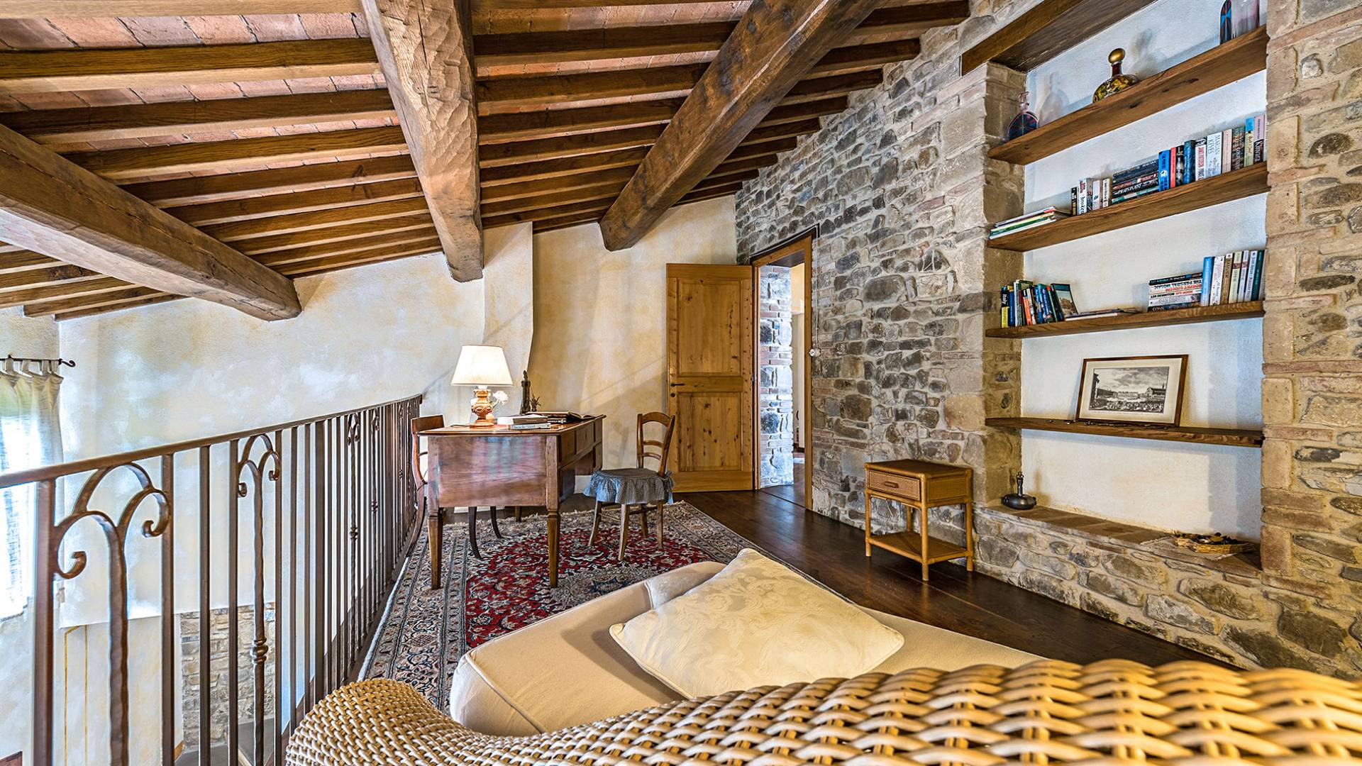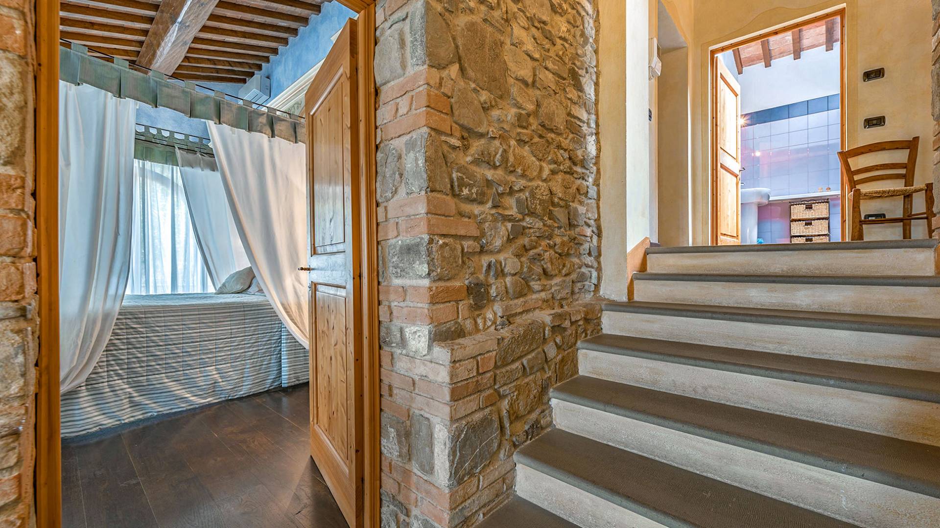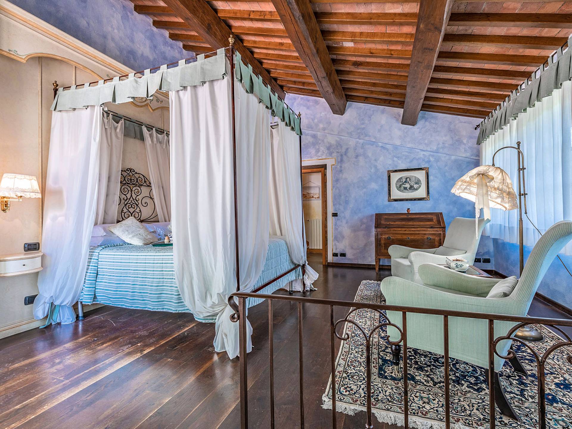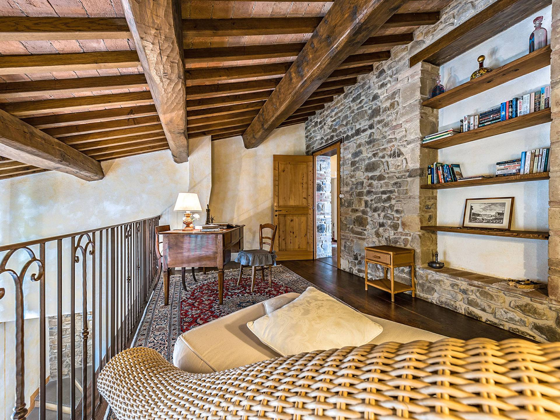 Alle Innenbereiche wurden mit modernen und klassischen, traditionellen toskanischen Stücken eingerichtet, die sich gut in die antiken „Cotto“ -Böden und die Deckenbalken einfügen. Die große Küche verfügt über einen Geschirrspüler, einen Herd und einen amerikanischen Doppelkühlschrank mit einem schönen Kamin.
