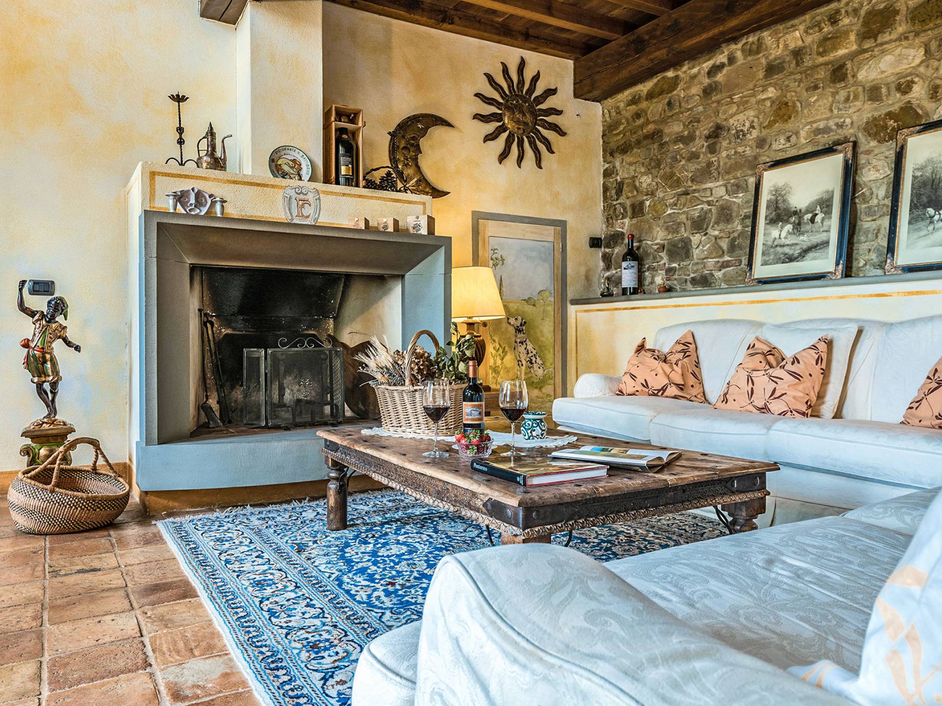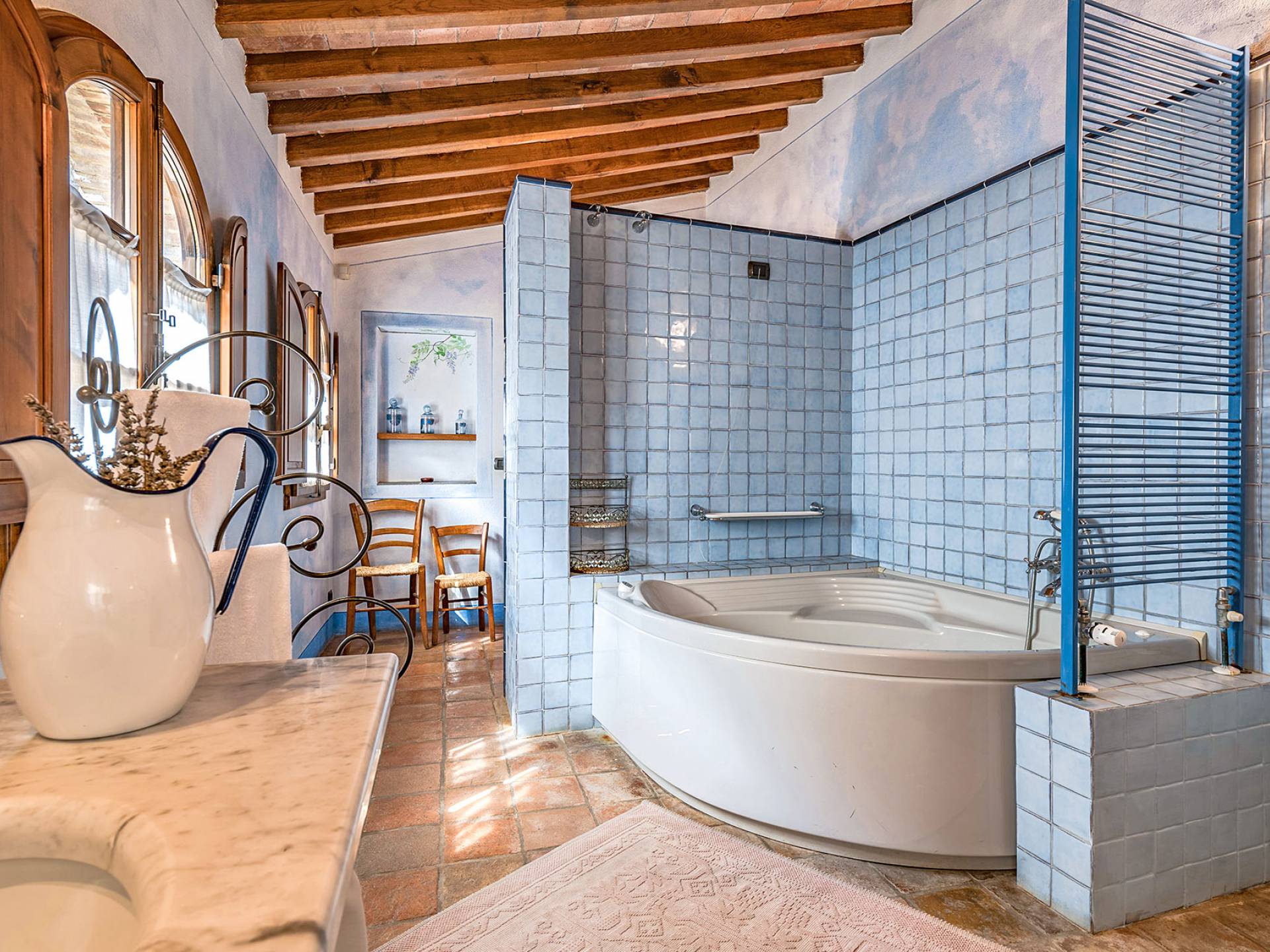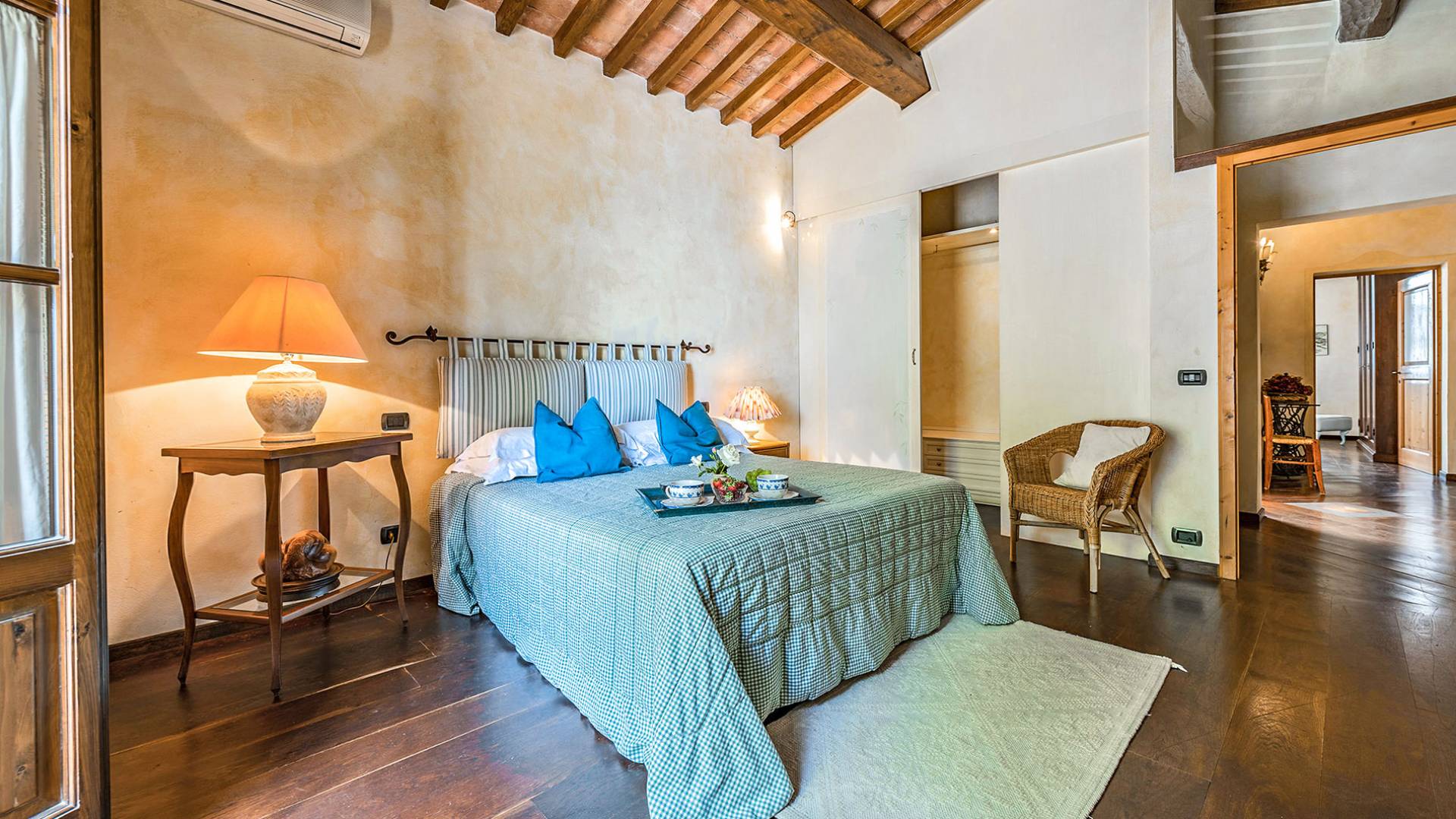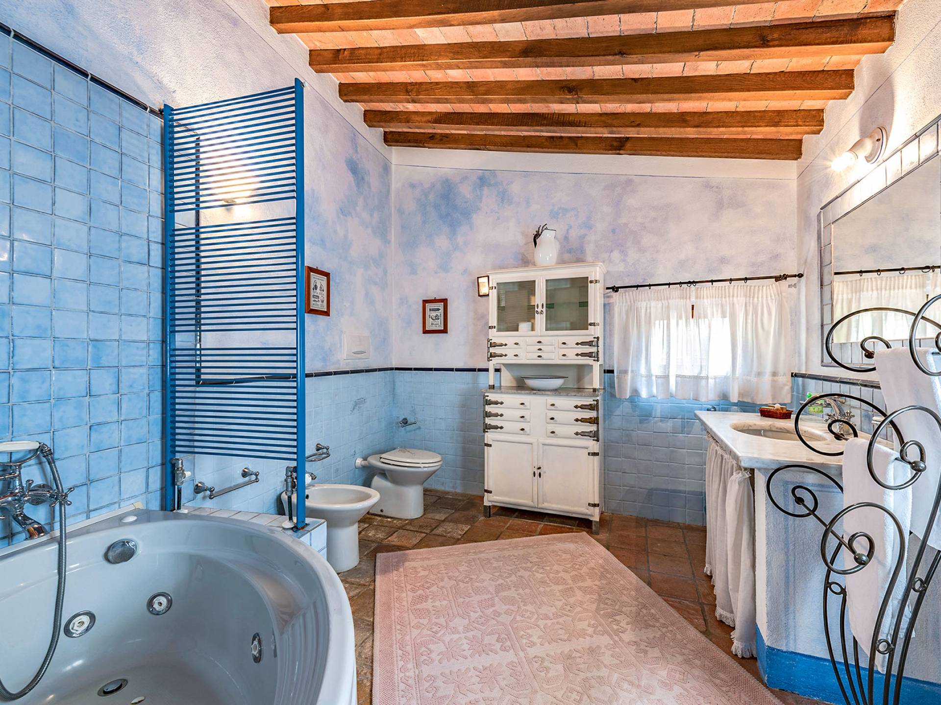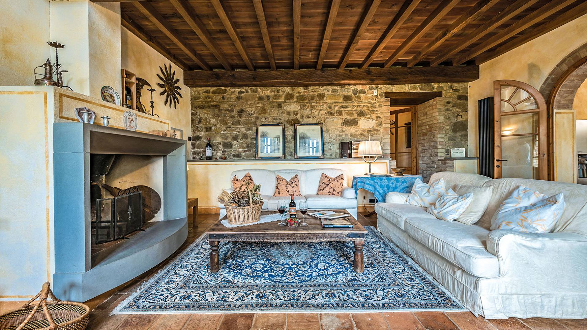 Alle Innenbereiche wurden mit modernen und klassischen, traditionellen toskanischen Stücken eingerichtet, die sich gut in die antiken „Cotto“ -Böden und die Deckenbalken einfügen. Die große Küche verfügt über einen Geschirrspüler, einen Herd und einen amerikanischen Doppelkühlschrank mit einem schönen Kamin.