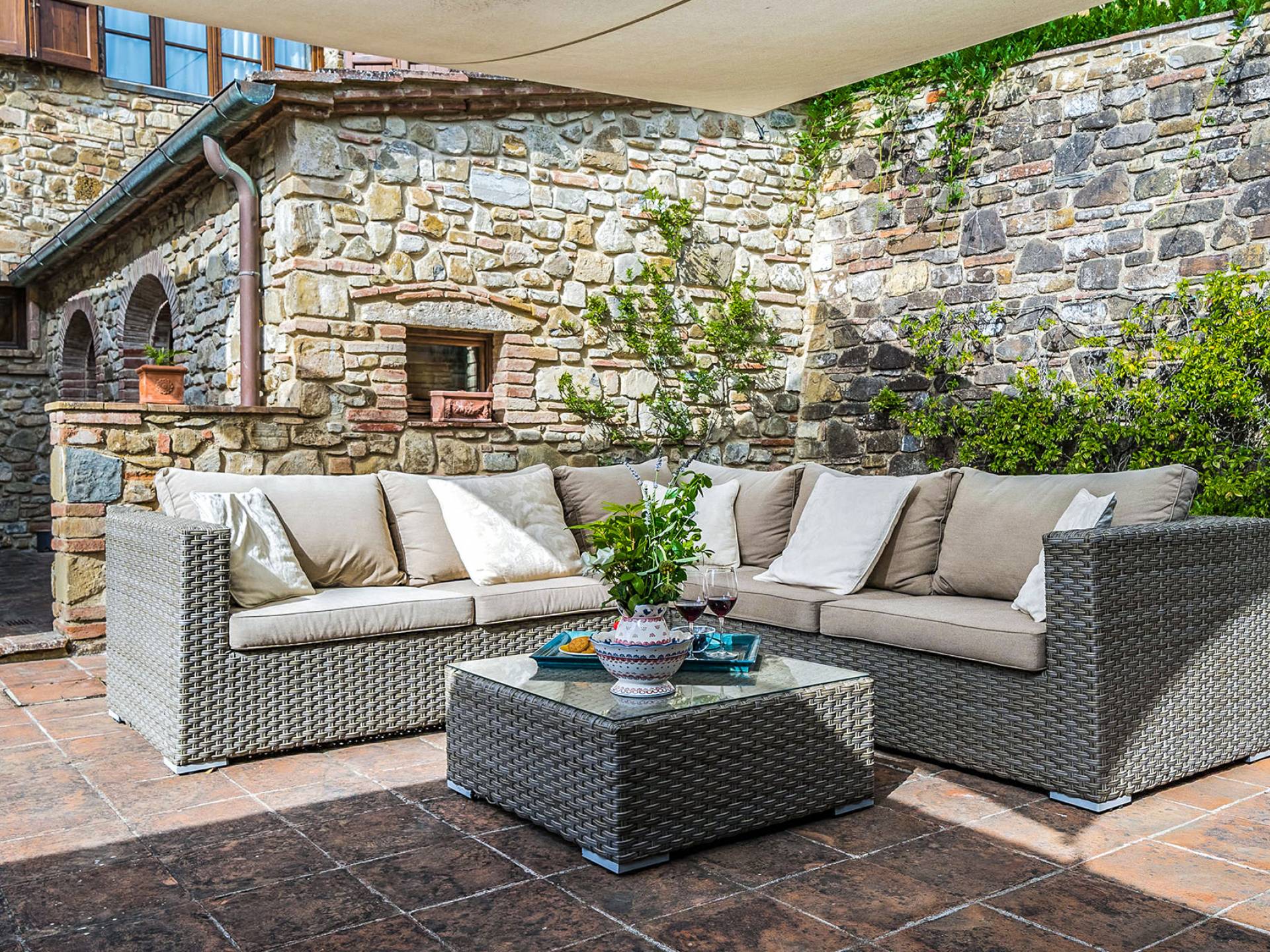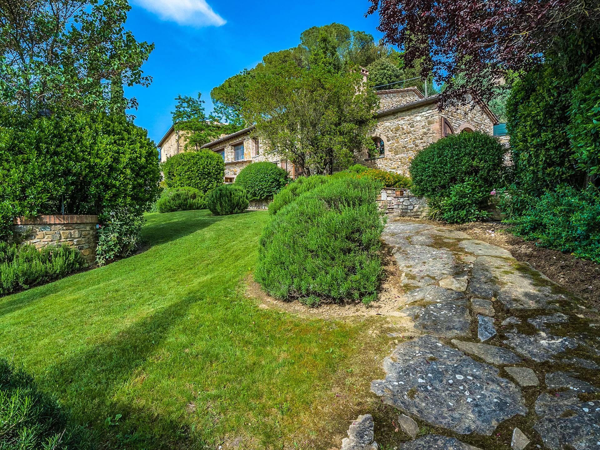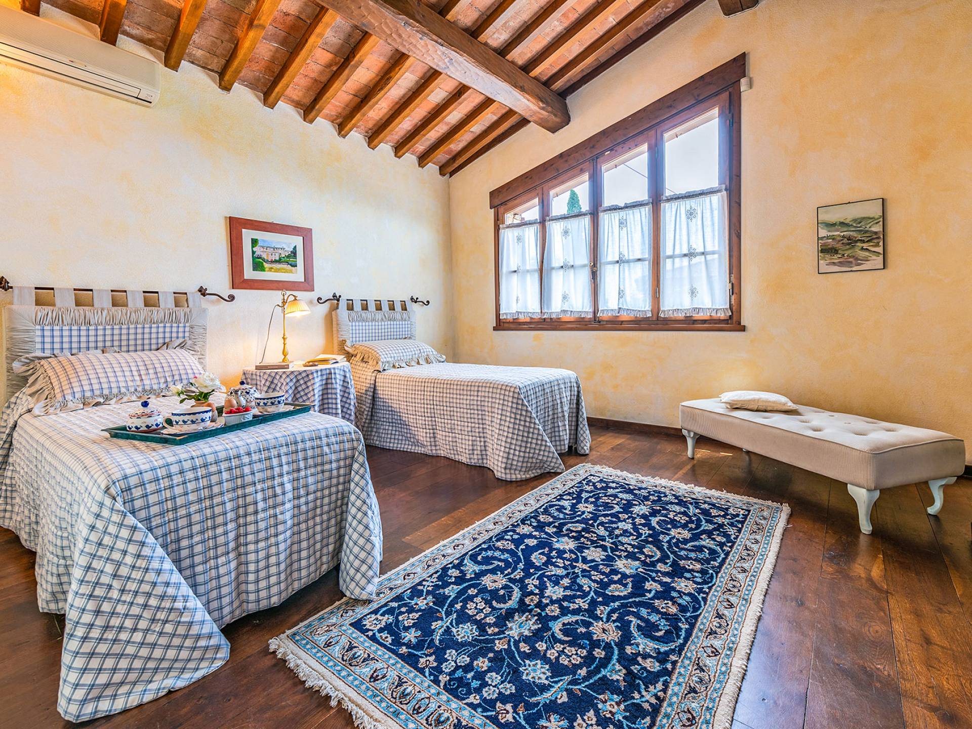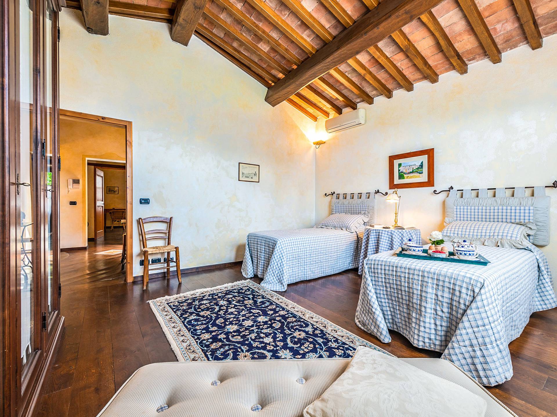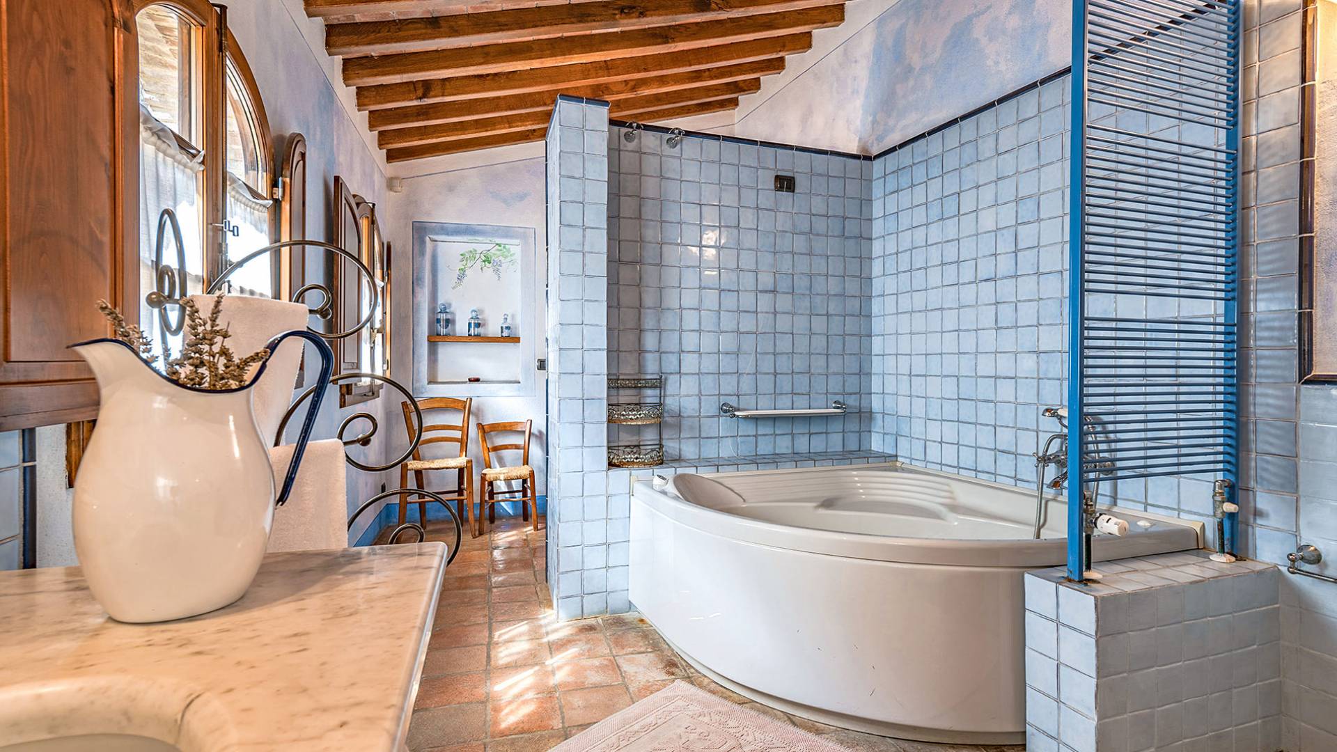 Alle Innenbereiche wurden mit modernen und klassischen, traditionellen toskanischen Stücken eingerichtet, die sich gut in die antiken „Cotto“ -Böden und die Deckenbalken einfügen. Die große Küche verfügt über einen Geschirrspüler, einen Herd und einen amerikanischen Doppelkühlschrank mit einem schönen Kamin.