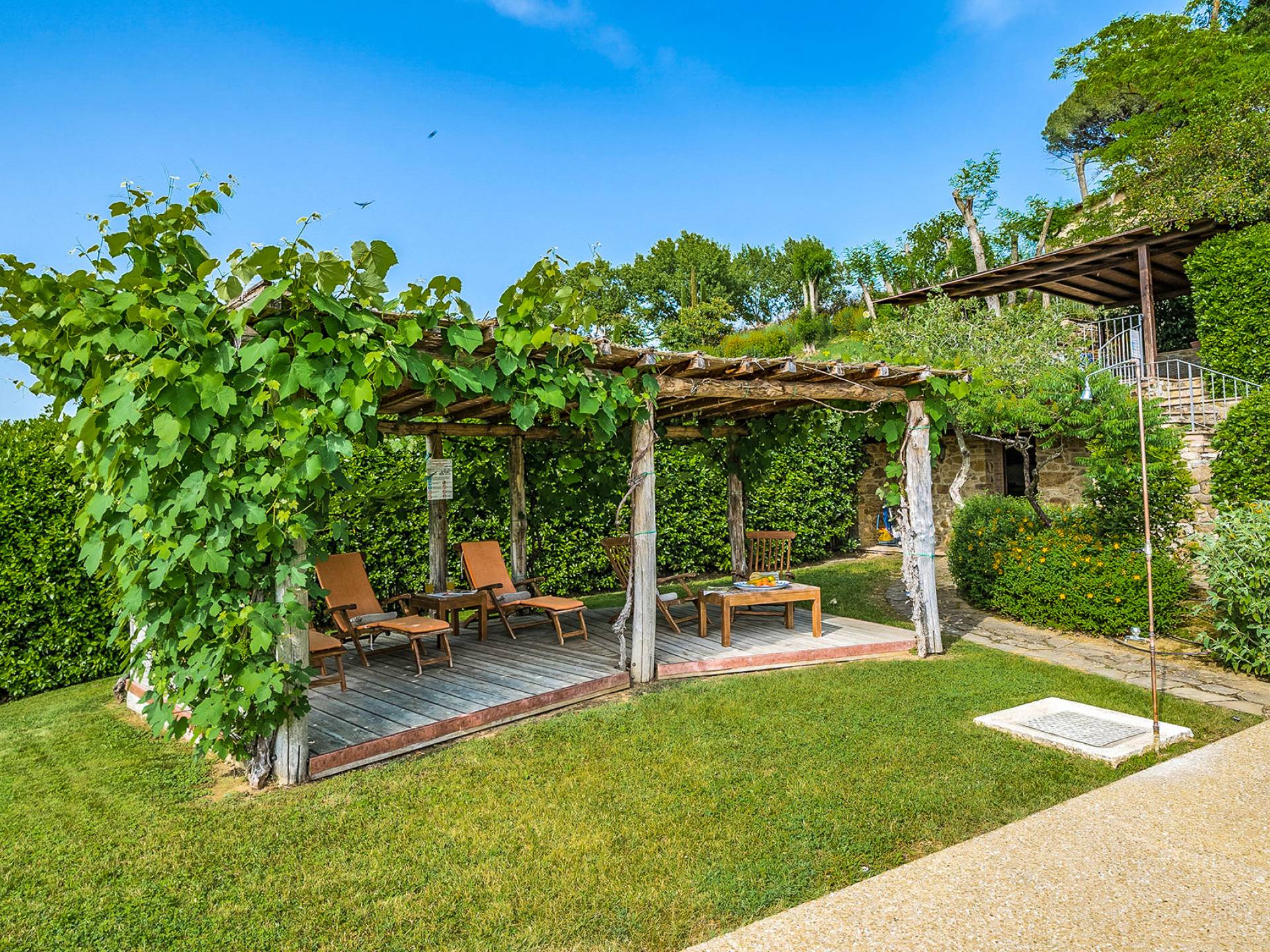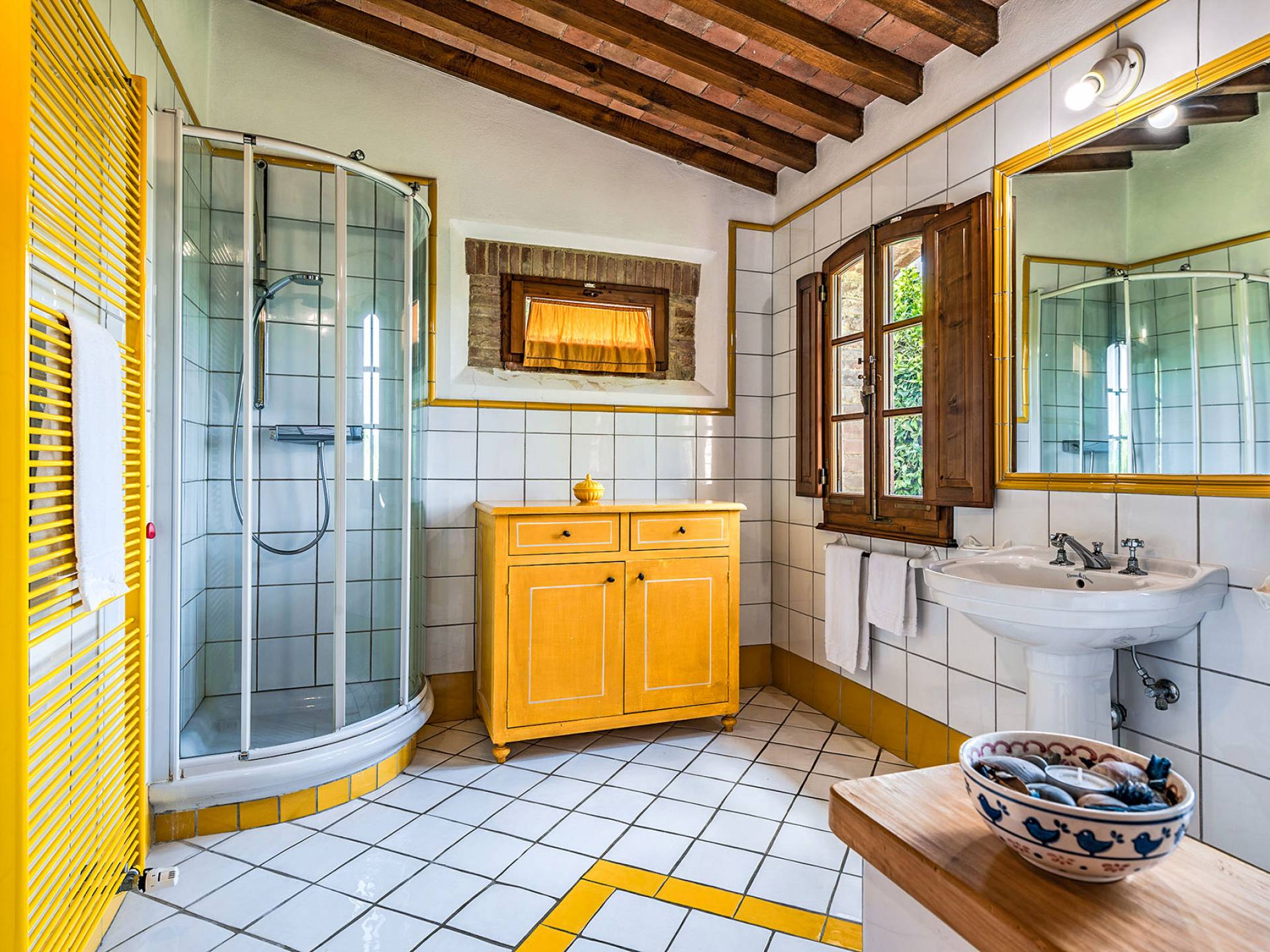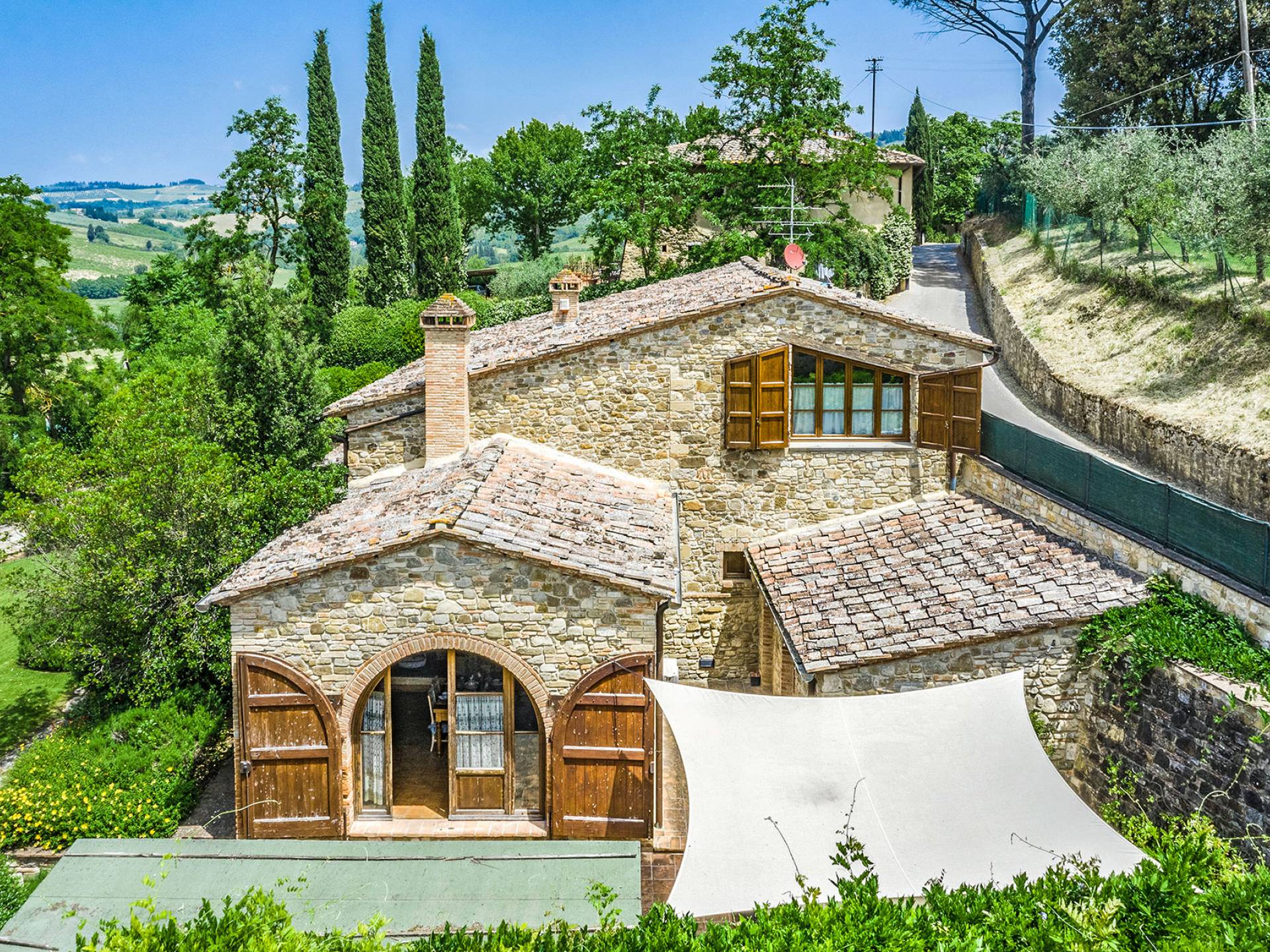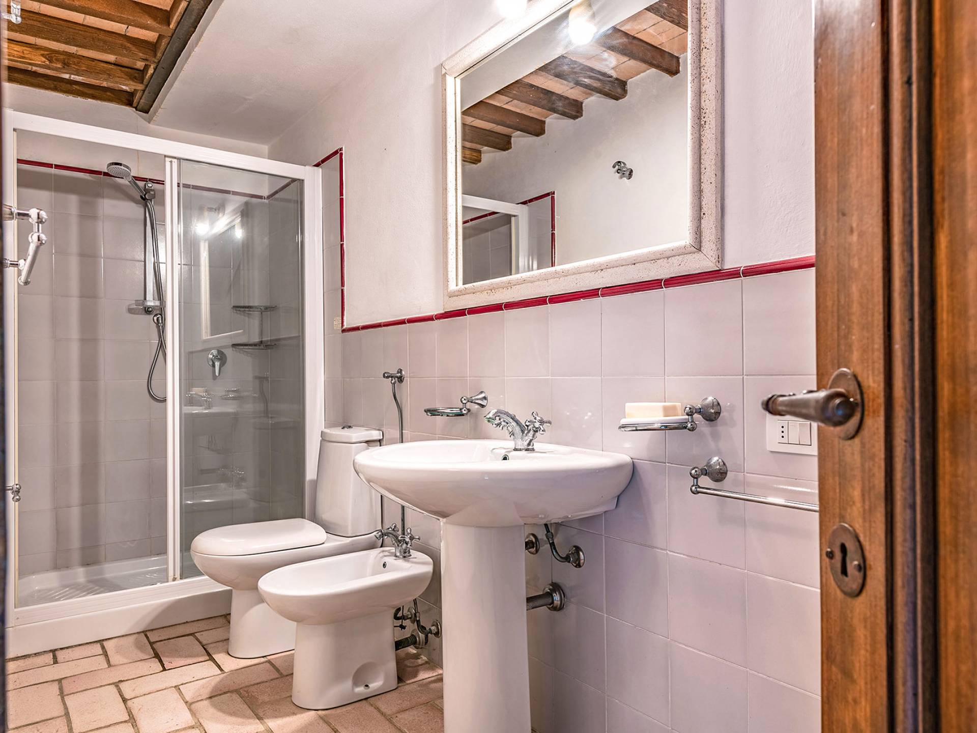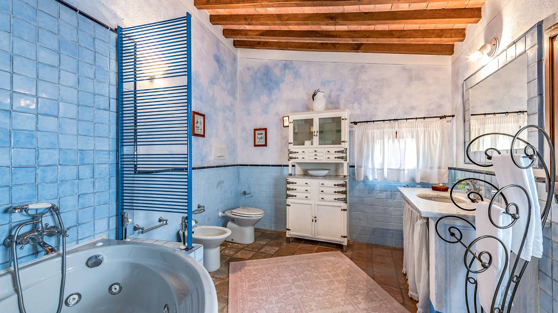 Alle Innenbereiche wurden mit modernen und klassischen, traditionellen toskanischen Stücken eingerichtet, die sich gut in die antiken „Cotto“ -Böden und die Deckenbalken einfügen. Die große Küche verfügt über einen Geschirrspüler, einen Herd und einen amerikanischen Doppelkühlschrank mit einem schönen Kamin.