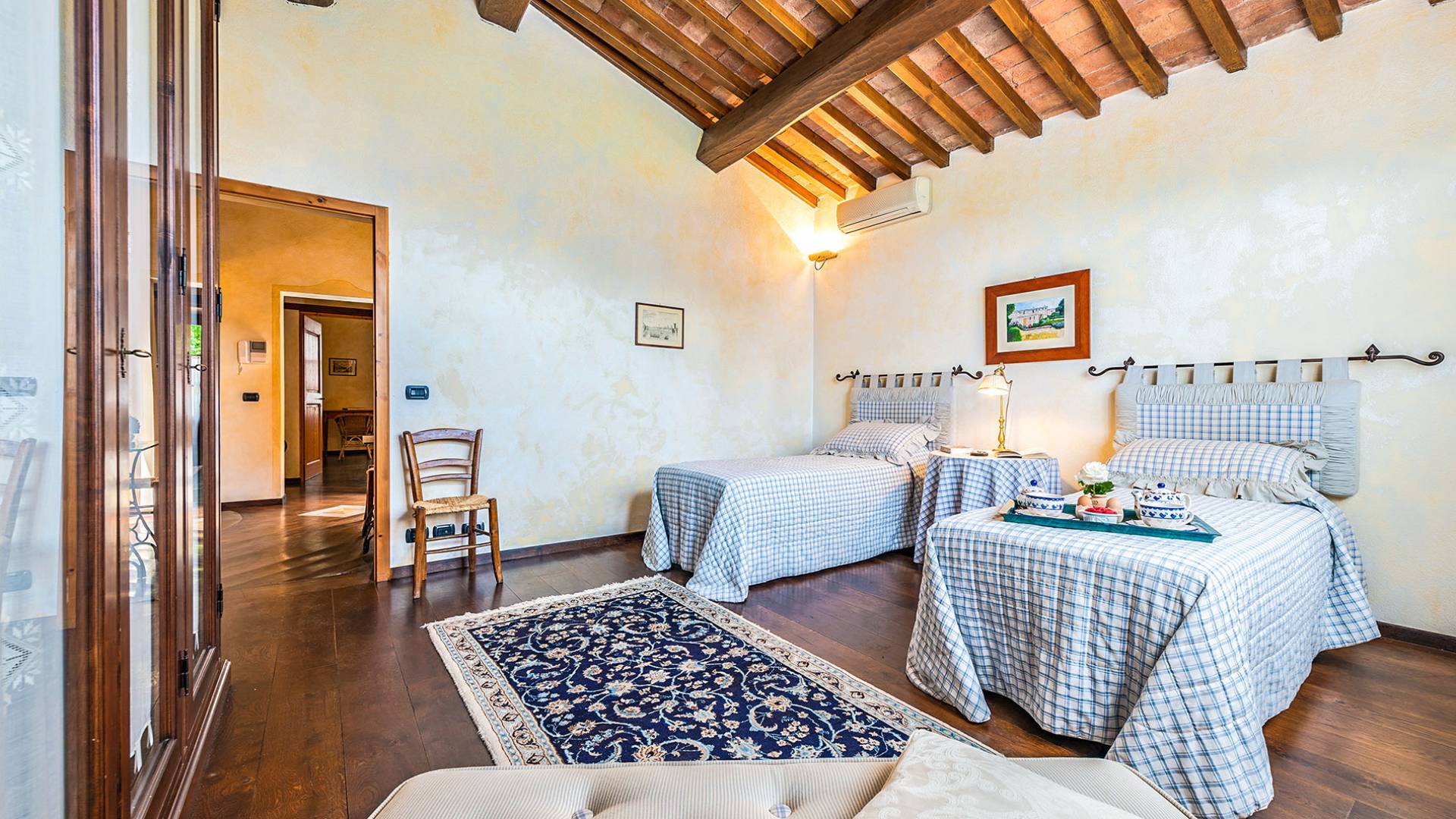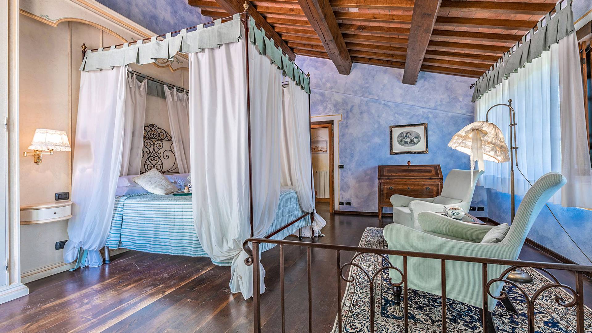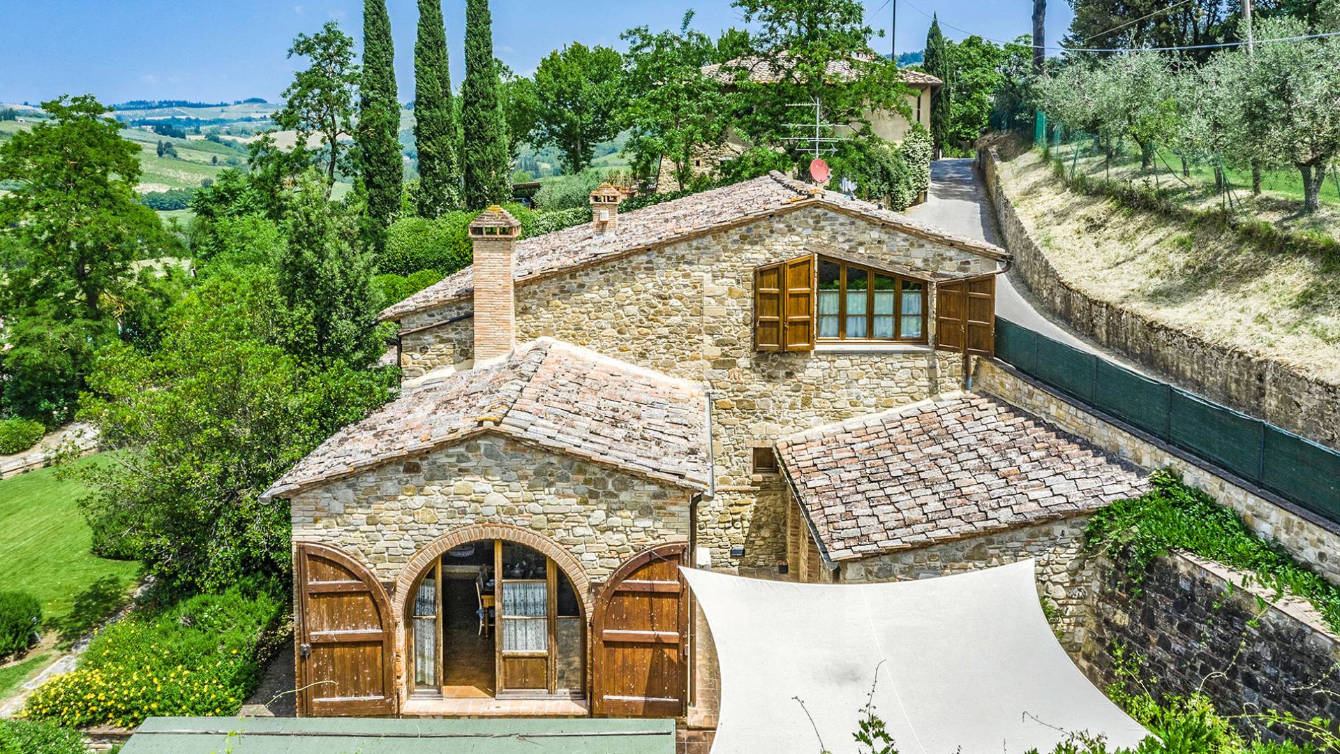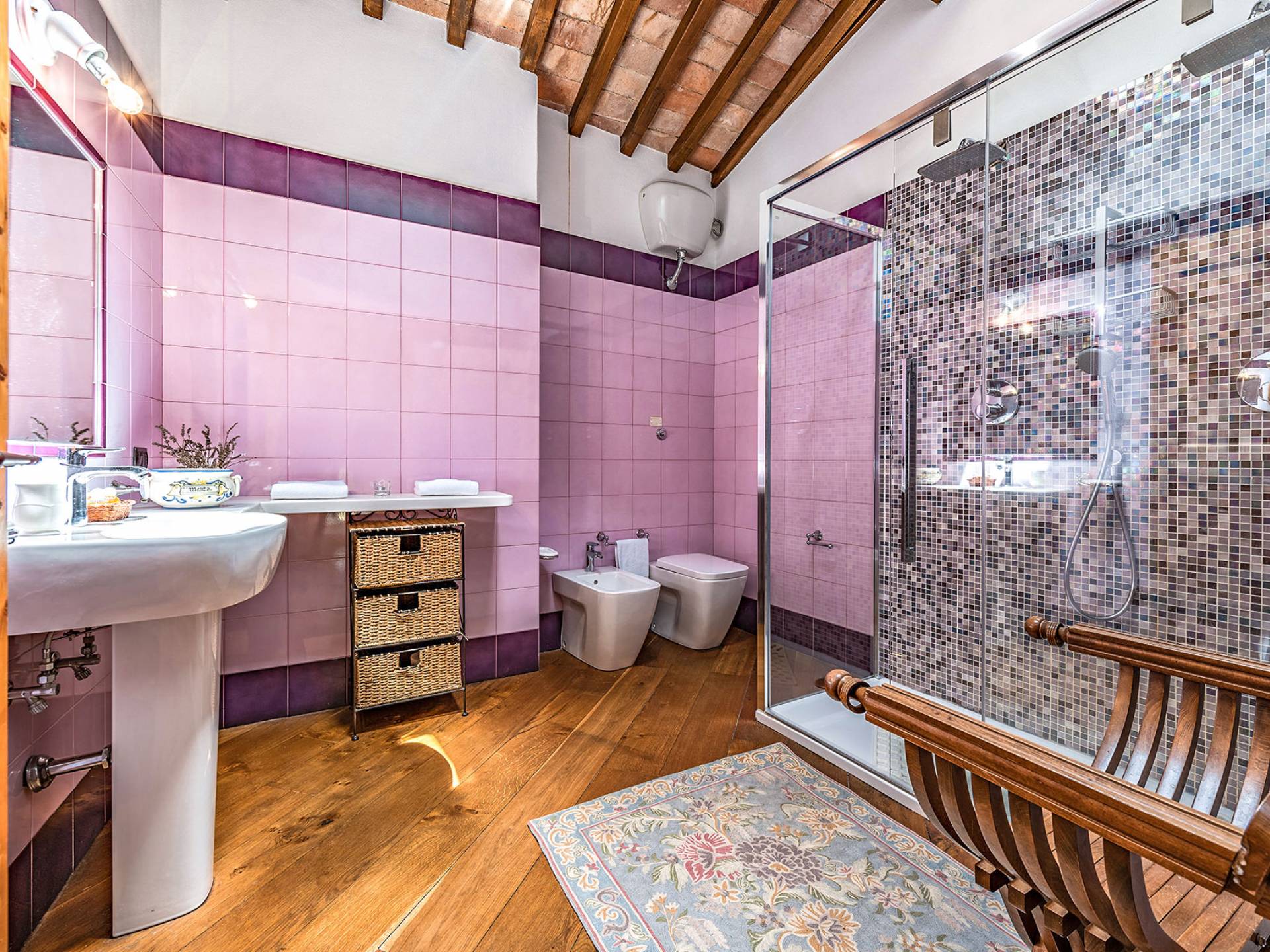 Alle Innenbereiche wurden mit modernen und klassischen, traditionellen toskanischen Stücken eingerichtet, die sich gut in die antiken „Cotto“ -Böden und die Deckenbalken einfügen. Die große Küche verfügt über einen Geschirrspüler, einen Herd und einen amerikanischen Doppelkühlschrank mit einem schönen Kamin.