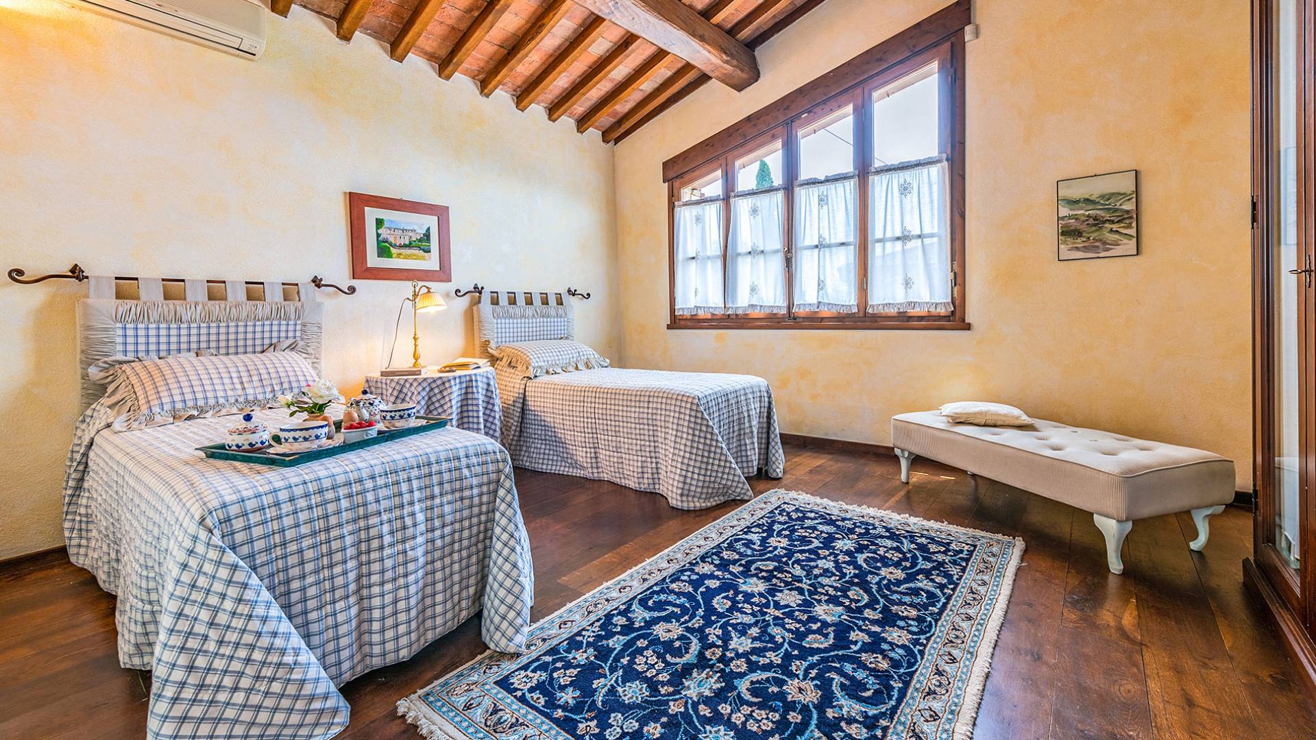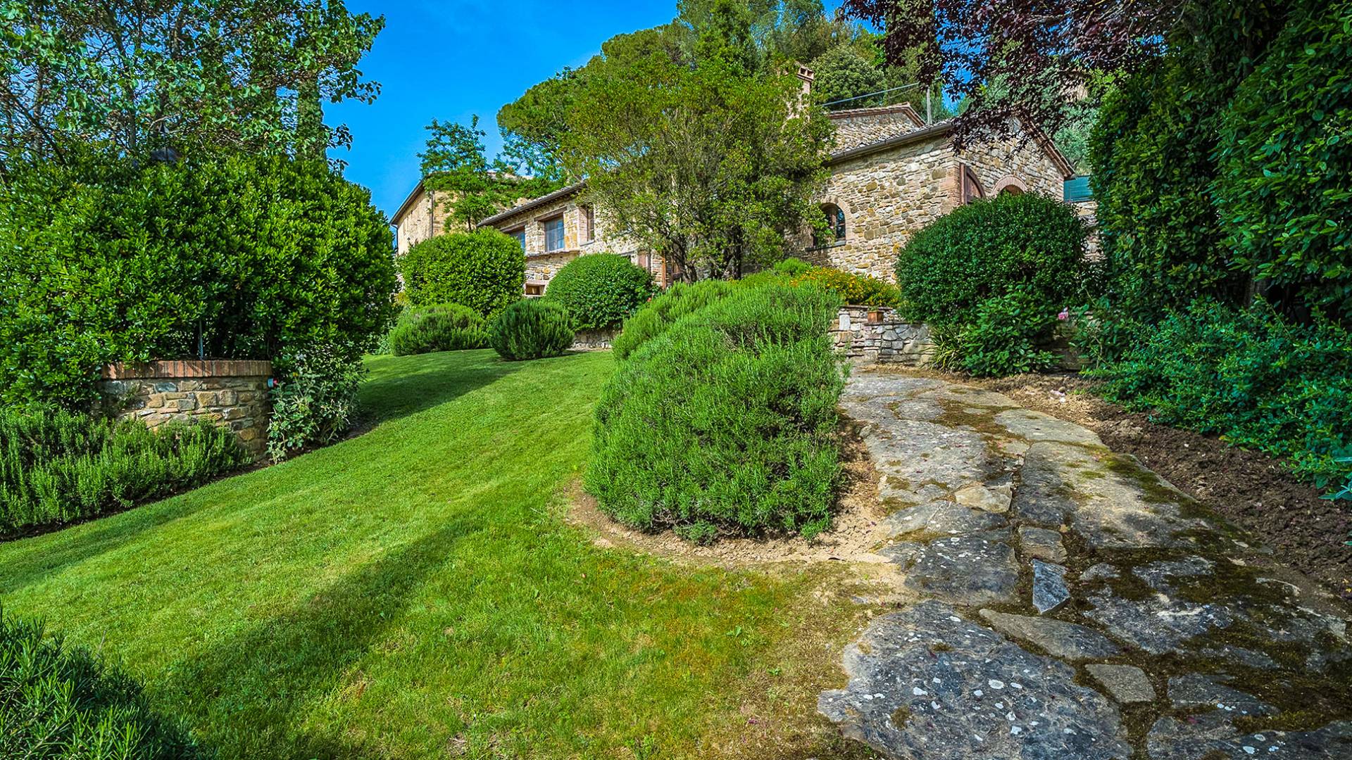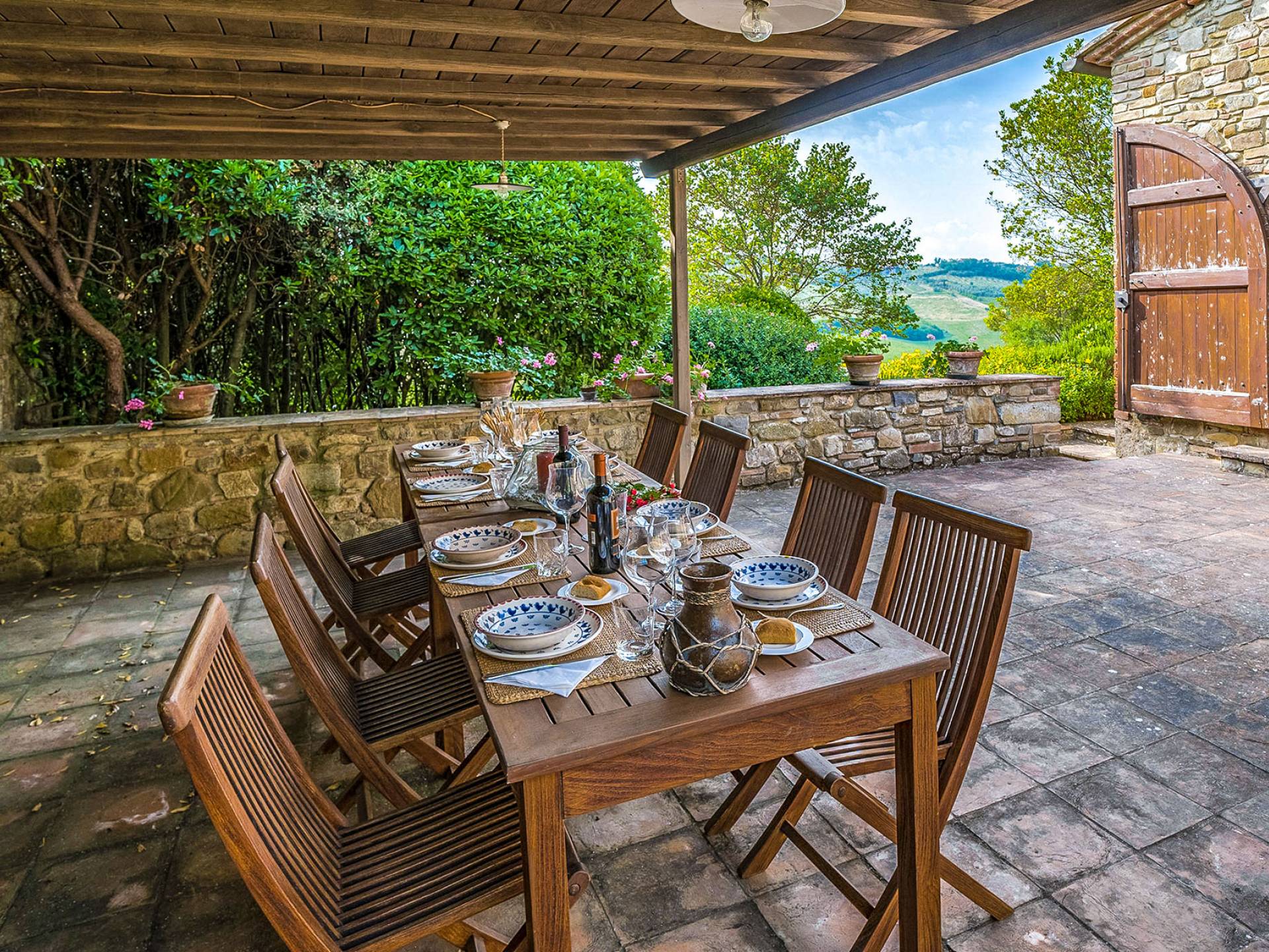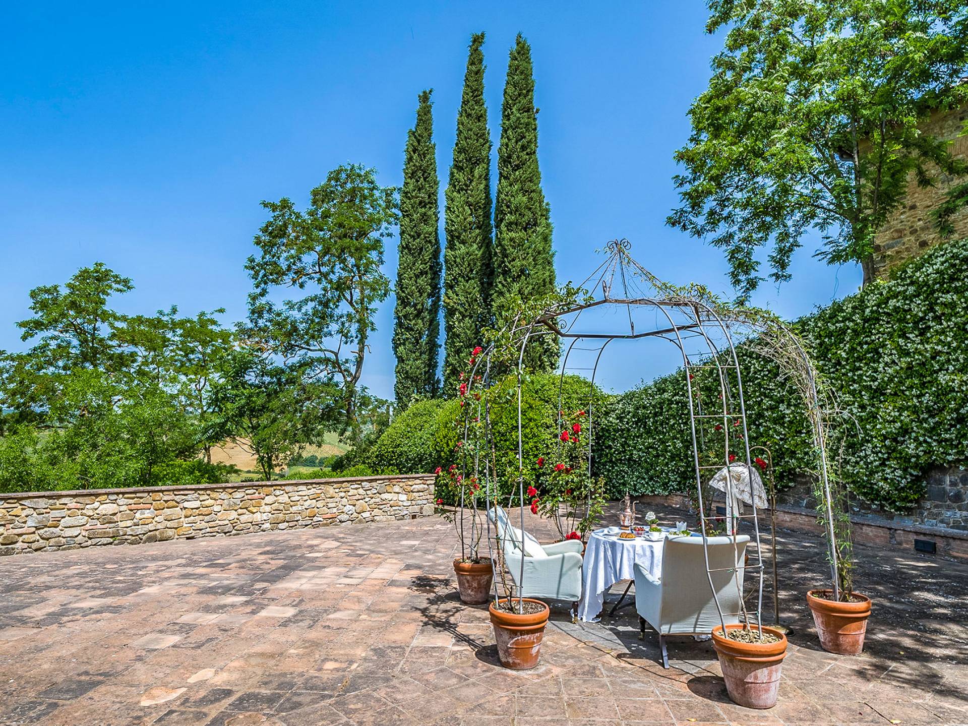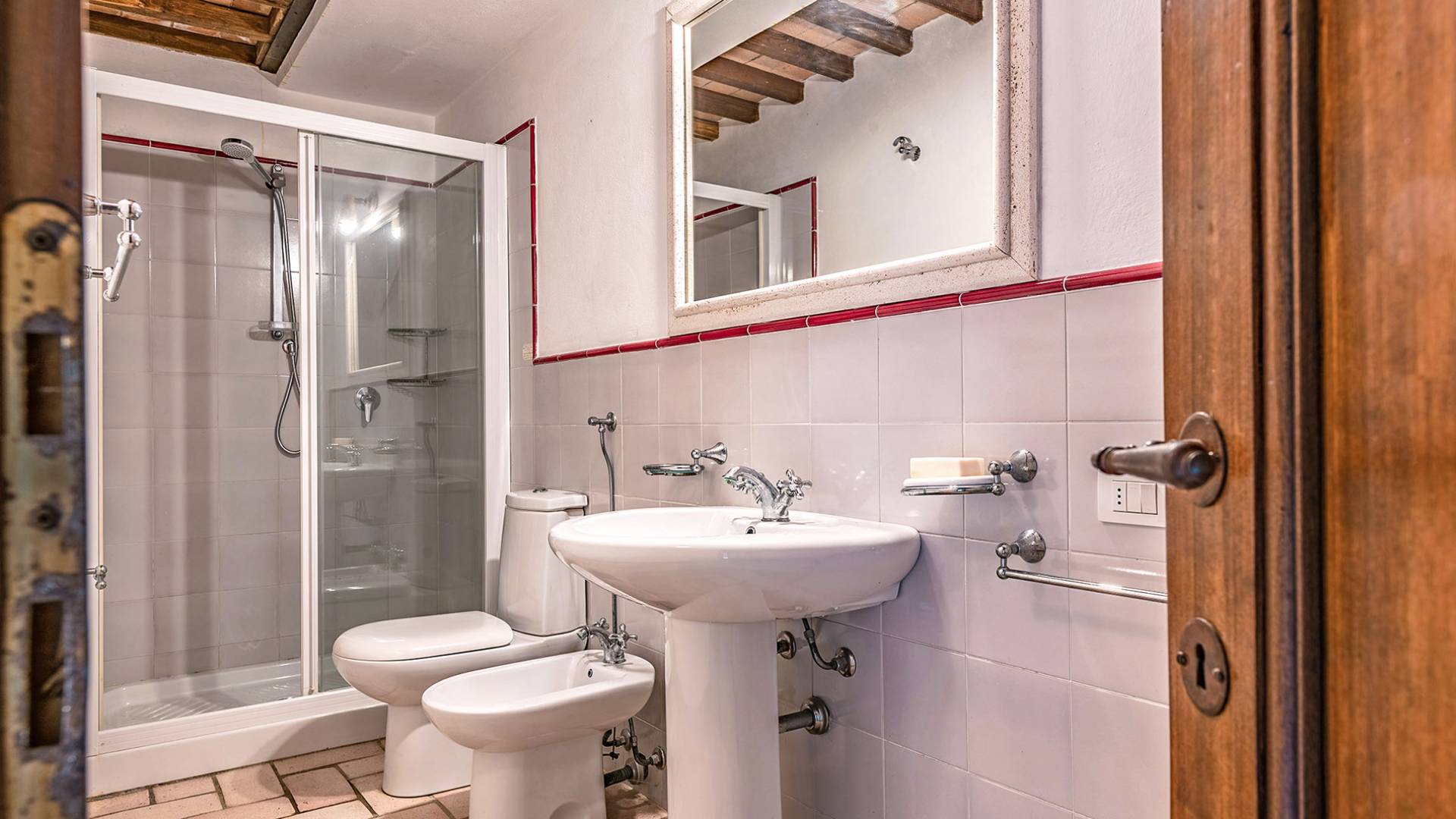Alle Innenbereiche wurden mit modernen und klassischen, traditionellen toskanischen Stücken eingerichtet, die sich gut in die antiken „Cotto“ -Böden und die Deckenbalken einfügen. Die große Küche verfügt über einen Geschirrspüler, einen Herd und einen amerikanischen Doppelkühlschrank mit einem schönen Kamin.