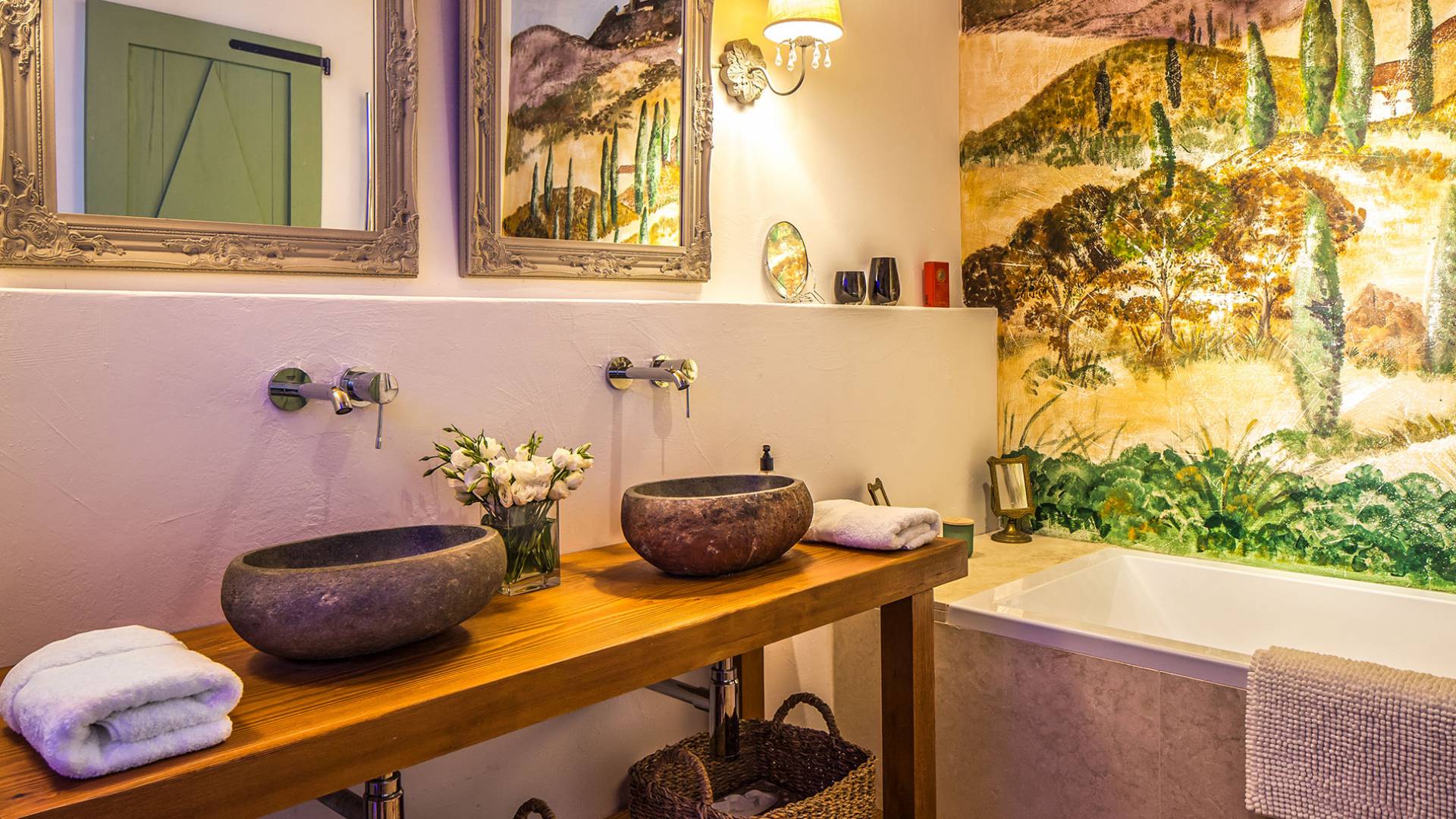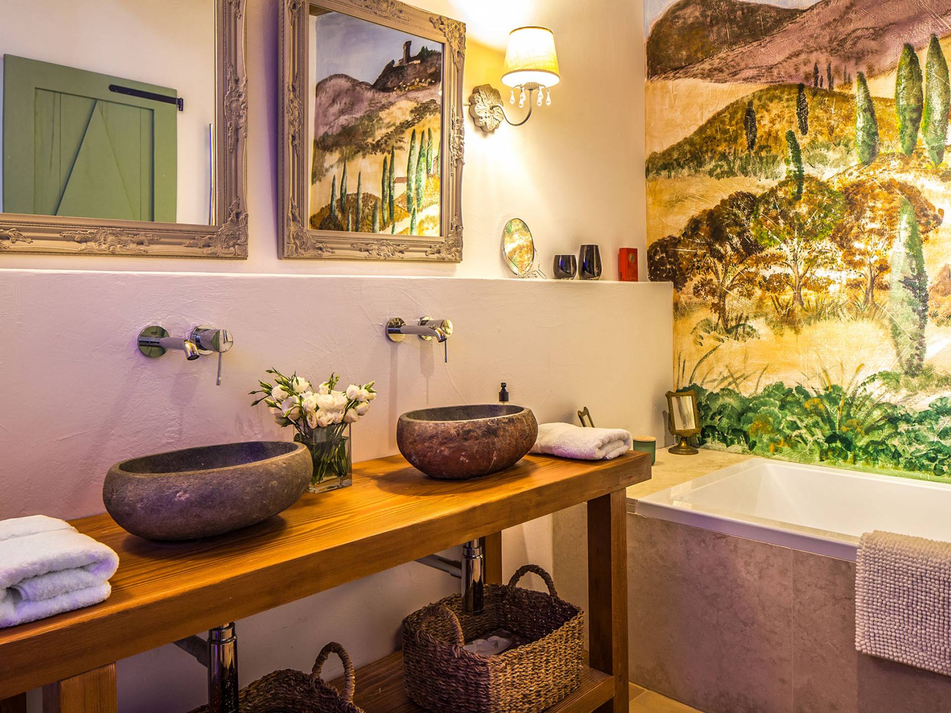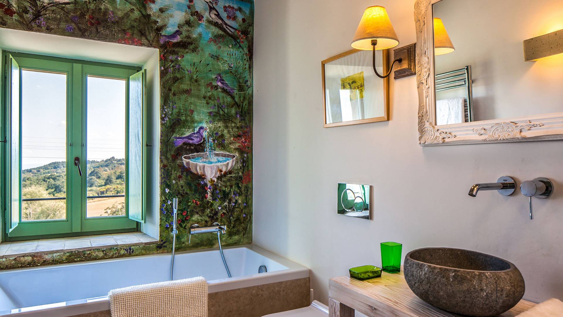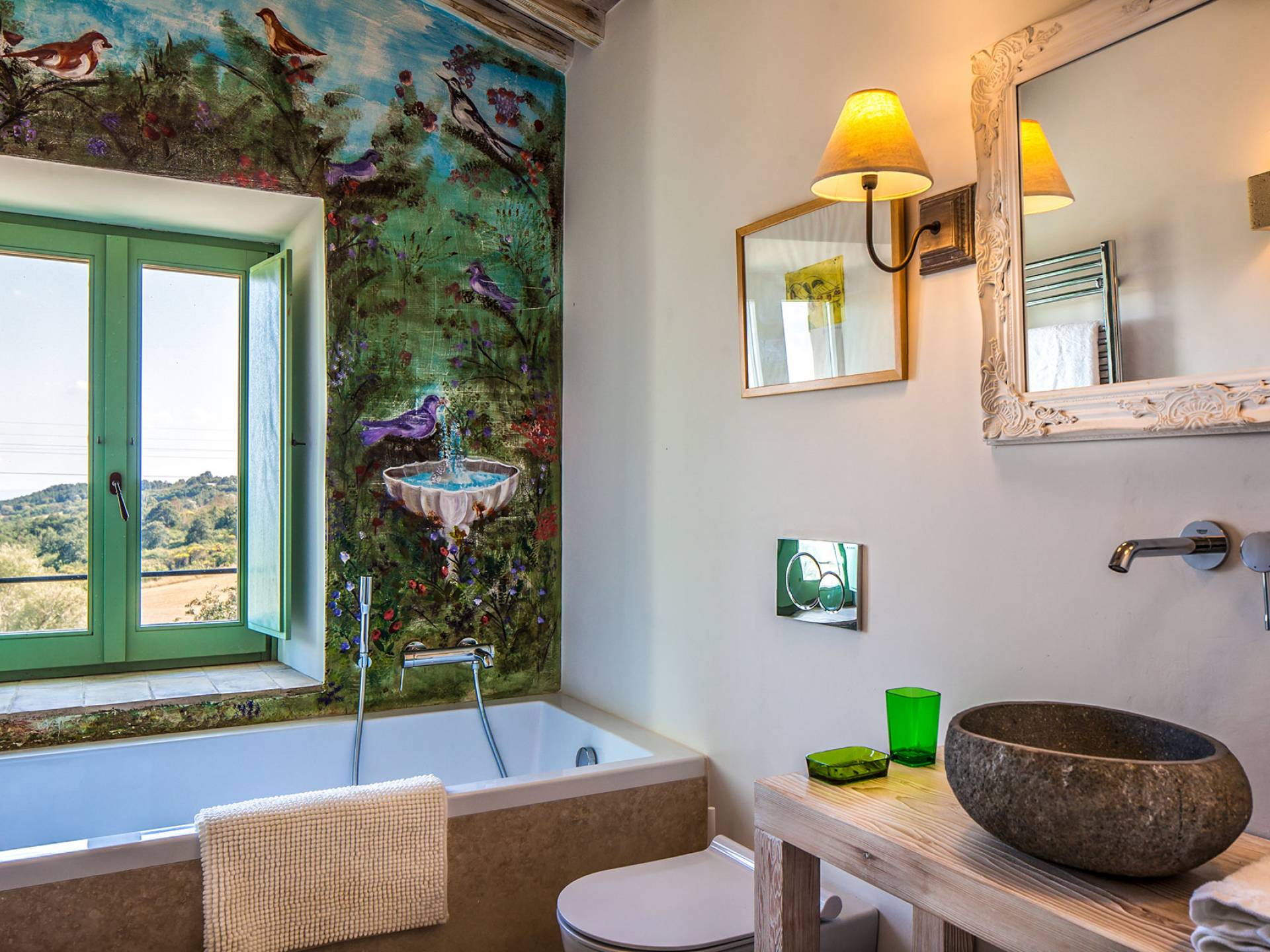 Jedes Zimmer hat ein eigenes Badezimmer mit einem modernen und eleganten Design, aber gleichzeitig mit Details im rustikalen Stil. Die Villa bietet Platz für maximal elf Personen. Die Villa hat direkten Zugang zu einem großen Garten mit Ruhebereichen und einer Veranda, um dem Gast einen Wohnbereich im Freien mit atemberaubender Aussicht zu bieten. Vom Garten aus gelangen die Gäste über einen kleinen Weg zu einem wunderschönen Infinity-Pool, der mit Sonnenliegen und Sonnenschirmen ausgestattet ist, um die Naturwunder der Landschaft in vollen Zügen zu genießen.