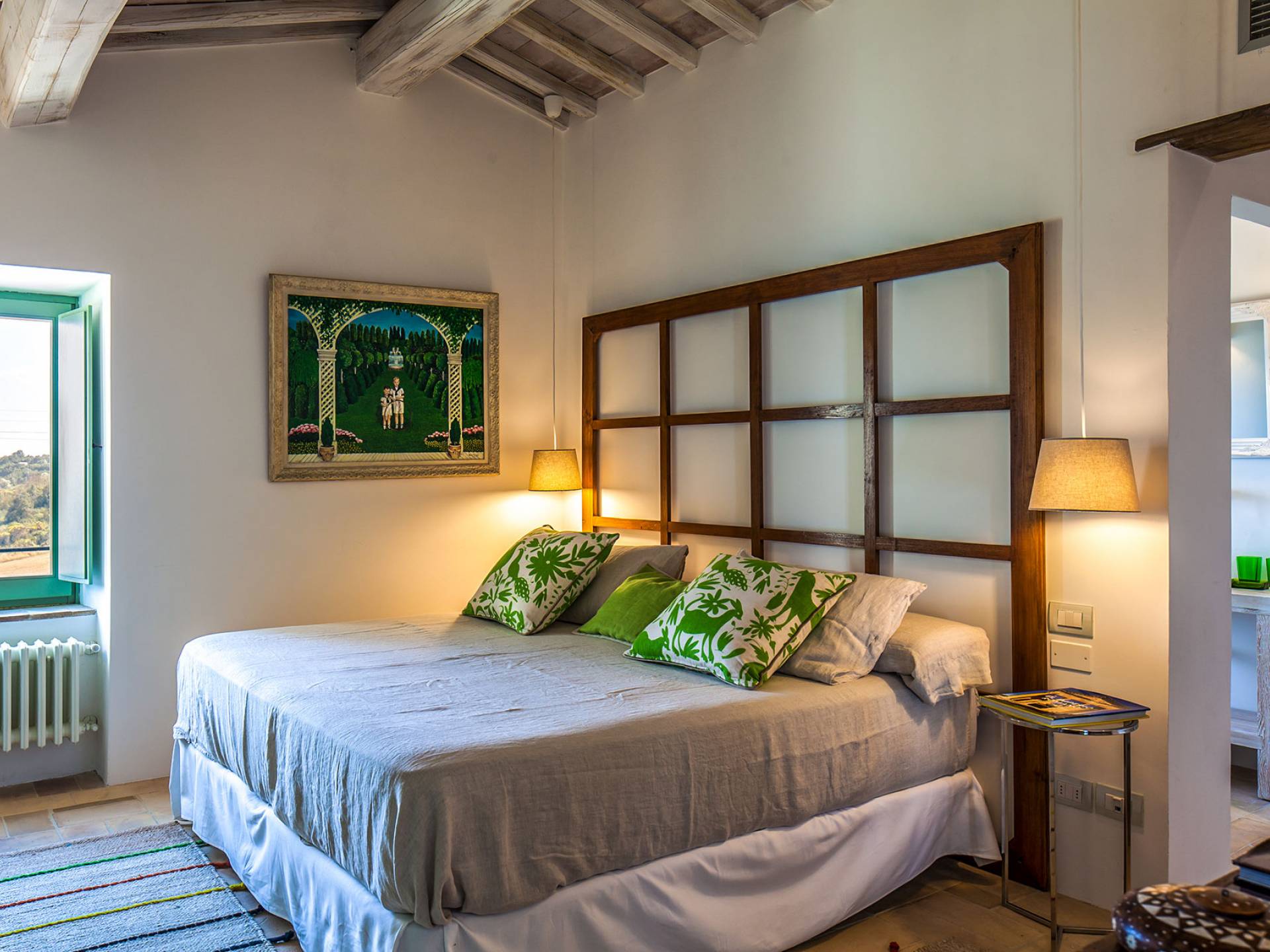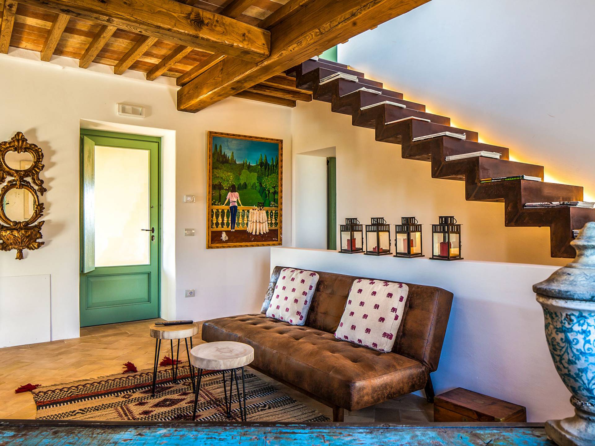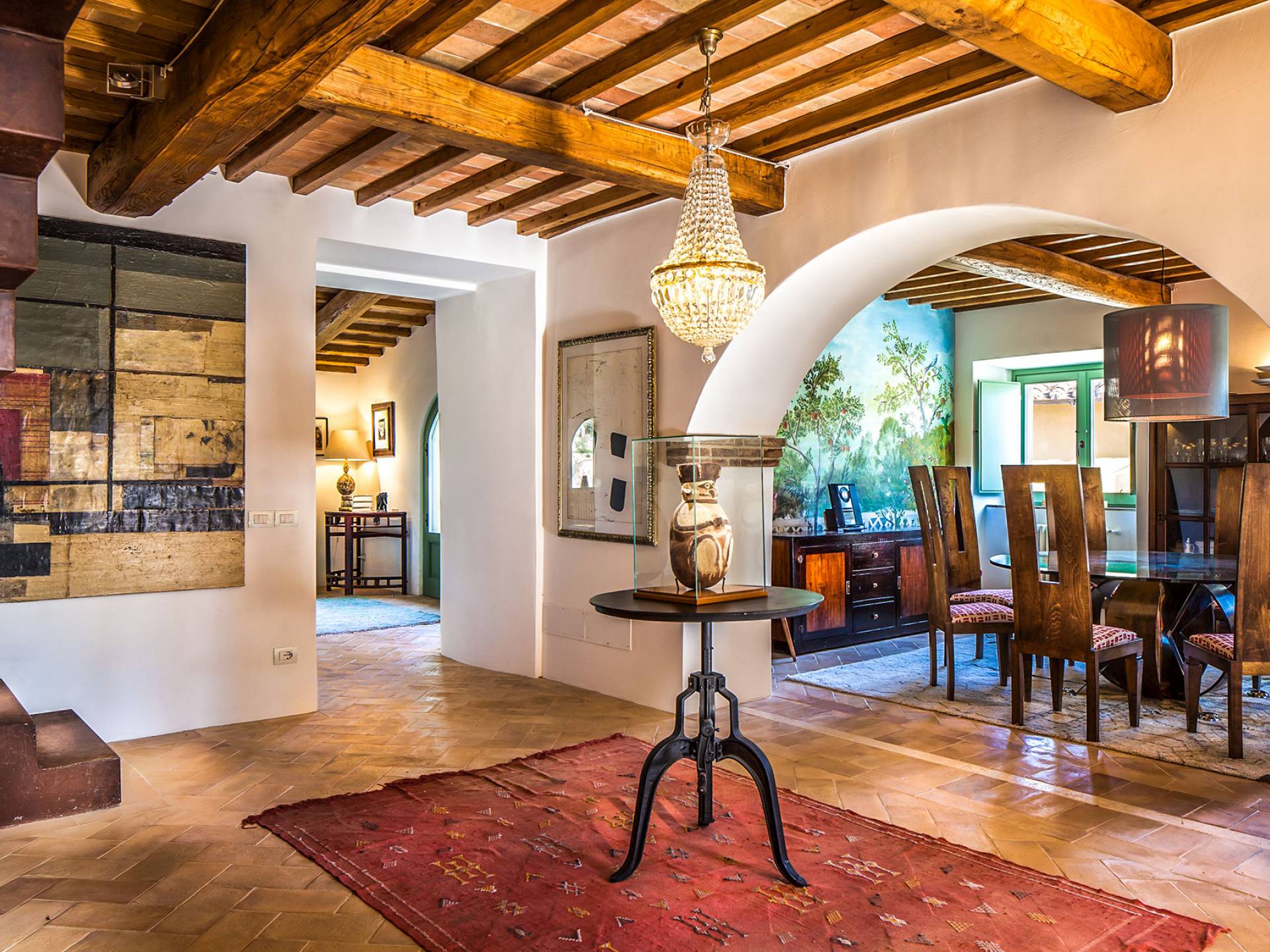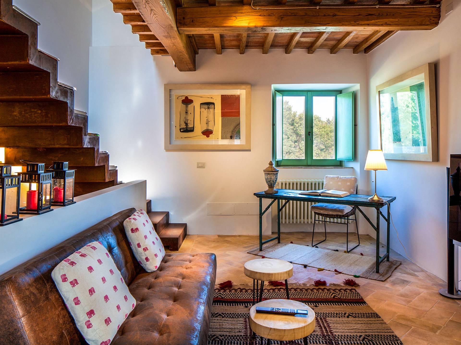 Die Innenräume sind sorgfältig raffiniert und jeder Bereich ist geschmackvoll und stilvoll eingerichtet. Der Wohnbereich zeichnet sich durch schöne Sichtbalken aus und ermöglicht den Zugang zu einer gemütlichen Lounge, in der Sie Abende in fröhlicher Gesellschaft verbringen können. Die Küche ist funktional und sehr einladend und zeichnet sich durch einen rustikalen Stil aus, der fast aus einer anderen Zeit stammt. Villa Tuscania Valdorcia verfügt über fünf Schlafzimmer auf den drei Etagen des Gebäudes. Vom Wohnbereich aus führt eine spektakuläre Holztreppe in modernem Design zu wunderschönen Schlafzimmern, die alle mit Fresken im bukolischen Stil geschmückt sind.