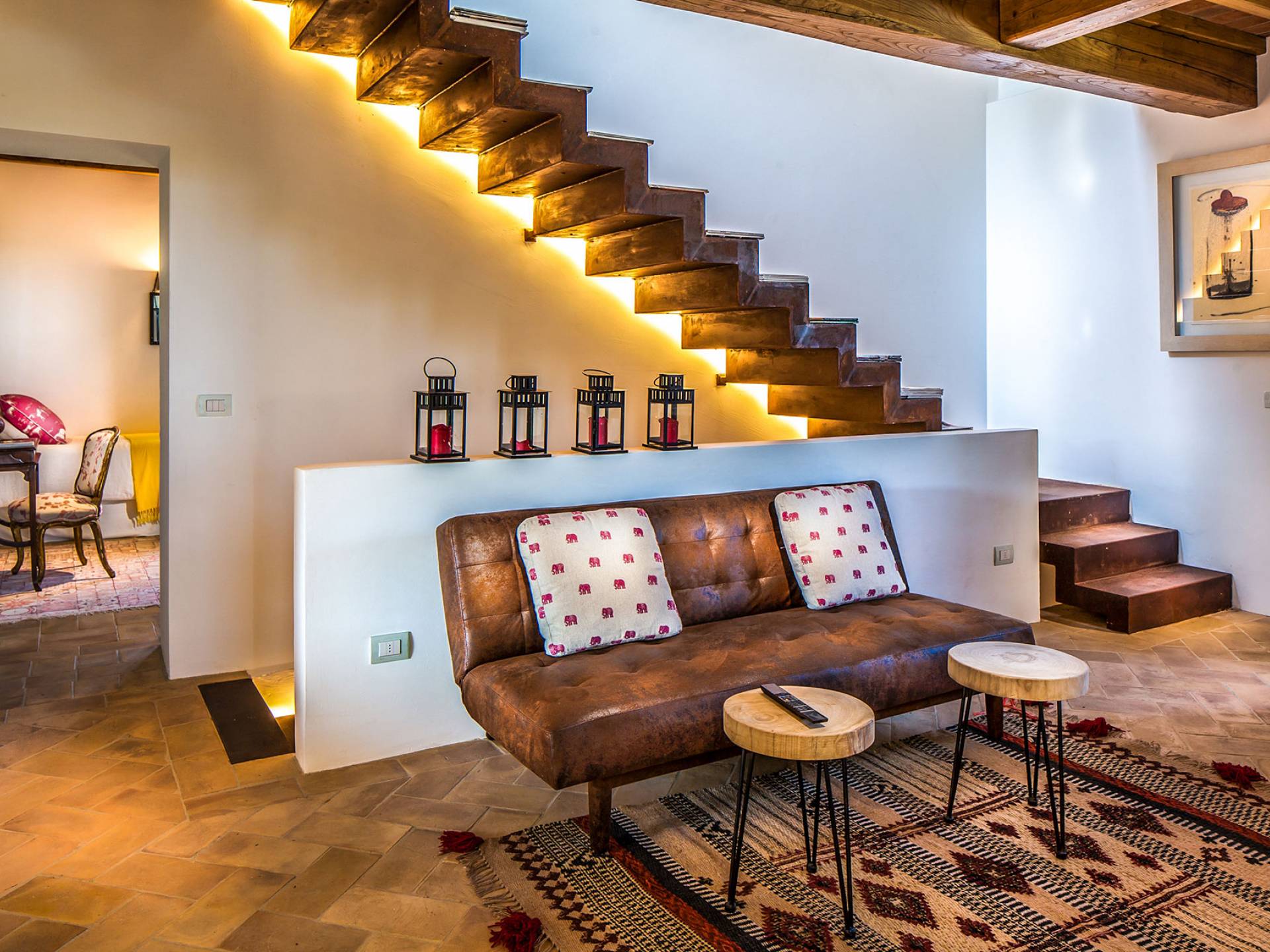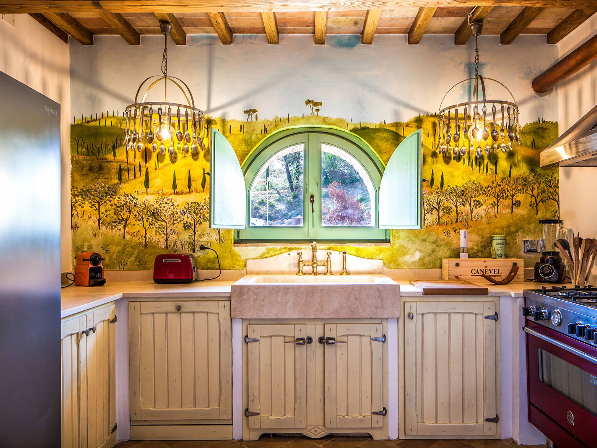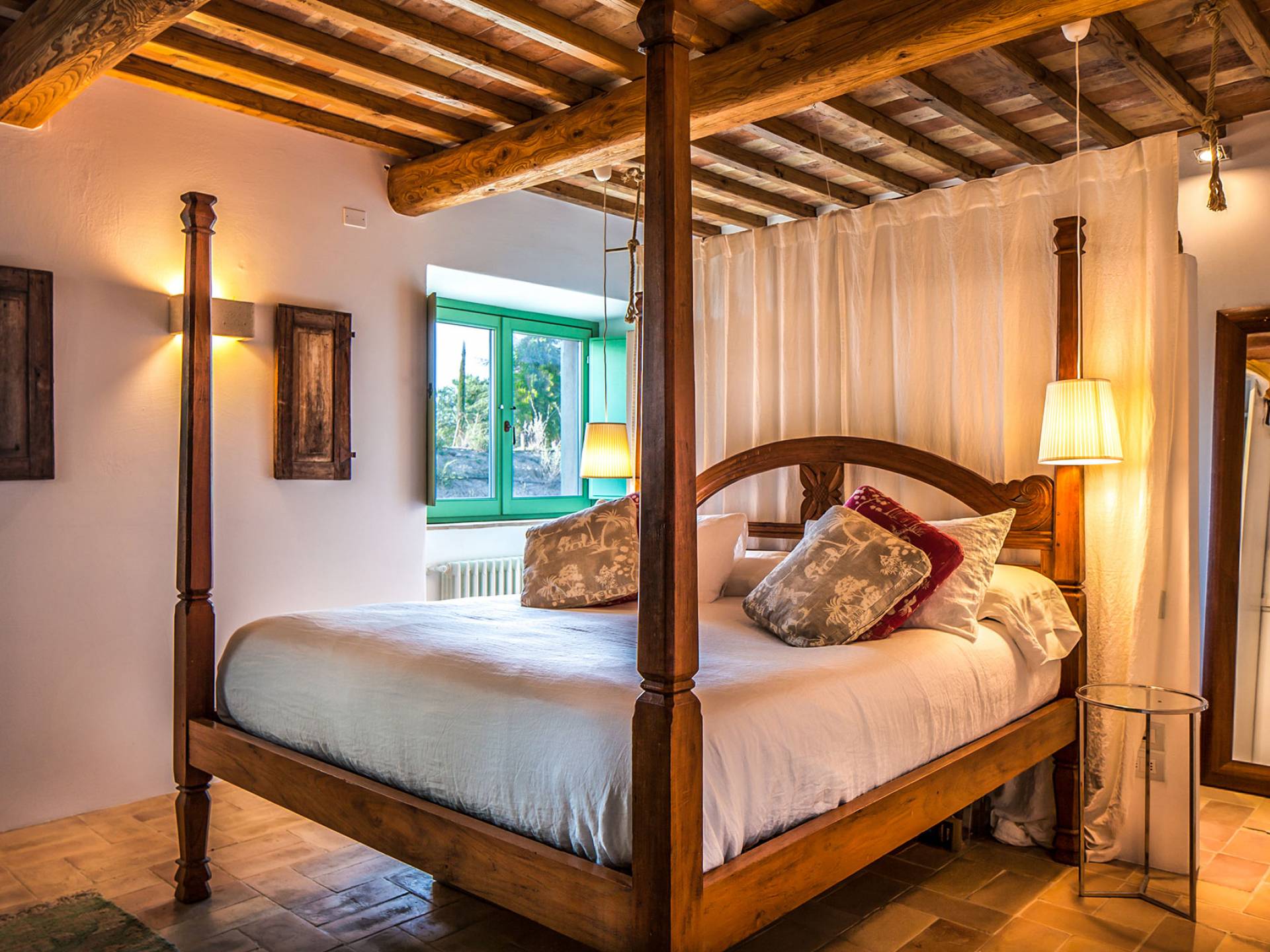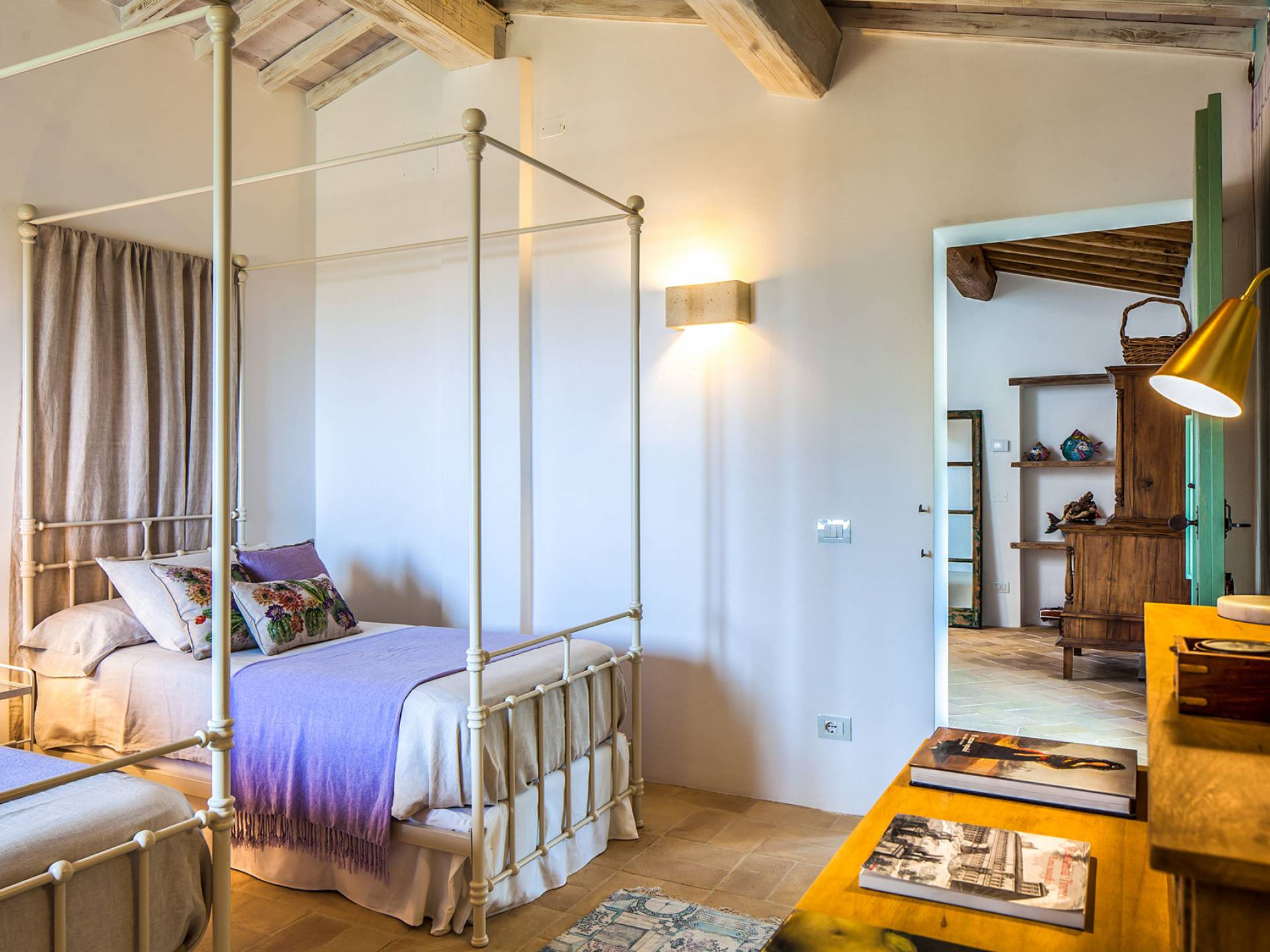 Die Innenräume sind sorgfältig raffiniert und jeder Bereich ist geschmackvoll und stilvoll eingerichtet. Der Wohnbereich zeichnet sich durch schöne Sichtbalken aus und ermöglicht den Zugang zu einer gemütlichen Lounge, in der Sie Abende in fröhlicher Gesellschaft verbringen können. Die Küche ist funktional und sehr einladend und zeichnet sich durch einen rustikalen Stil aus, der fast aus einer anderen Zeit stammt. Villa Tuscania Valdorcia verfügt über fünf Schlafzimmer auf den drei Etagen des Gebäudes. Vom Wohnbereich aus führt eine spektakuläre Holztreppe in modernem Design zu wunderschönen Schlafzimmern, die alle mit Fresken im bukolischen Stil geschmückt sind.