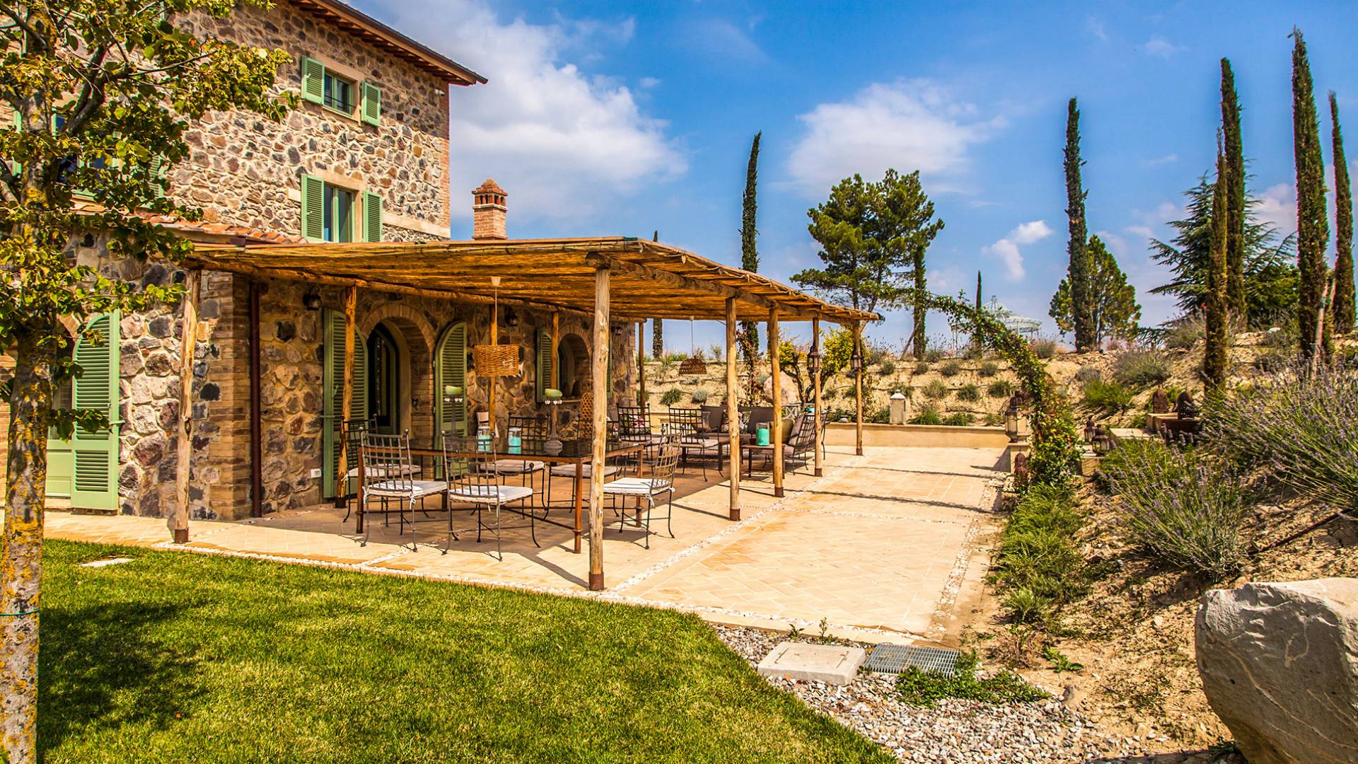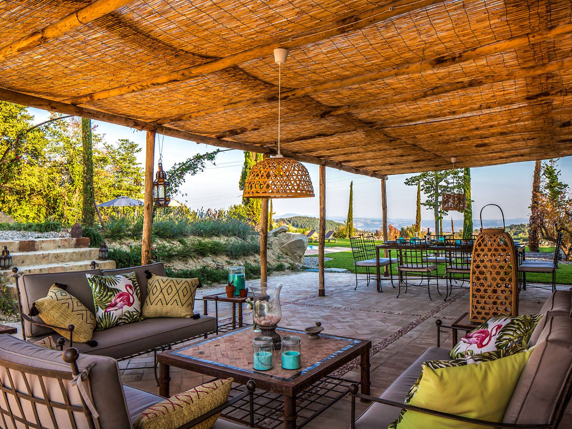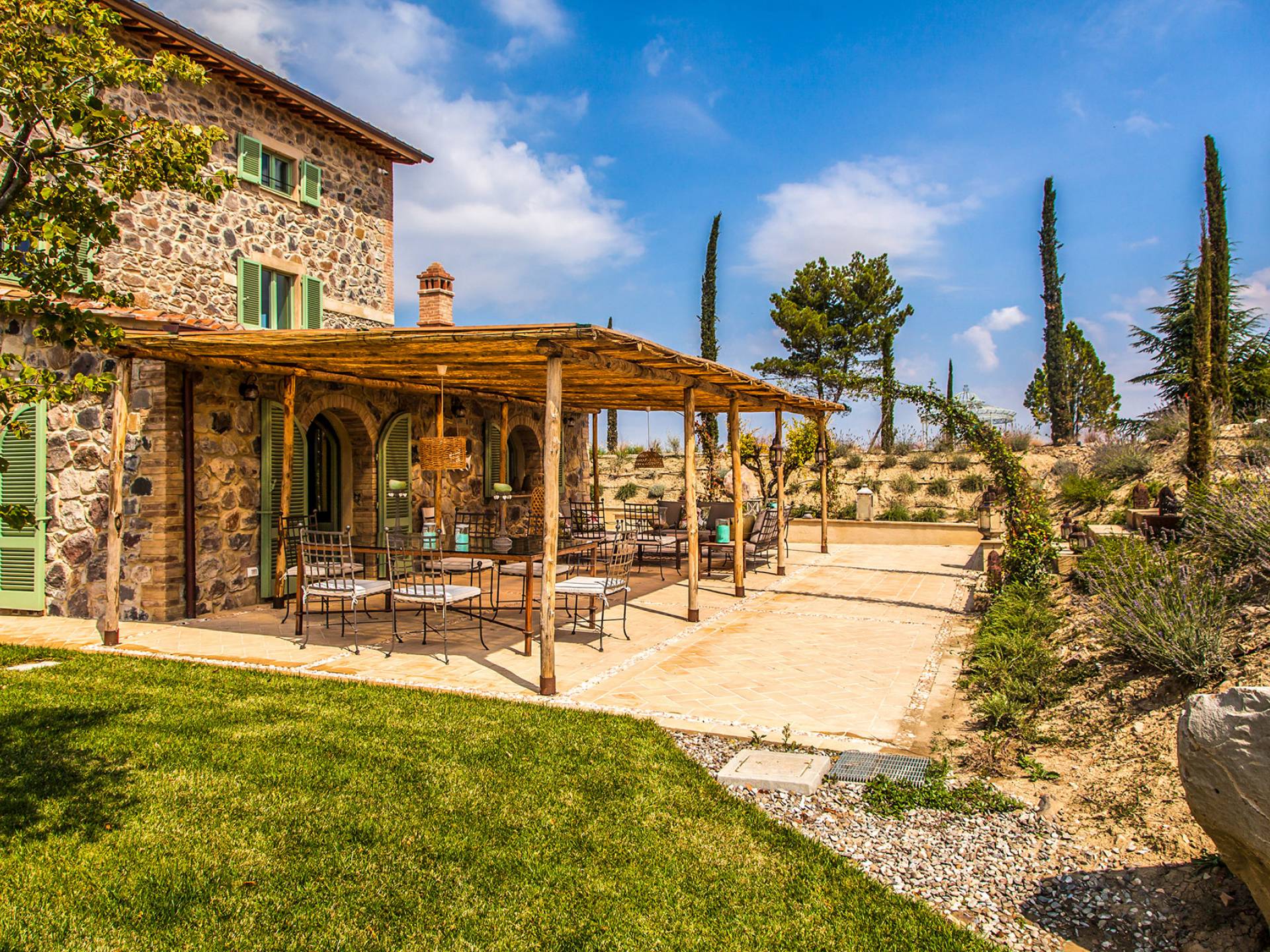 Außerhalb der Villa finden Sie eine schöne Pergola mit Tischen und Stühlen, um an Sommerabenden die kühle Brise der toskanischen Landschaft zu genießen. Die Villa Tuscania kann als wahres Juwel im Herzen des Val D’Orcia betrachtet werden. In Gehweite können die Gäste das charakteristische Radicofani besuchen, das von Dante in der Göttlichen Komödie und von Boccaccio im Decameron erwähnt wird.