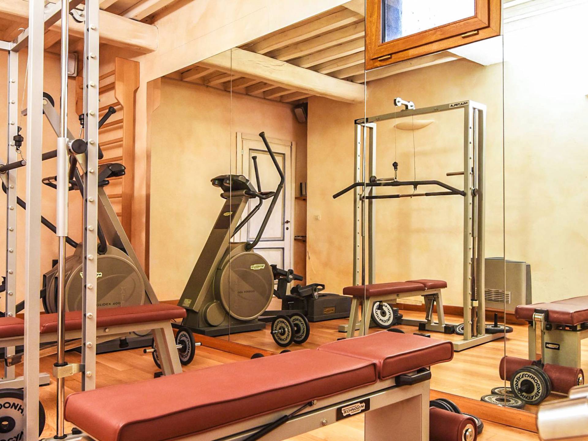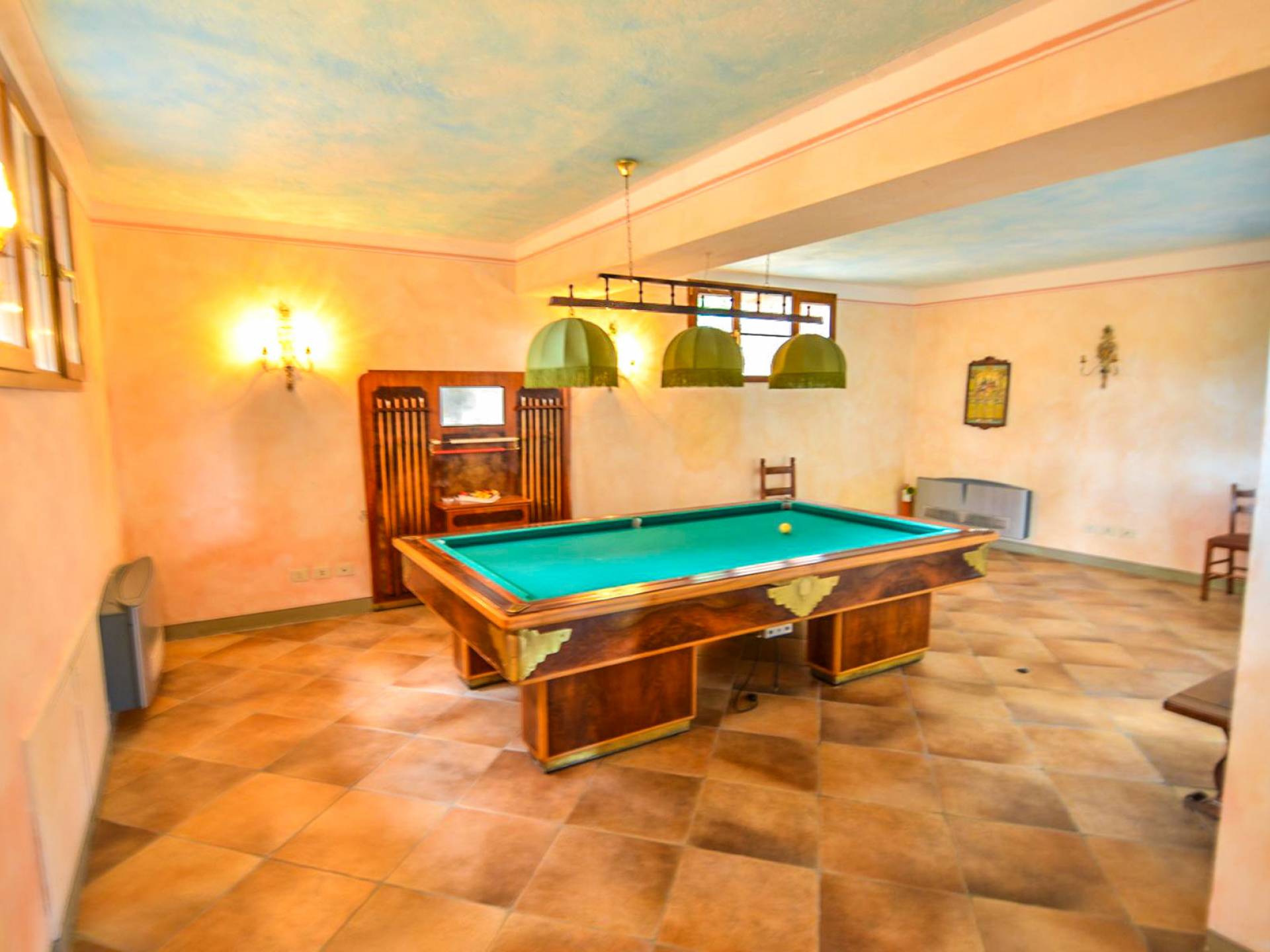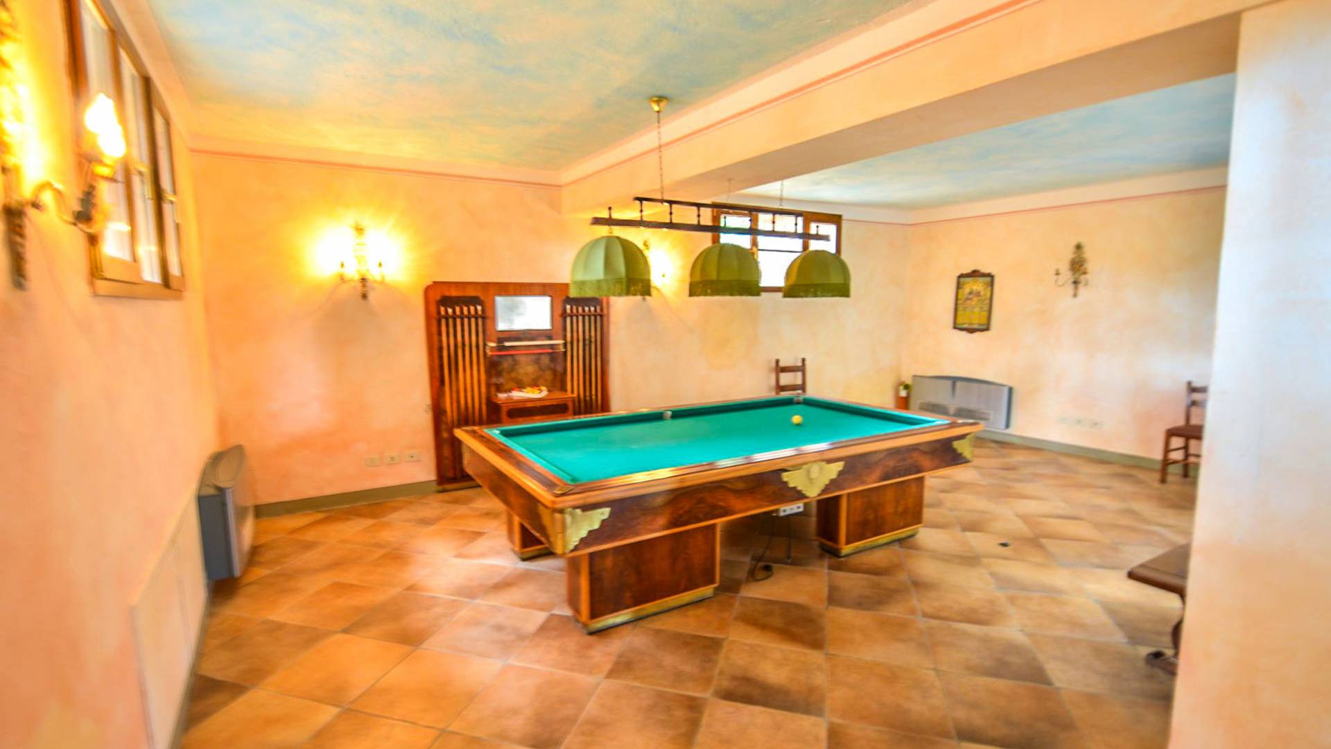 Im Erdgeschoss finden Sie eine große Unterhaltungslounge mit Sofas mit rustikalem Dekor, Fernseher, HiFi-Anlage und Spieltischen sowie einen Nebenraum für Dinnerpartys und einen Billardtisch. Es gibt auch ein Dampfbad und eine angeschlossene Entspannungszone im Innen- und Außenbereich. Schließlich finden Sie einen voll ausgestatteten Fitnessraum von technogym, zwei Badezimmer und eine Umkleidekabine.