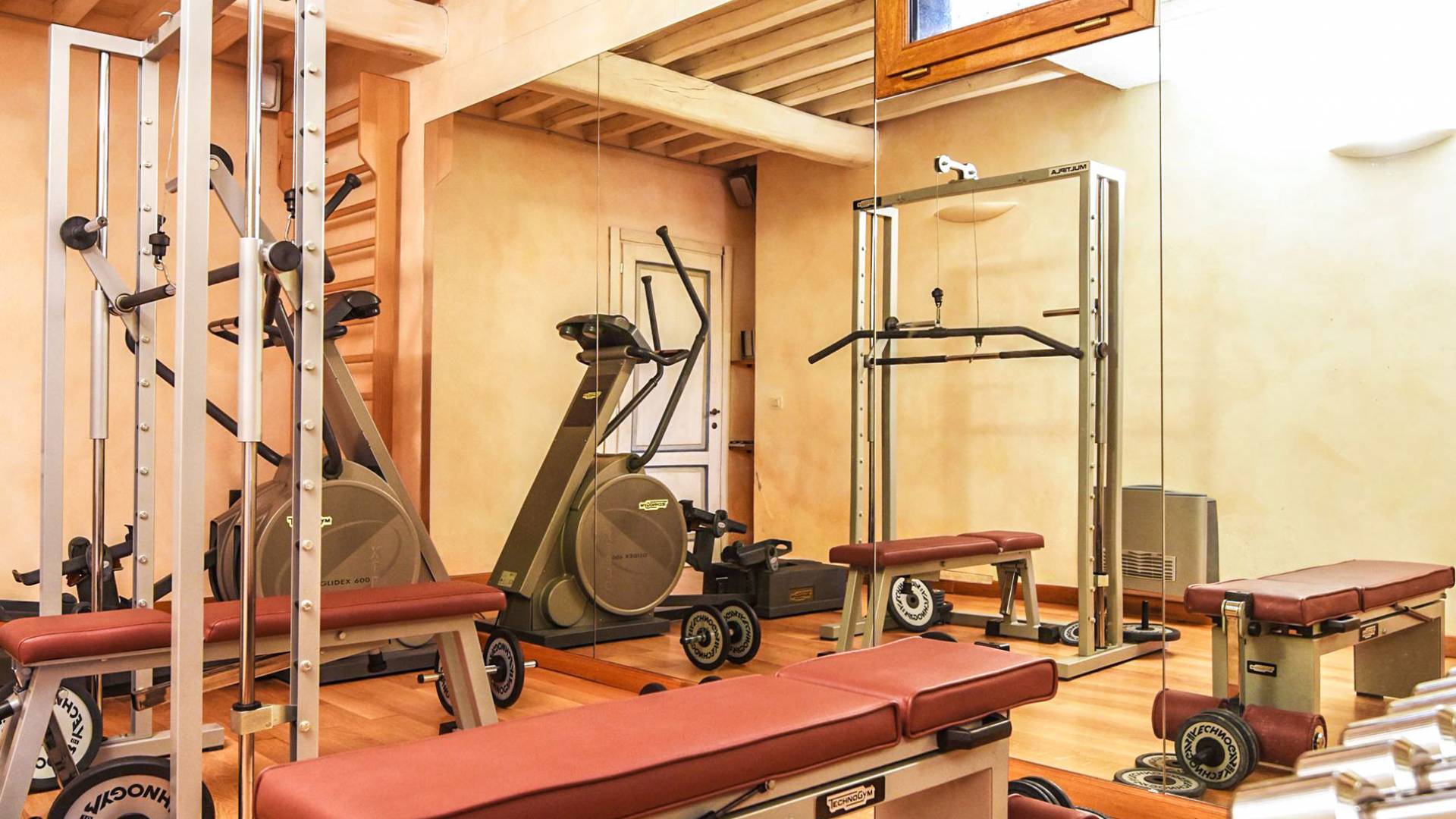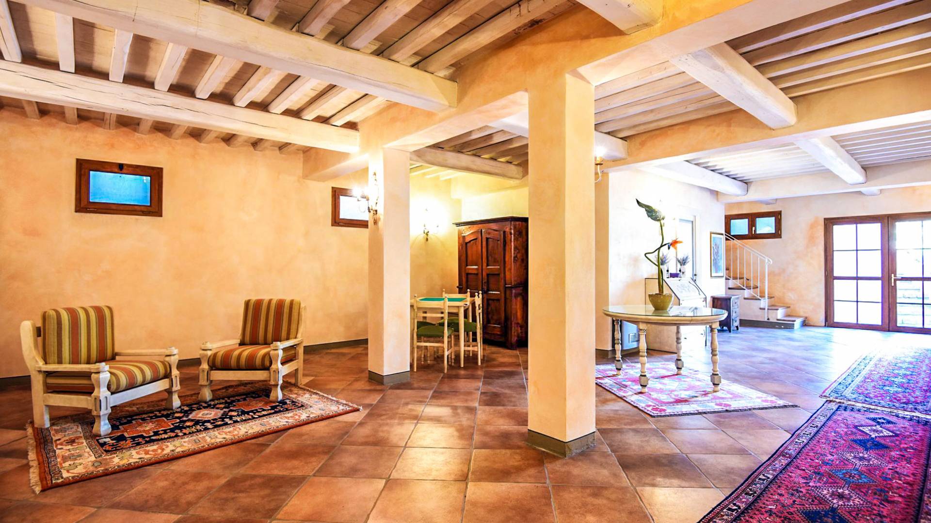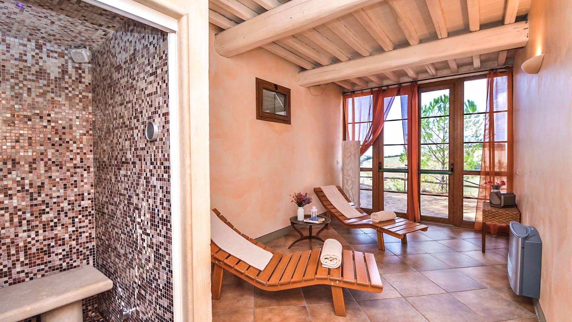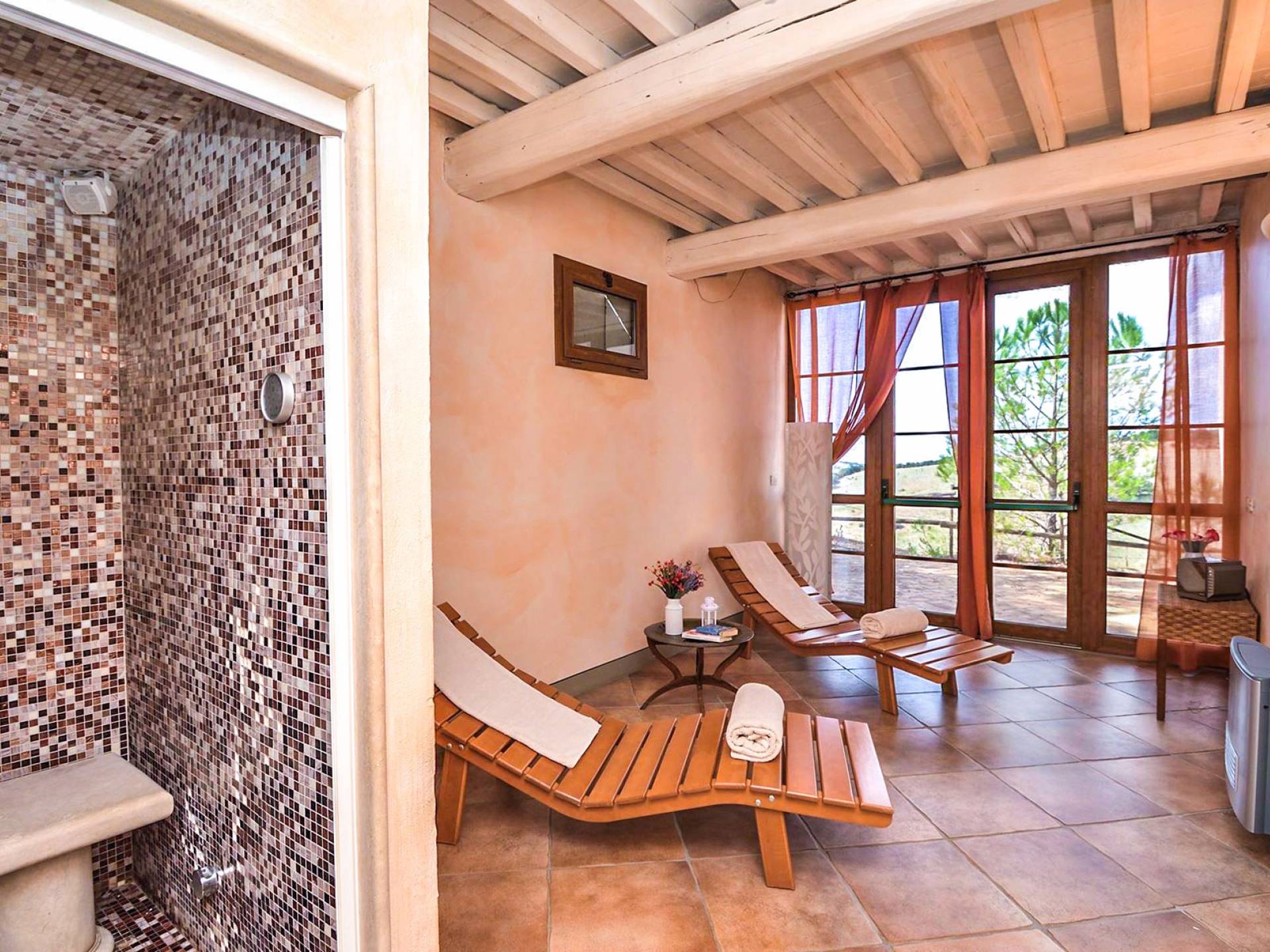 Im Erdgeschoss finden Sie eine große Unterhaltungslounge mit Sofas mit rustikalem Dekor, Fernseher, HiFi-Anlage und Spieltischen sowie einen Nebenraum für Dinnerpartys und einen Billardtisch. Es gibt auch ein Dampfbad und eine angeschlossene Entspannungszone im Innen- und Außenbereich. Schließlich finden Sie einen voll ausgestatteten Fitnessraum von technogym, zwei Badezimmer und eine Umkleidekabine.