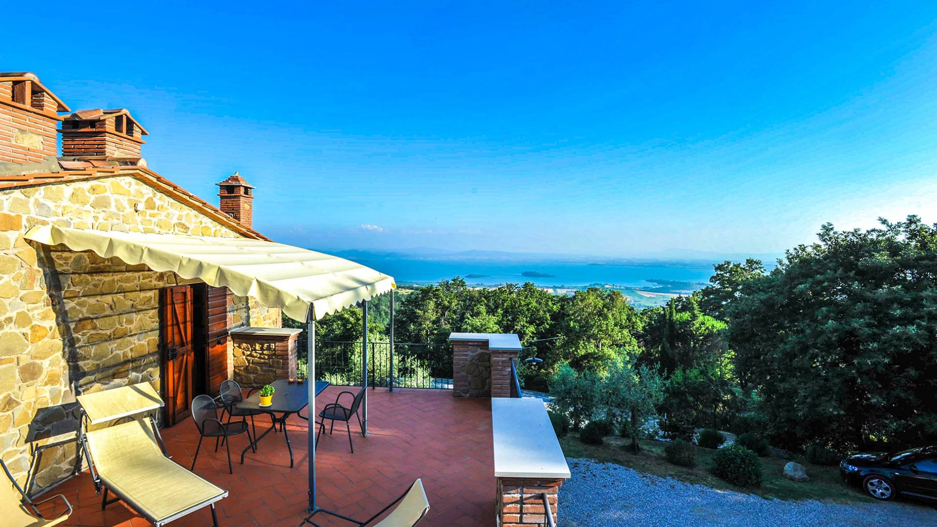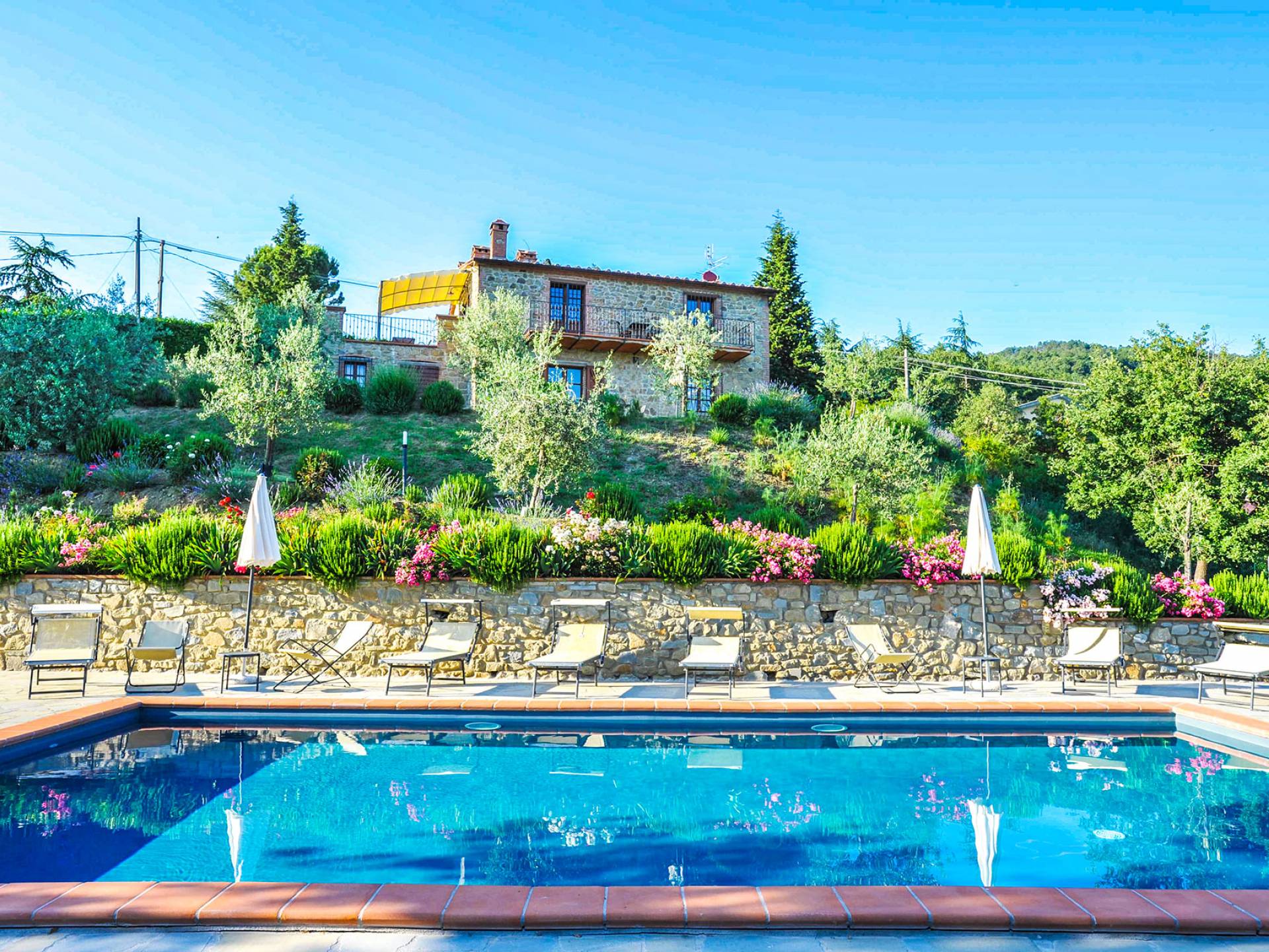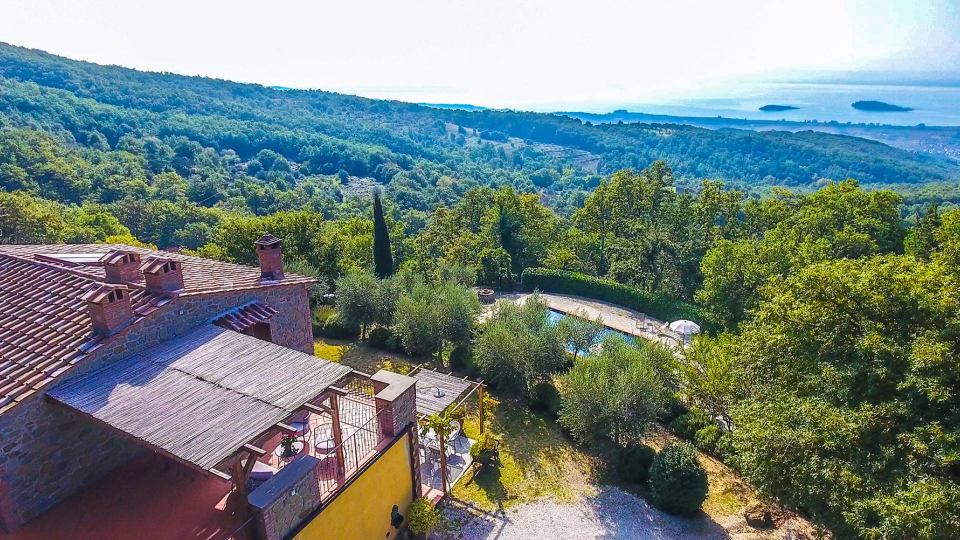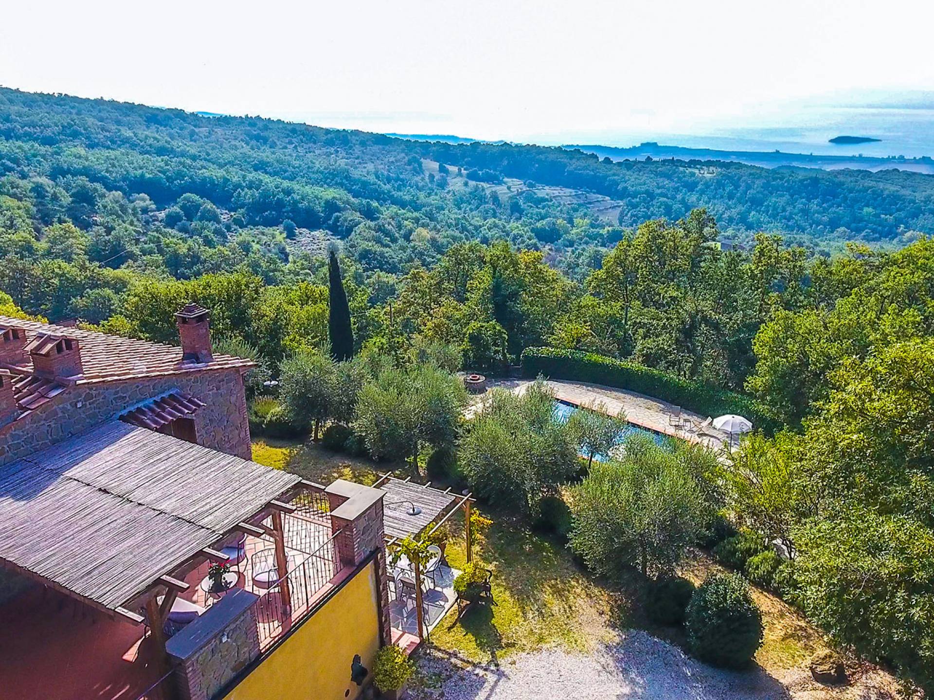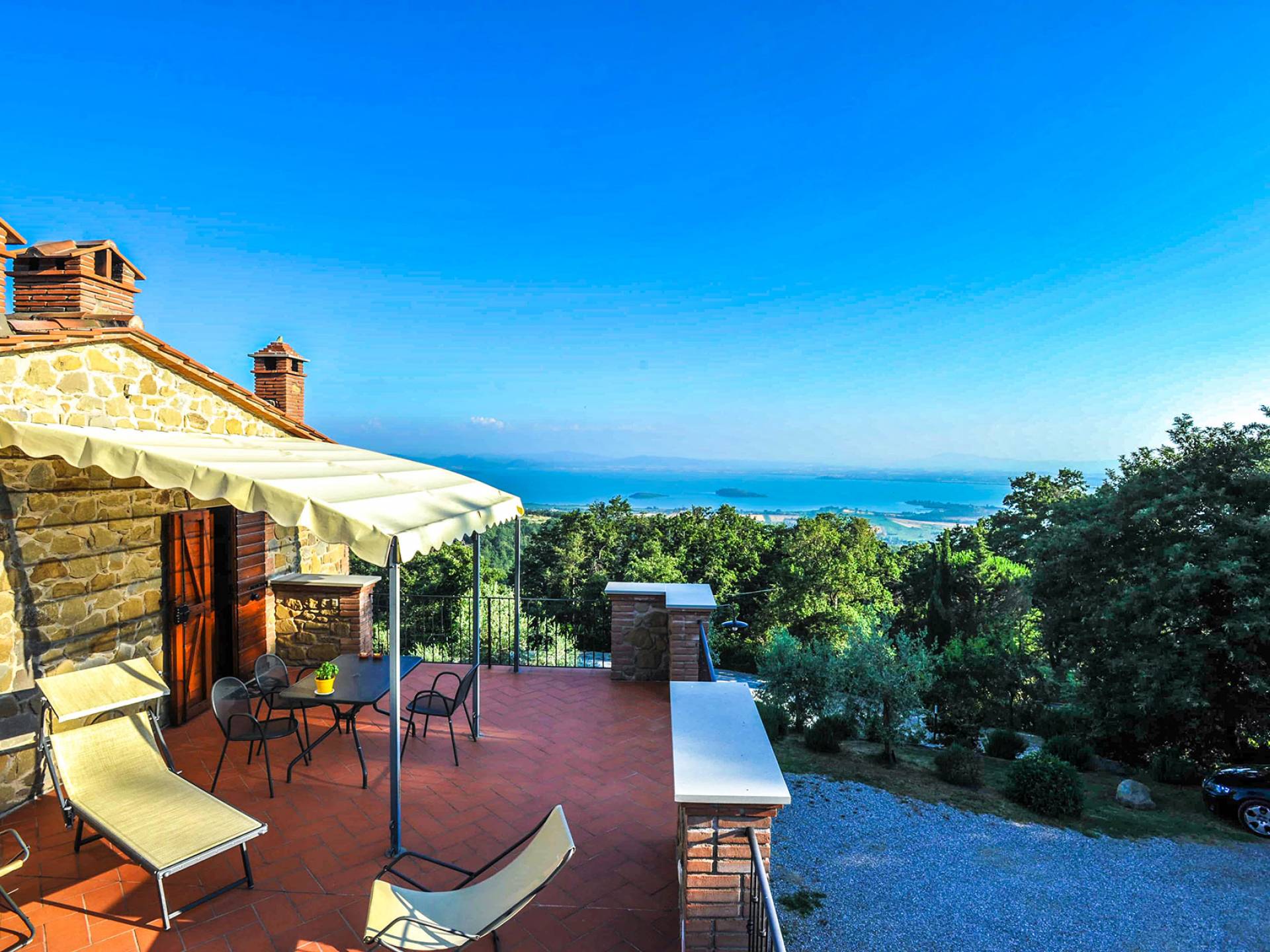 Villa Antonella Umbria ist eine Luxusvilla mit 5 Schlafzimmern und einem privaten Pool. Mit ihrem wunderbaren Blick auf den Trasimenischen See lässt die Villa Antonella ihre Gäste in einem Traum leben. An der Grenze zwischen der Toskana und Umbrien gelegen, ist das Anwesen von einem 4.000 Quadratmeter großen Garten mit Infinity-Außenpool und Sonnenterrasse umgeben. Seine 5 Zimmer und 3 Badezimmer verteilen sich auf zwei sehr schön eingerichtete Apartments im Landhaus-Chic, die alle mit einem Flachbild-TV, kostenlosem WLAN ausgestattet sind. Jedes von ihnen verfügt über einen eigenen Eingang und ein Badezimmer mit kostenlosen Pflegeprodukten und einem Haartrockner.