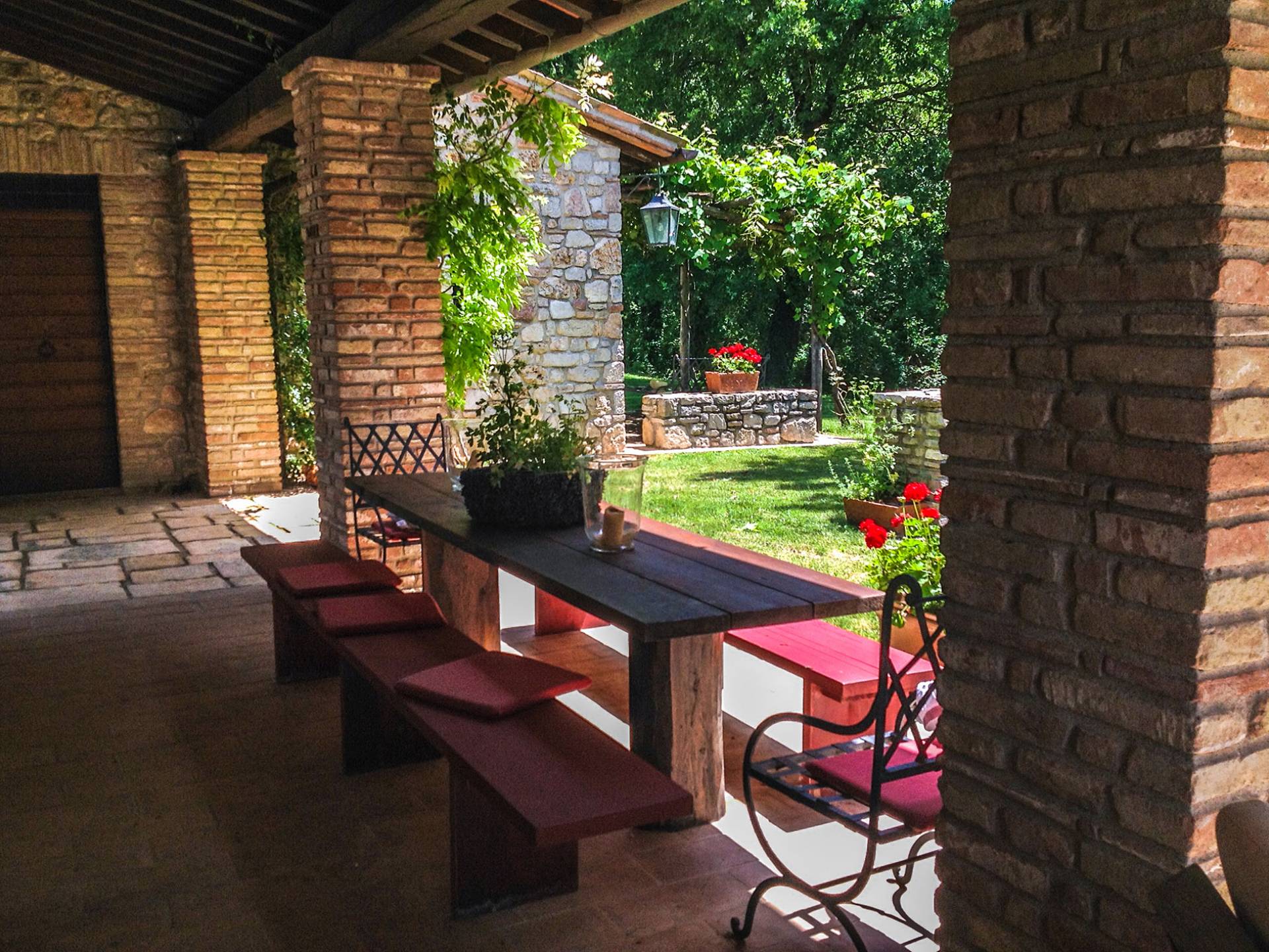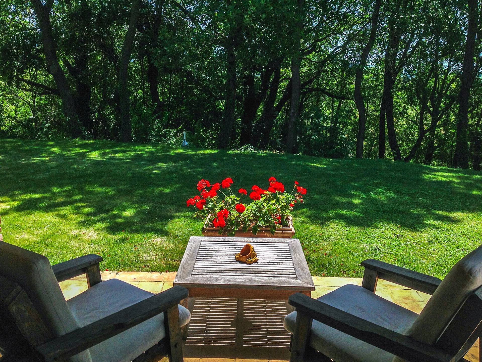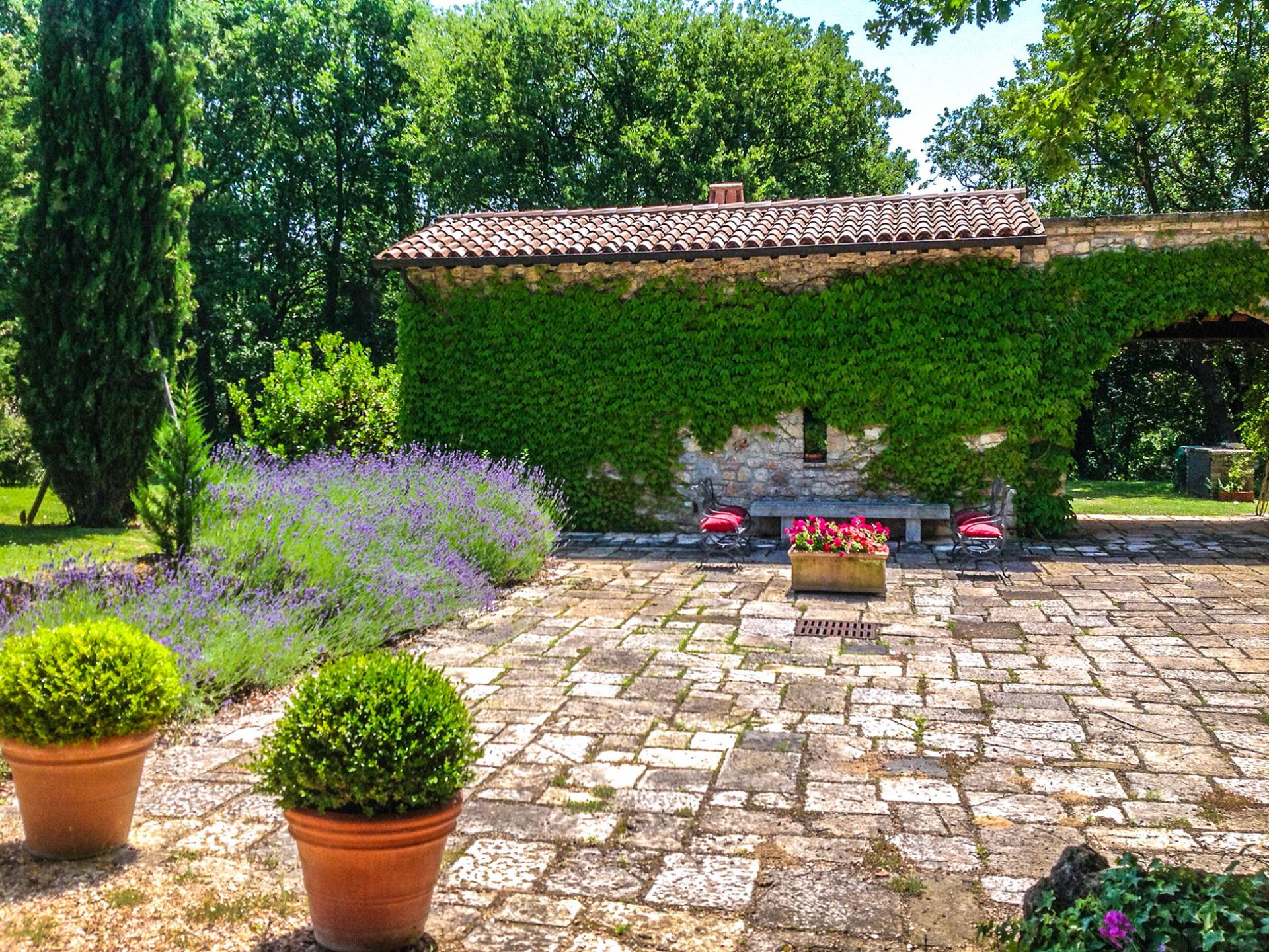 Die Strukturen, alle aus Stein, fügen sich perfekt in den Park und den Pool ein, die Teil dieses sehr privaten Anwesens sind und in absoluter Entspannung genossen werden können. Das Haus wurde von den Eigentümern geschmackvoll mit Antiquitäten und Landhausmöbeln eingerichtet und ist von einem 10.000 Quadratmeter großen Garten mit Oliven- und Obstbäumen und einem 6 × 12 m großen Panorama-Swimmingpool umgeben.
