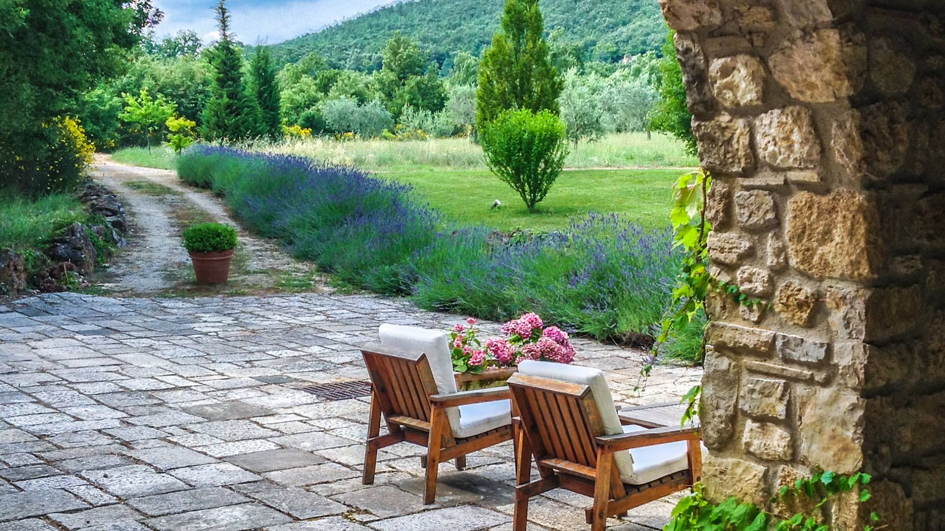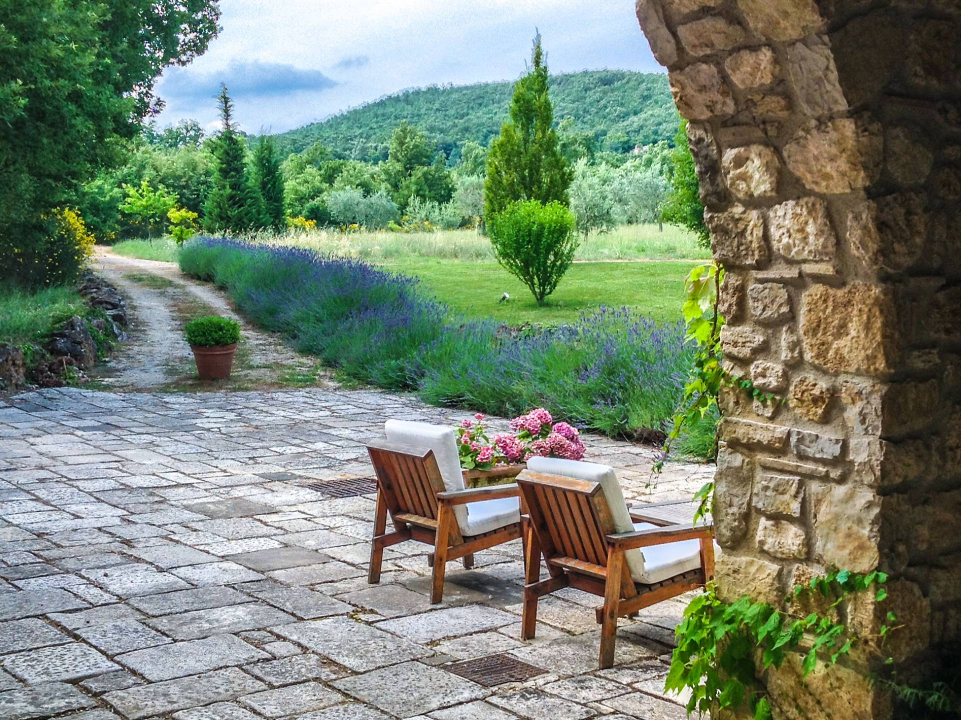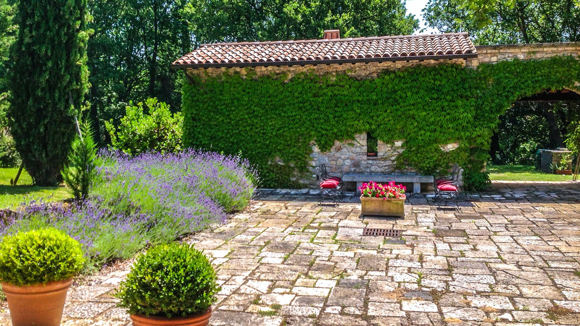 Die Strukturen, alle aus Stein, fügen sich perfekt in den Park und den Pool ein, die Teil dieses sehr privaten Anwesens sind und in absoluter Entspannung genossen werden können. Das Haus wurde von den Eigentümern geschmackvoll mit Antiquitäten und Landhausmöbeln eingerichtet und ist von einem 10.000 Quadratmeter großen Garten mit Oliven- und Obstbäumen und einem 6 × 12 m großen Panorama-Swimmingpool umgeben.