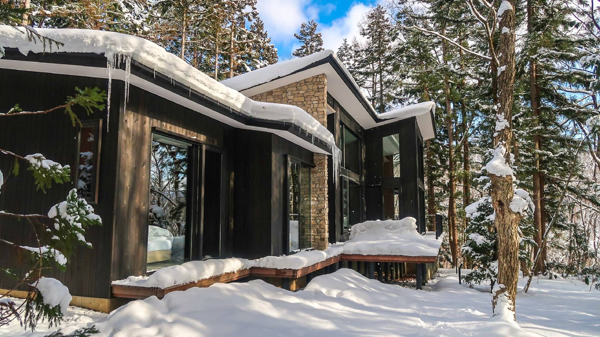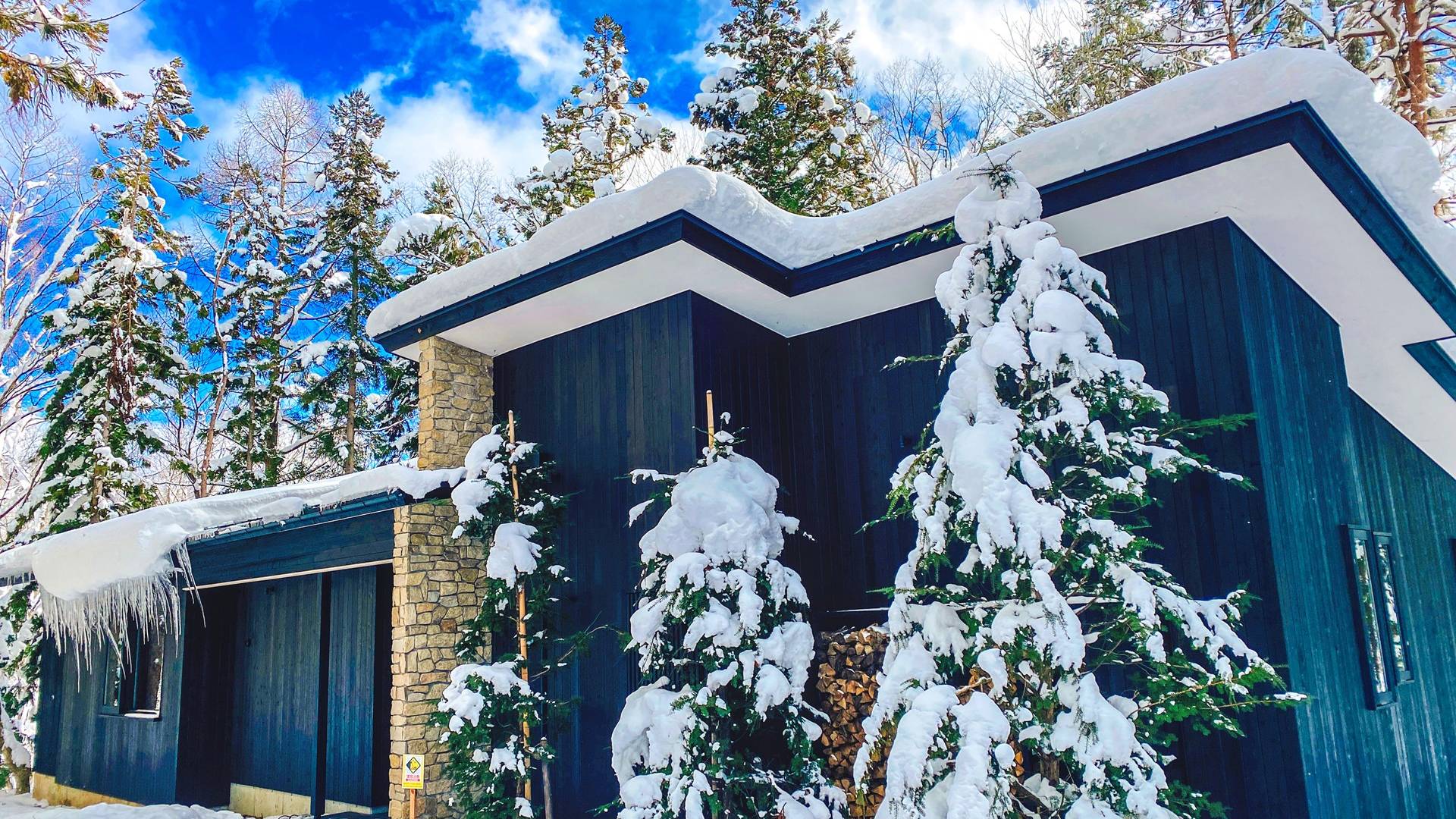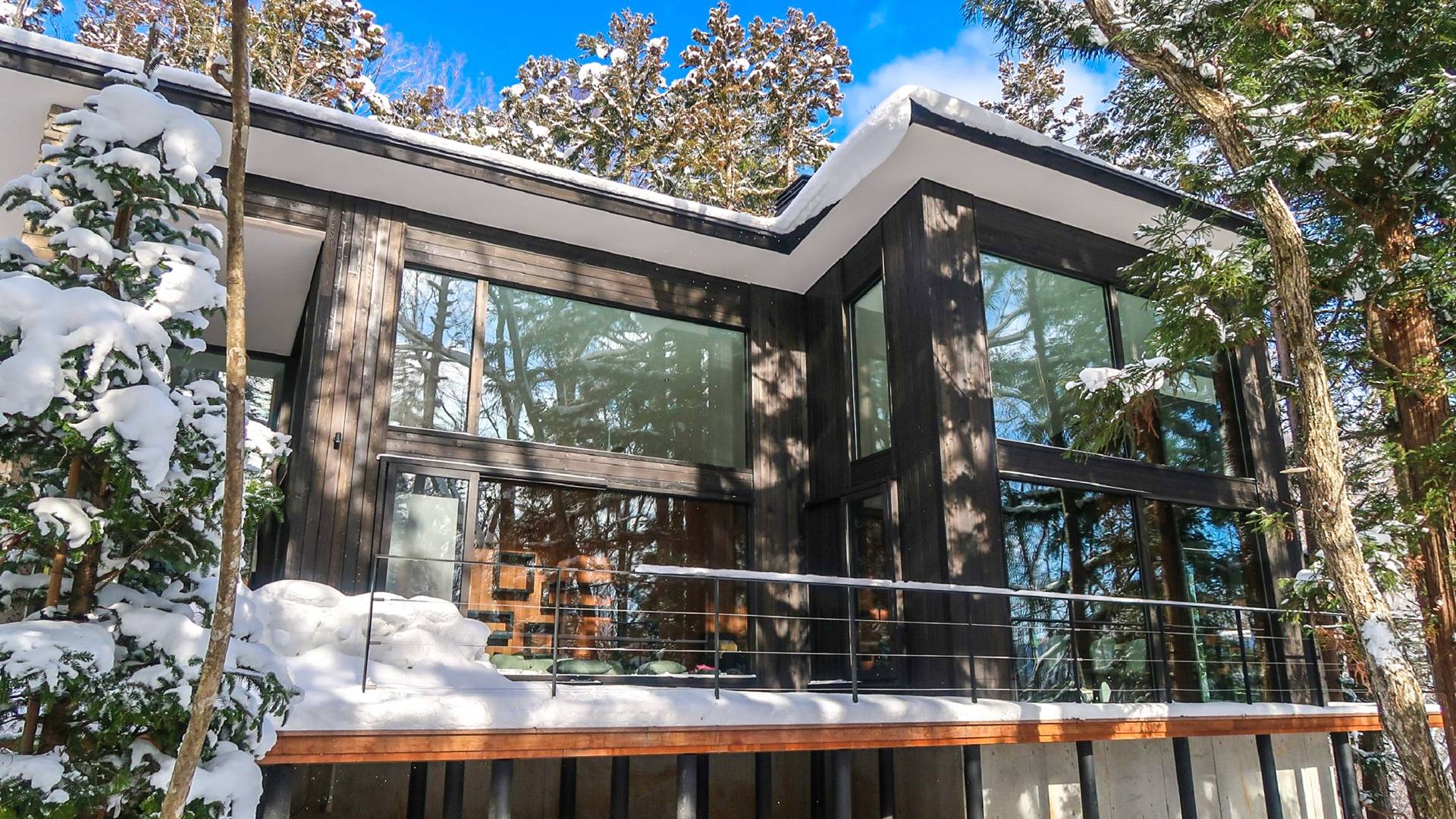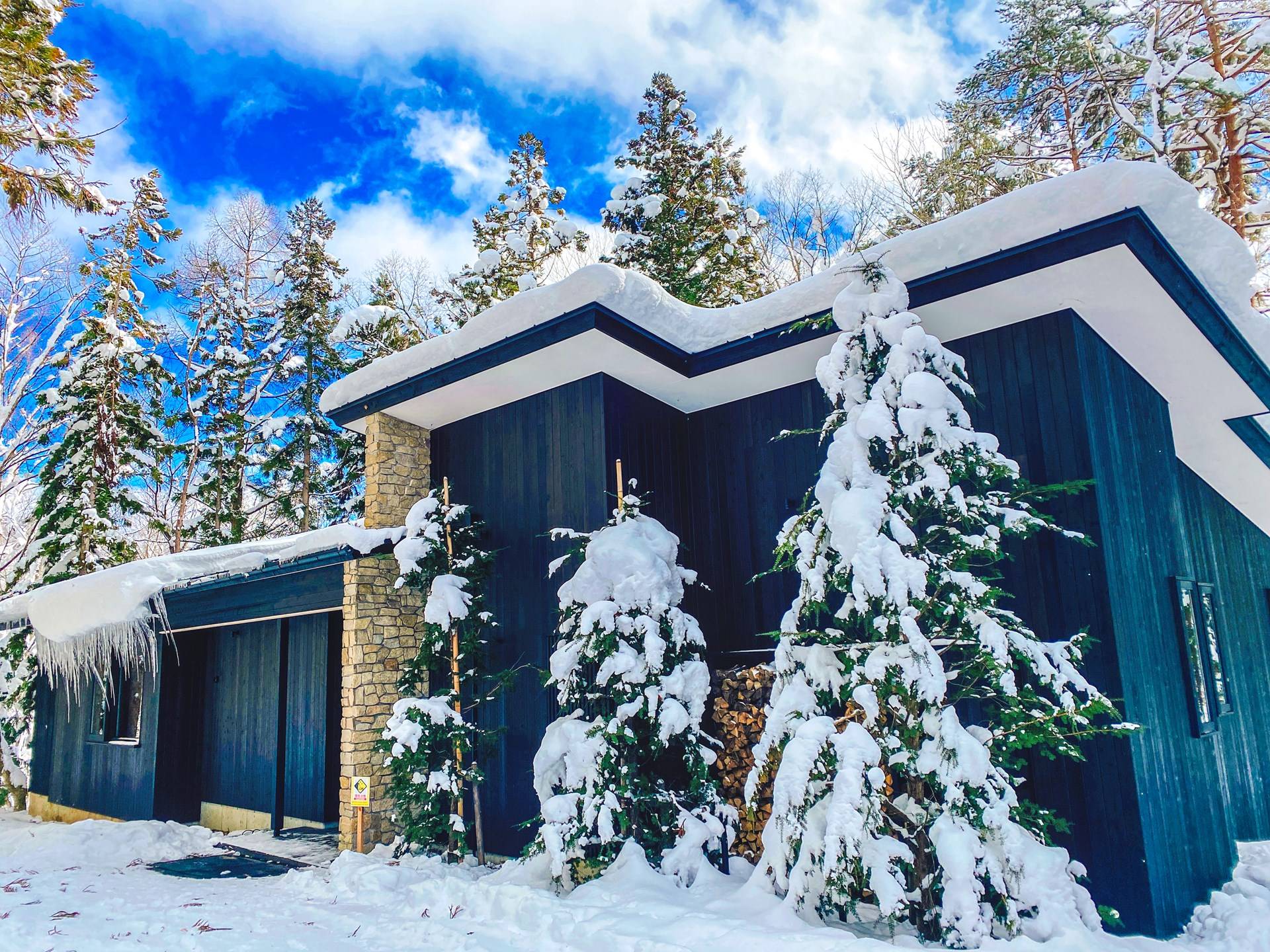 Die Villa befindet sich in der Nähe des weltberühmten Skigebiets Happo-one. Der nächste Sessellift, Sakka Slope, ist nur 150 m entfernt und bequem zu Fuß erreichbar. Ebenfalls leicht erreichbar sind die anderen Skigebiete mit dem bequemen Shuttlebus. Die wunderbaren Restaurants in der Gegend von Wadano sind ebenfalls größtenteils zu Fuß erreichbar. Die Villa El Cielo verfügt über ein kompliziert geformtes Dach, um ein Wohnzimmer mit einer maximalen Deckenhöhe von 5,2 m und einem Dachboden zu schaffen. Alle Holzverkleidungswände im Innen- und Außenbereich sind aus roter Zeder gefertigt, wobei nur eine Wand im Hauptbereich mit einem Felsen bedeckt ist, um einen Akzent zu setzen. Der elegante Stil sorgt für eine stilvolle Villa im Wald. Bitte genießen Sie Ihre Zeit hier.