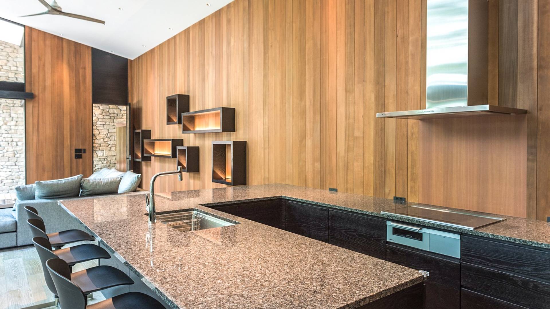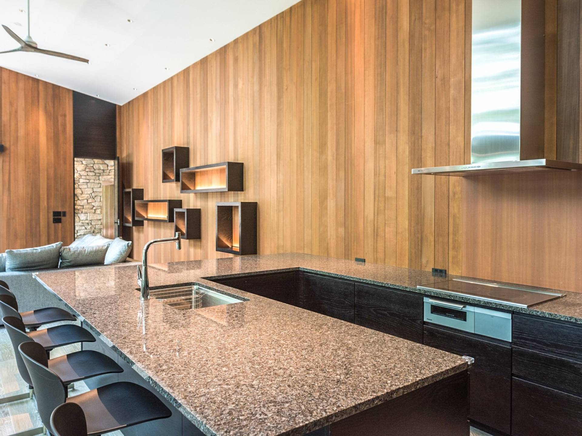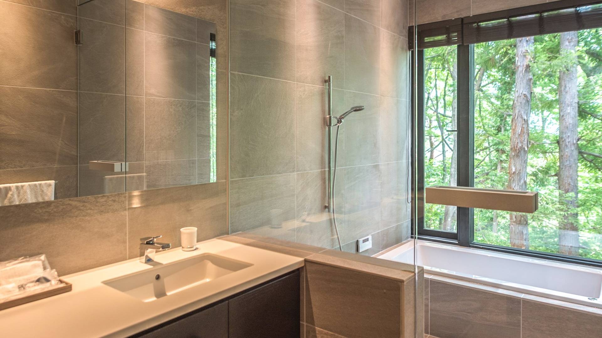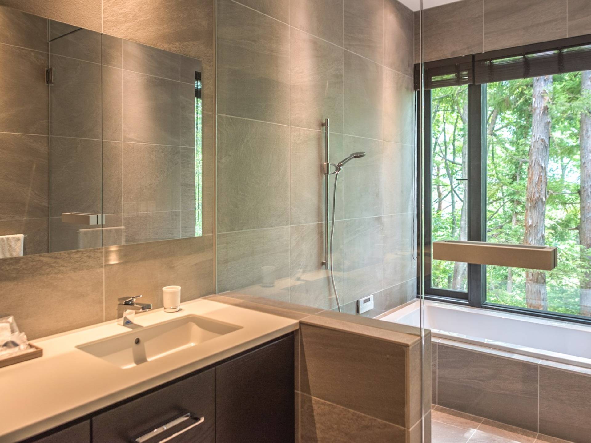 Die Villa befindet sich in der Nähe des weltberühmten Skigebiets Happo-one. Der nächste Sessellift, Sakka Slope, ist nur 150 m entfernt und bequem zu Fuß erreichbar. Ebenfalls leicht erreichbar sind die anderen Skigebiete mit dem bequemen Shuttlebus. Die wunderbaren Restaurants in der Gegend von Wadano sind ebenfalls größtenteils zu Fuß erreichbar. Die Villa El Cielo verfügt über ein kompliziert geformtes Dach, um ein Wohnzimmer mit einer maximalen Deckenhöhe von 5,2 m und einem Dachboden zu schaffen. Alle Holzverkleidungswände im Innen- und Außenbereich sind aus roter Zeder gefertigt, wobei nur eine Wand im Hauptbereich mit einem Felsen bedeckt ist, um einen Akzent zu setzen. Der elegante Stil sorgt für eine stilvolle Villa im Wald. Bitte genießen Sie Ihre Zeit hier.