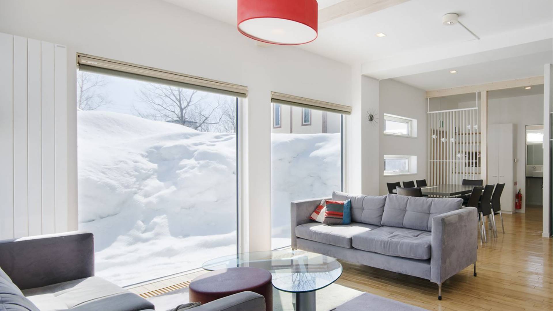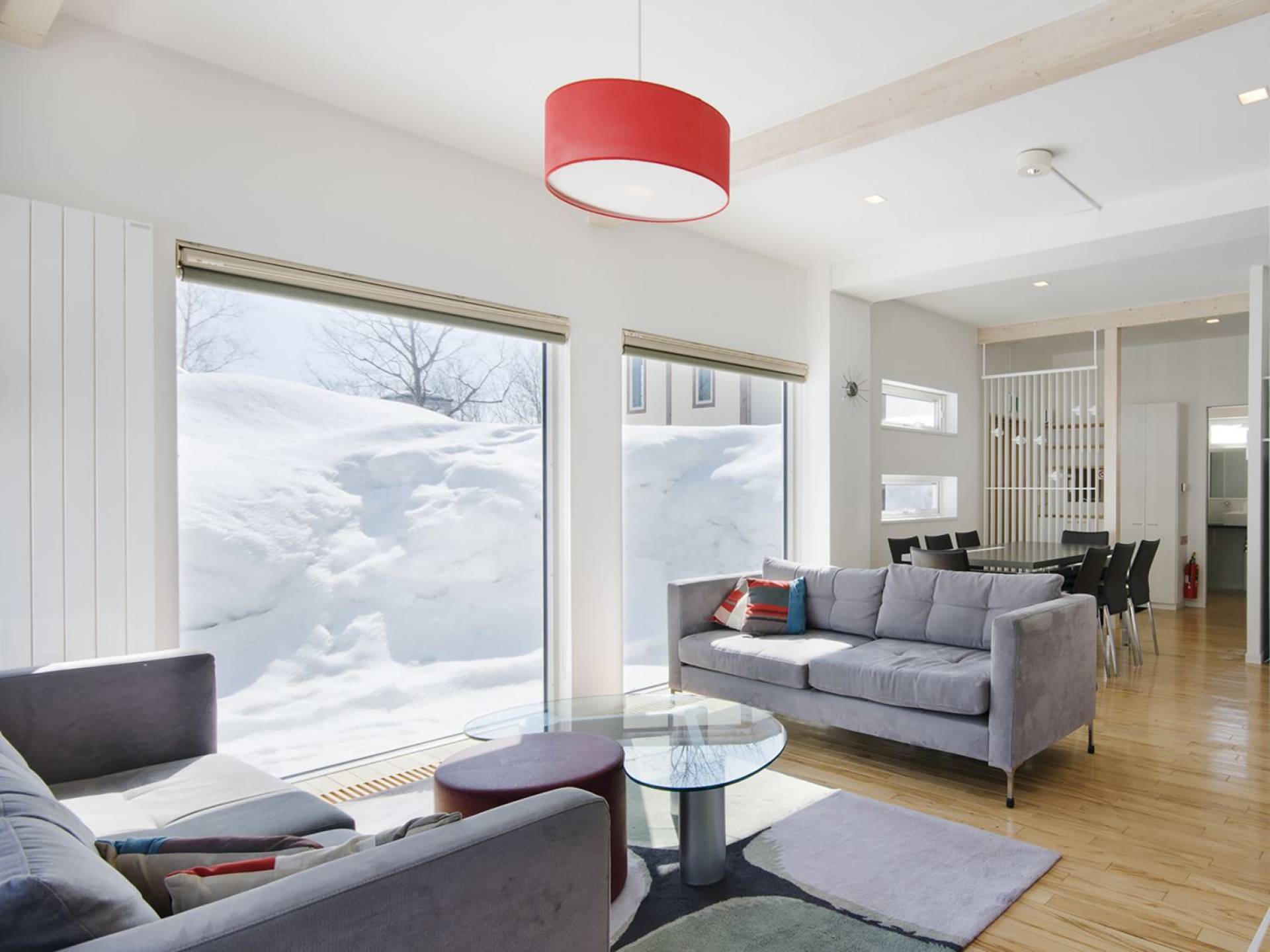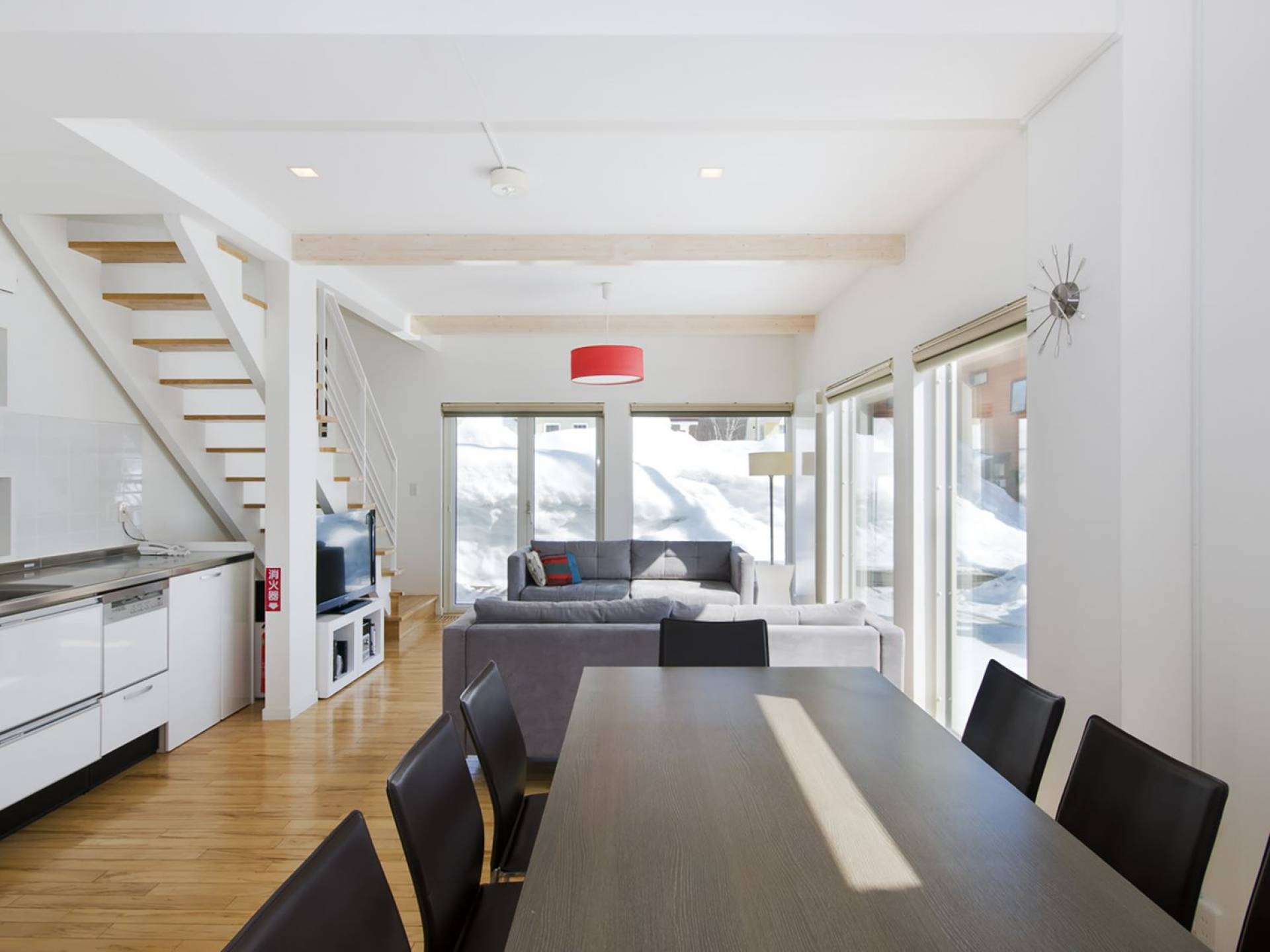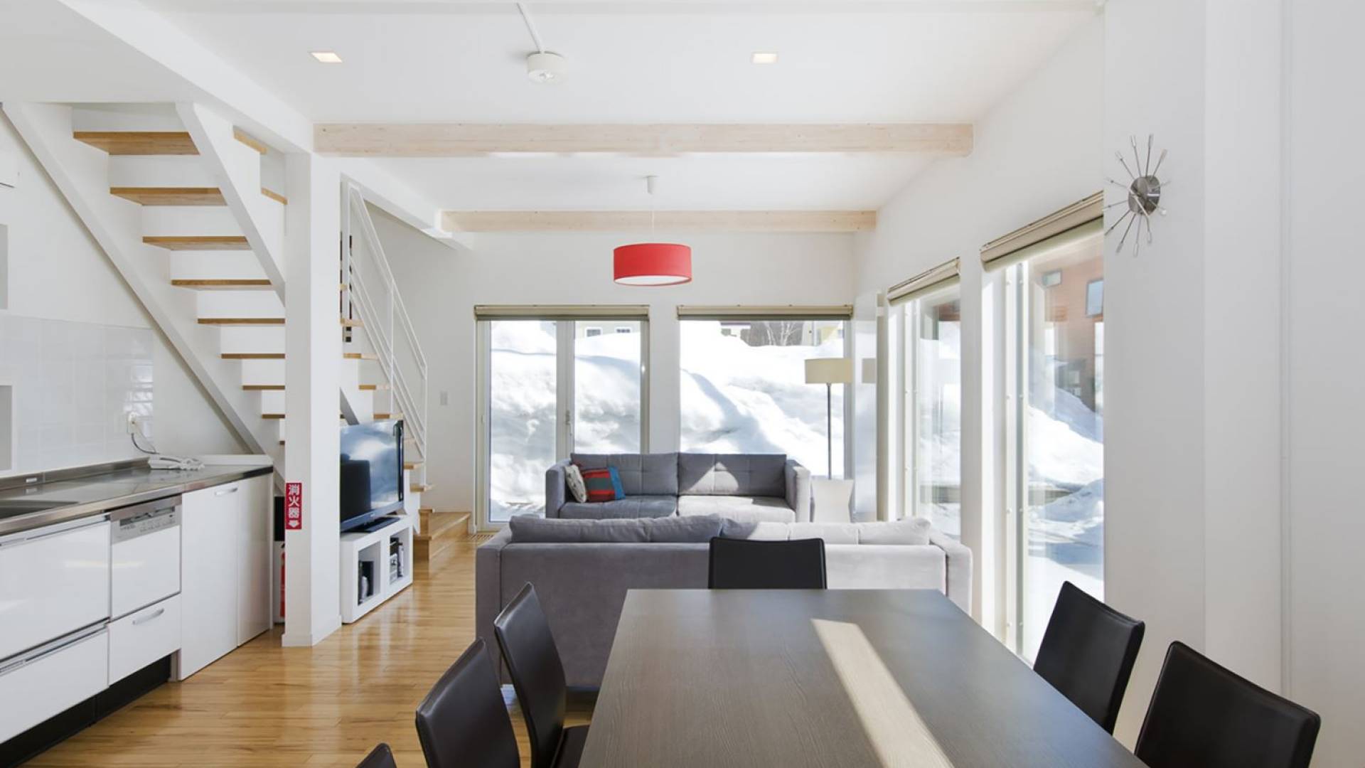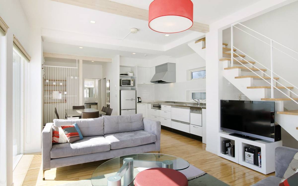 Chalet Yamabiko ist ein Luxus-Chalet mit 3 Schlafzimmern. Das Chalet Yamabiko ist ein urbaner und doch luxuriöser Rückzugsort in Niseko, Japan. Erbaut an einem magischen Ort, wird ein Besuch dort, besonders im Winter, Sie in Erstaunen versetzen. Die elegante und moderne Architektur und die Dominanz von Weiß mit einigen roten Spritzern sind die Hauptmerkmale des Innendesigns dieses Luxus-Chalets.