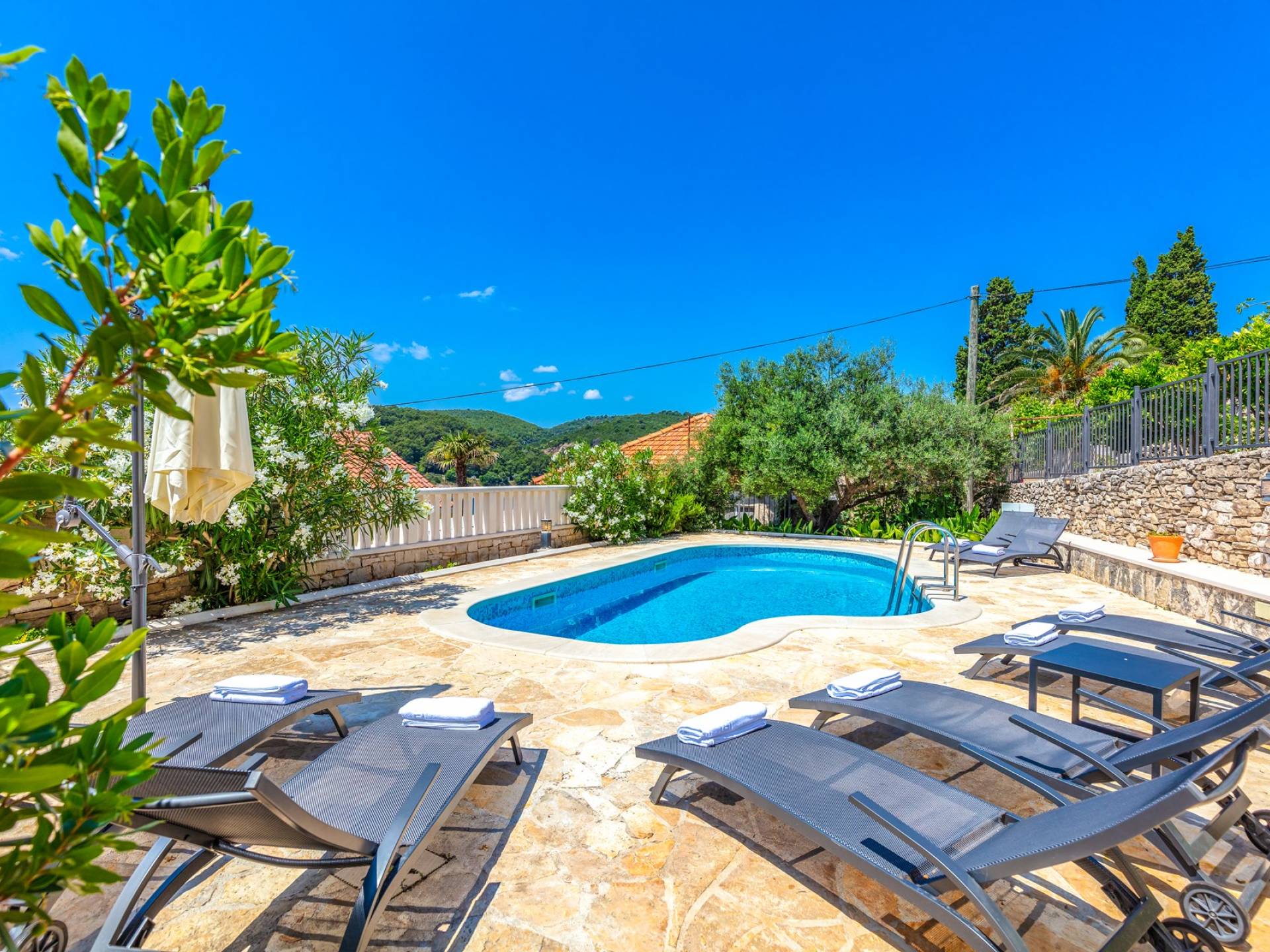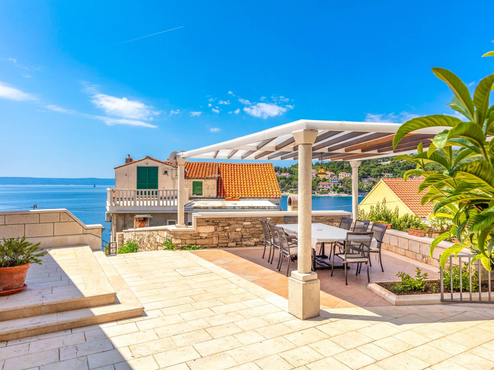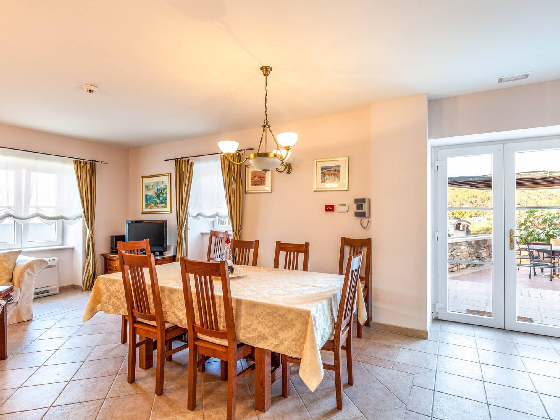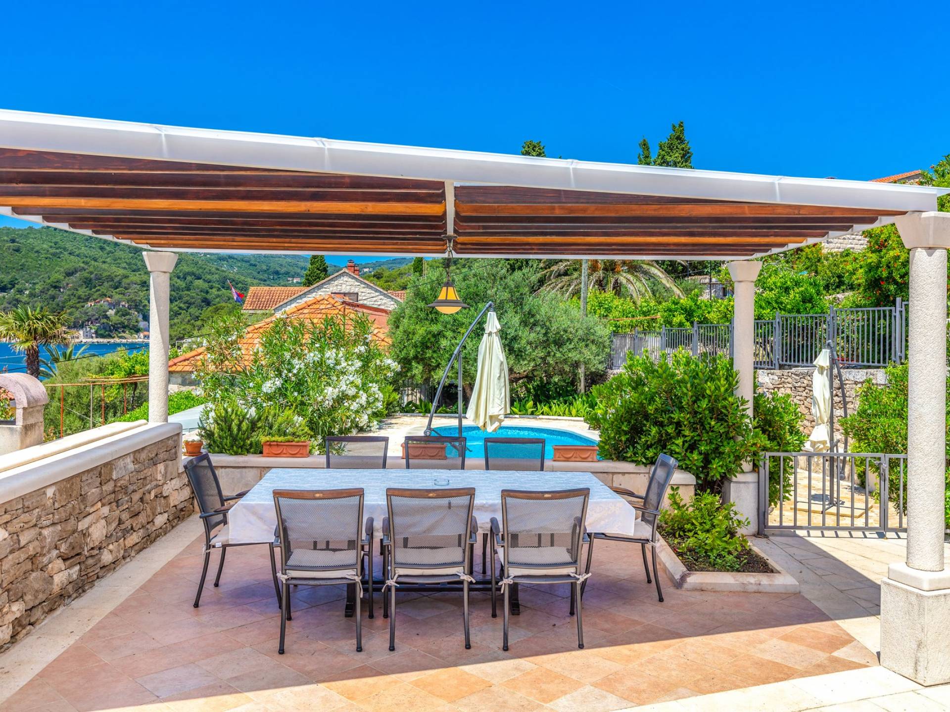 Durch das Wohnzimmer gelangen Sie auf die große, offene Terrasse, auf der sich ein Swimmingpool und eine Liegewiese befinden. Es gibt auch einen großen, schattigen Essbereich mit einem Außengrill, so dass Sie im Freien kochen und essen können und die friedliche kroatische Umgebung genießen. Seitlich der Terrasse befinden sich weitere Sitzgelegenheiten.